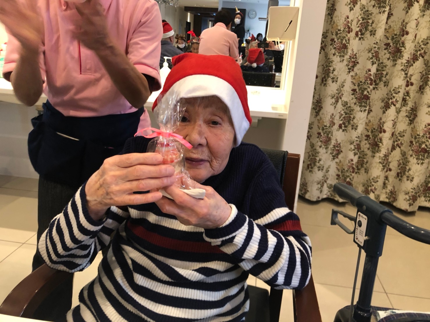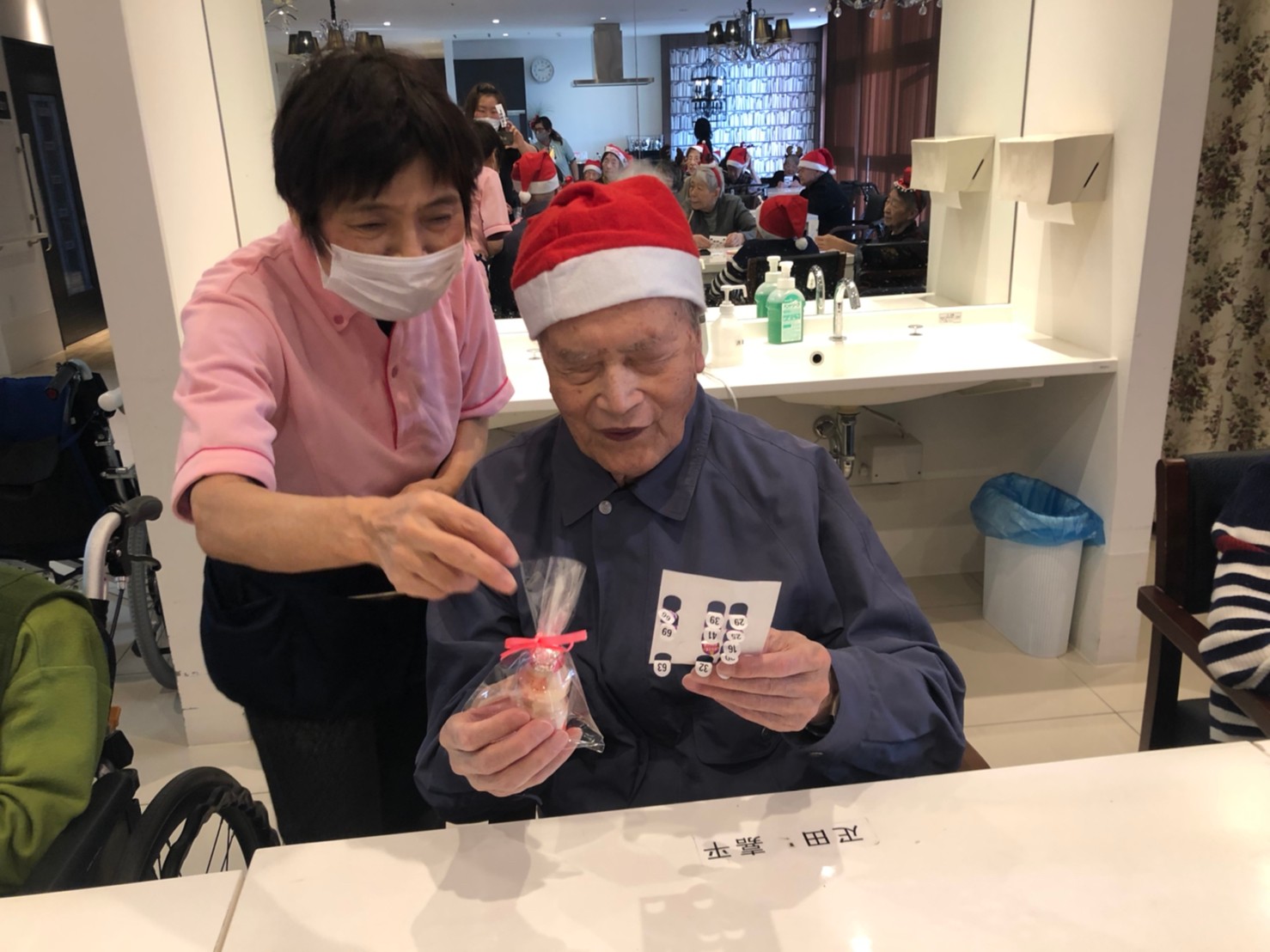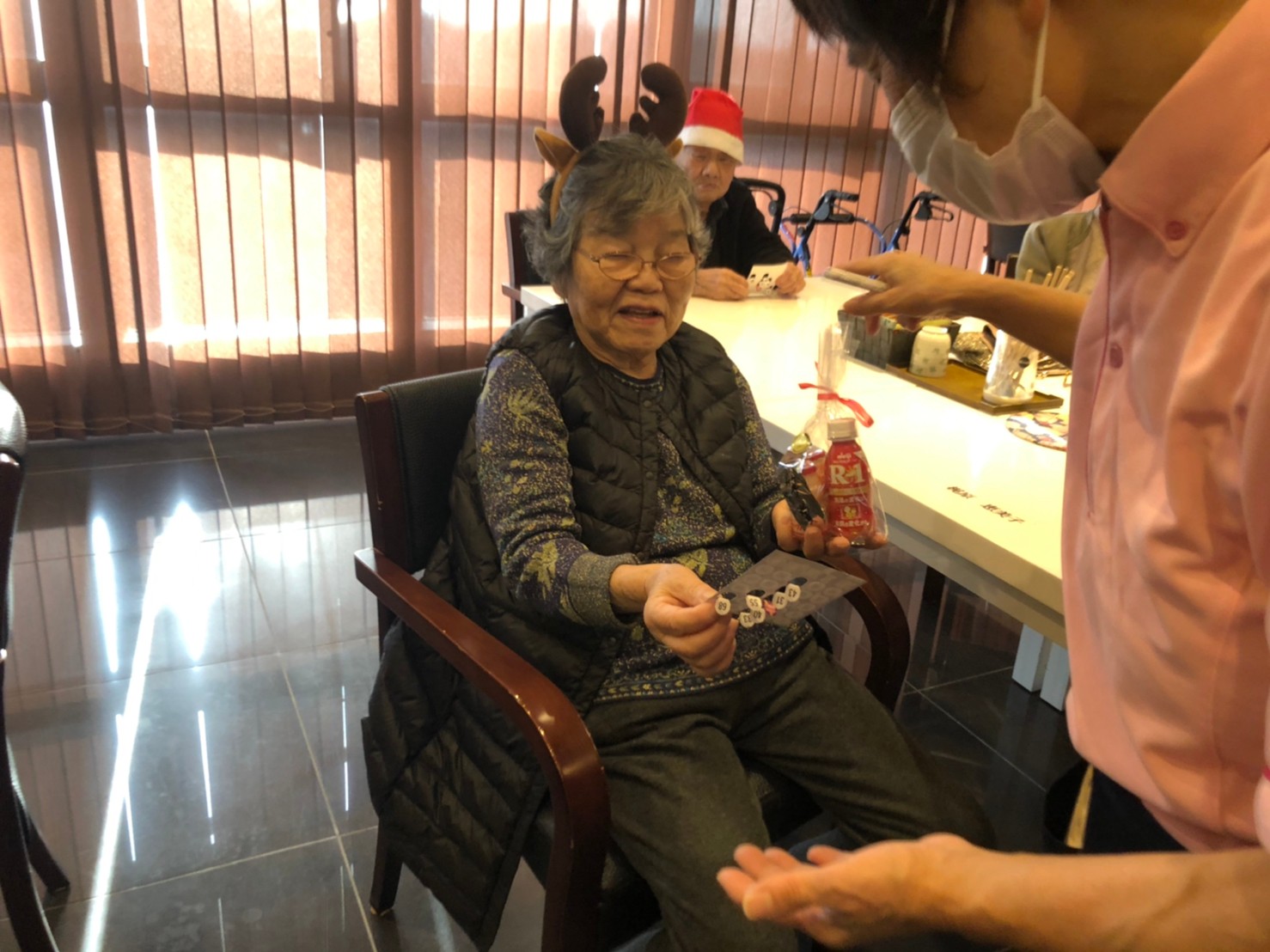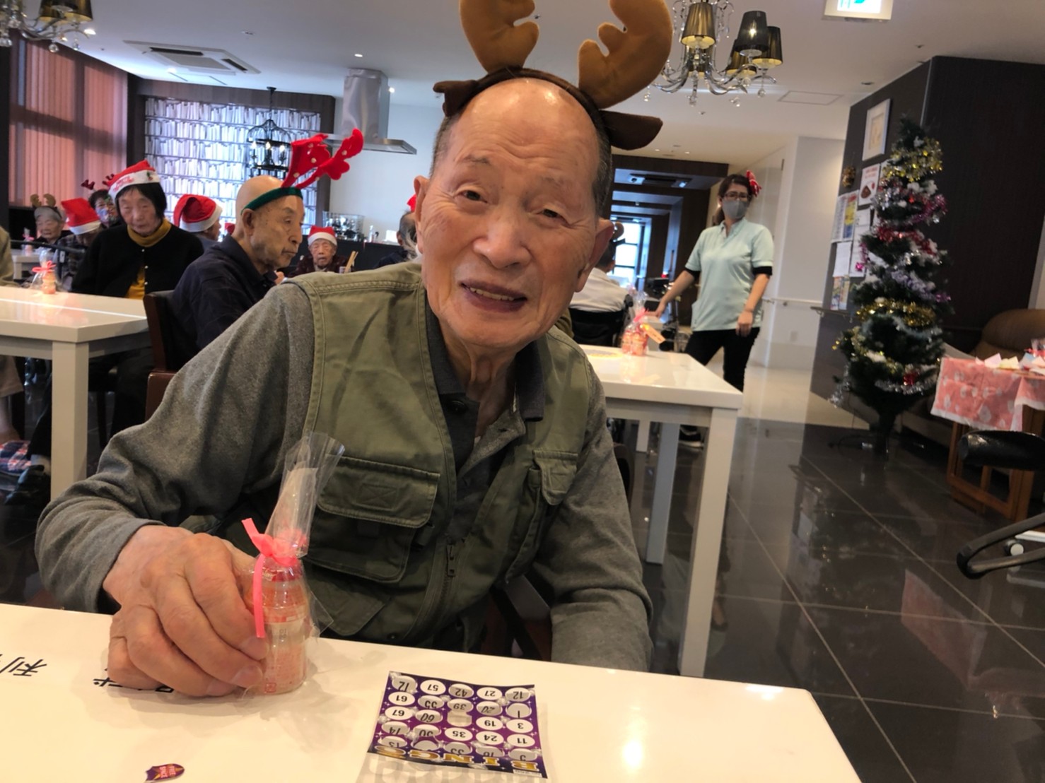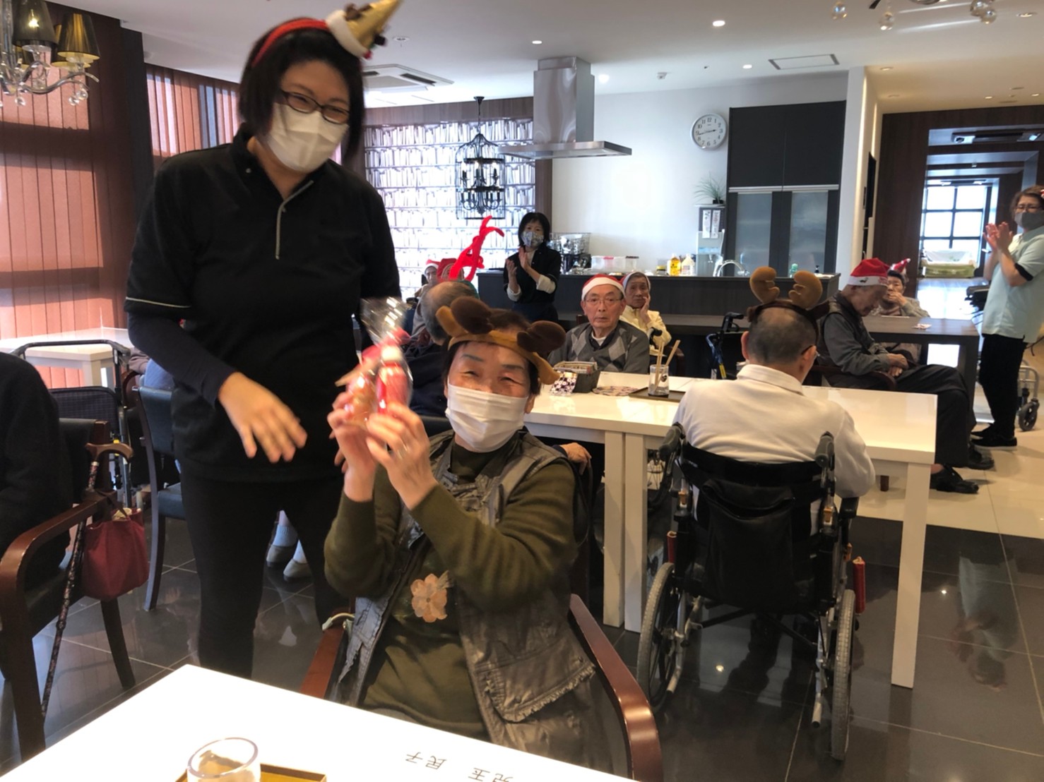 今月のイベントはもちろんクリスマス会です。サニープレイス河瀬には煙突はありませんがエレベーターを使ってサンタクロースが利用者さまにプレゼントを持って毎年やってきます。プレゼントの中身は毎年恒例の来年の干支の置物です。株式会社サンタクロース 彦根支社 河瀬工場の職員が手作りした干支の置物は人気で毎年この時期になると利用者さまも今年はどんなのを作るか興味津々です。来年の干支は丑(うし)ということで、牛の柄を決めるのに和牛のような黒や茶色なのかホルスタインのような白黒まだら模様なのかで迷うこともありました( ;∀;)。イベントではヤクルト争奪大ビンゴ大会もあり利用者さま皆さまにヤクルトをお渡ししてクリスマス会は終えられました。