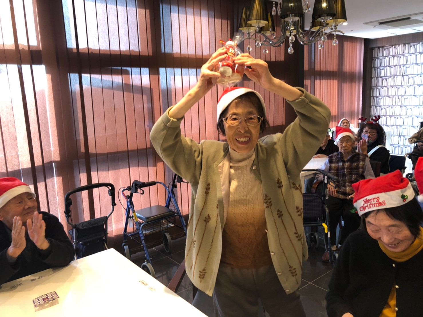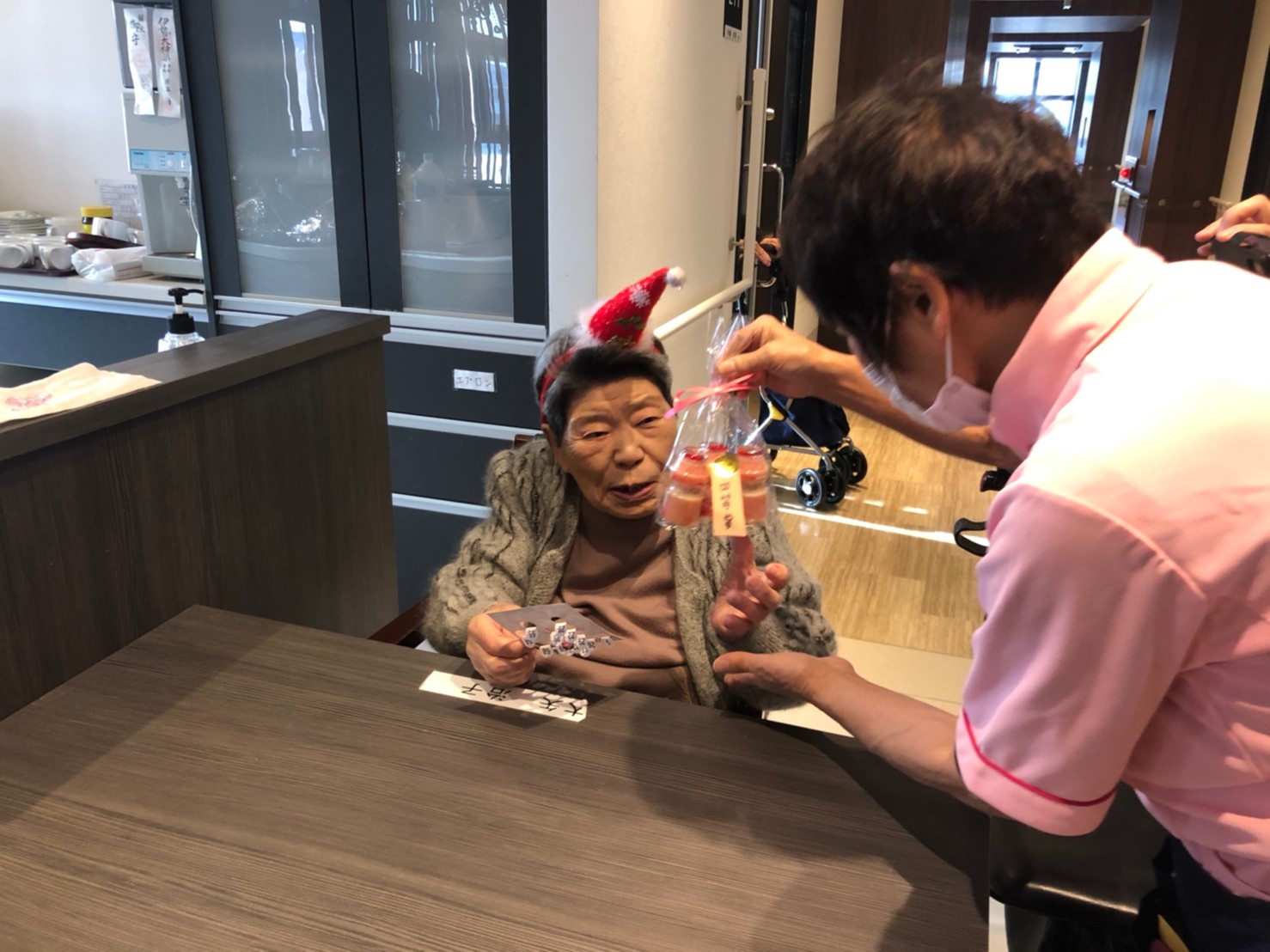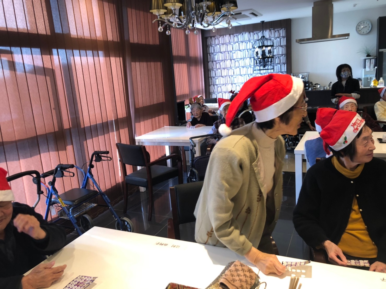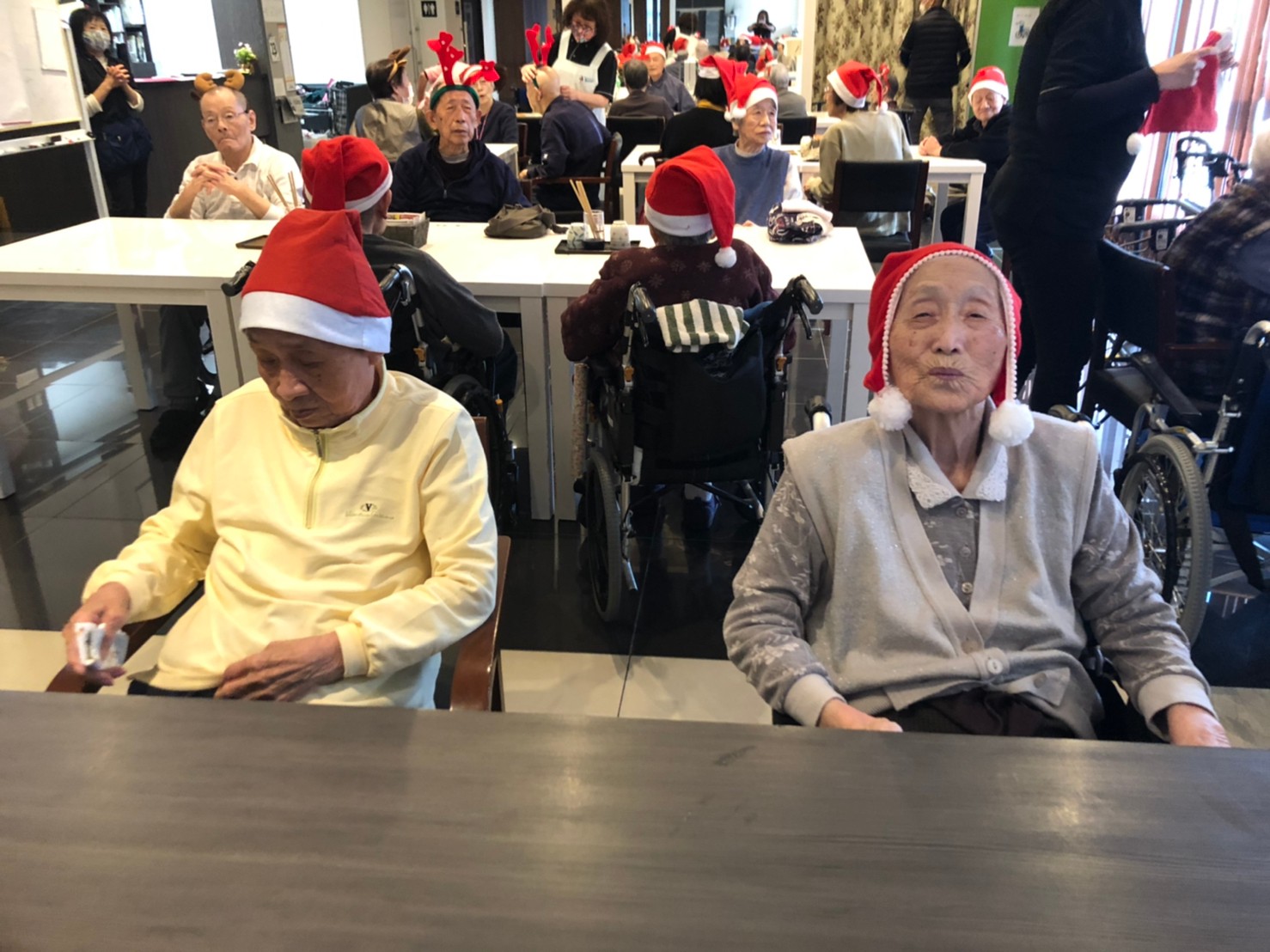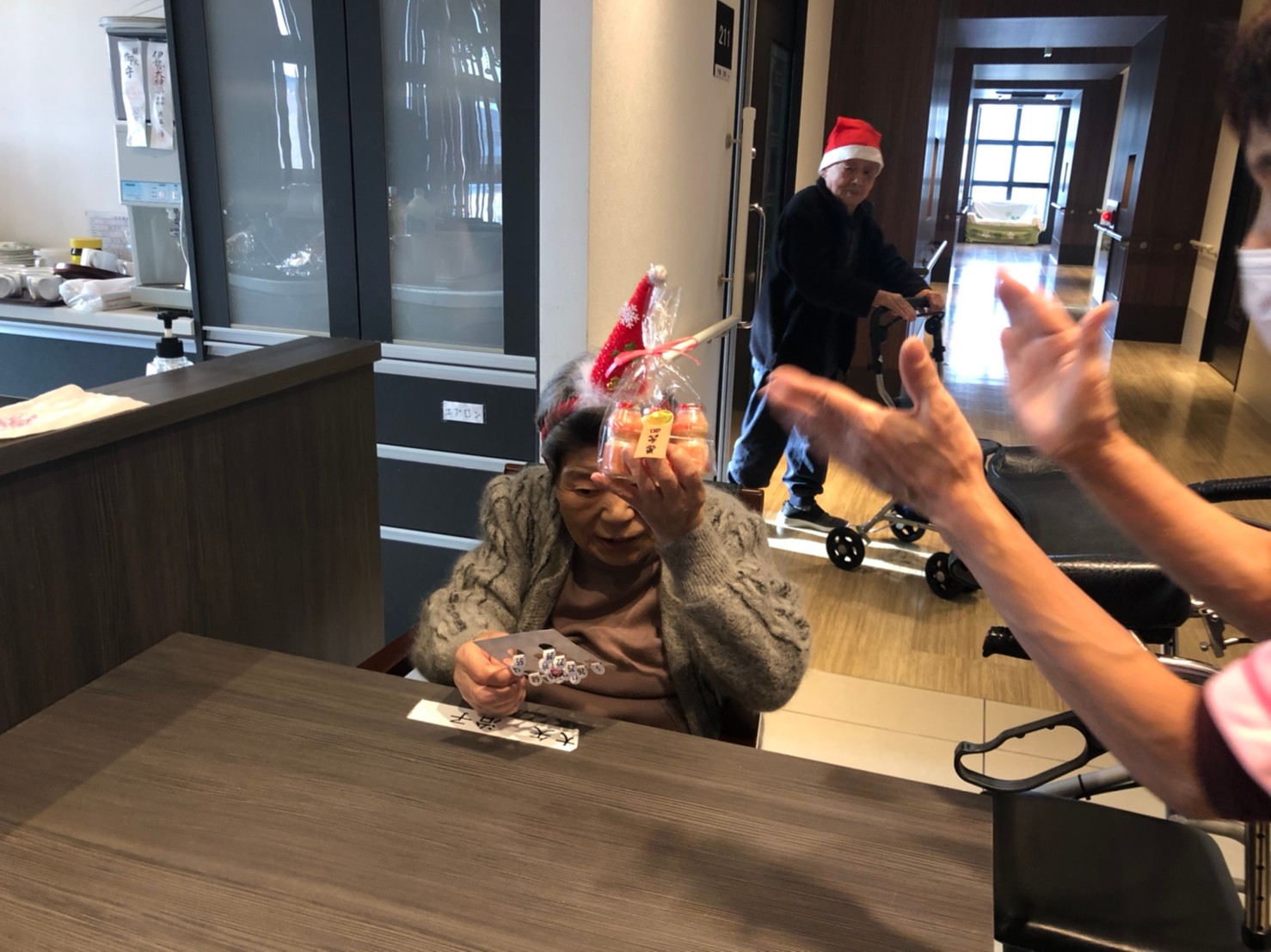 今月のイベントはもちろんクリスマス会です。サニープレイス河瀬には煙突はありませんがエレベーターを使ってサンタクロースが利用者さまにプレゼントを持って毎年やってきます。プレゼントの中身は毎年恒例の来年の干支の置物です。株式会社サンタクロース 彦根支社 河瀬工場の職員が手作りした干支の置物は人気で毎年この時期になると利用者さまも今年はどんなのを作るか興味津々です。来年の干支は丑(うし)ということで、牛の柄を決めるのに和牛のような黒や茶色なのかホルスタインのような白黒まだら模様なのかで迷うこともありました( ;∀;)。イベントではヤクルト争奪大ビンゴ大会もあり利用者さま皆さまにヤクルトをお渡ししてクリスマス会は終えられました。