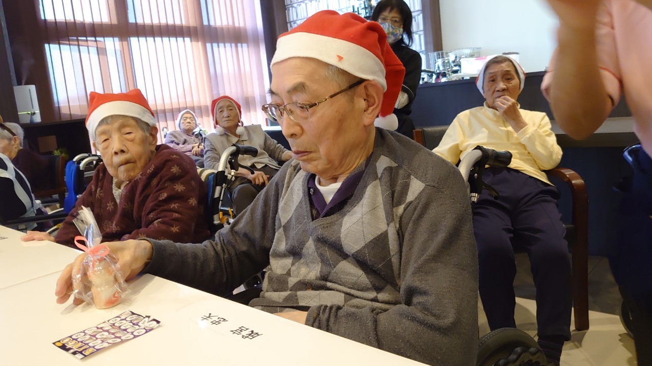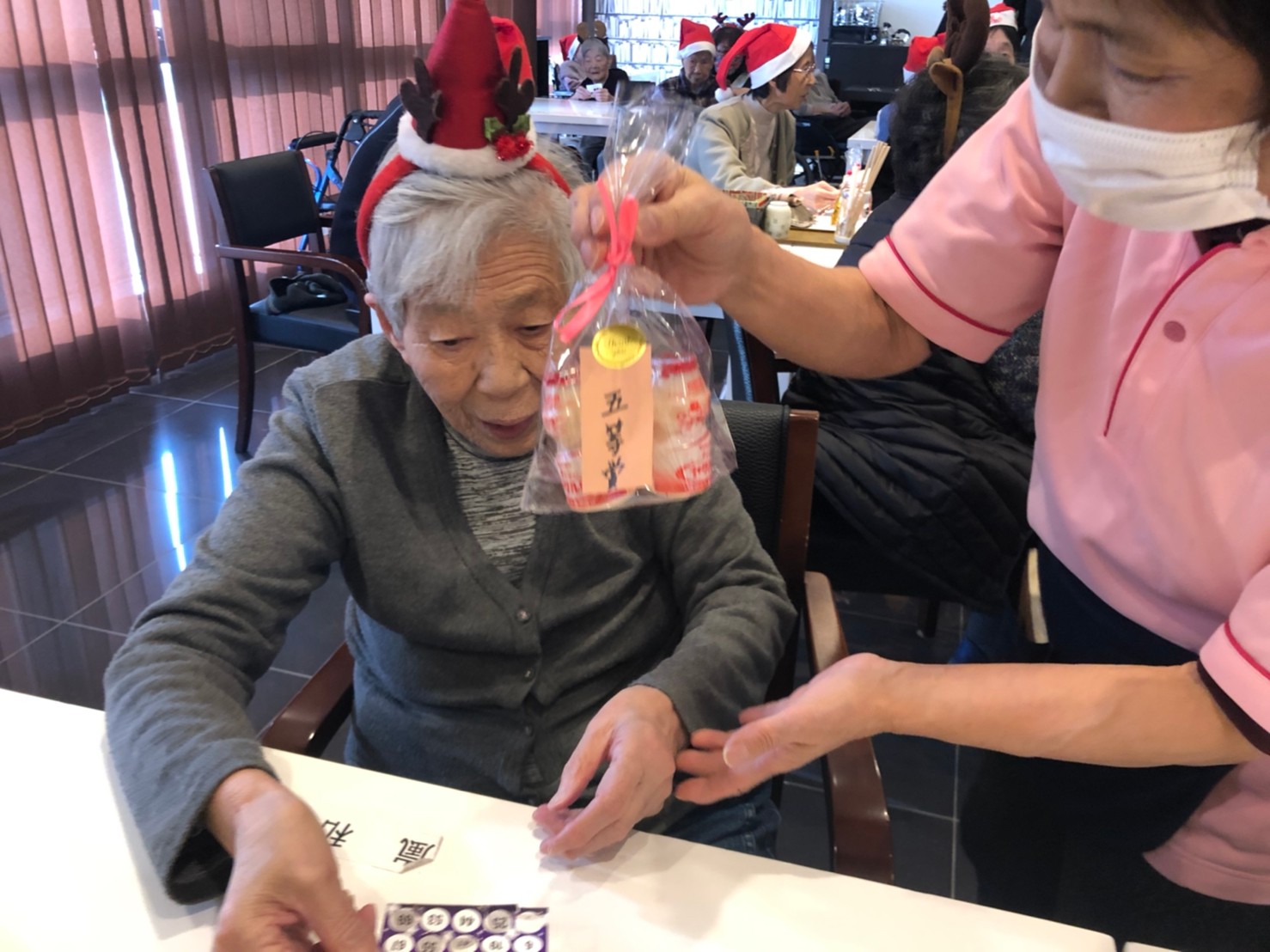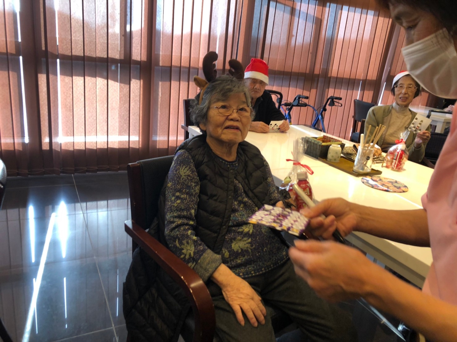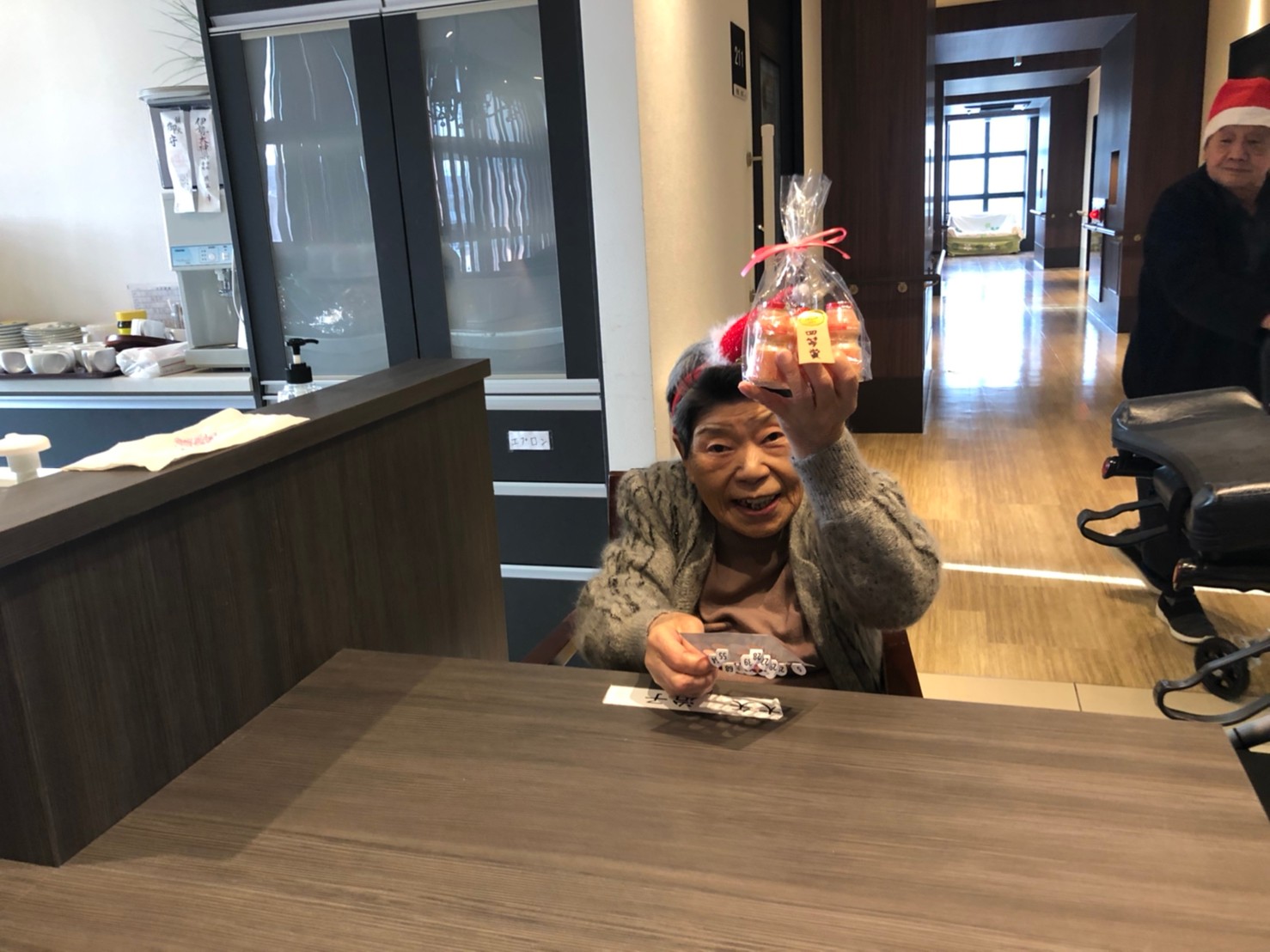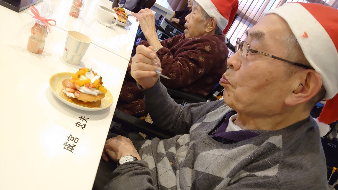 今月のイベントはもちろんクリスマス会です。サニープレイス河瀬には煙突はありませんがエレベーターを使ってサンタクロースが利用者さまにプレゼントを持って毎年やってきます。プレゼントの中身は毎年恒例の来年の干支の置物です。株式会社サンタクロース 彦根支社 河瀬工場の職員が手作りした干支の置物は人気で毎年この時期になると利用者さまも今年はどんなのを作るか興味津々です。来年の干支は丑(うし)ということで、牛の柄を決めるのに和牛のような黒や茶色なのかホルスタインのような白黒まだら模様なのかで迷うこともありました( ;∀;)。イベントではヤクルト争奪大ビンゴ大会もあり利用者さま皆さまにヤクルトをお渡ししてクリスマス会は終えられました。