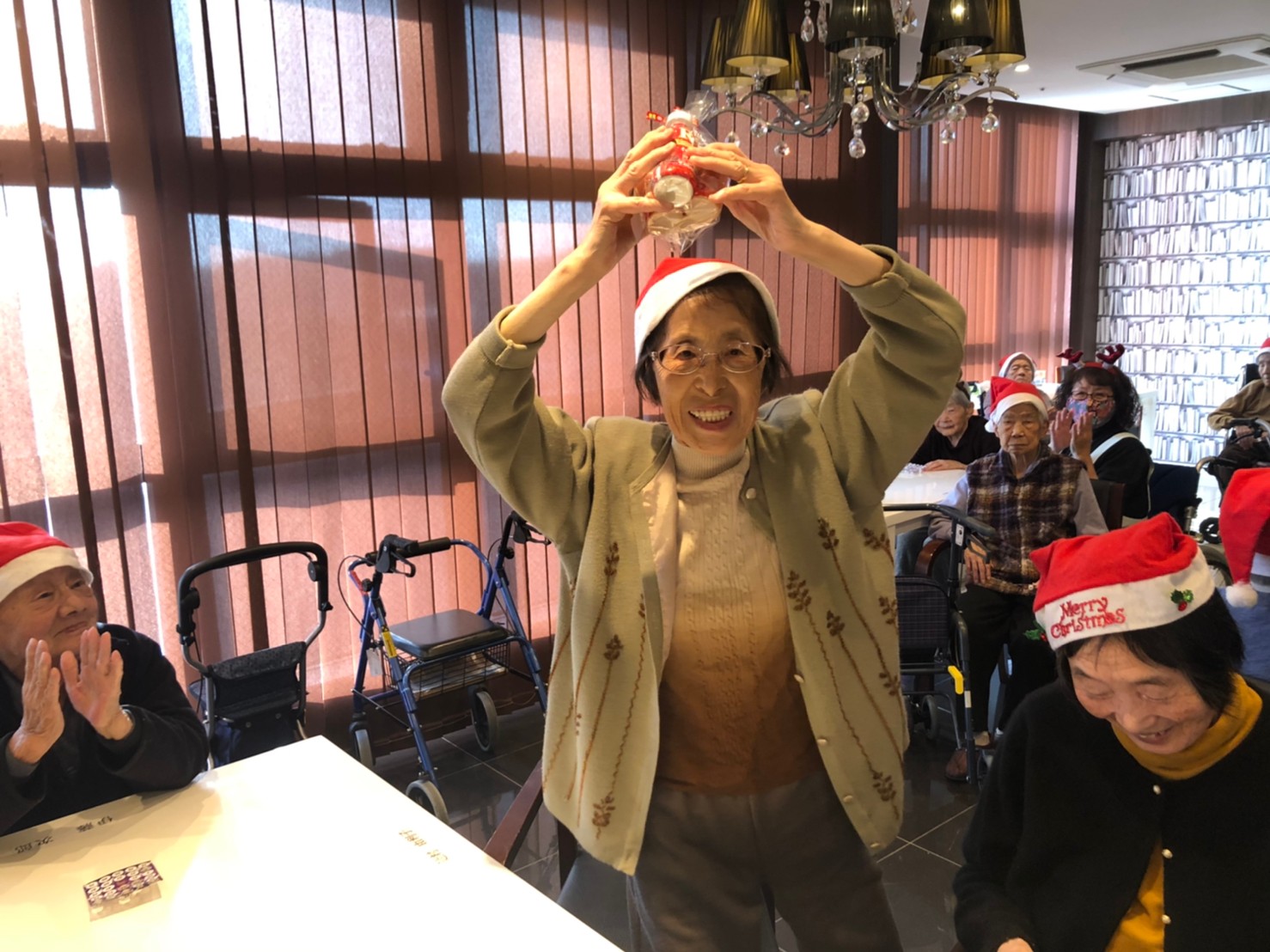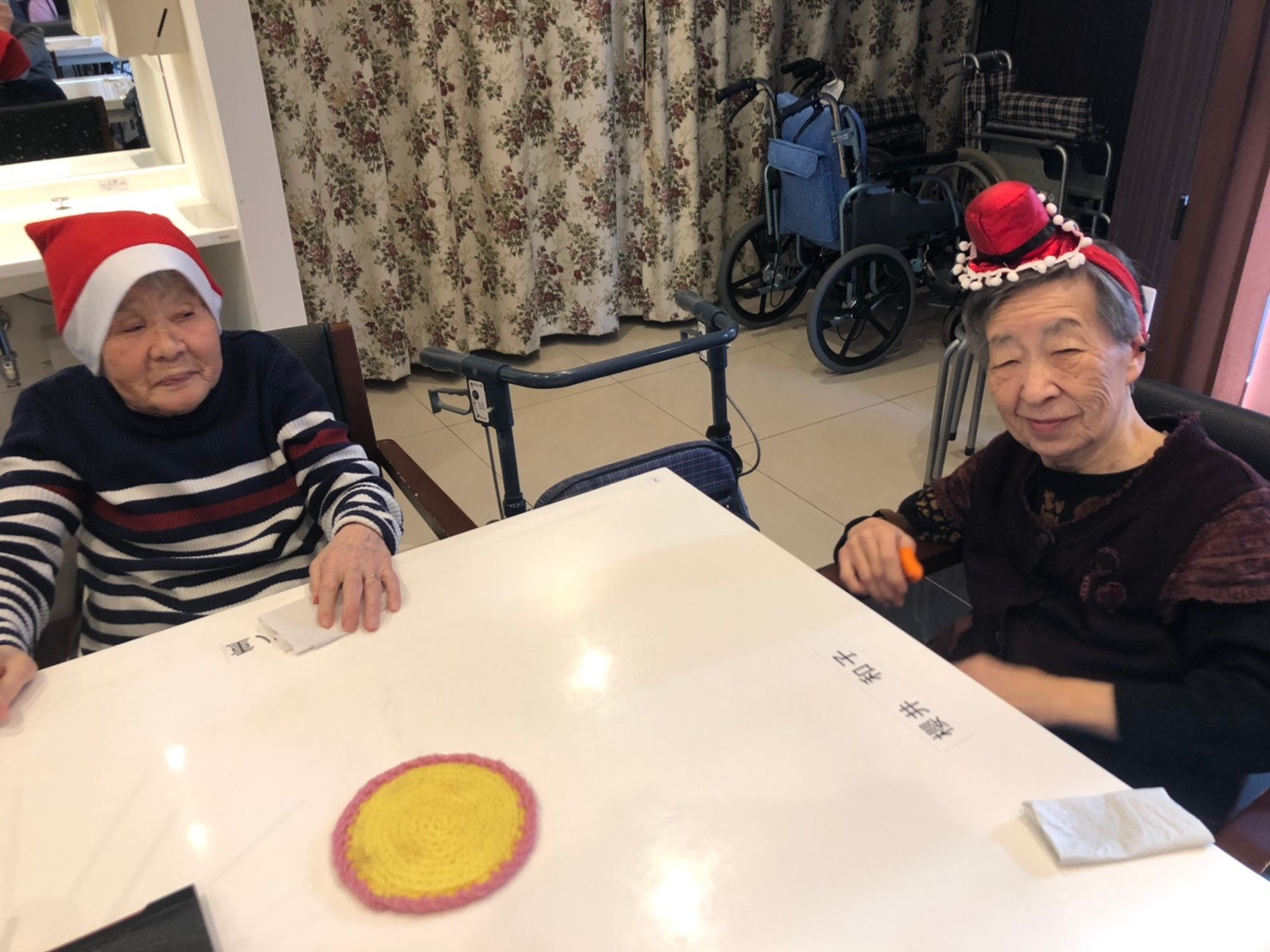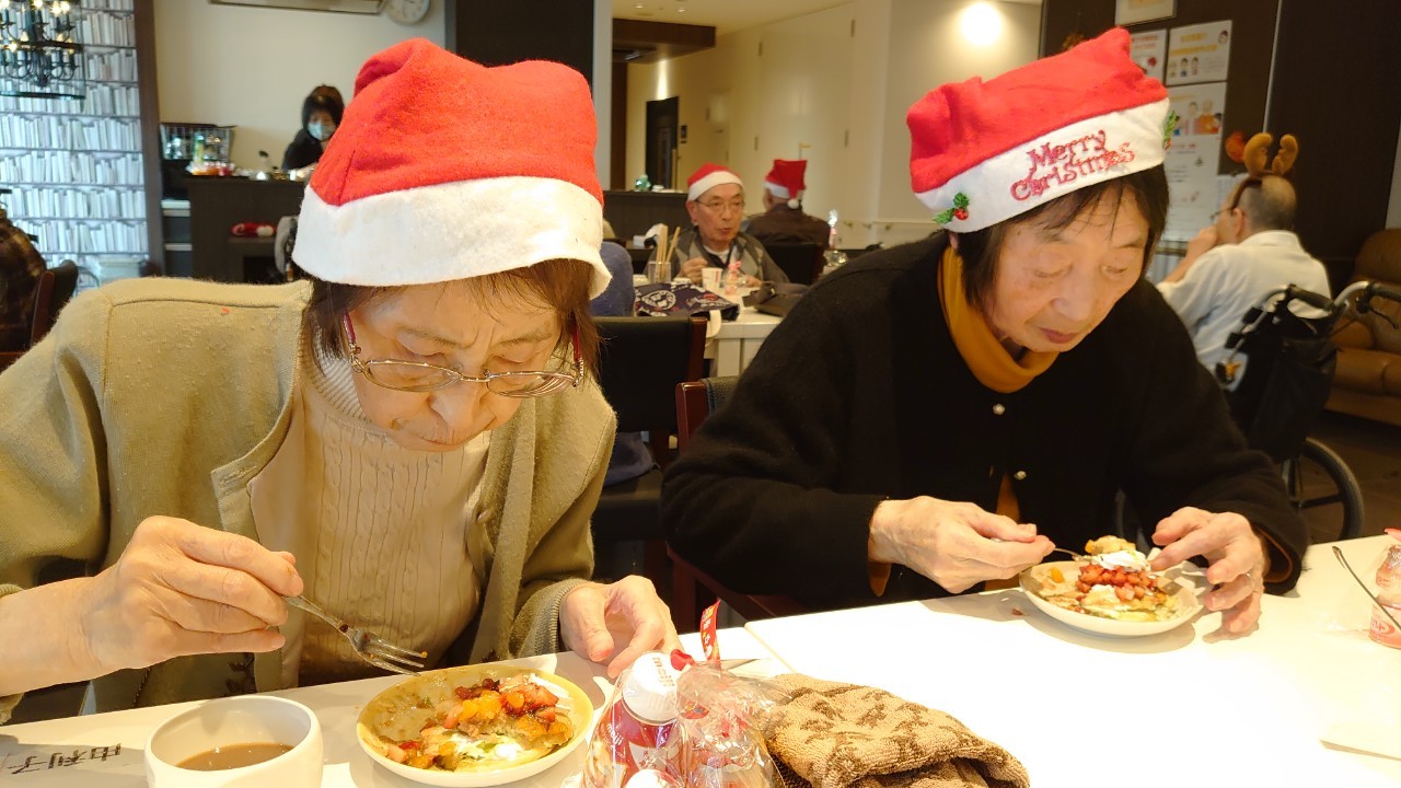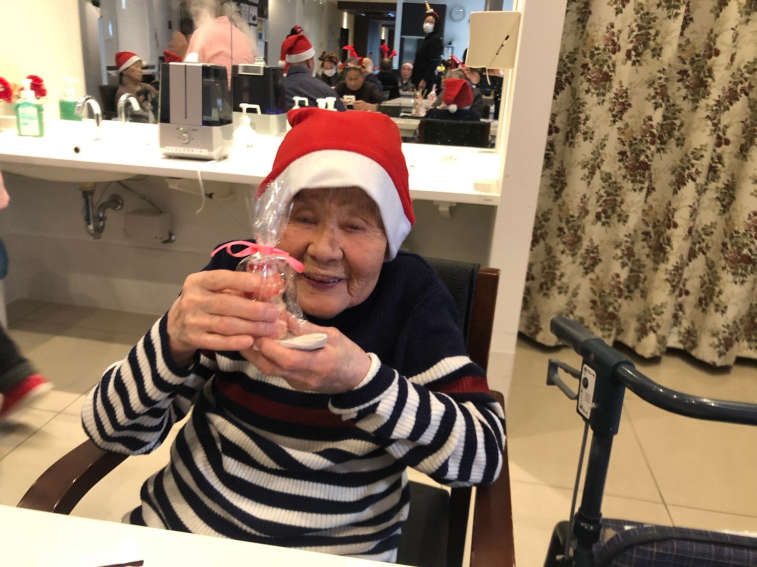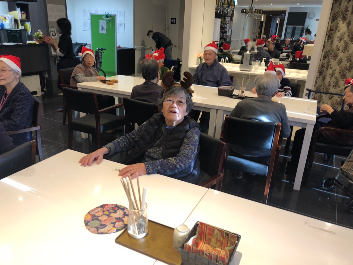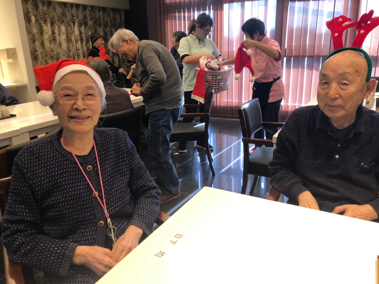 今月のイベントはもちろんクリスマス会です。サニープレイス河瀬には煙突はありませんがエレベーターを使ってサンタクロースが利用者さまにプレゼントを持って毎年やってきます。プレゼントの中身は毎年恒例の来年の干支の置物です。株式会社サンタクロース 彦根支社 河瀬工場の職員が手作りした干支の置物は人気で毎年この時期になると利用者さまも今年はどんなのを作るか興味津々です。来年の干支は丑(うし)ということで、牛の柄を決めるのに和牛のような黒や茶色なのかホルスタインのような白黒まだら模様なのかで迷うこともありました( ;∀;)。イベントではヤクルト争奪大ビンゴ大会もあり利用者さま皆さまにヤクルトをお渡ししてクリスマス会は終えられました。