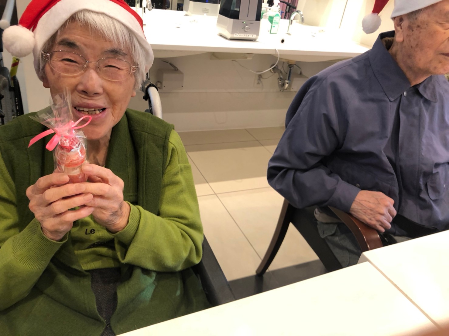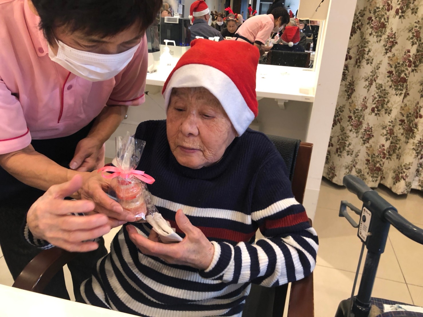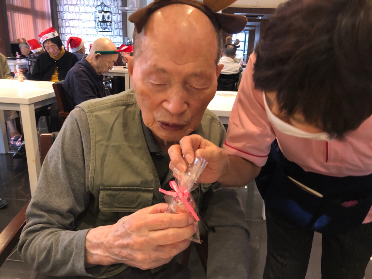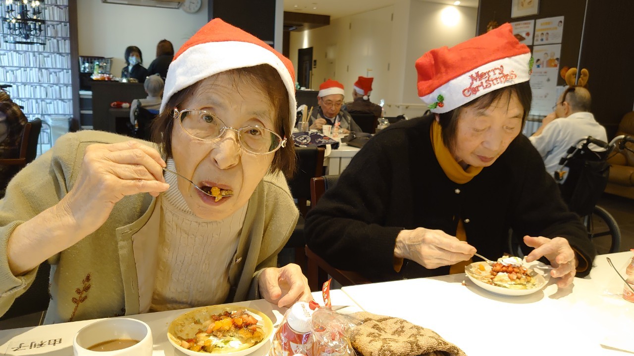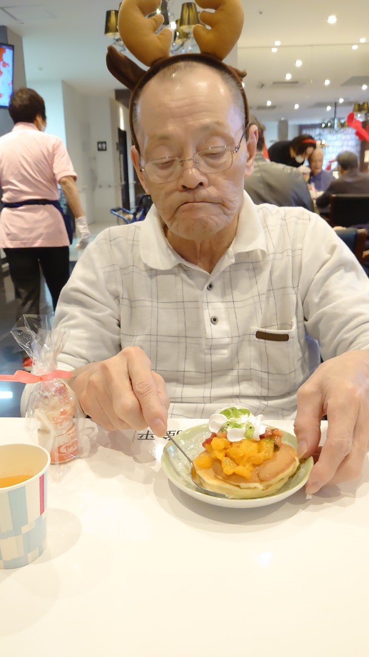 今月のイベントはもちろんクリスマス会です。サニープレイス河瀬には煙突はありませんがエレベーターを使ってサンタクロースが利用者さまにプレゼントを持って毎年やってきます。プレゼントの中身は毎年恒例の来年の干支の置物です。株式会社サンタクロース 彦根支社 河瀬工場の職員が手作りした干支の置物は人気で毎年この時期になると利用者さまも今年はどんなのを作るか興味津々です。来年の干支は丑(うし)ということで、牛の柄を決めるのに和牛のような黒や茶色なのかホルスタインのような白黒まだら模様なのかで迷うこともありました( ;∀;)。イベントではヤクルト争奪大ビンゴ大会もあり利用者さま皆さまにヤクルトをお渡ししてクリスマス会は終えられました。