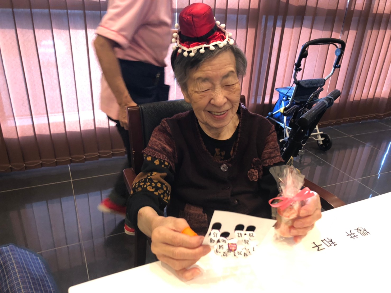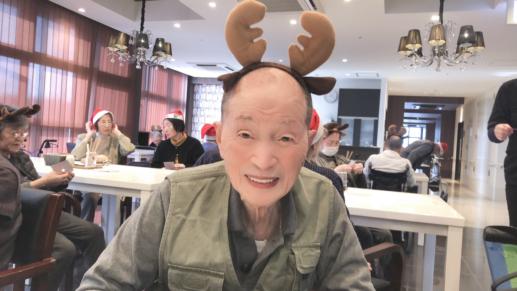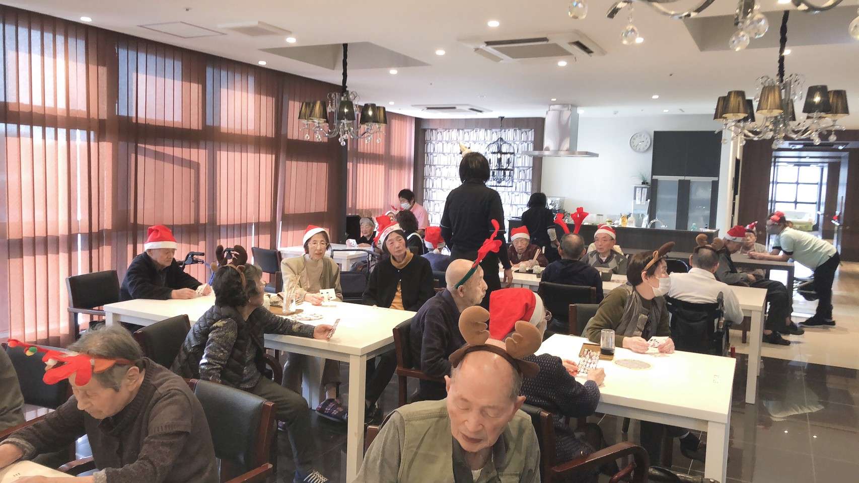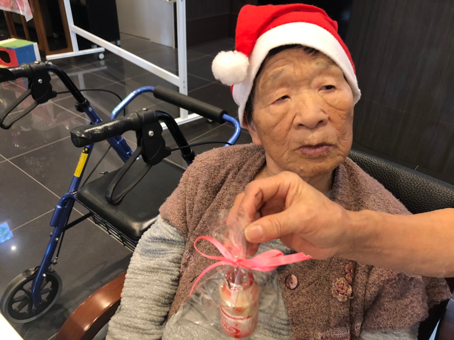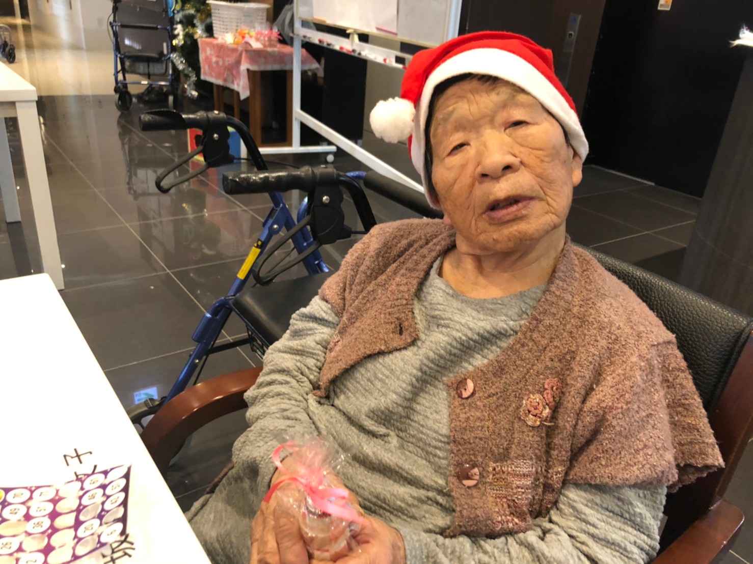 今月のイベントはもちろんクリスマス会です。サニープレイス河瀬には煙突はありませんがエレベーターを使ってサンタクロースが利用者さまにプレゼントを持って毎年やってきます。プレゼントの中身は毎年恒例の来年の干支の置物です。株式会社サンタクロース 彦根支社 河瀬工場の職員が手作りした干支の置物は人気で毎年この時期になると利用者さまも今年はどんなのを作るか興味津々です。来年の干支は丑(うし)ということで、牛の柄を決めるのに和牛のような黒や茶色なのかホルスタインのような白黒まだら模様なのかで迷うこともありました( ;∀;)。イベントではヤクルト争奪大ビンゴ大会もあり利用者さま皆さまにヤクルトをお渡ししてクリスマス会は終えられました。