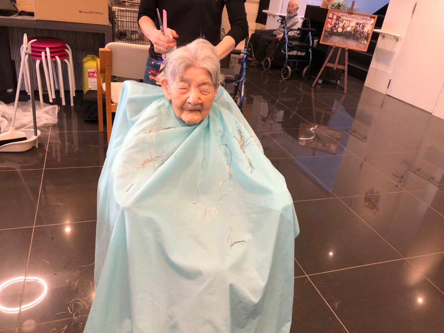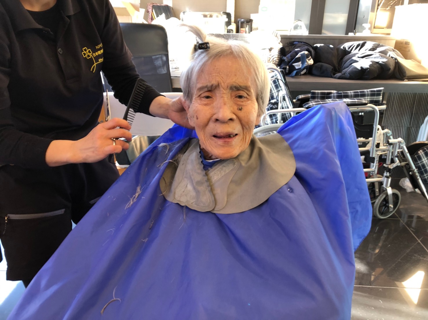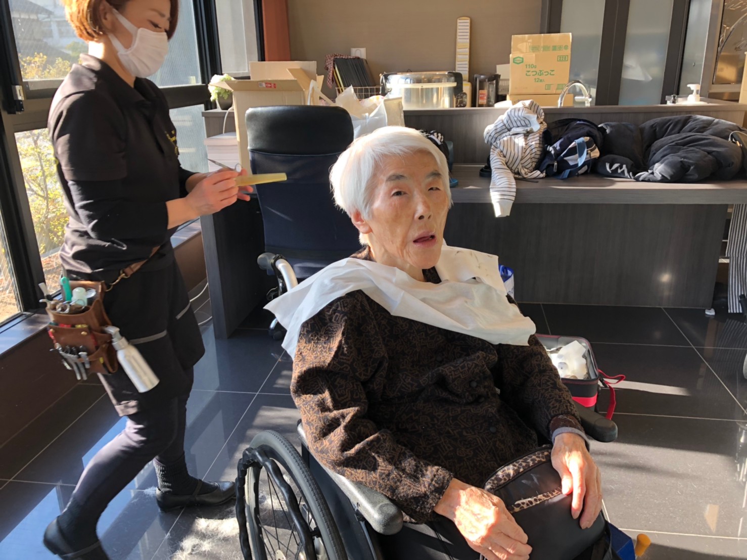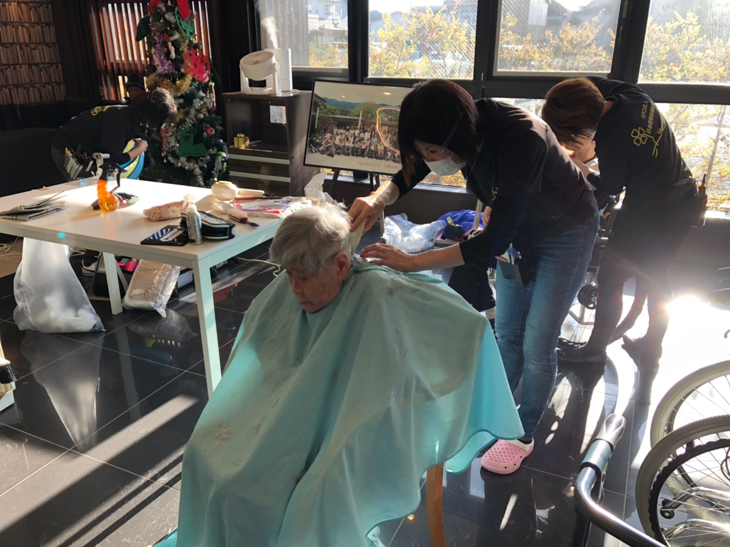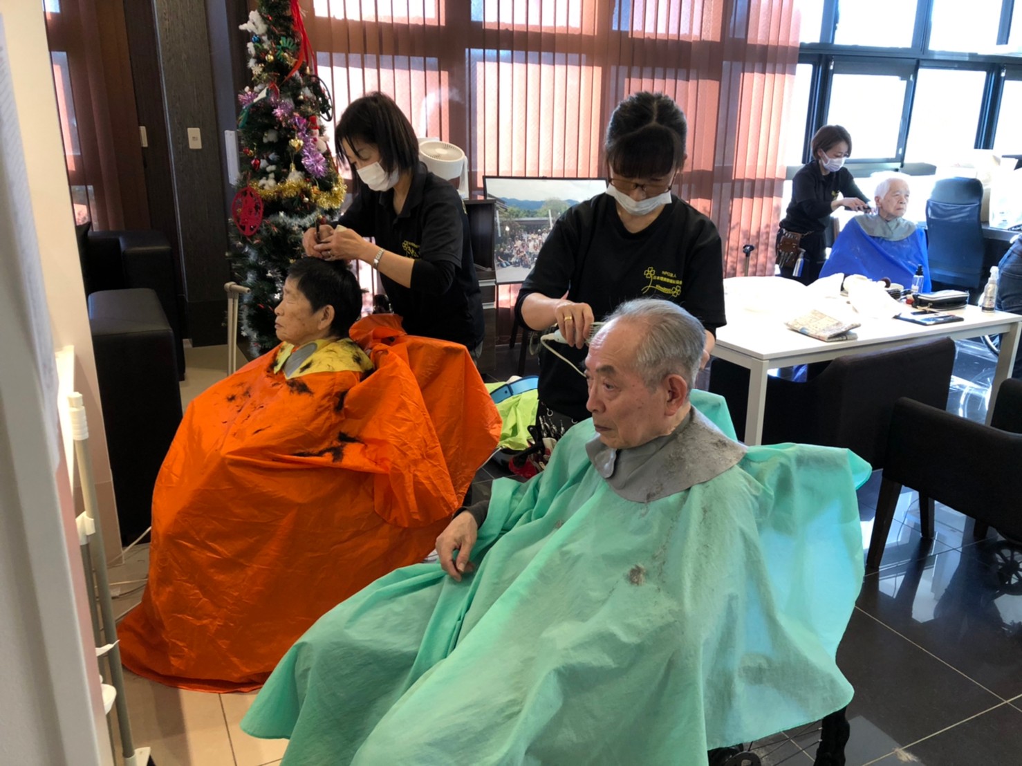 日本理美容福祉協会さんにお越しいただき、ほぼすべてのご利用者さまがお正月に向け、髪の毛を切っていただきました。皆さまが順番に切っていただいている間、お待ちになっている利用者さまが「今日はどうしてもらう?」「長くのばそうかな~」「あんたは短い方が似合うよ」なんて話されているのを見て、お幾つになられても女の子の会話はか変わらないんだな~って思いました。♪あといくつ寝るとお正月♪(*’ω’*)その前に、クリスマス会にお餅つきとまだまだ12月は終わりません。