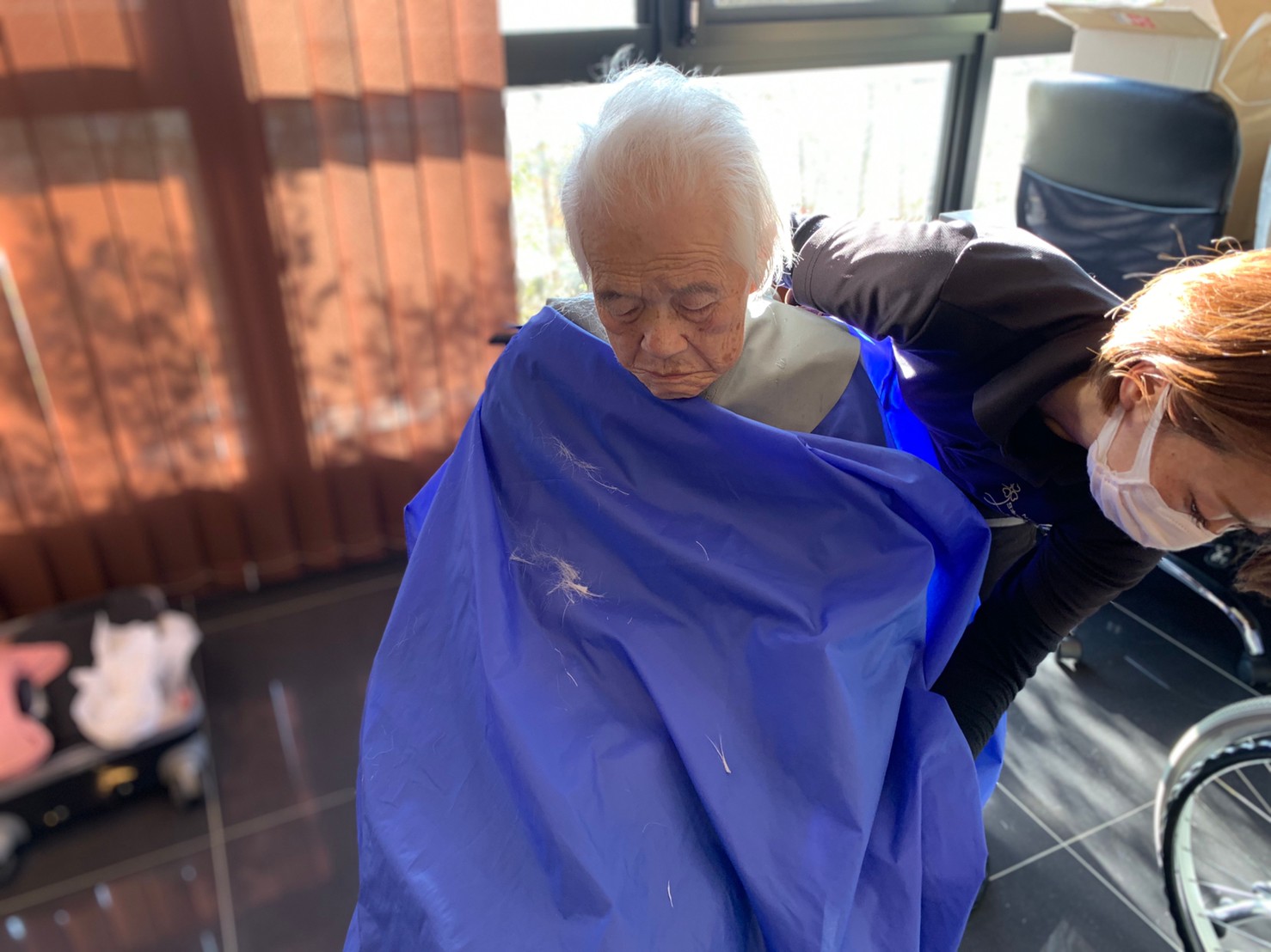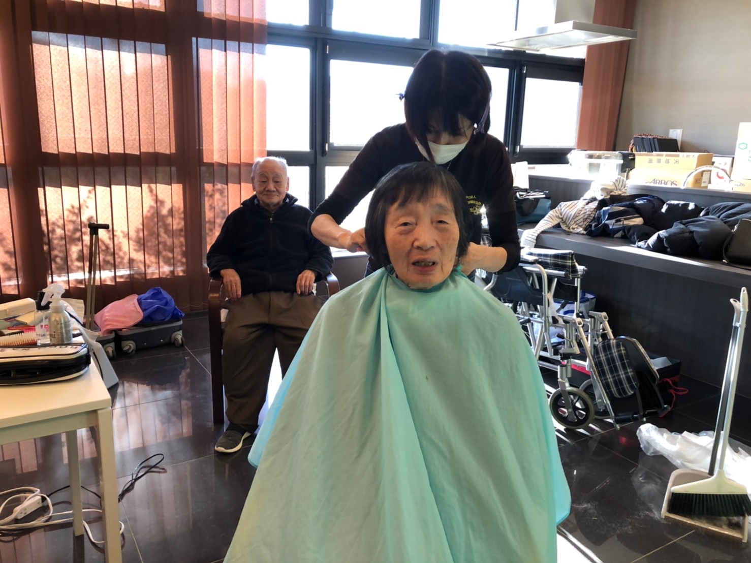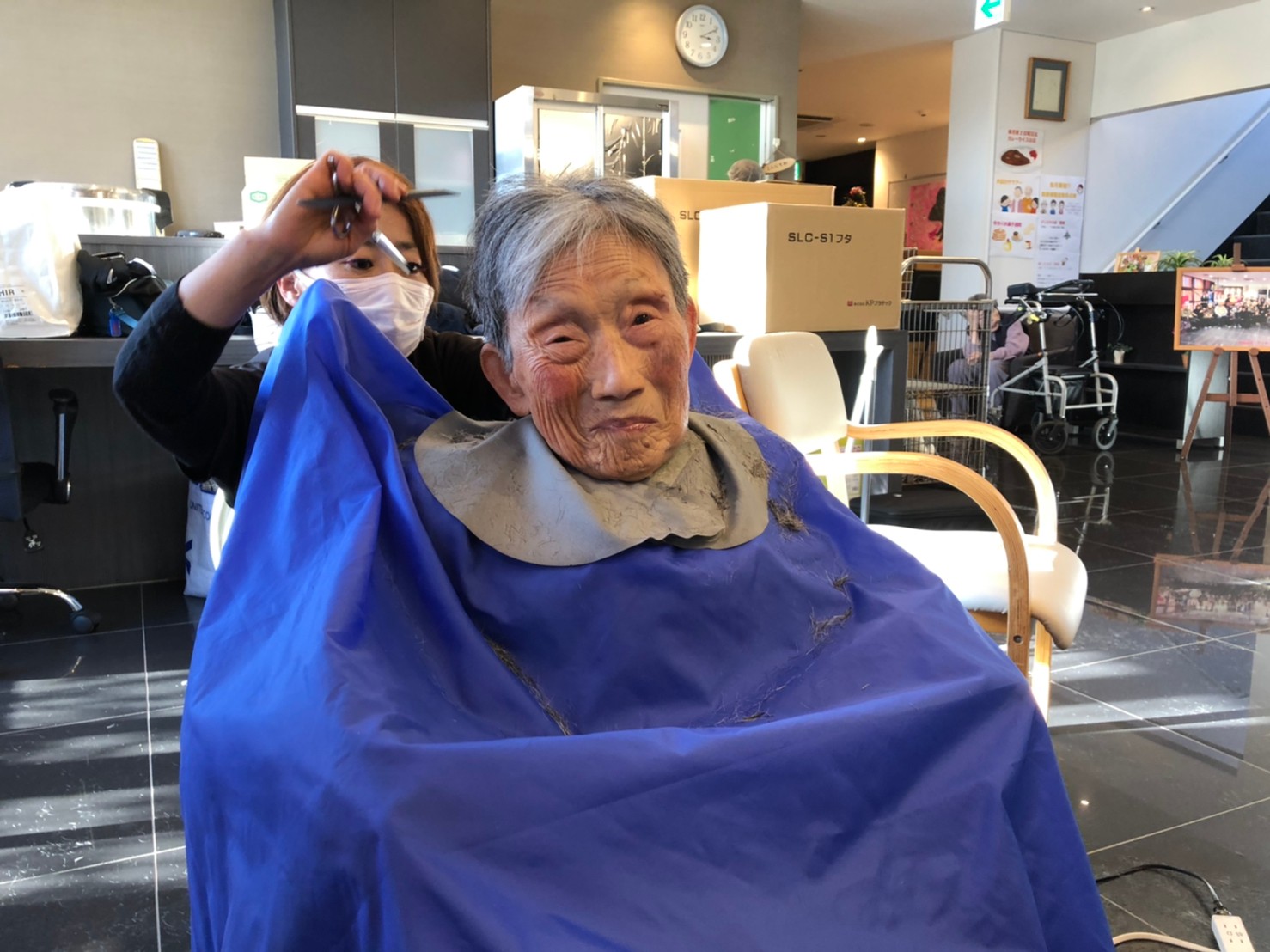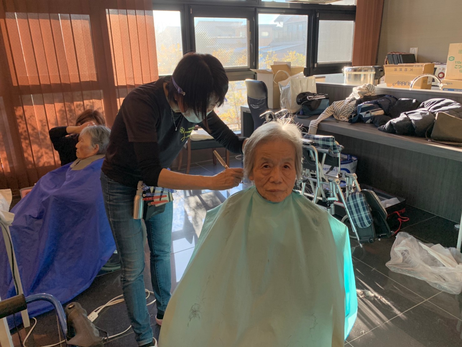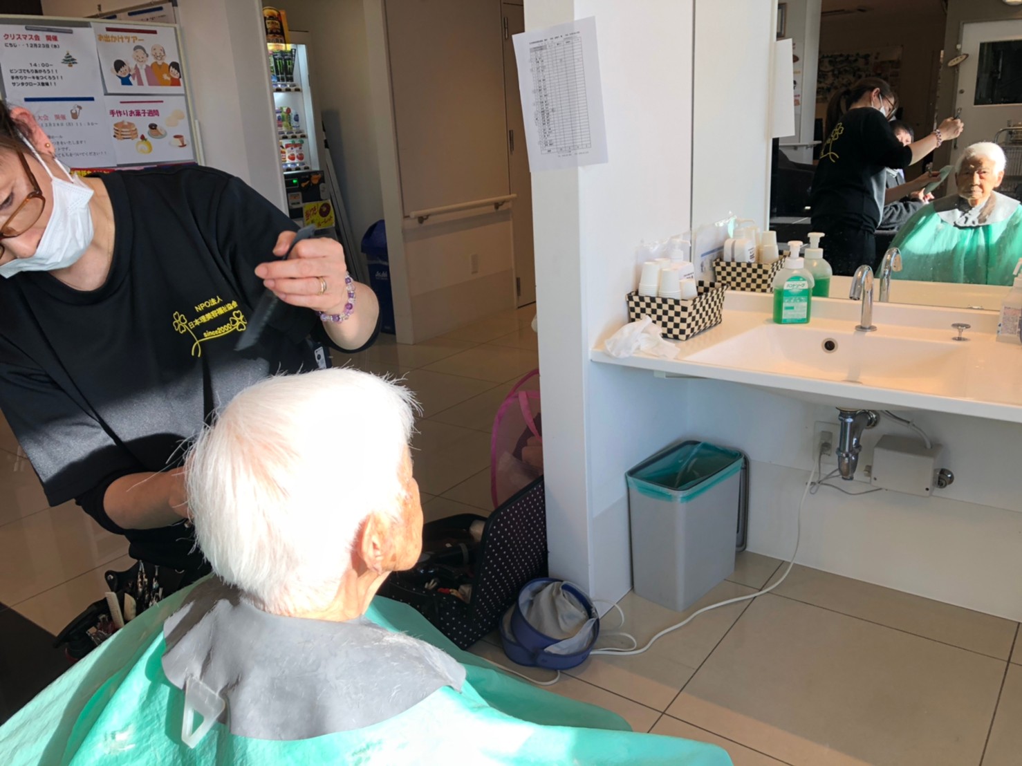 日本理美容福祉協会さんにお越しいただき、ほぼすべてのご利用者さまがお正月に向け、髪の毛を切っていただきました。皆さまが順番に切っていただいている間、お待ちになっている利用者さまが「今日はどうしてもらう?」「長くのばそうかな~」「あんたは短い方が似合うよ」なんて話されているのを見て、お幾つになられても女の子の会話はか変わらないんだな~って思いました。♪あといくつ寝るとお正月♪(*’ω’*)その前に、クリスマス会にお餅つきとまだまだ12月は終わりません。
