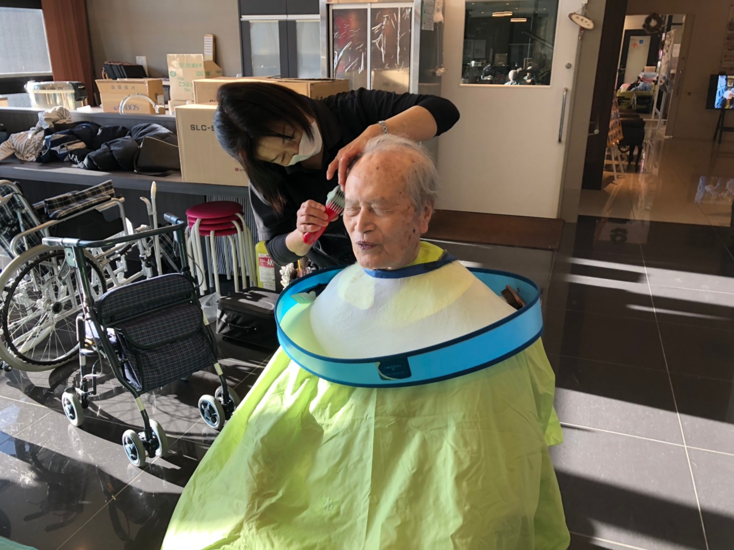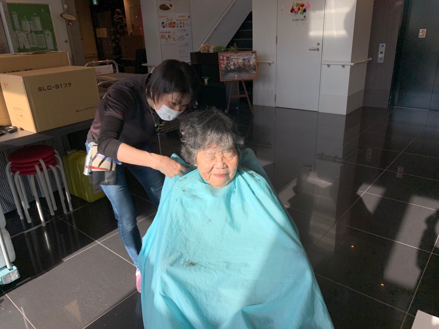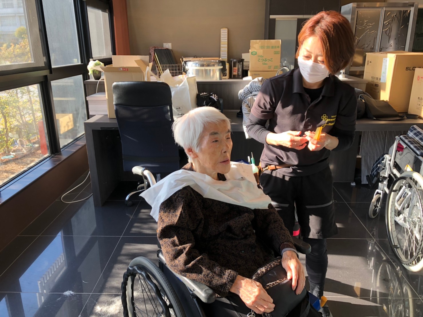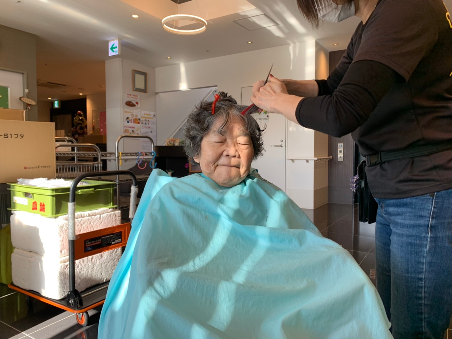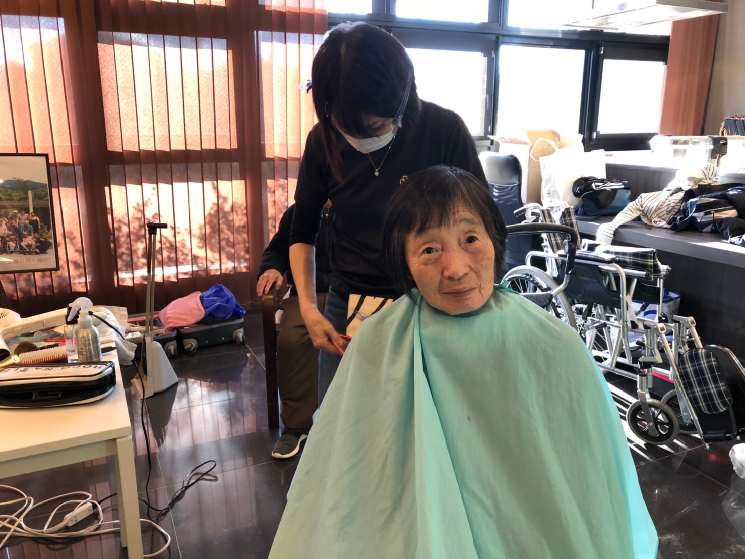 日本理美容福祉協会さんにお越しいただき、ほぼすべてのご利用者さまがお正月に向け、髪の毛を切っていただきました。皆さまが順番に切っていただいている間、お待ちになっている利用者さまが「今日はどうしてもらう?」「長くのばそうかな~」「あんたは短い方が似合うよ」なんて話されているのを見て、お幾つになられても女の子の会話はか変わらないんだな~って思いました。♪あといくつ寝るとお正月♪(*’ω’*)その前に、クリスマス会にお餅つきとまだまだ12月は終わりません。