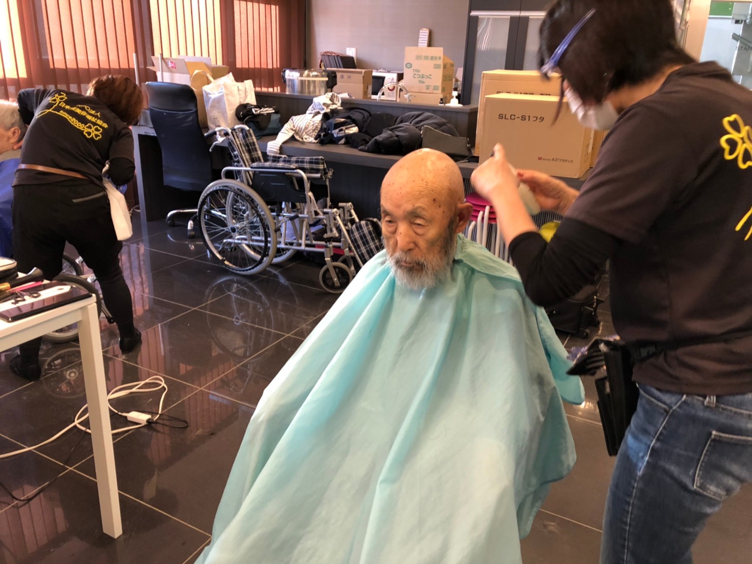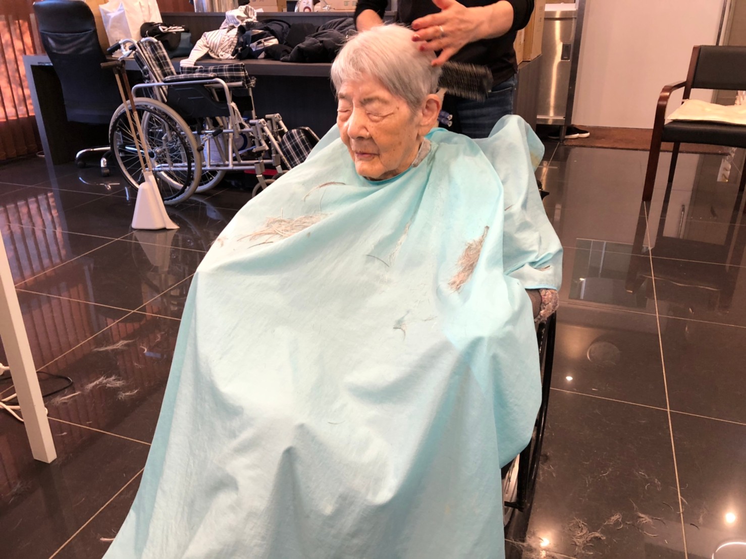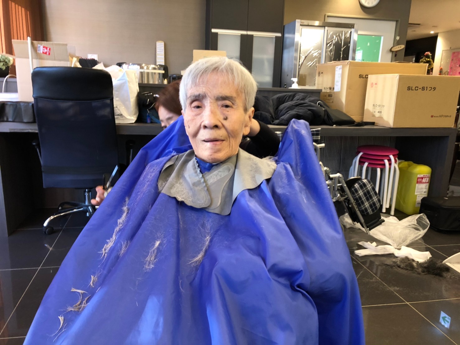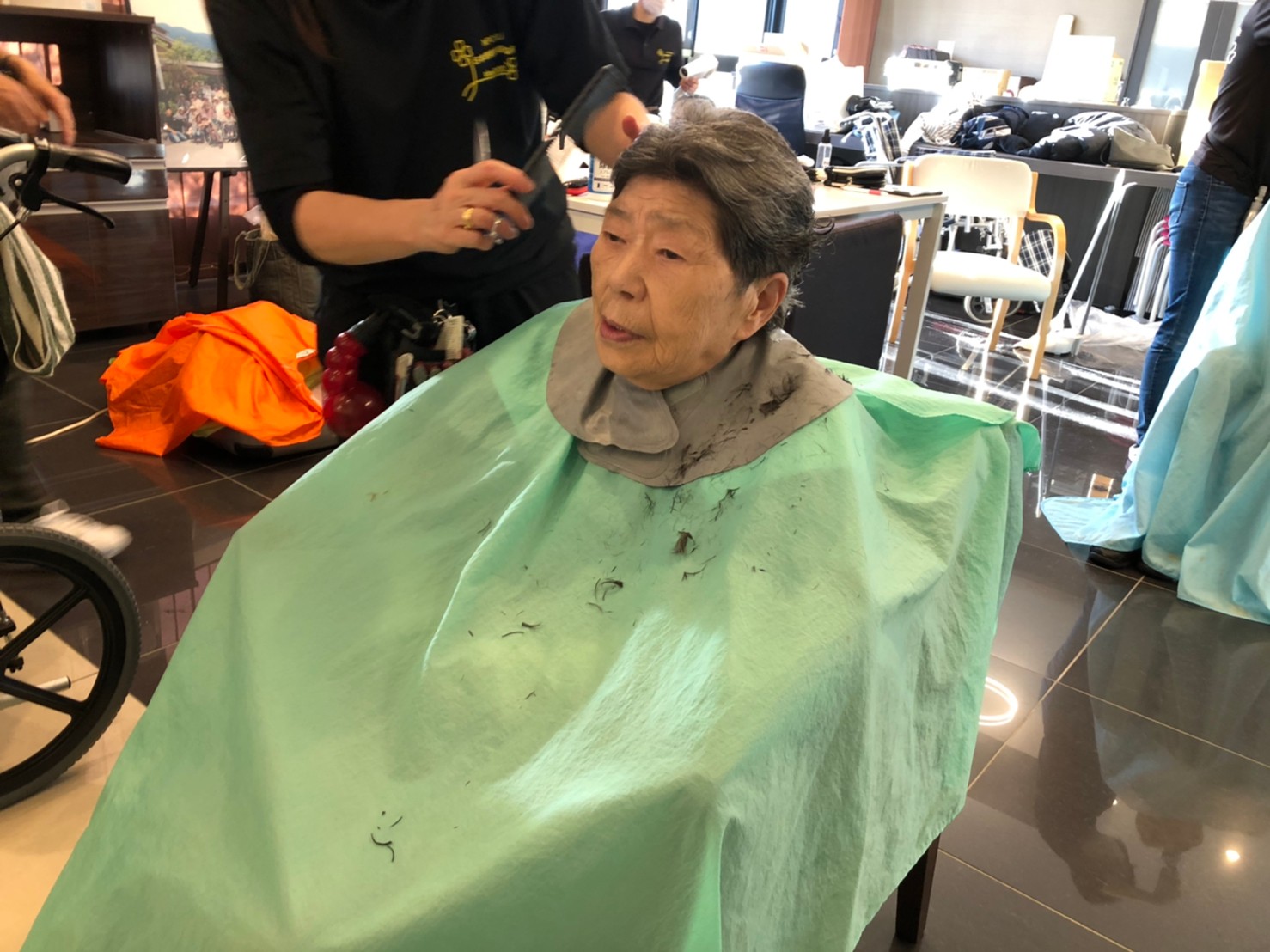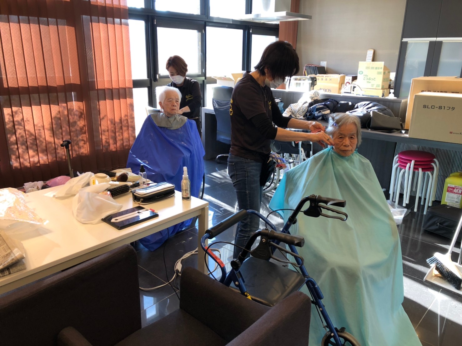 日本理美容福祉協会さんにお越しいただき、ほぼすべてのご利用者さまがお正月に向け、髪の毛を切っていただきました。皆さまが順番に切っていただいている間、お待ちになっている利用者さまが「今日はどうしてもらう?」「長くのばそうかな~」「あんたは短い方が似合うよ」なんて話されているのを見て、お幾つになられても女の子の会話はか変わらないんだな~って思いました。♪あといくつ寝るとお正月♪(*’ω’*)その前に、クリスマス会にお餅つきとまだまだ12月は終わりません。