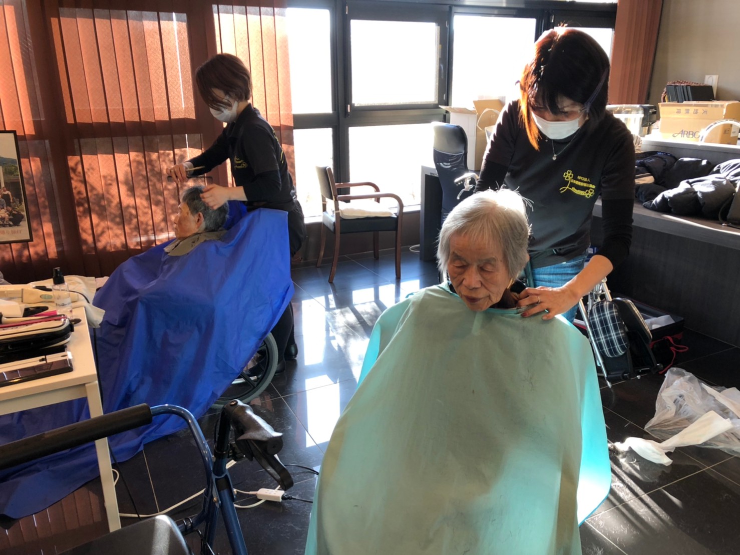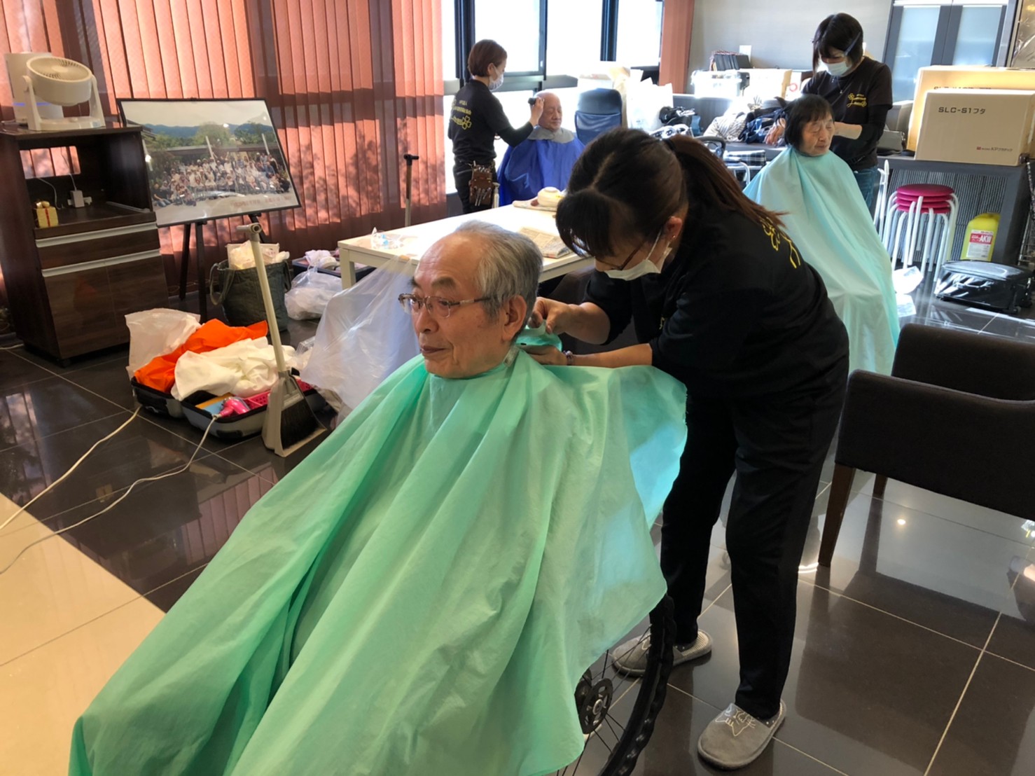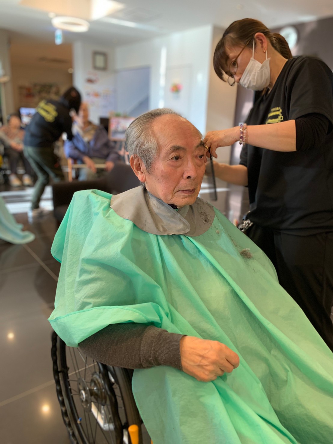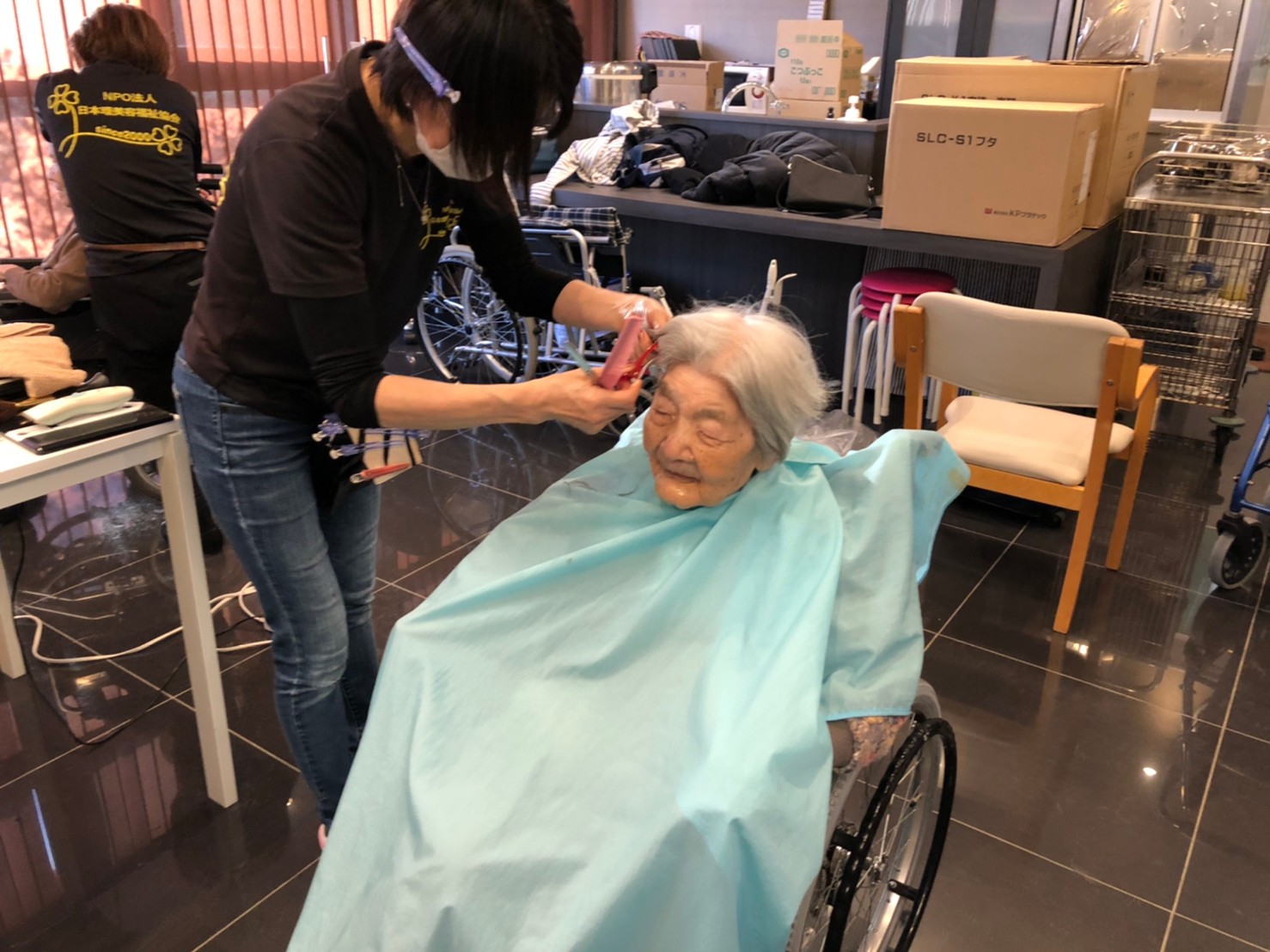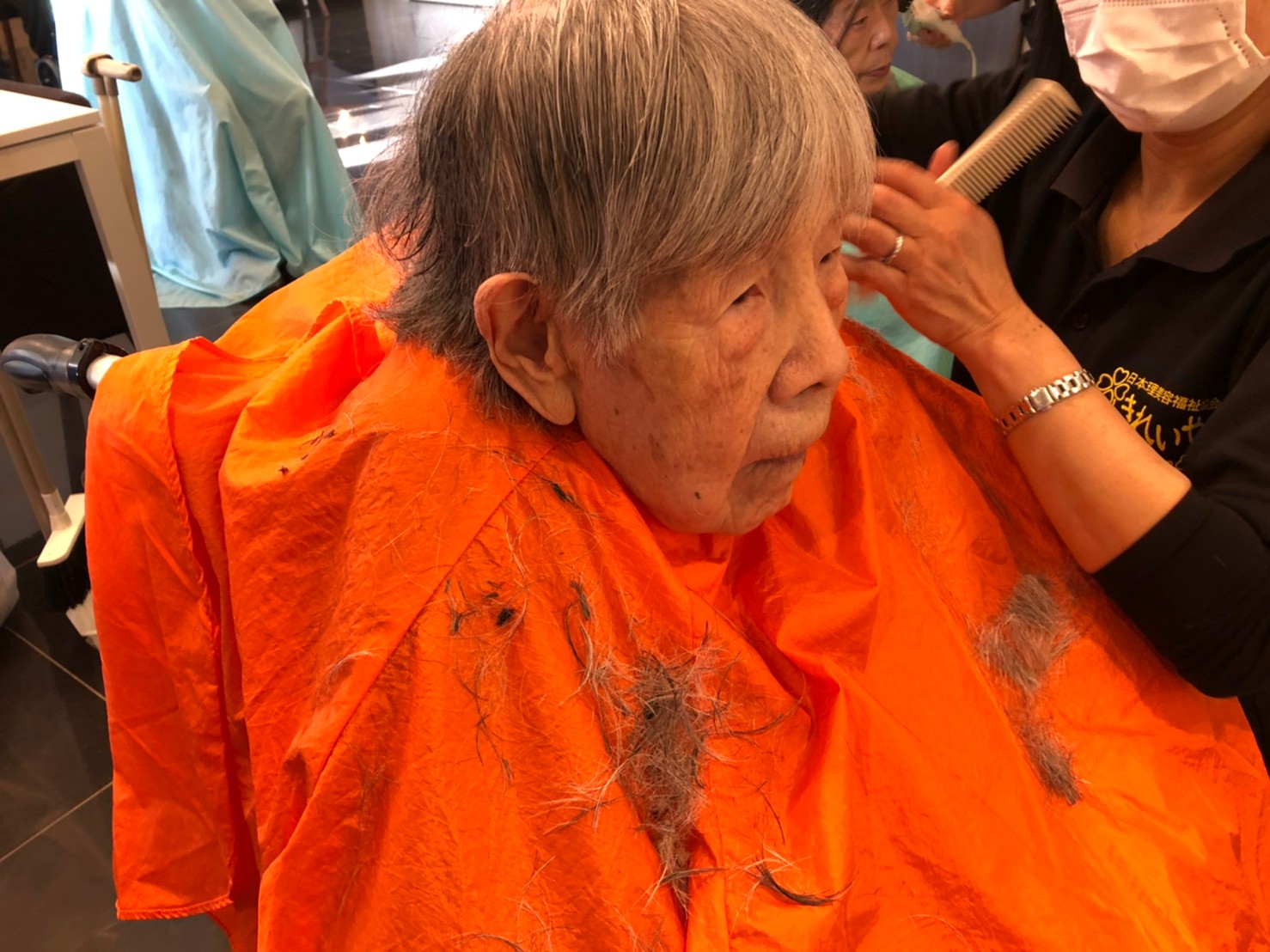 日本理美容福祉協会さんにお越しいただき、ほぼすべてのご利用者さまがお正月に向け、髪の毛を切っていただきました。皆さまが順番に切っていただいている間、お待ちになっている利用者さまが「今日はどうしてもらう?」「長くのばそうかな~」「あんたは短い方が似合うよ」なんて話されているのを見て、お幾つになられても女の子の会話はか変わらないんだな~って思いました。♪あといくつ寝るとお正月♪(*’ω’*)その前に、クリスマス会にお餅つきとまだまだ12月は終わりません。