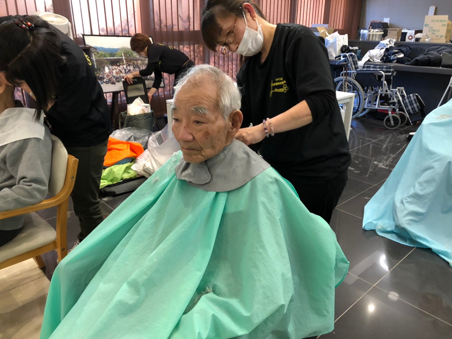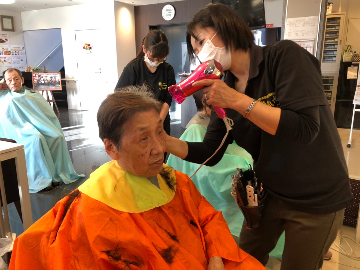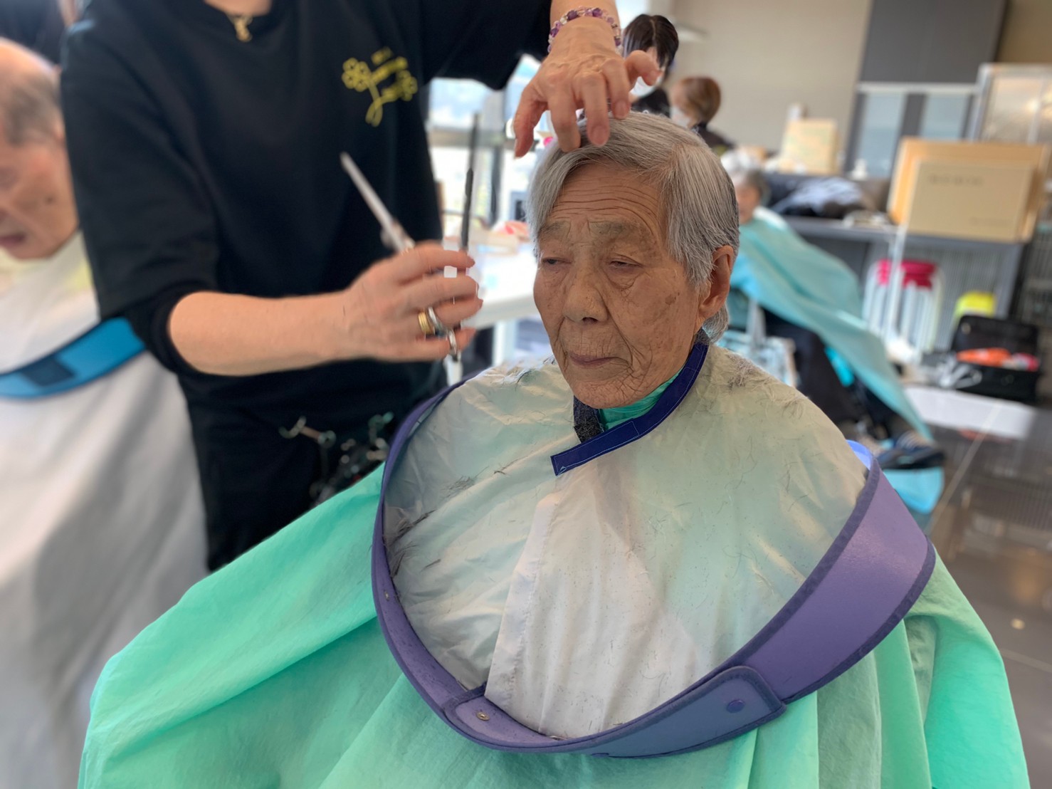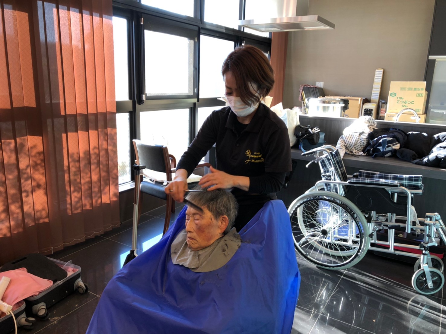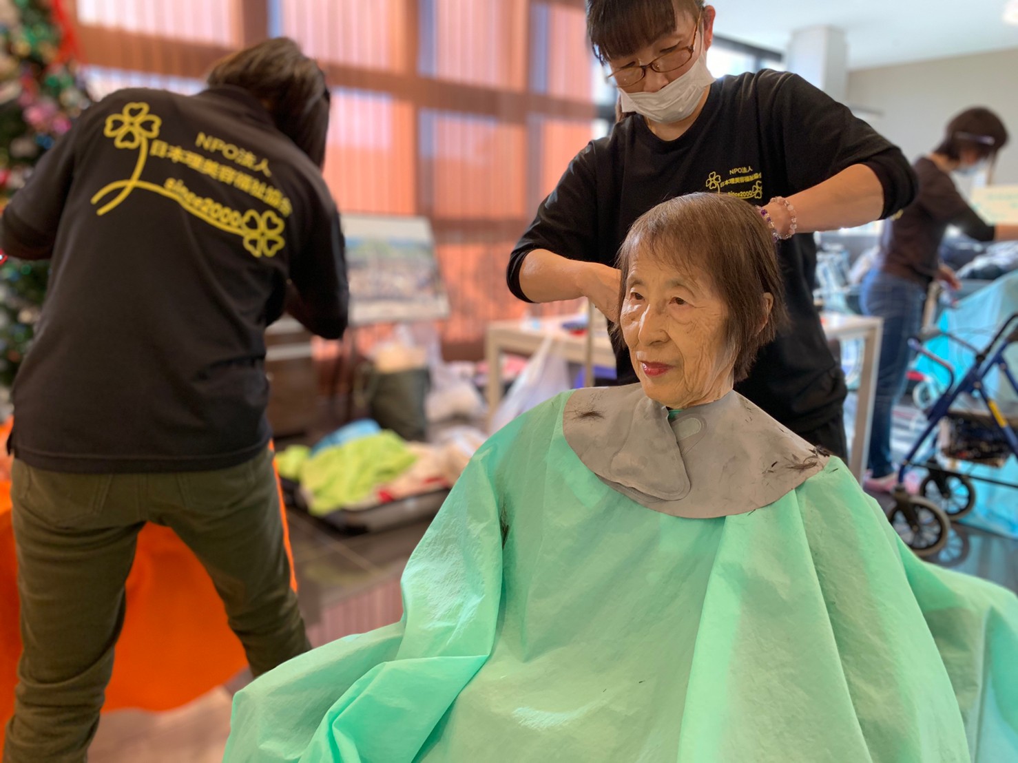日本理美容福祉協会さんにお越しいただき、ほぼすべてのご利用者さまがお正月に向け、髪の毛を切っていただきました。皆さまが順番に切っていただいている間、お待ちになっている利用者さまが「今日はどうしてもらう?」「長くのばそうかな~」「あんたは短い方が似合うよ」なんて話されているのを見て、お幾つになられても女の子の会話はか変わらないんだな~って思いました。♪あといくつ寝るとお正月♪(*’ω’*)その前に、クリスマス会にお餅つきとまだまだ12月は終わりません。