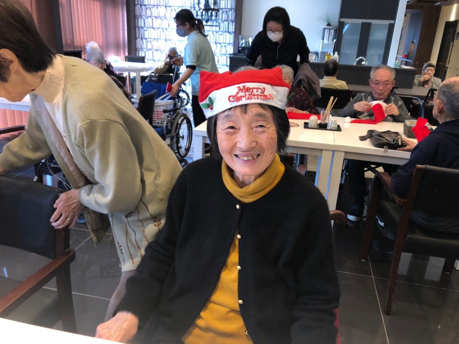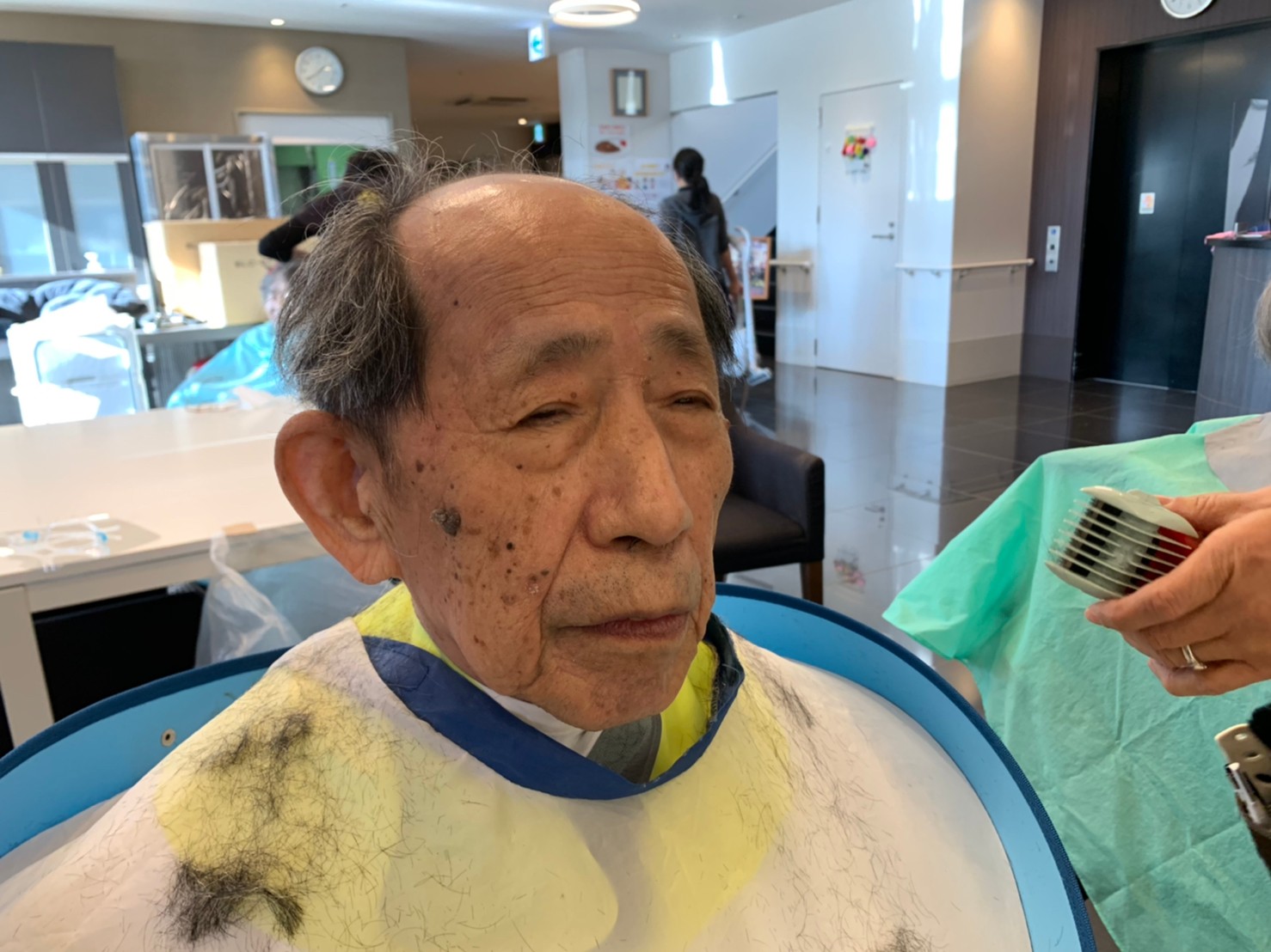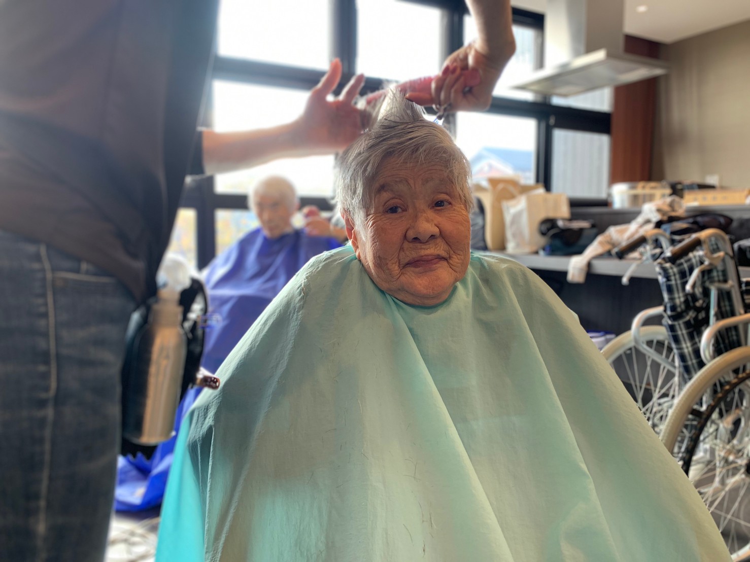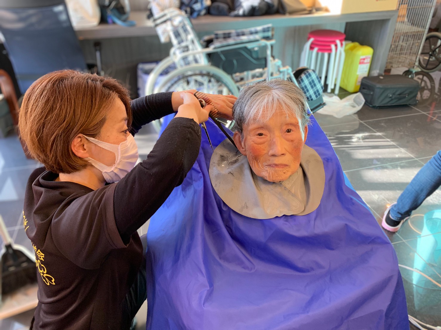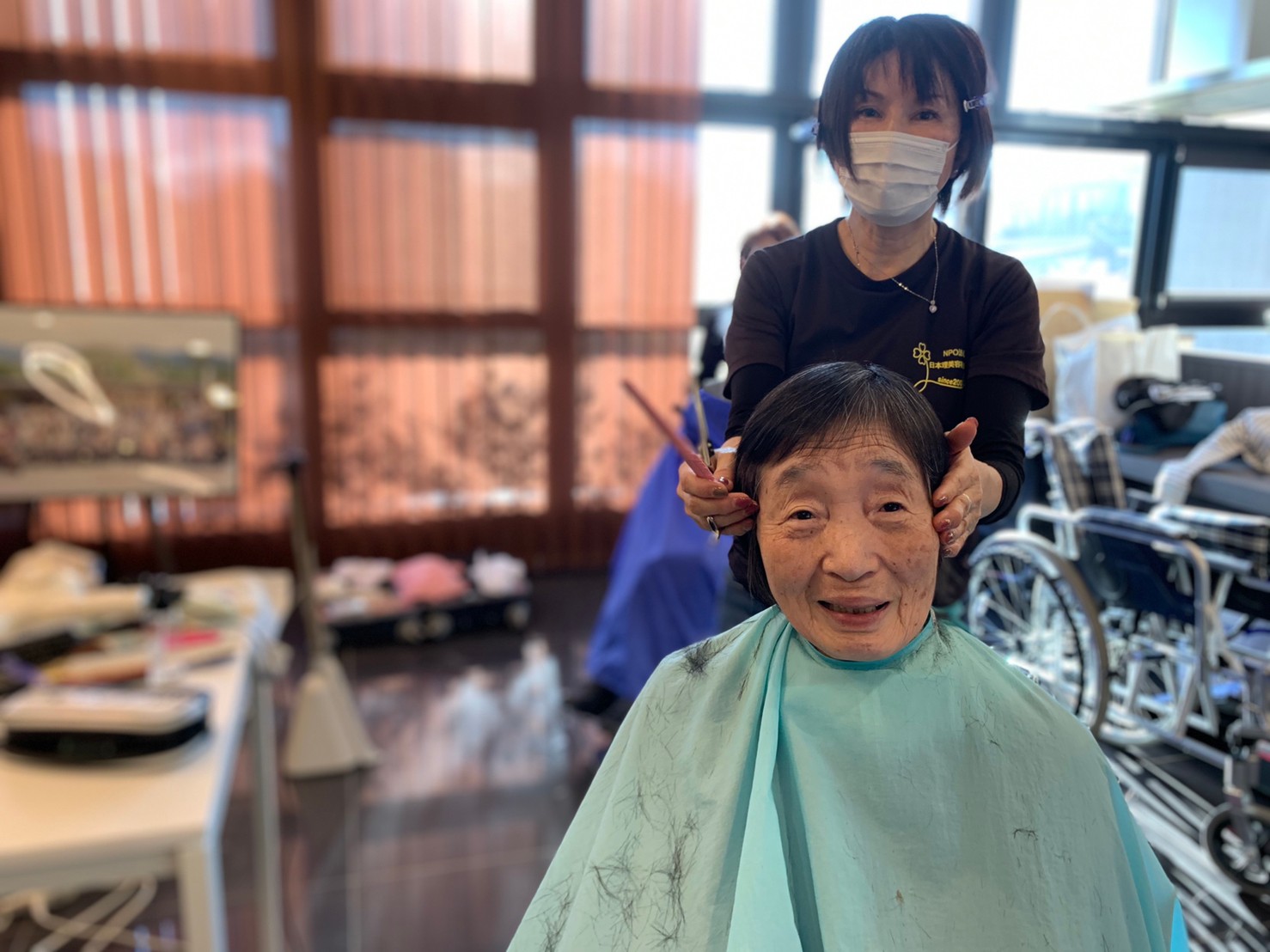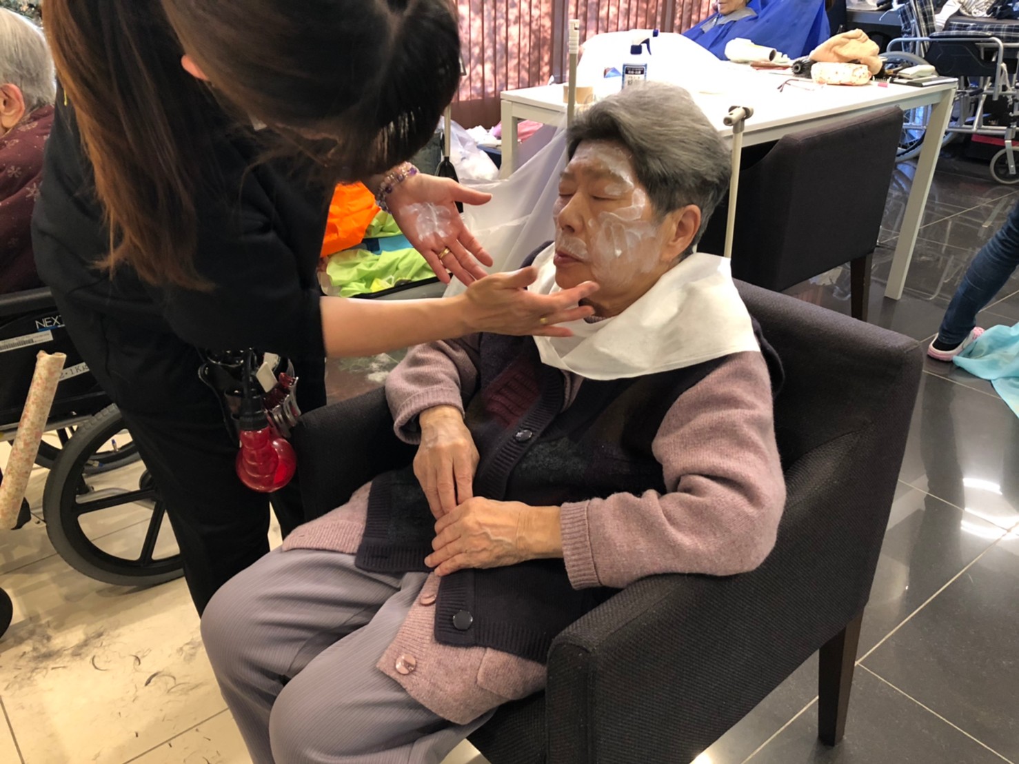 日本理美容福祉協会さんにお越しいただき、ほぼすべてのご利用者さまがお正月に向け、髪の毛を切っていただきました。皆さまが順番に切っていただいている間、お待ちになっている利用者さまが「今日はどうしてもらう?」「長くのばそうかな~」「あんたは短い方が似合うよ」なんて話されているのを見て、お幾つになられても女の子の会話はか変わらないんだな~って思いました。♪あといくつ寝るとお正月♪(*’ω’*)その前に、クリスマス会にお餅つきとまだまだ12月は終わりません。