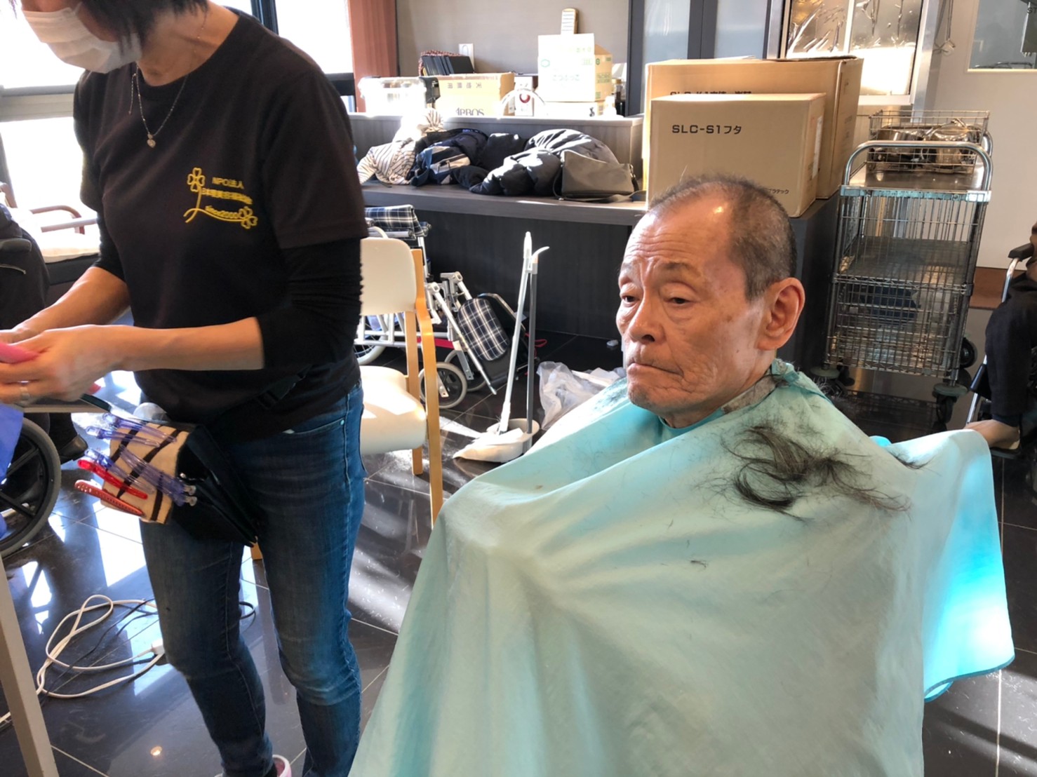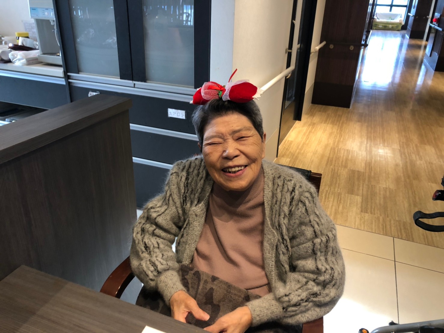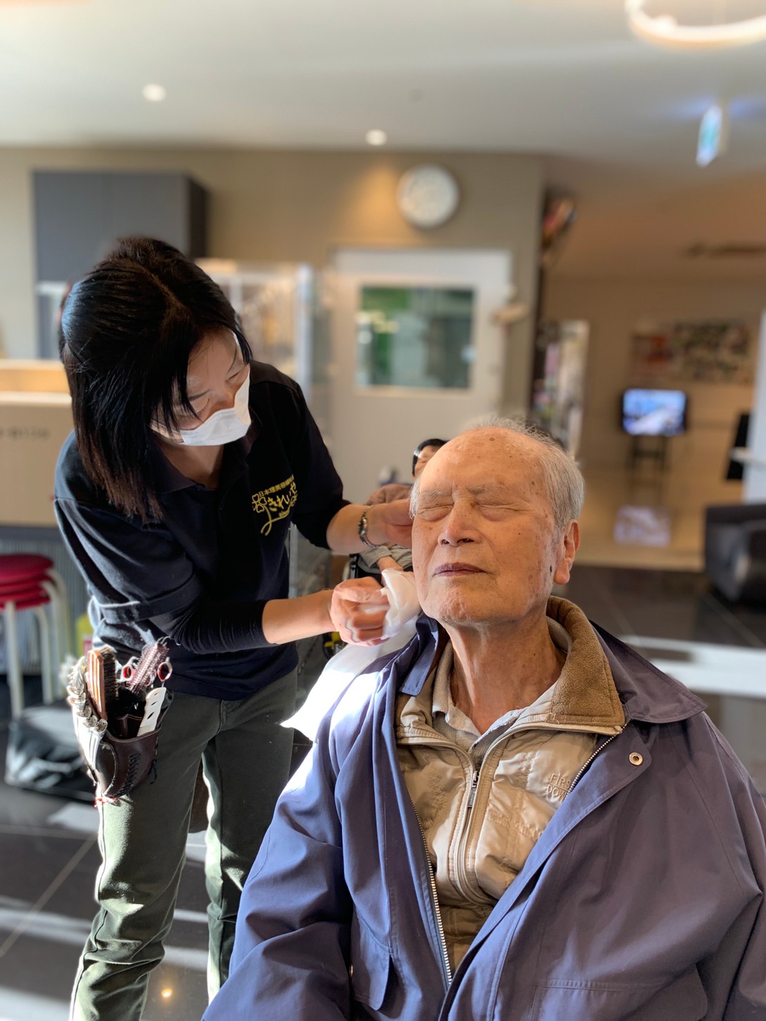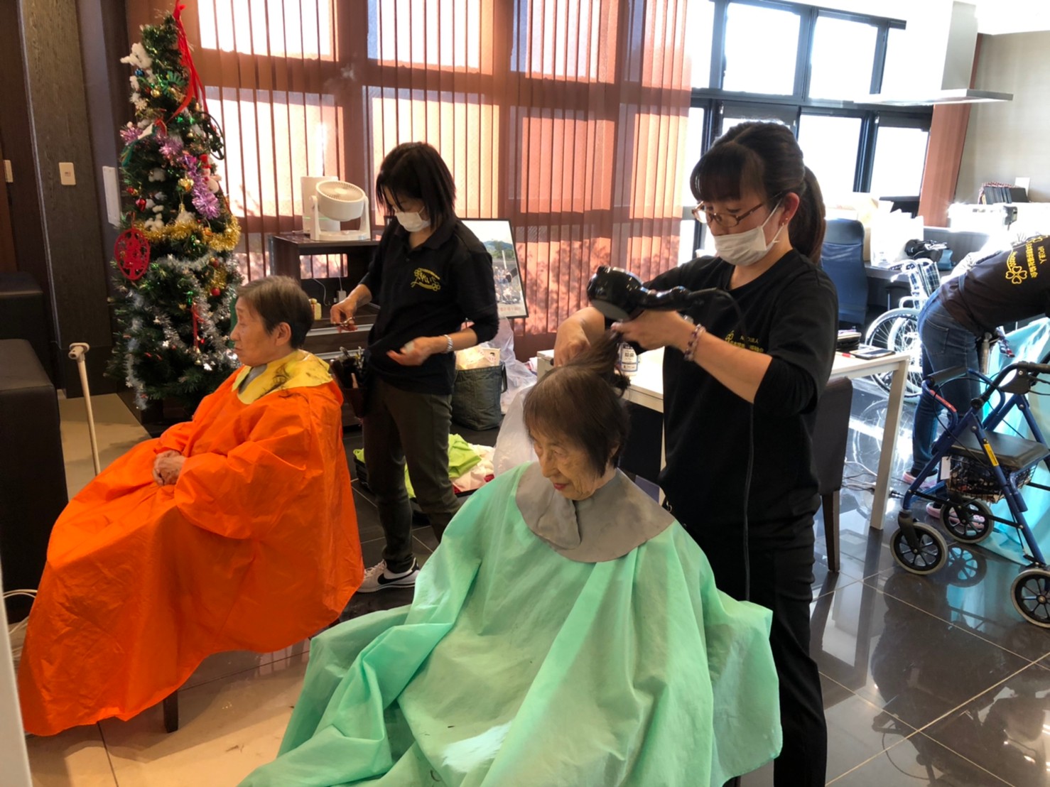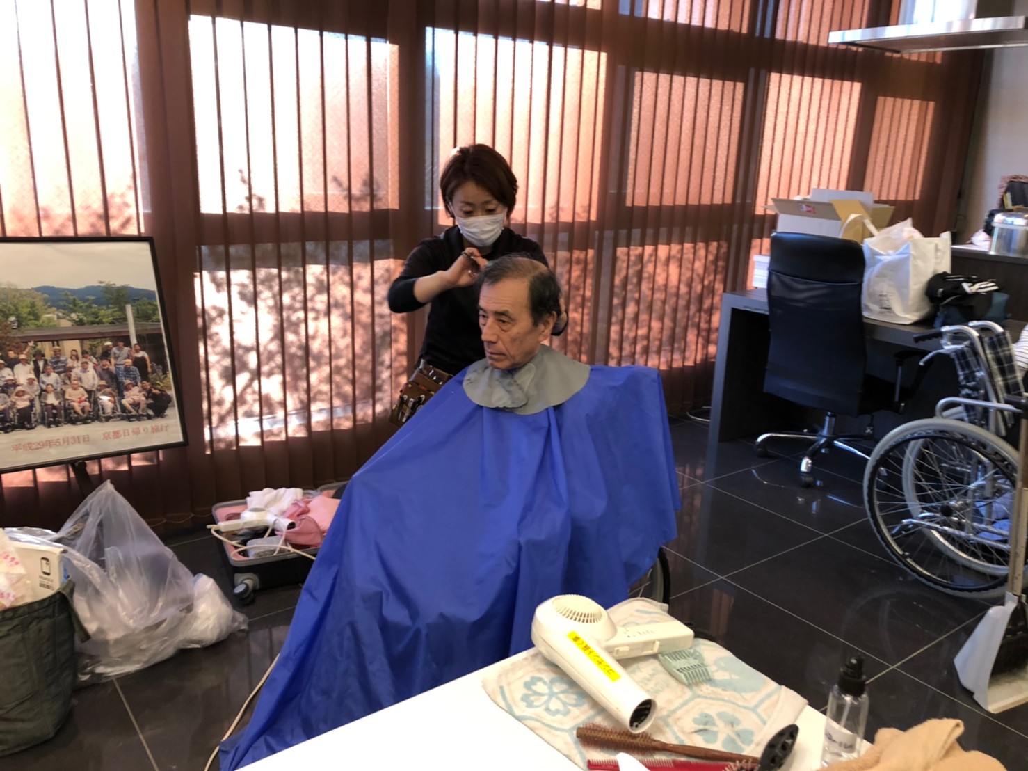 日本理美容福祉協会さんにお越しいただき、ほぼすべてのご利用者さまがお正月に向け、髪の毛を切っていただきました。皆さまが順番に切っていただいている間、お待ちになっている利用者さまが「今日はどうしてもらう?」「長くのばそうかな~」「あんたは短い方が似合うよ」なんて話されているのを見て、お幾つになられても女の子の会話はか変わらないんだな~って思いました。♪あといくつ寝るとお正月♪(*’ω’*)その前に、クリスマス会にお餅つきとまだまだ12月は終わりません。