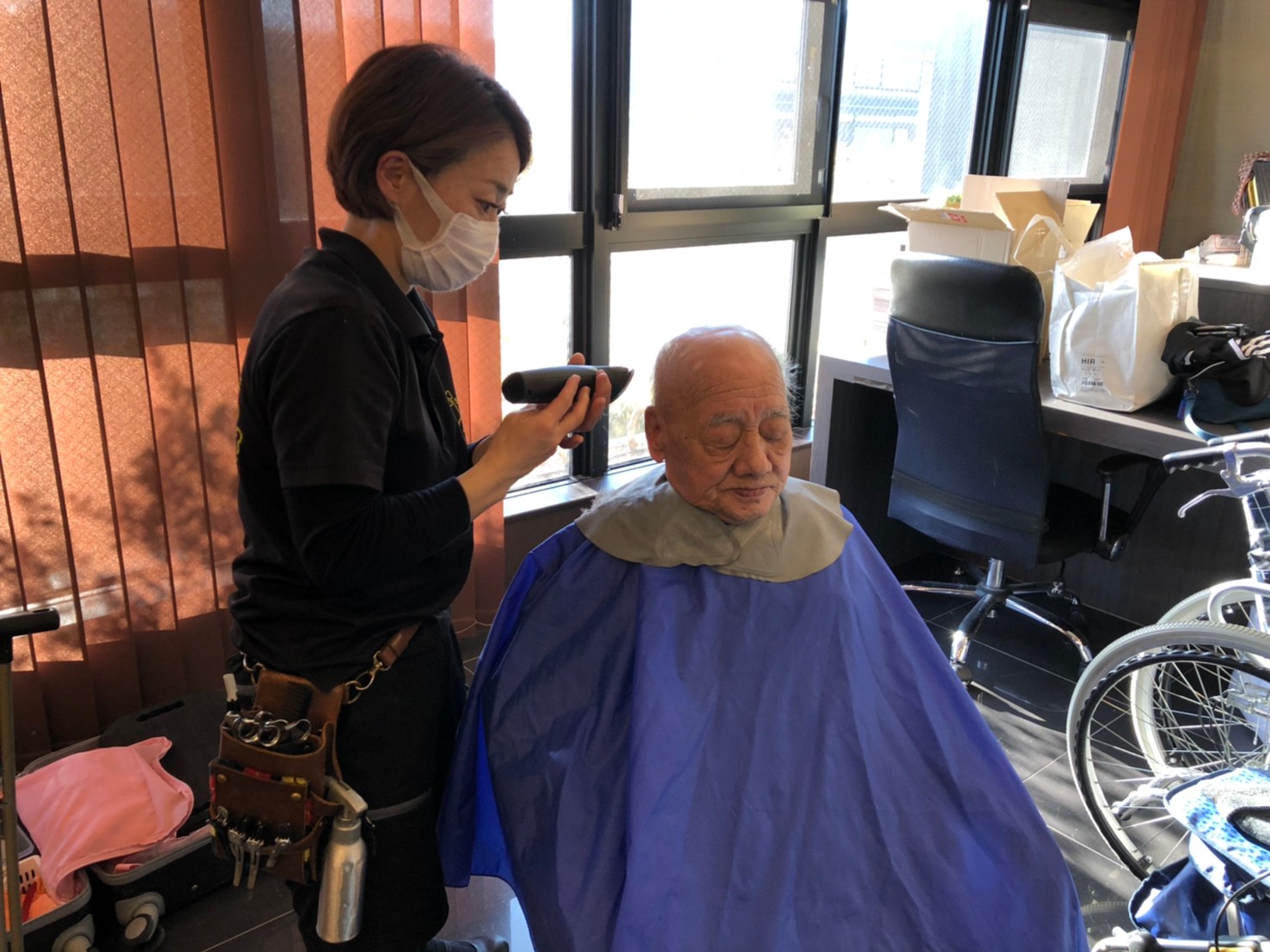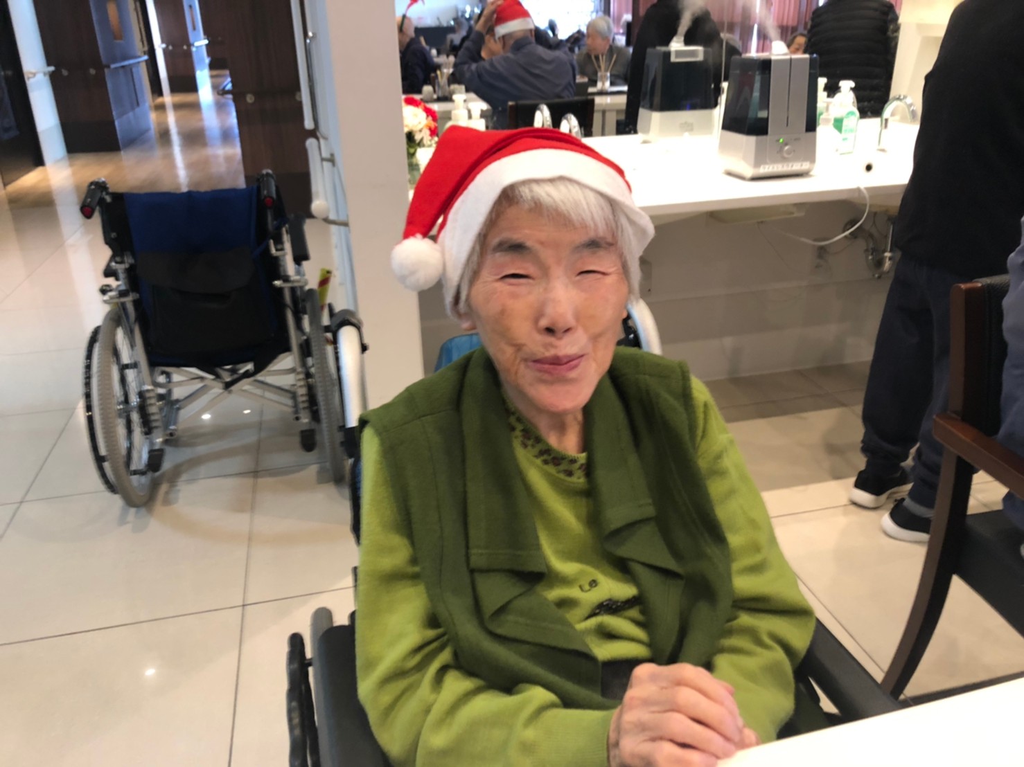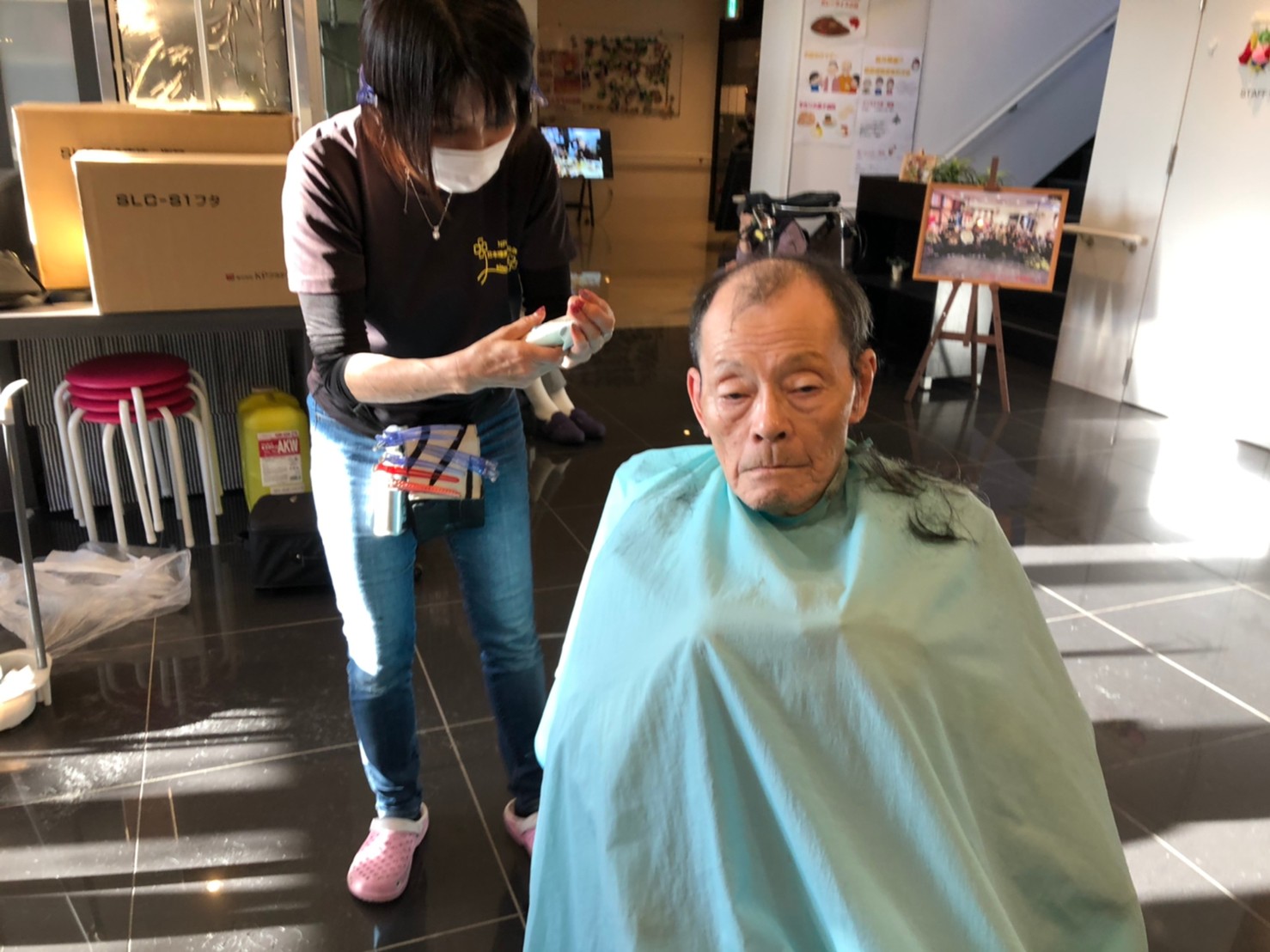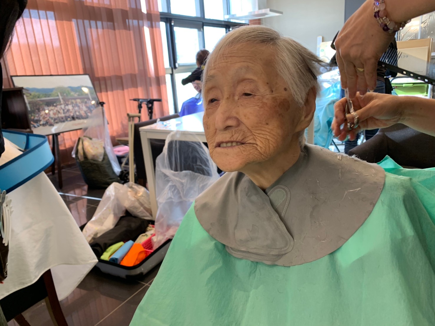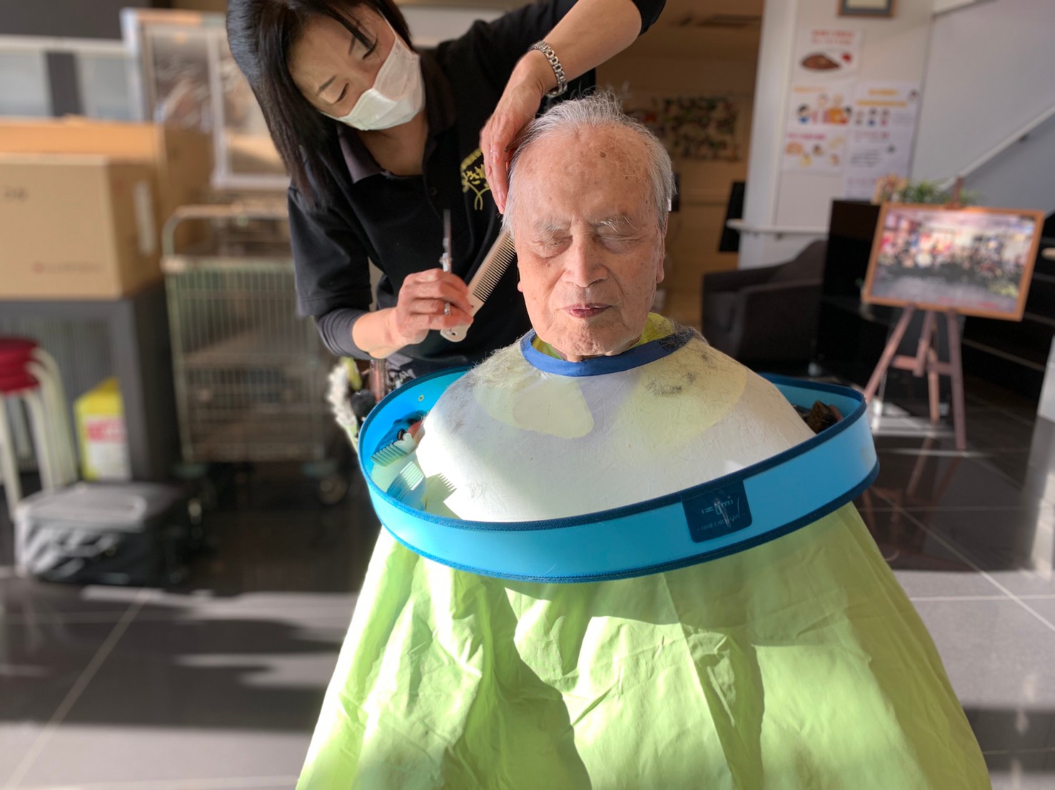 日本理美容福祉協会さんにお越しいただき、ほぼすべてのご利用者さまがお正月に向け、髪の毛を切っていただきました。皆さまが順番に切っていただいている間、お待ちになっている利用者さまが「今日はどうしてもらう?」「長くのばそうかな~」「あんたは短い方が似合うよ」なんて話されているのを見て、お幾つになられても女の子の会話はか変わらないんだな~って思いました。♪あといくつ寝るとお正月♪(*’ω’*)その前に、クリスマス会にお餅つきとまだまだ12月は終わりません。