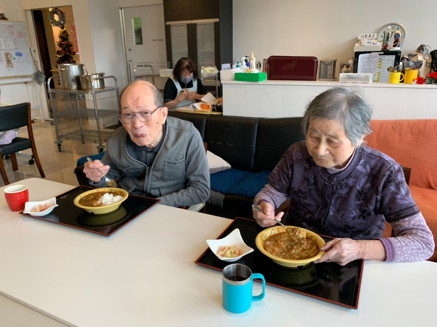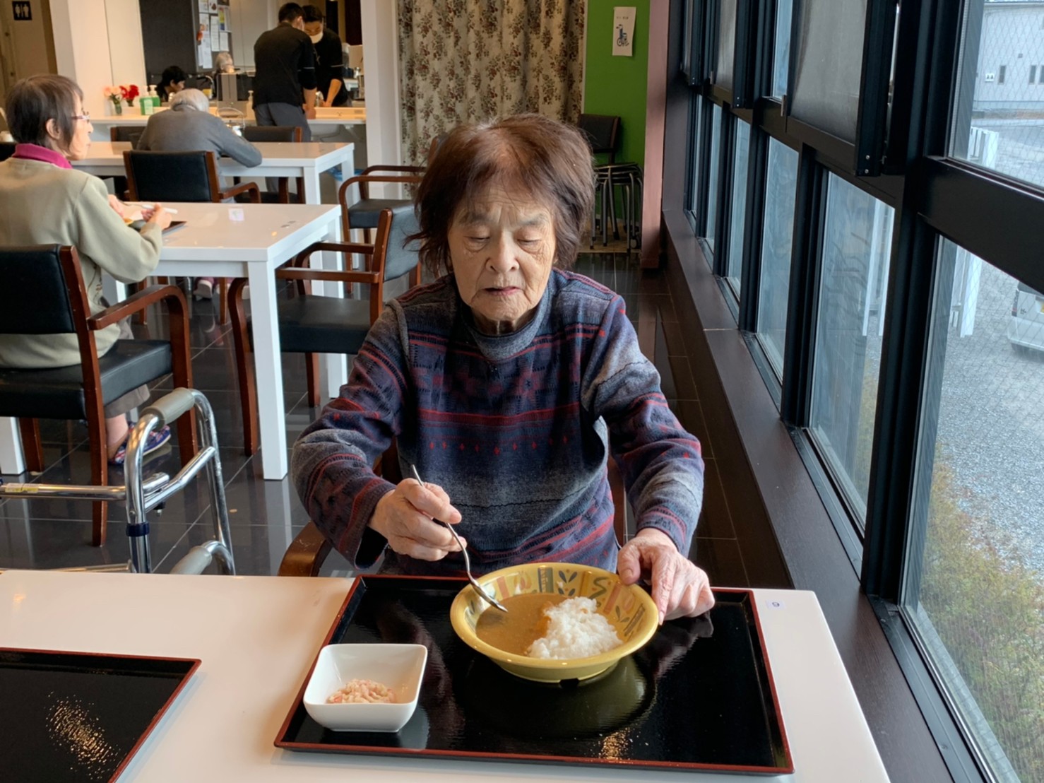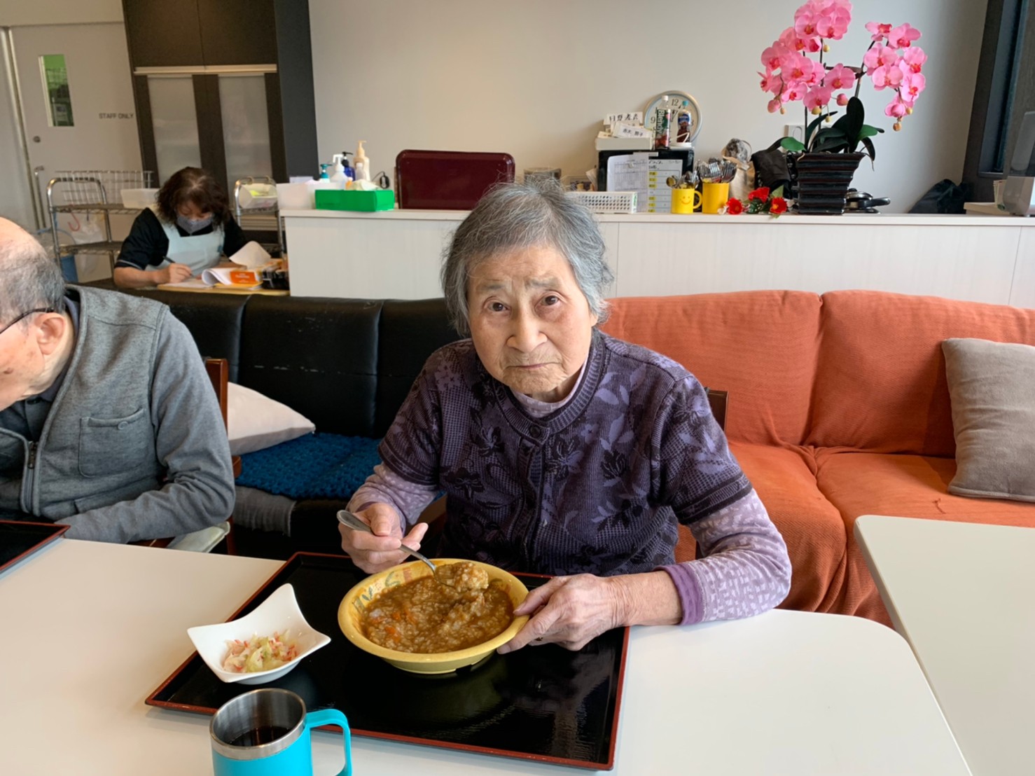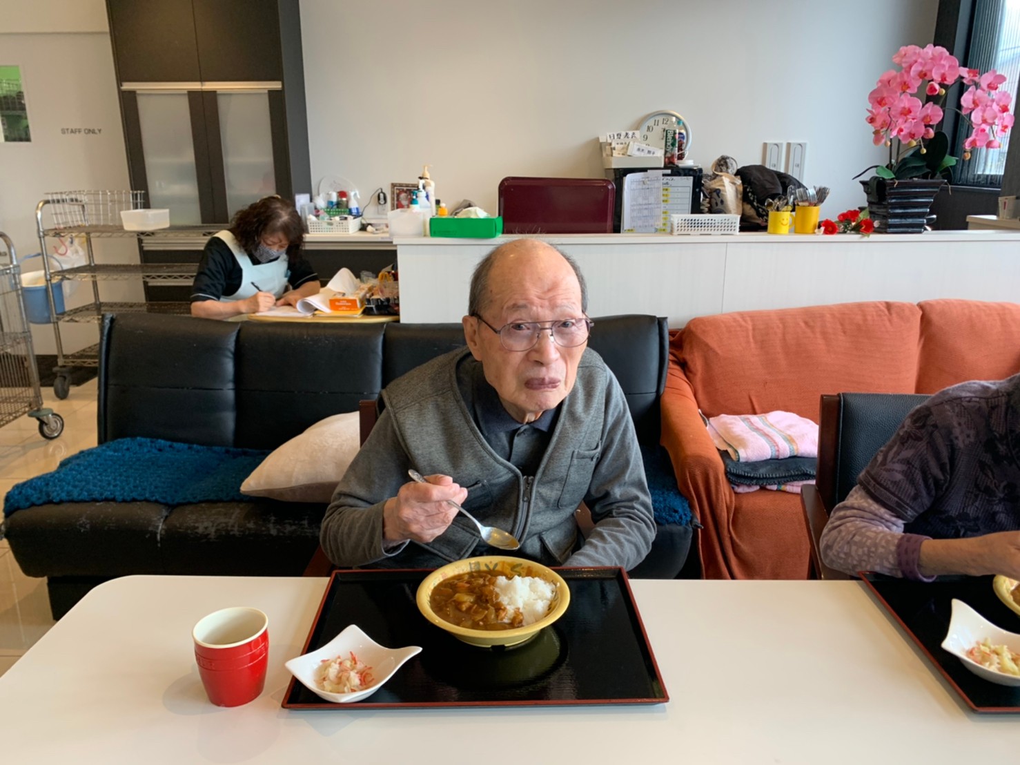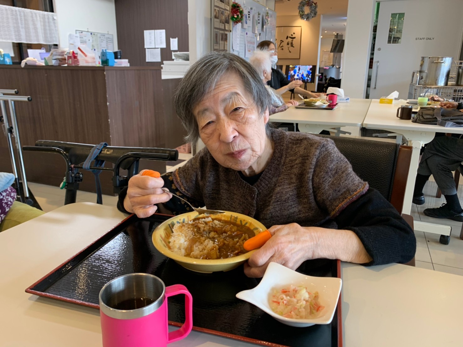 今日はおかわり推奨のカレーの日。カレーに飽きないようにカレーのルーを毎月変えてみたりと味を変えています。今日のカレーは中辛でもいつもより辛かったみたいでした。辛いのが苦手な方用に甘口も一緒に作り、皆さまが召し上がられる直前にお聞きし、好きな味を選んでいただいています。おかわりで味を変えられたりといつも以上に食がすすんでいました。