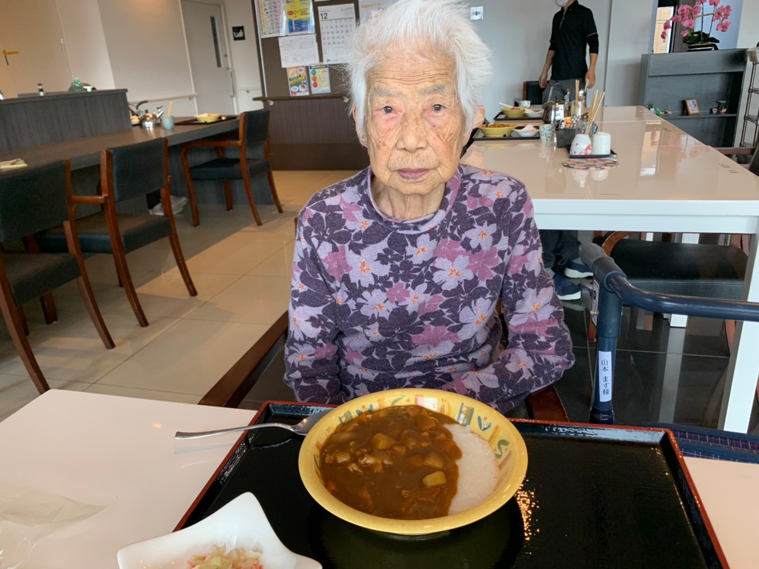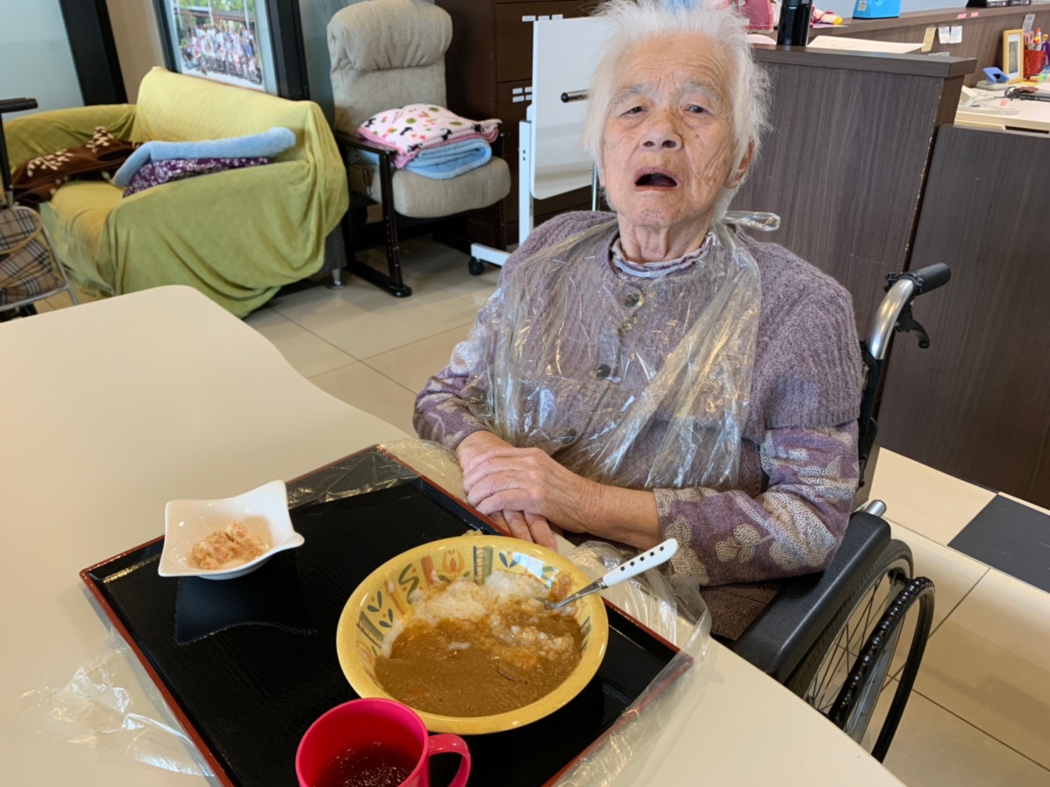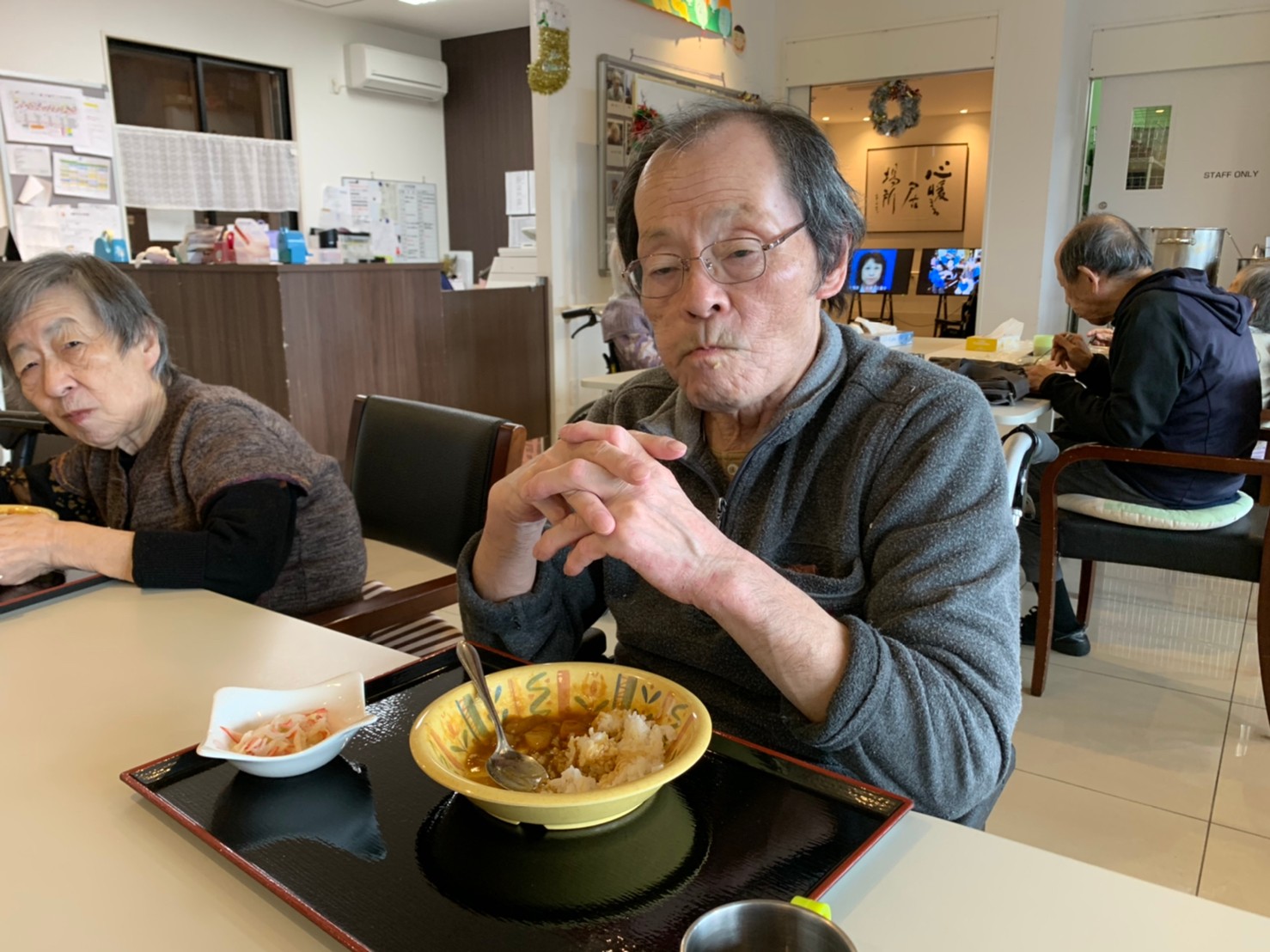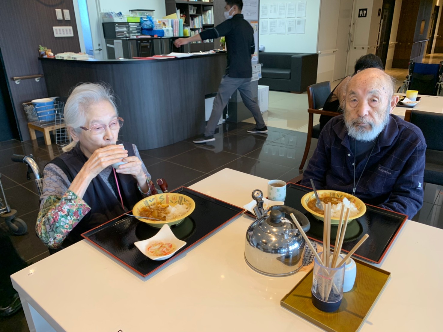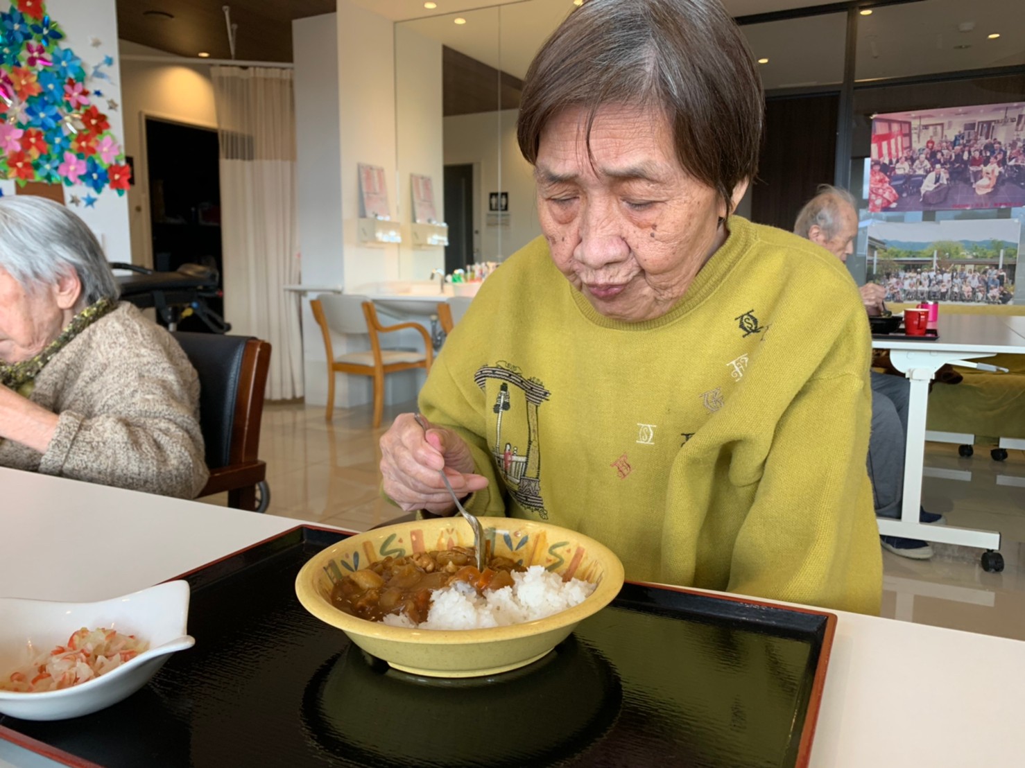 今日はおかわり推奨のカレーの日。カレーに飽きないようにカレーのルーを毎月変えてみたりと味を変えています。今日のカレーは中辛でもいつもより辛かったみたいでした。辛いのが苦手な方用に甘口も一緒に作り、皆さまが召し上がられる直前にお聞きし、好きな味を選んでいただいています。おかわりで味を変えられたりといつも以上に食がすすんでいました。