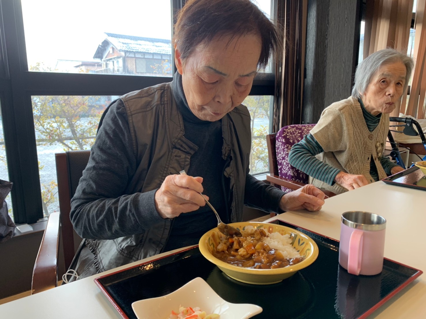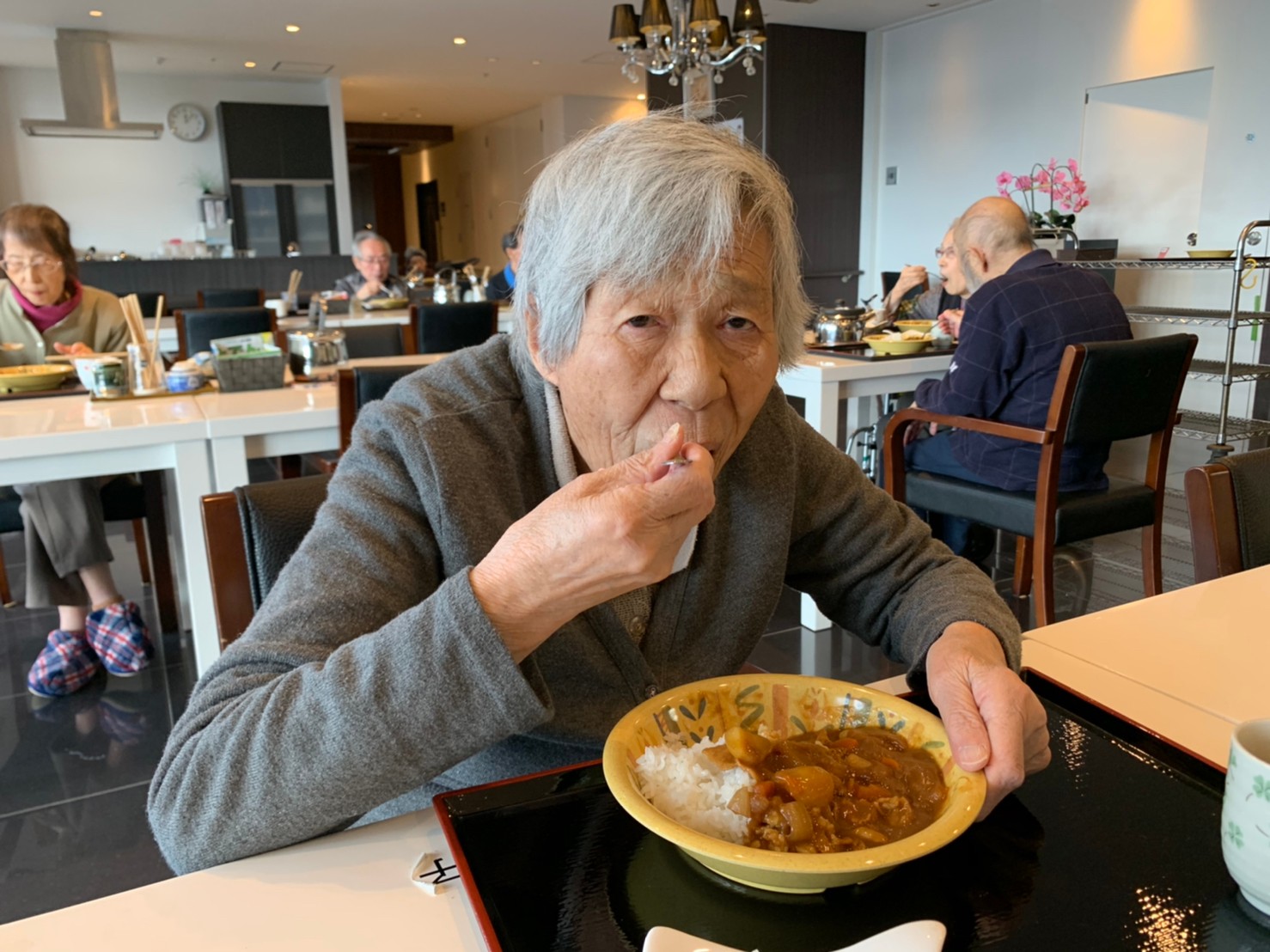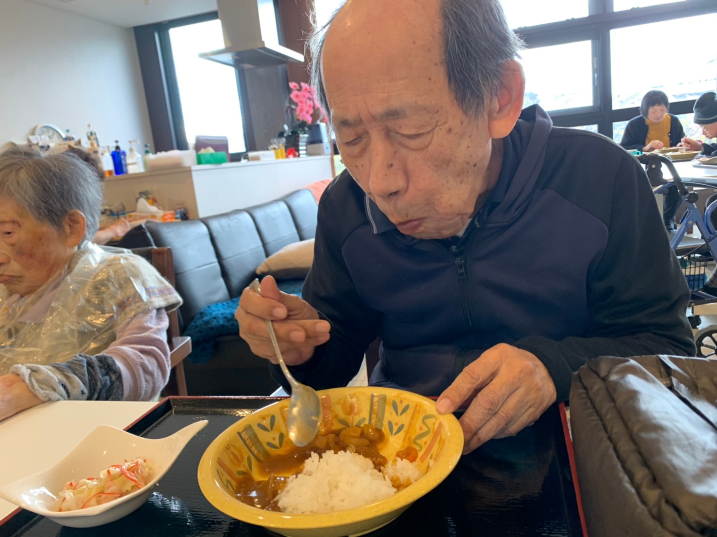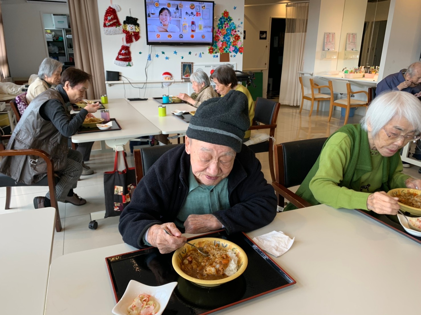 今日はおかわり推奨のカレーの日。カレーに飽きないようにカレーのルーを毎月変えてみたりと味を変えています。今日のカレーは中辛でもいつもより辛かったみたいでした。辛いのが苦手な方用に甘口も一緒に作り、皆さまが召し上がられる直前にお聞きし、好きな味を選んでいただいています。おかわりで味を変えられたりといつも以上に食がすすんでいました。