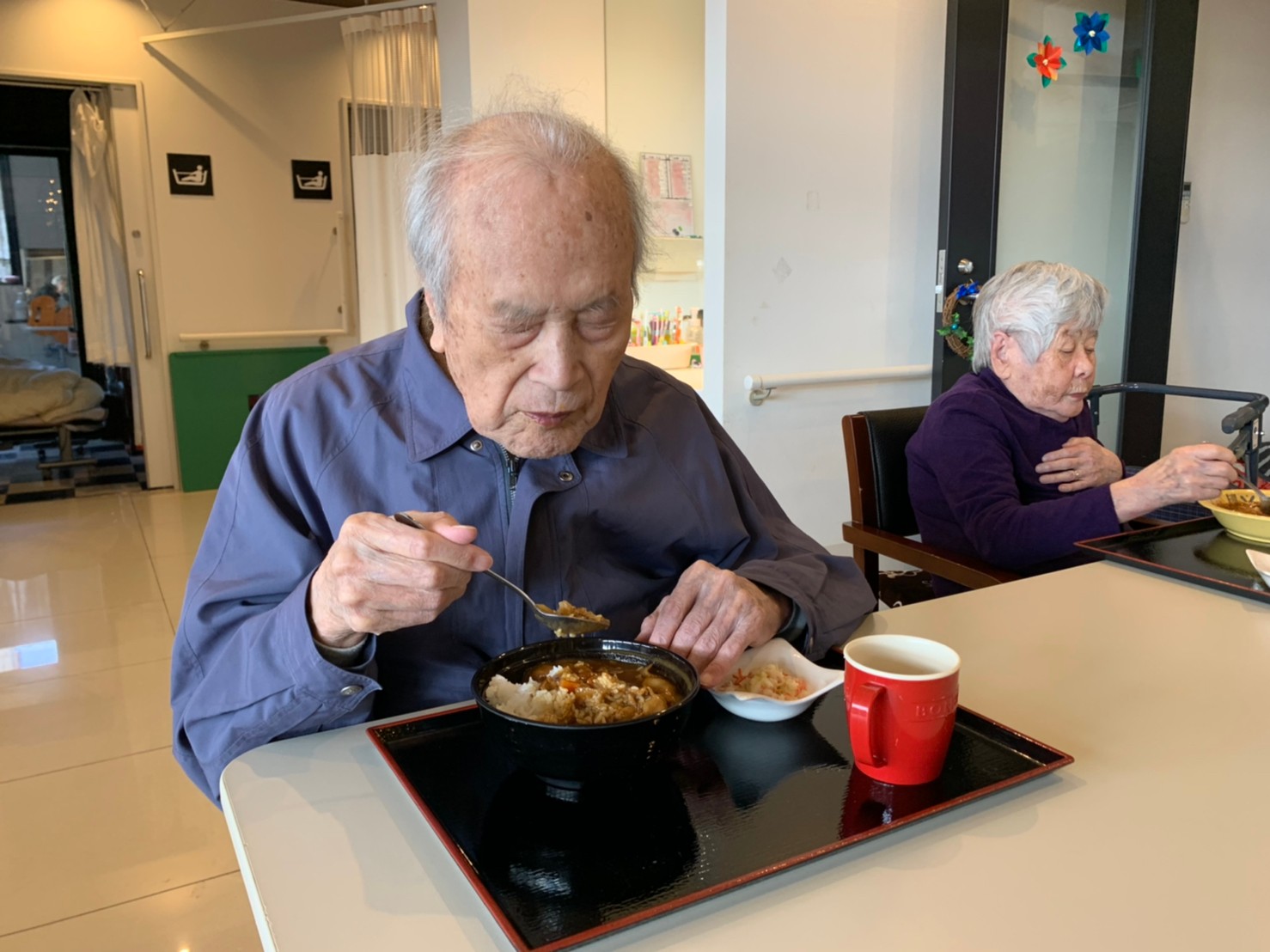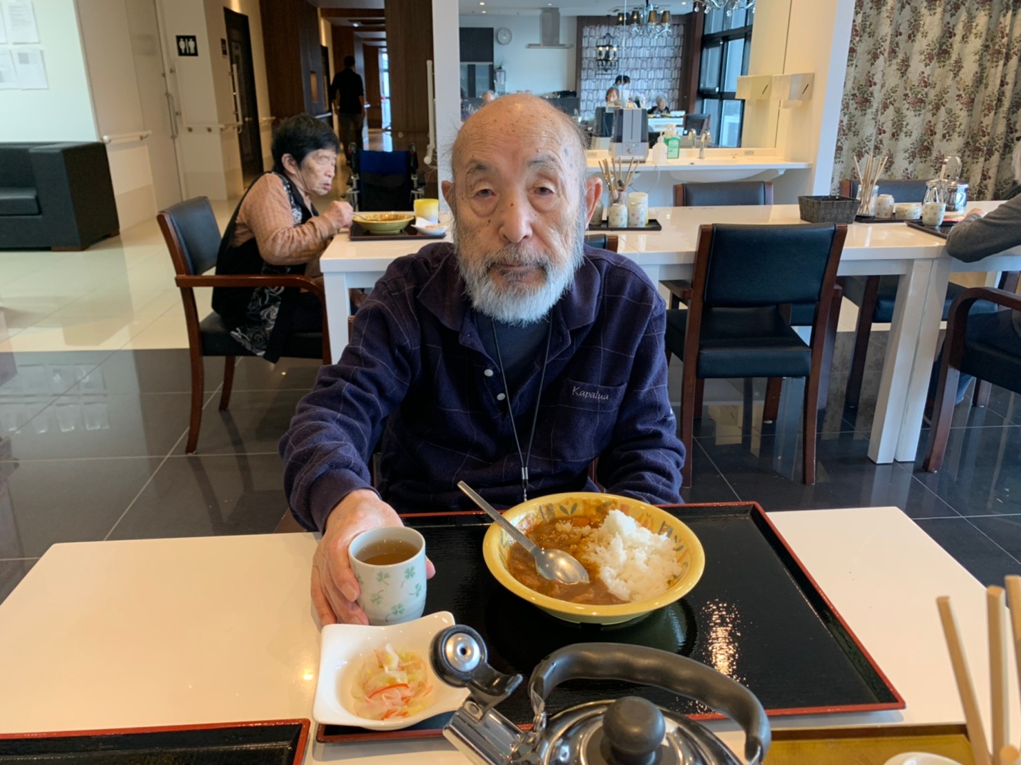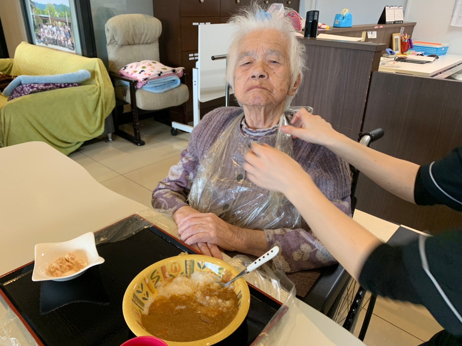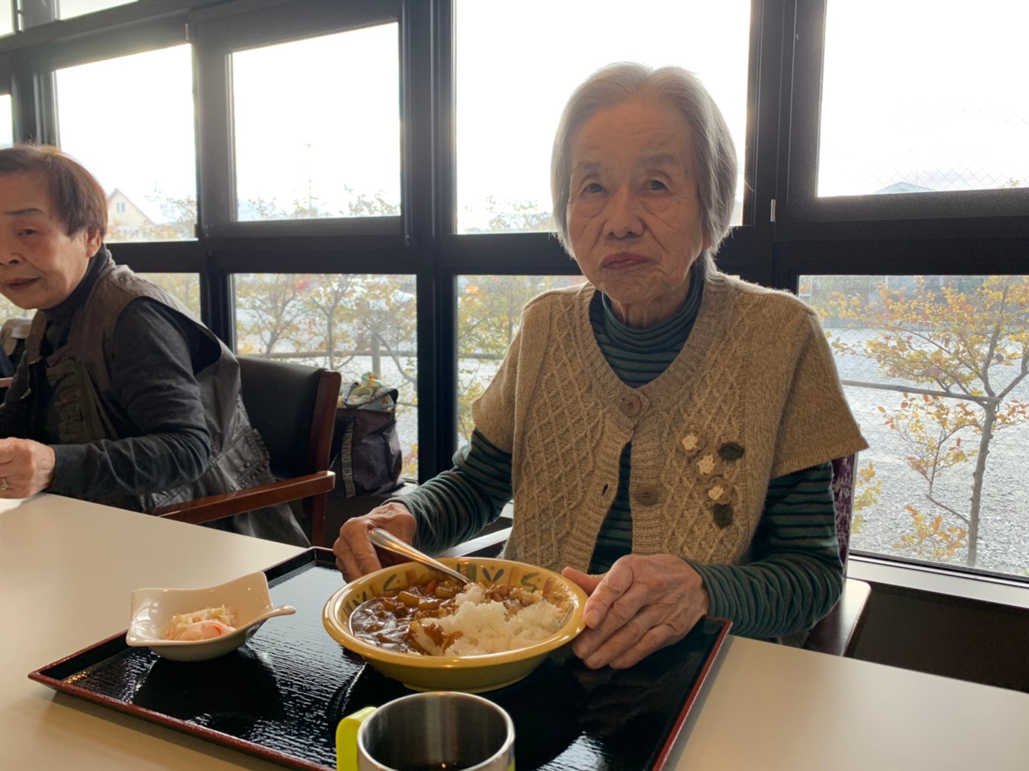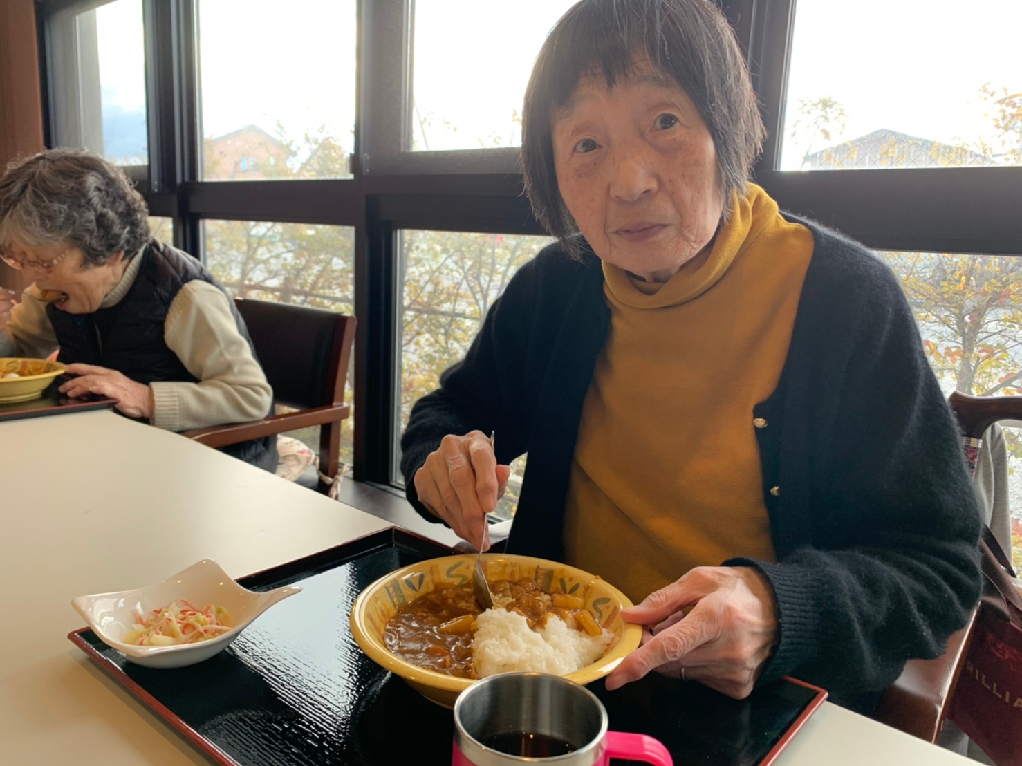 今日はおかわり推奨のカレーの日。カレーに飽きないようにカレーのルーを毎月変えてみたりと味を変えています。今日のカレーは中辛でもいつもより辛かったみたいでした。辛いのが苦手な方用に甘口も一緒に作り、皆さまが召し上がられる直前にお聞きし、好きな味を選んでいただいています。おかわりで味を変えられたりといつも以上に食がすすんでいました。