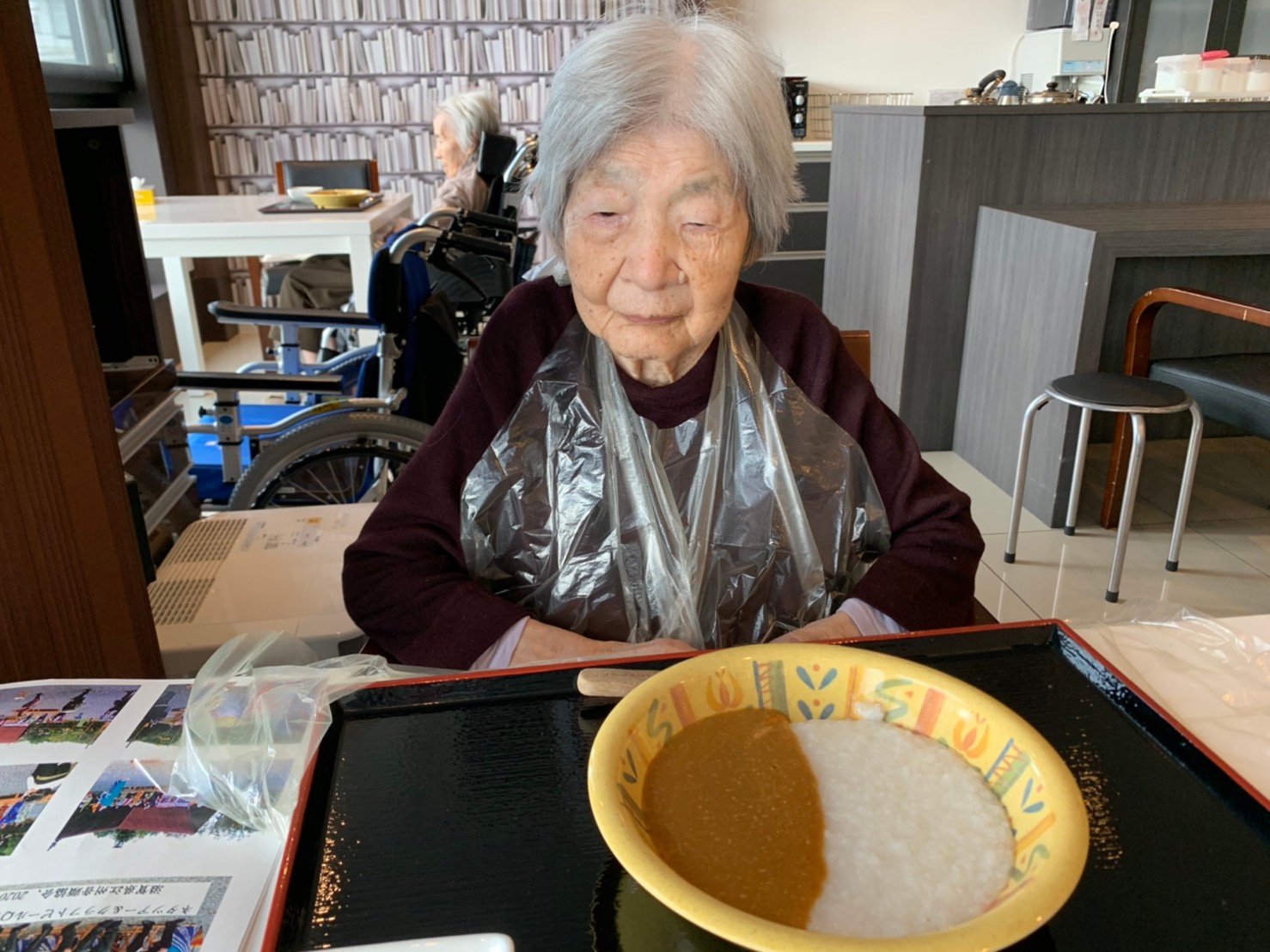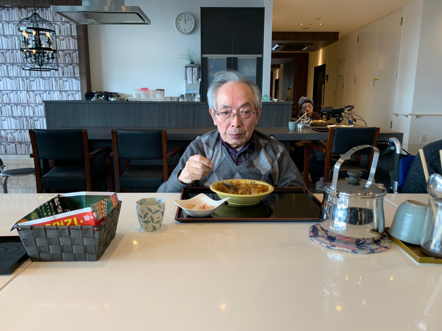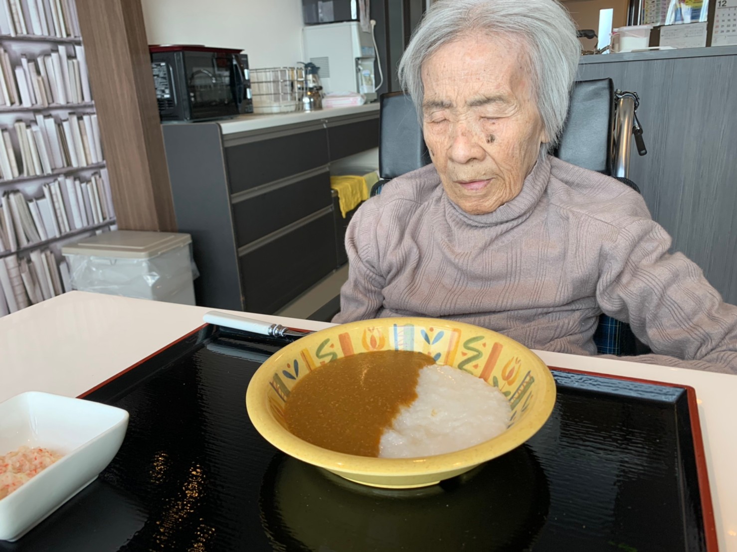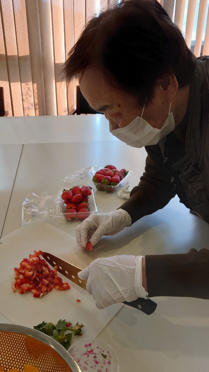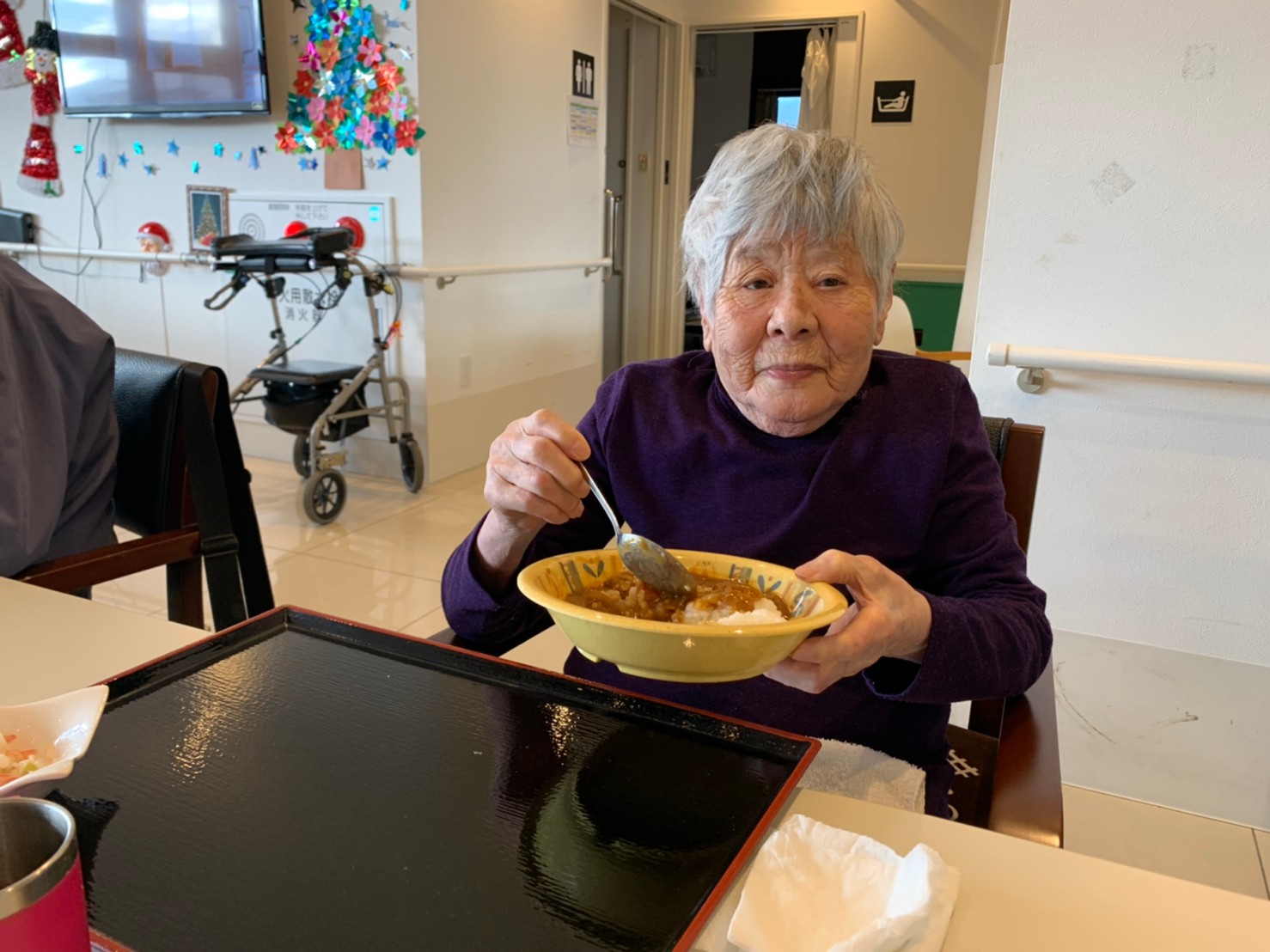 今日はおかわり推奨のカレーの日。カレーに飽きないようにカレーのルーを毎月変えてみたりと味を変えています。今日のカレーは中辛でもいつもより辛かったみたいでした。辛いのが苦手な方用に甘口も一緒に作り、皆さまが召し上がられる直前にお聞きし、好きな味を選んでいただいています。おかわりで味を変えられたりといつも以上に食がすすんでいました。