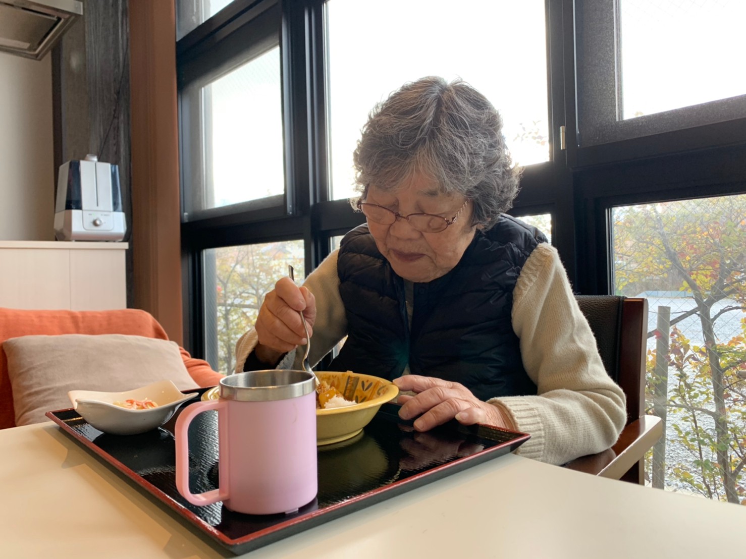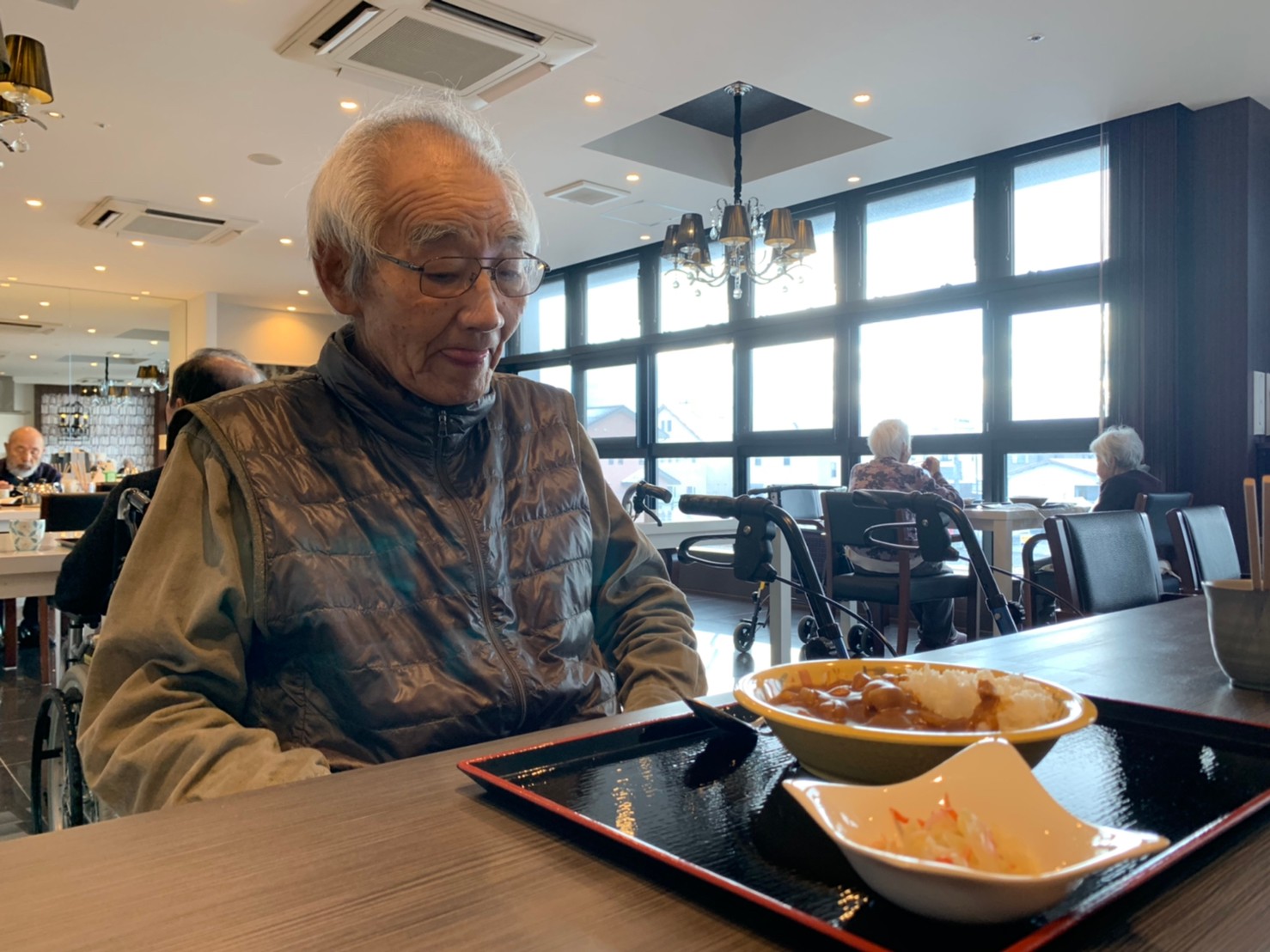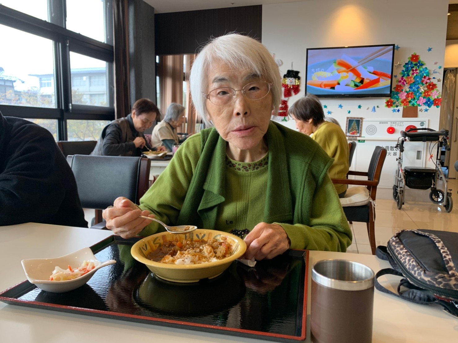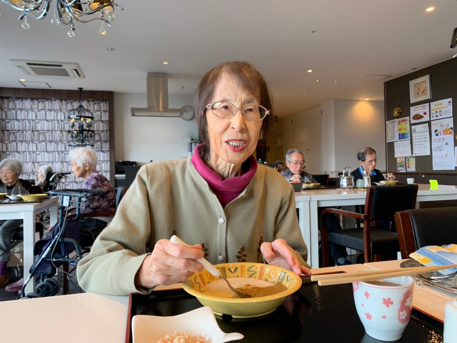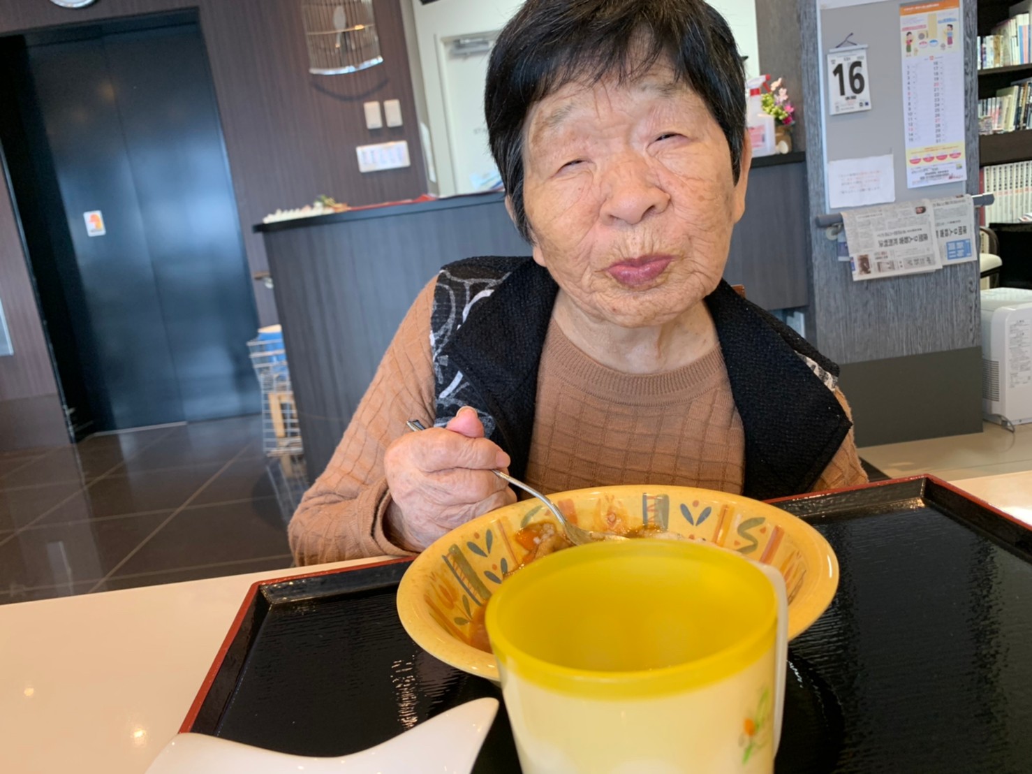 今日はおかわり推奨のカレーの日。カレーに飽きないようにカレーのルーを毎月変えてみたりと味を変えています。今日のカレーは中辛でもいつもより辛かったみたいでした。辛いのが苦手な方用に甘口も一緒に作り、皆さまが召し上がられる直前にお聞きし、好きな味を選んでいただいています。おかわりで味を変えられたりといつも以上に食がすすんでいました。
