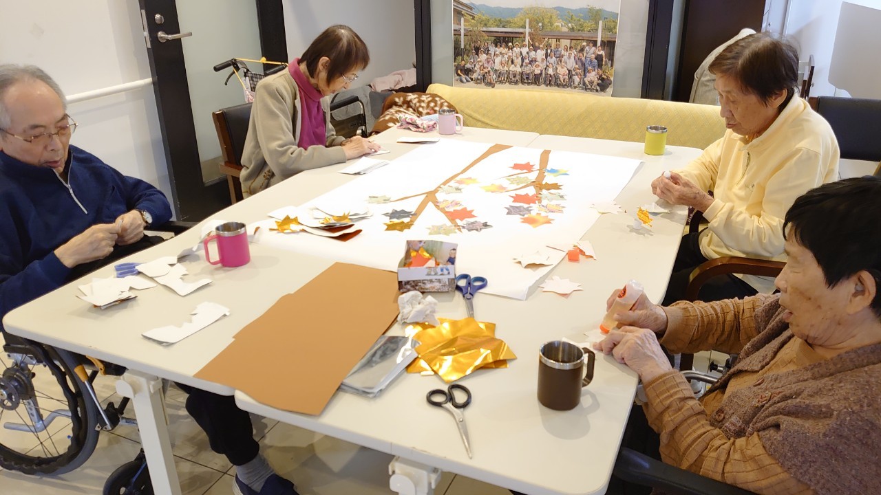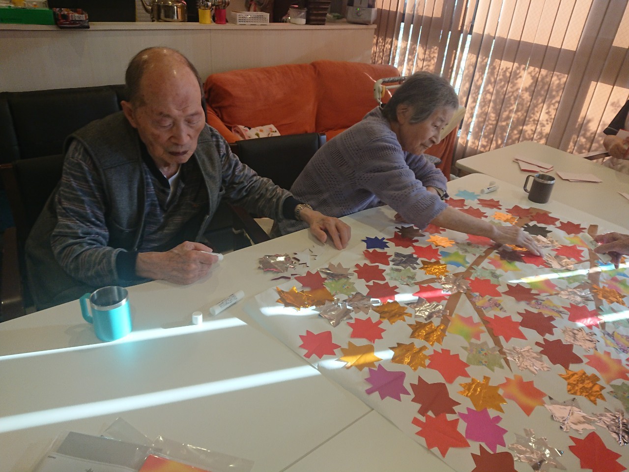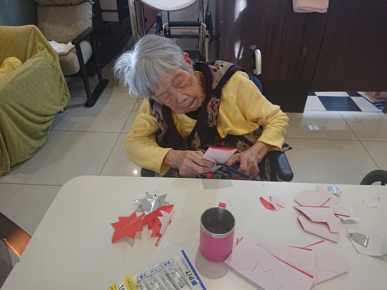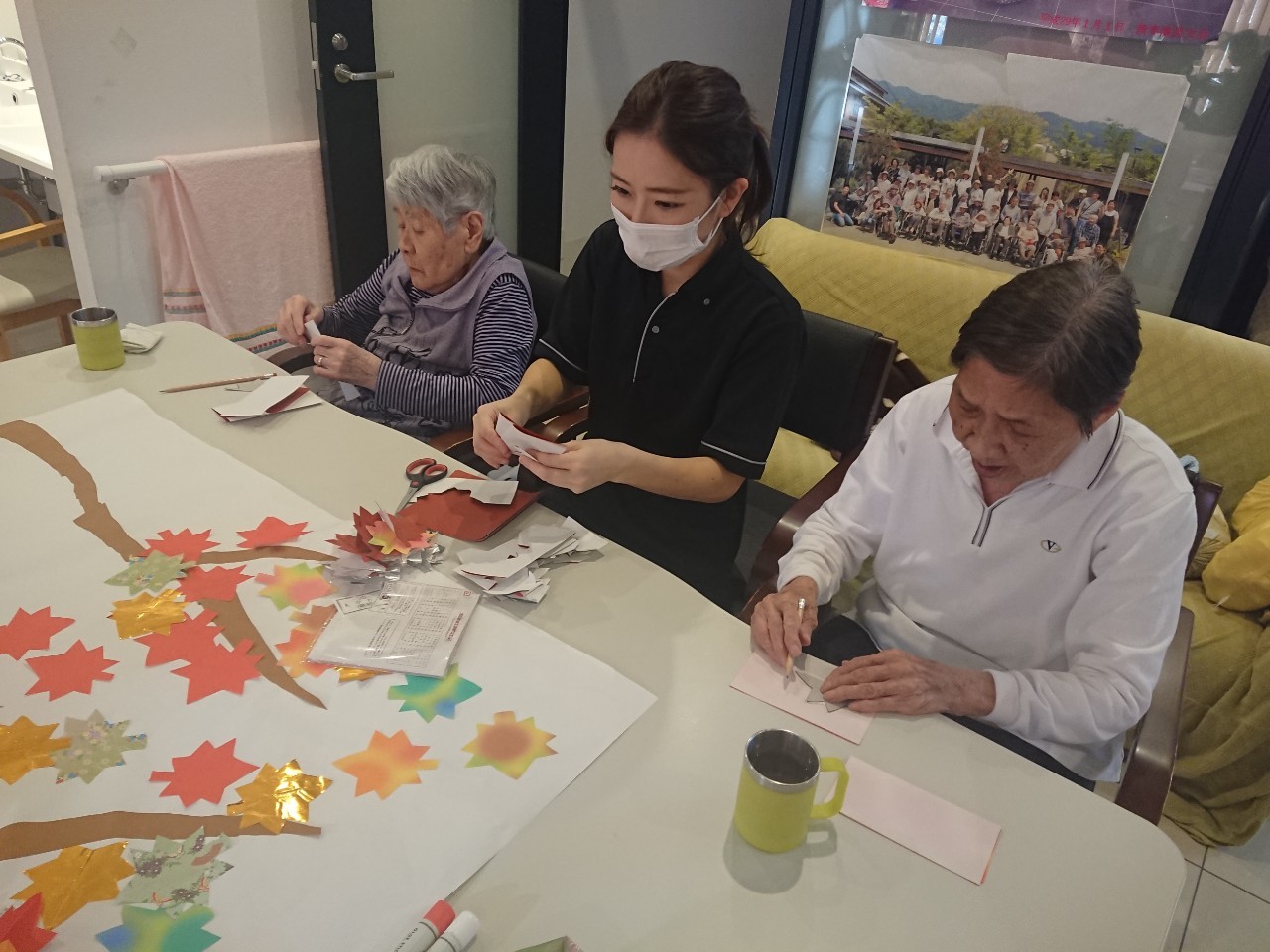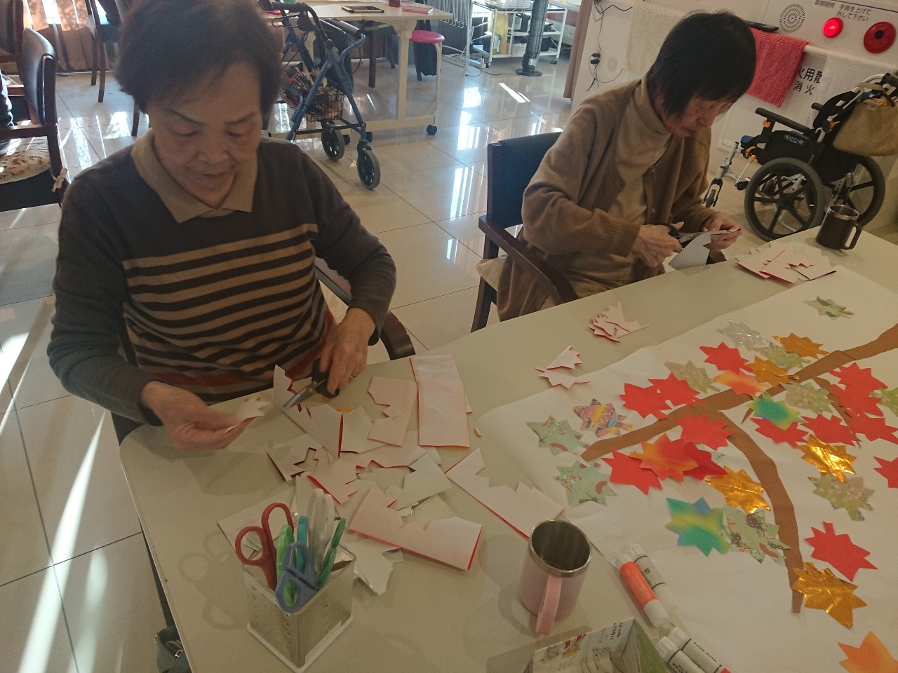 今日のデイサービスではレクレーションとして紅葉の壁紙を作成しました。紅葉をハサミで切り抜くことがスタッフでも難しく思っていましたが器用に作ってくださいました。完成したら〇〇に使います。こうご期待٩( ”ω” )و
