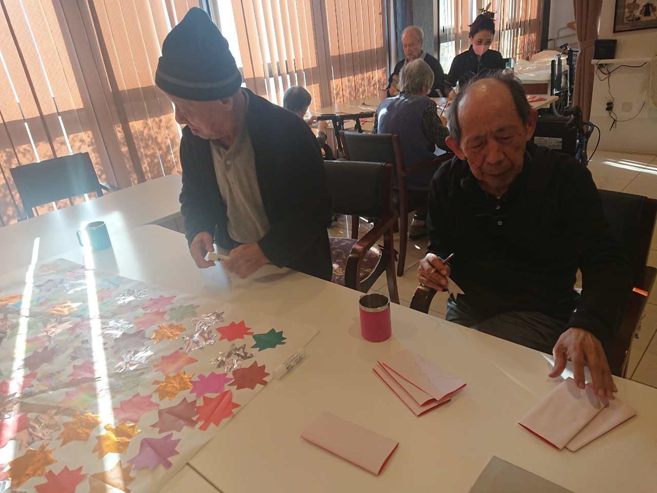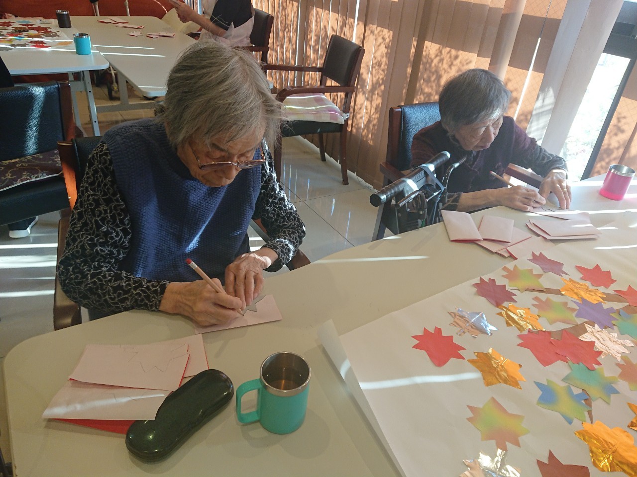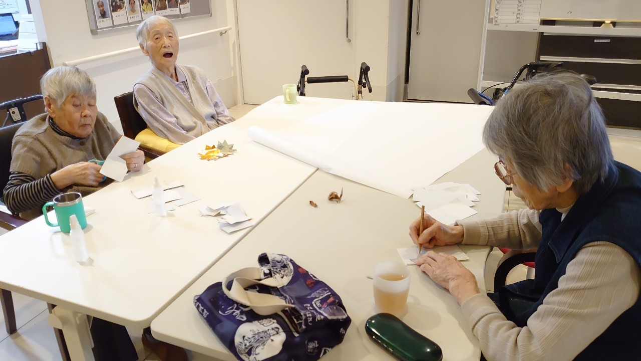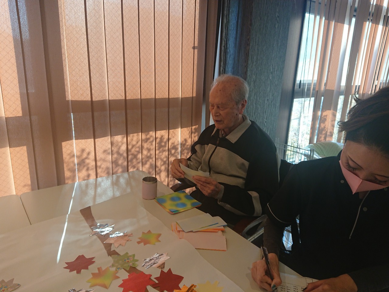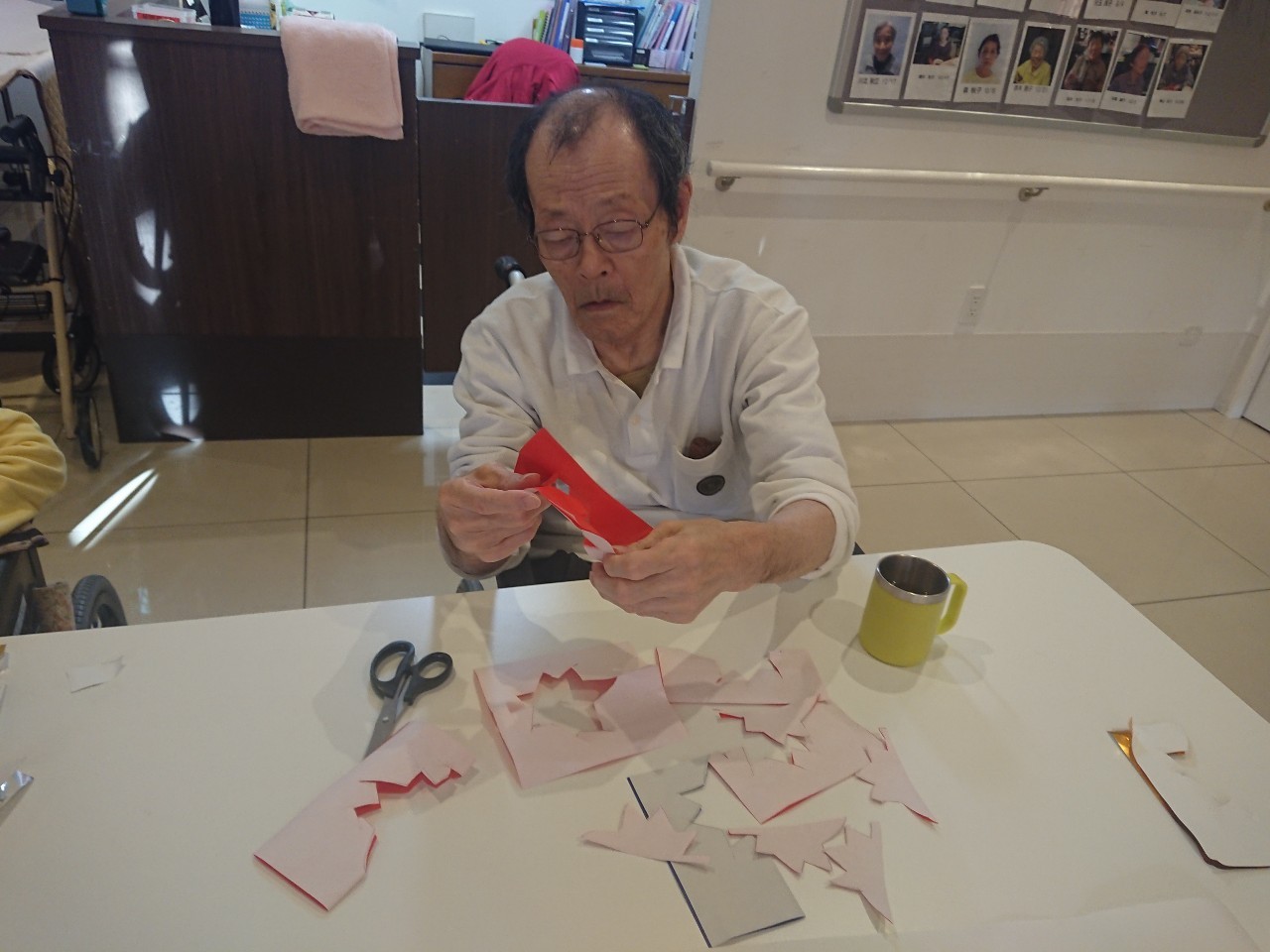 今日のデイサービスではレクレーションとして紅葉の壁紙を作成しました。紅葉をハサミで切り抜くことがスタッフでも難しく思っていましたが器用に作ってくださいました。完成したら〇〇に使います。こうご期待٩( ”ω” )و