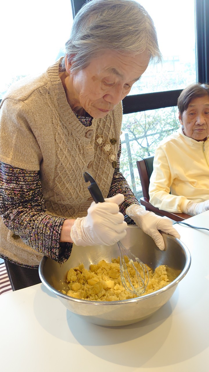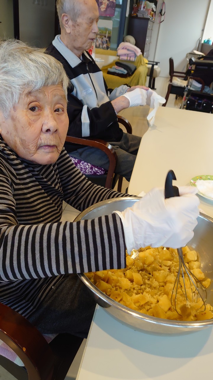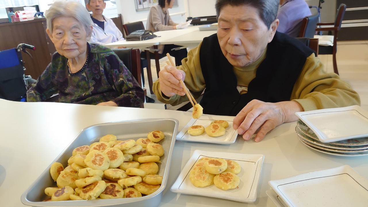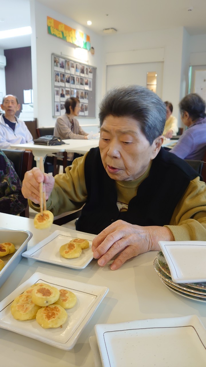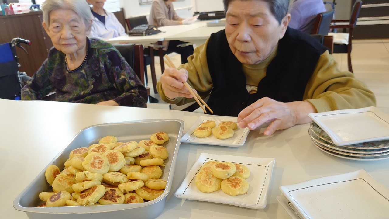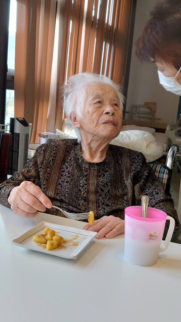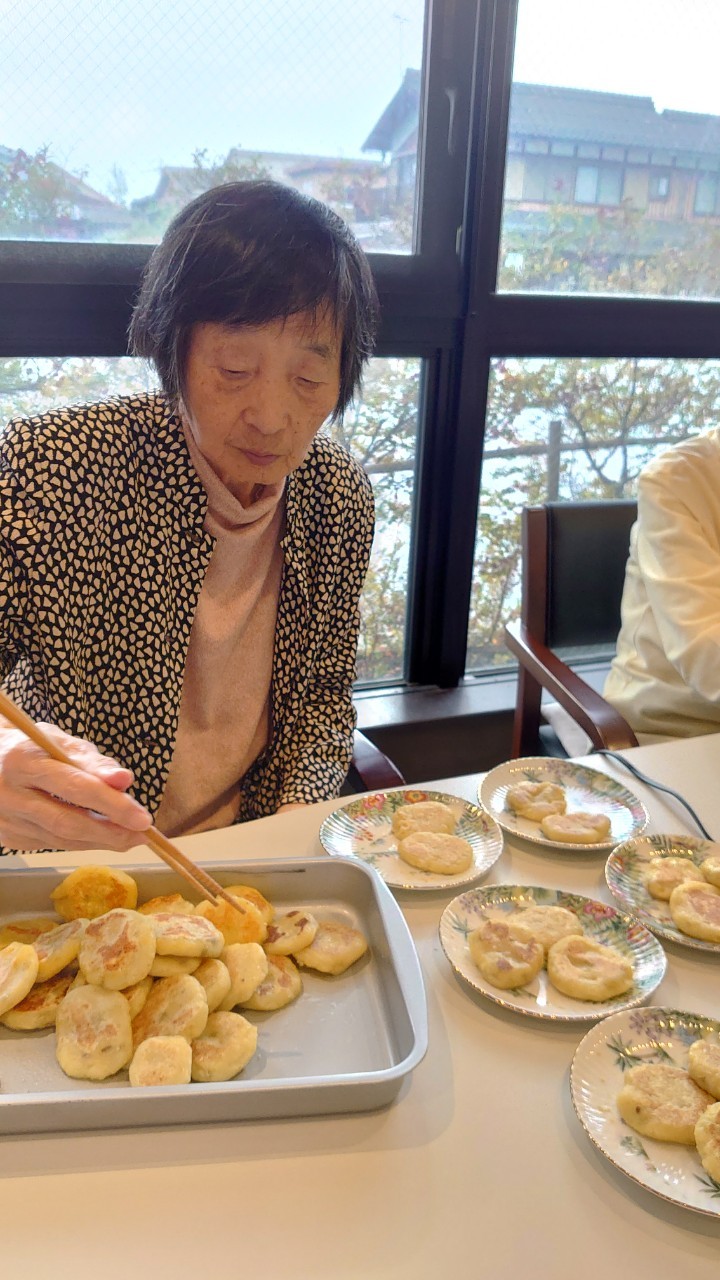 今日はお楽しみの手作りおやつの日(2日目)です。旬のさつまいもを使ったさつまいも餅とさつまいもスープで温まっていただきました。