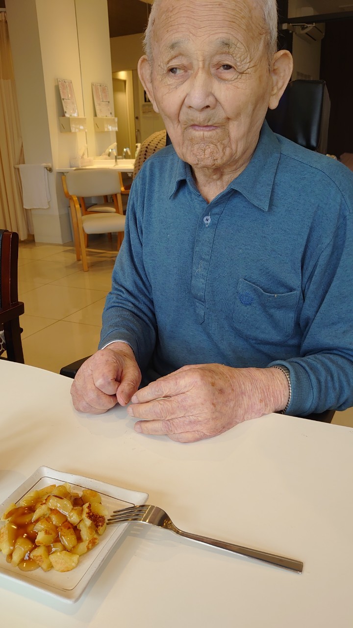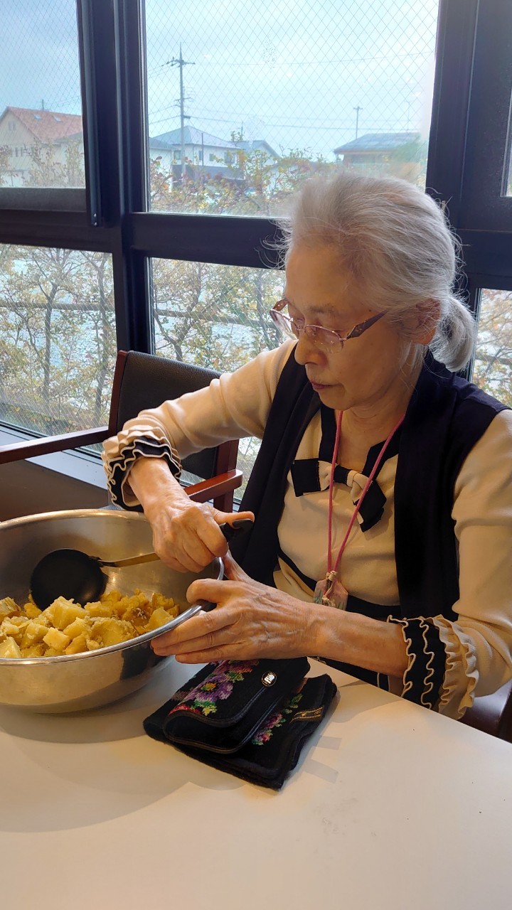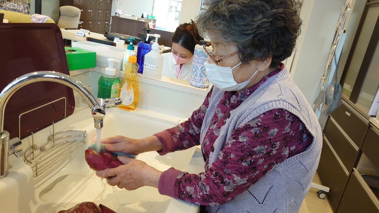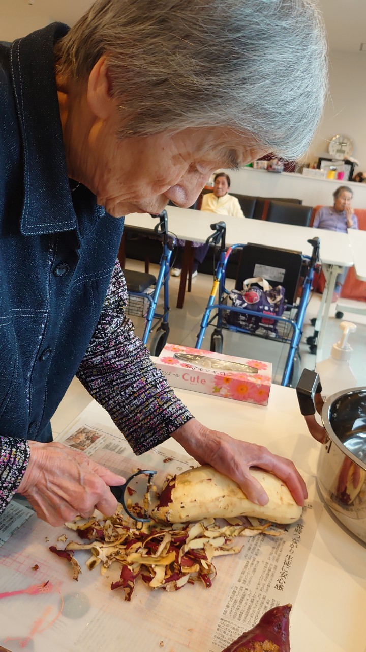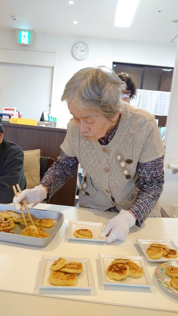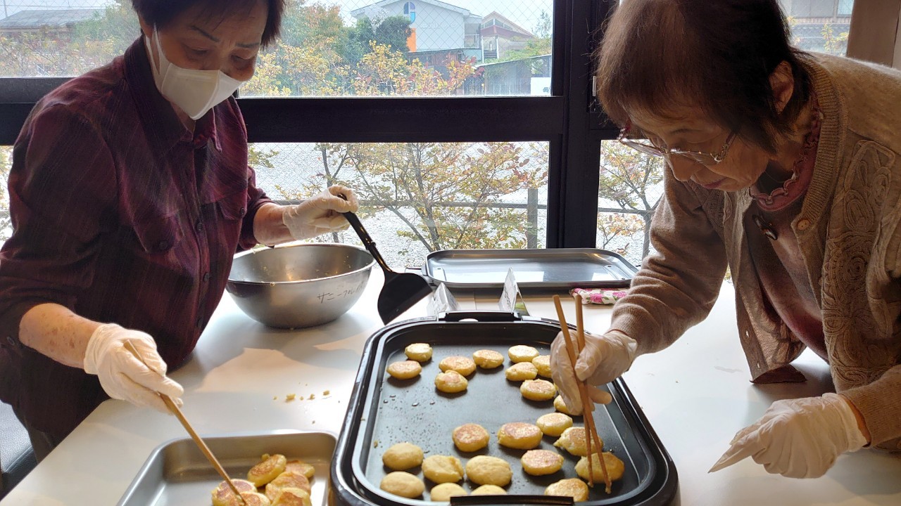 今日はお楽しみの手作りおやつの日(2日目)です。旬のさつまいもを使ったさつまいも餅とさつまいもスープで温まっていただきました。