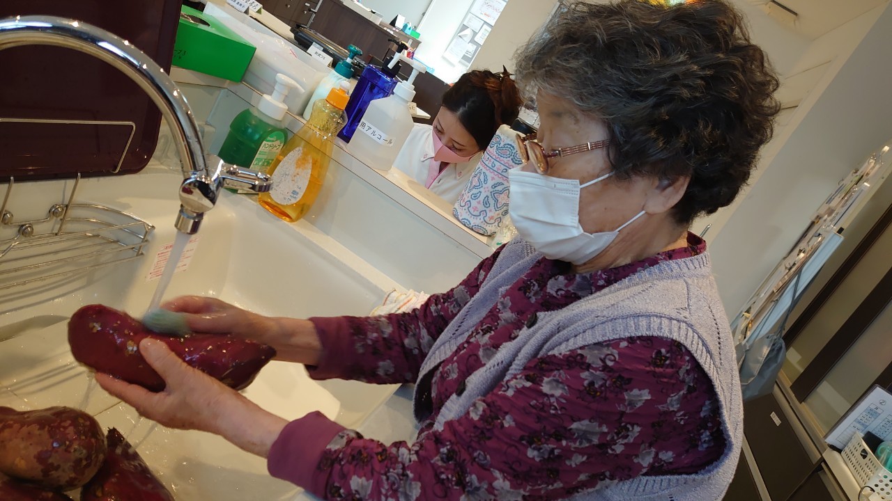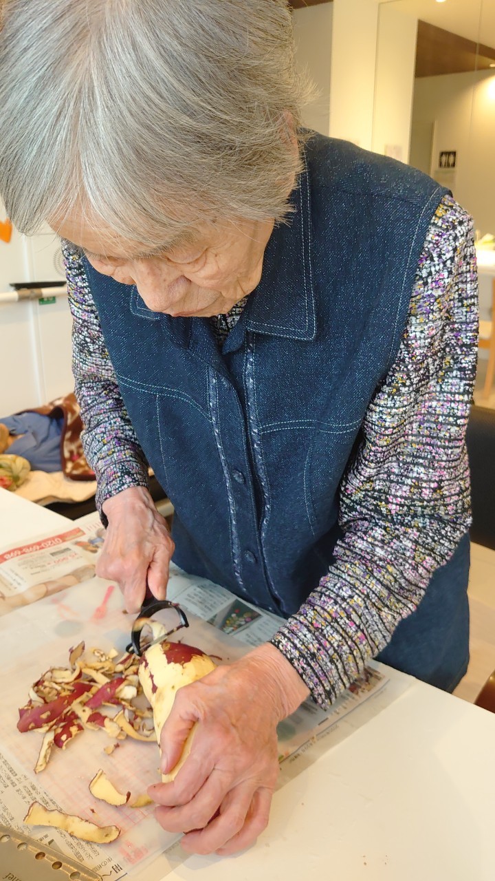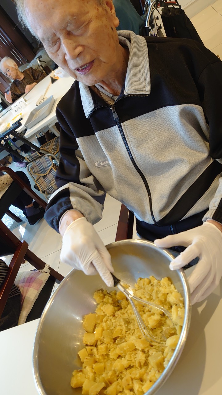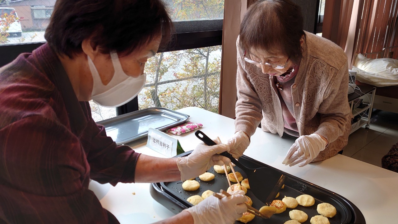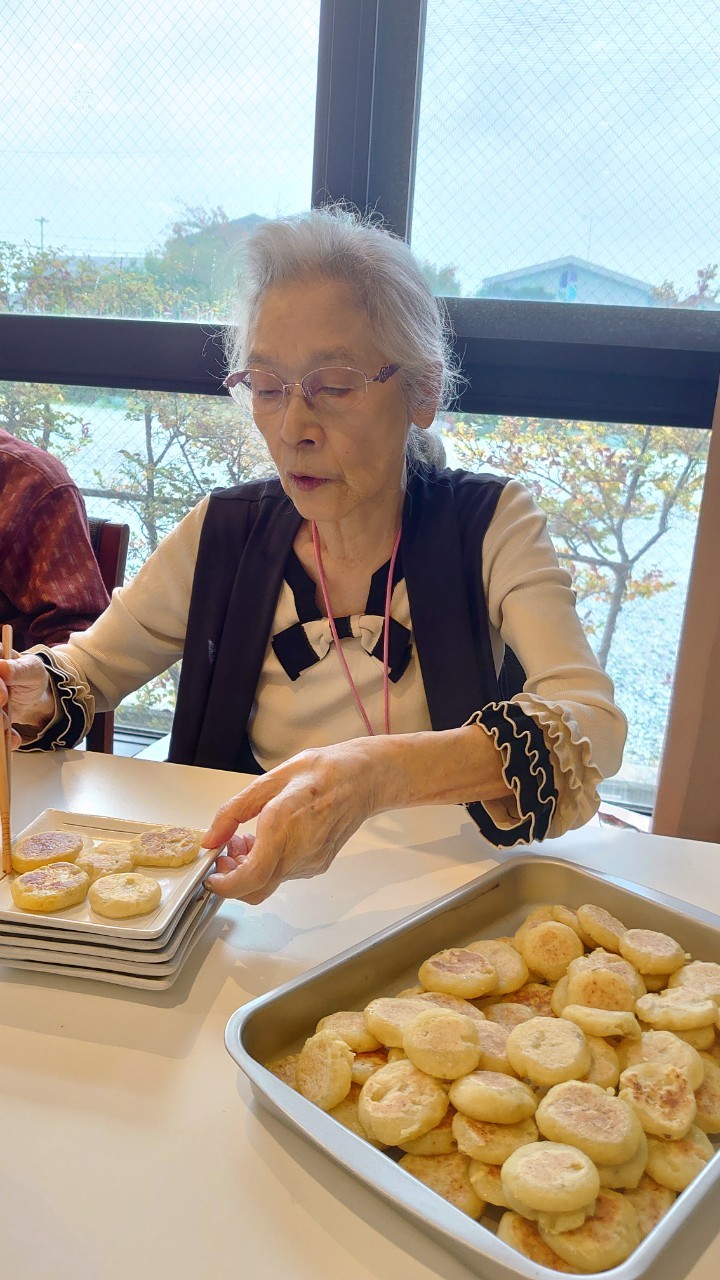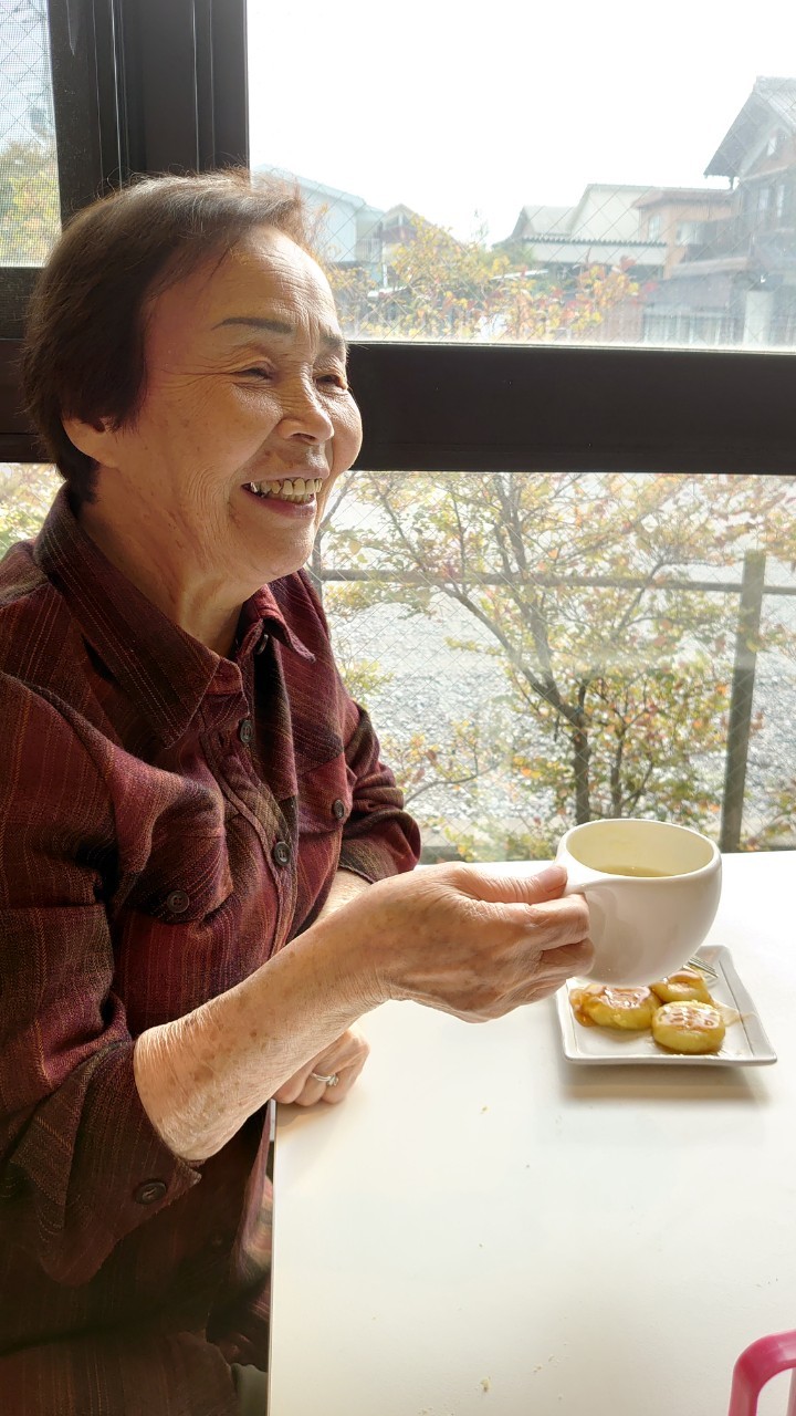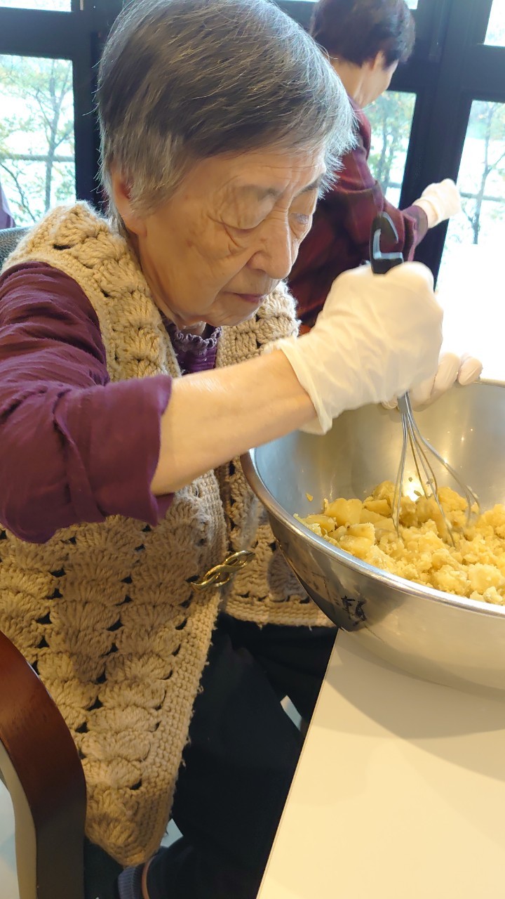 今日はお楽しみの手作りおやつの日(2日目)です。旬のさつまいもを使ったさつまいも餅とさつまいもスープで温まっていただきました。