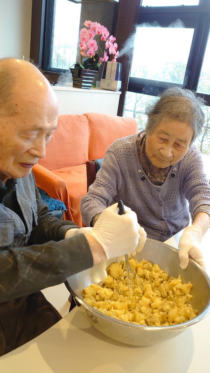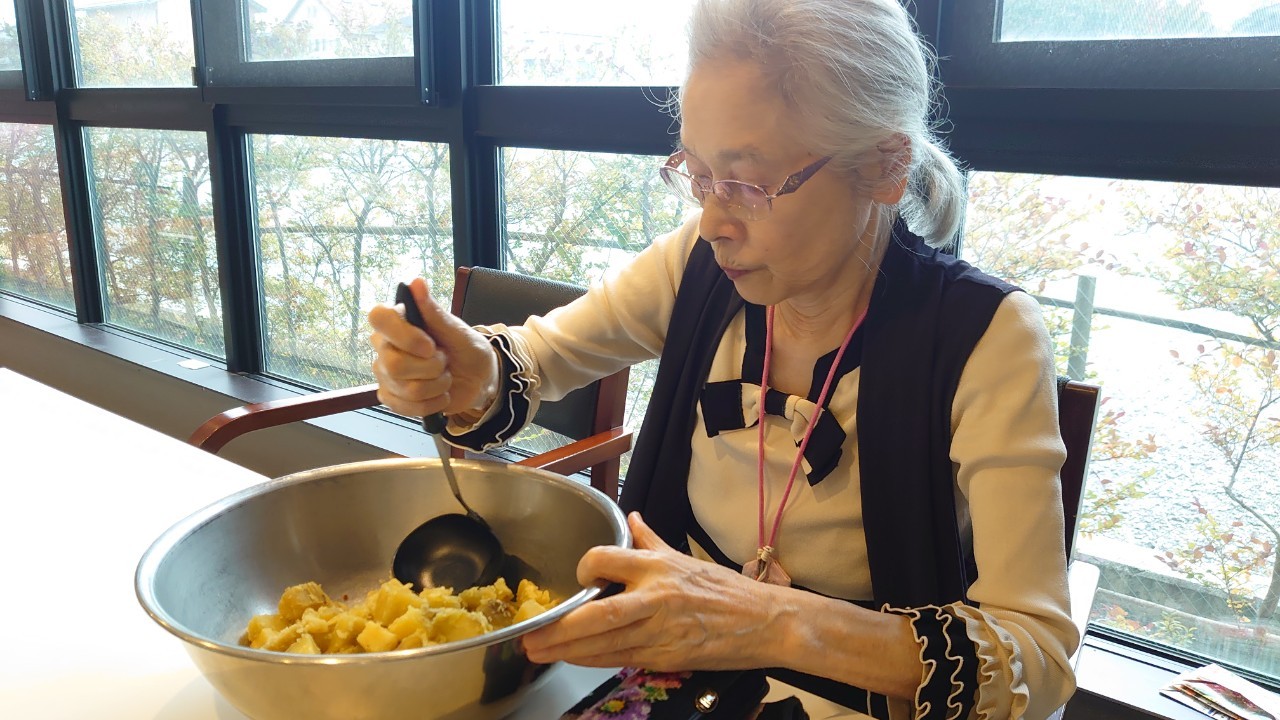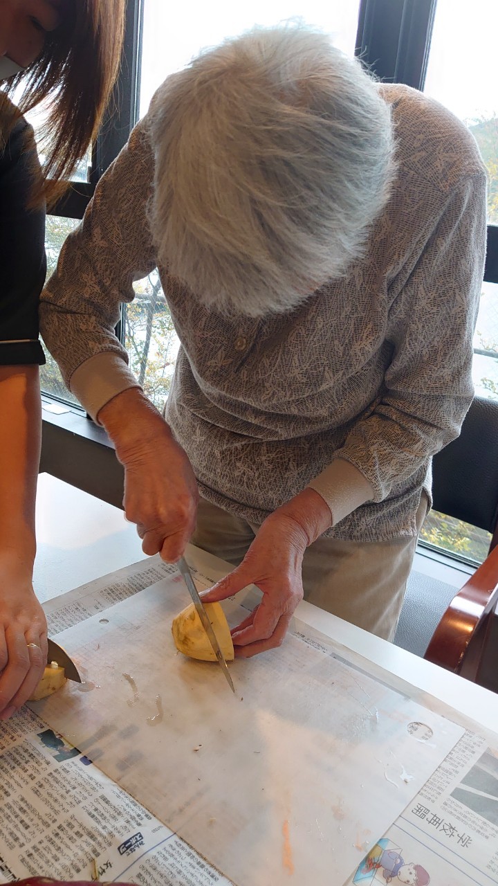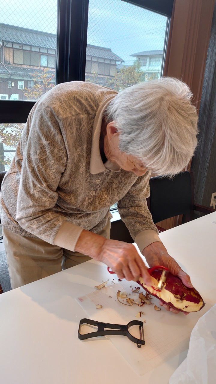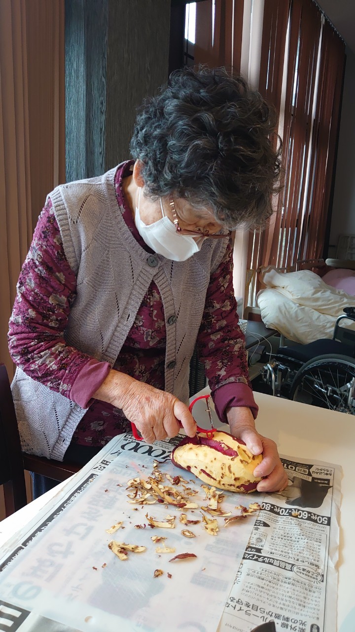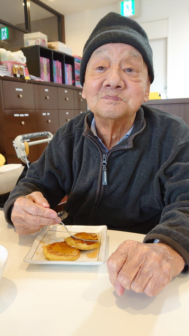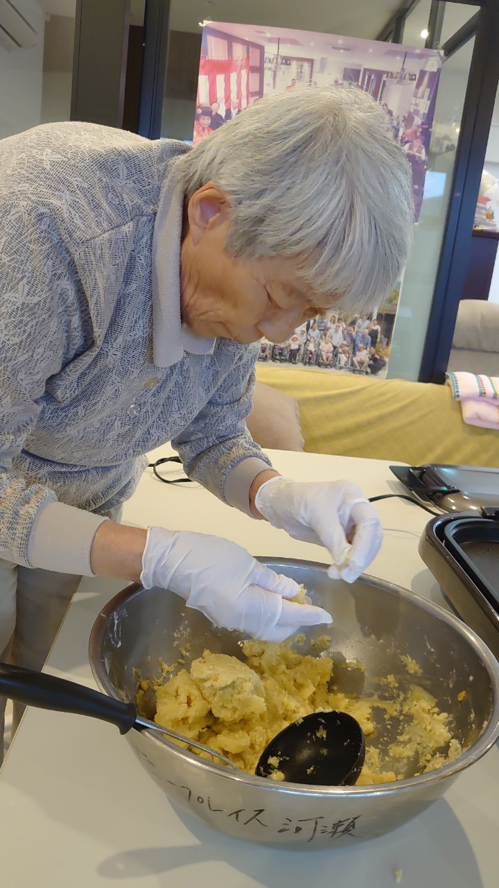 今日はお楽しみの手作りおやつの日(2日目)です。旬のさつまいもを使ったさつまいも餅とさつまいもスープで温まっていただきました。