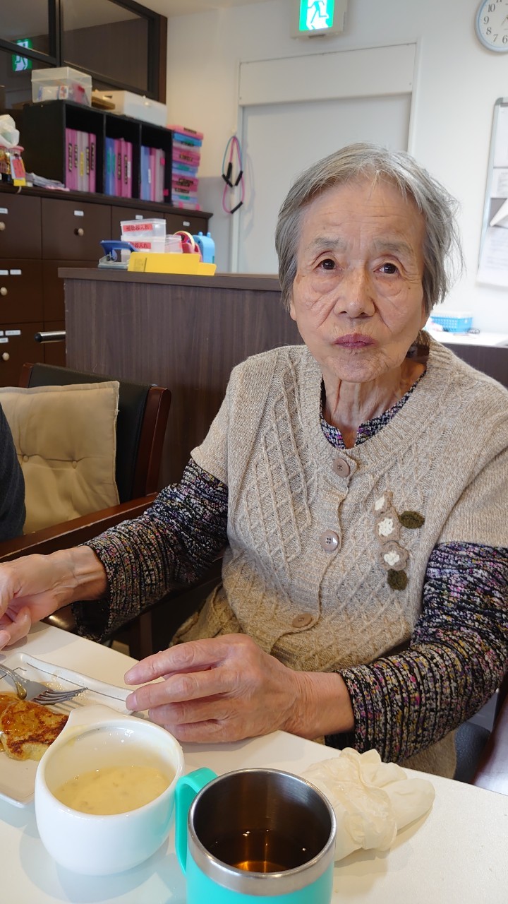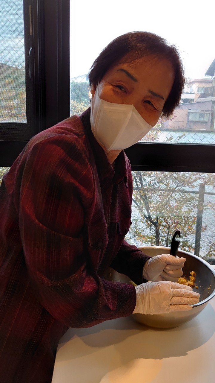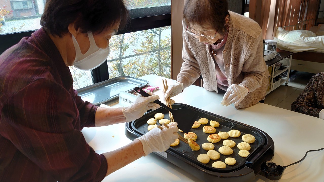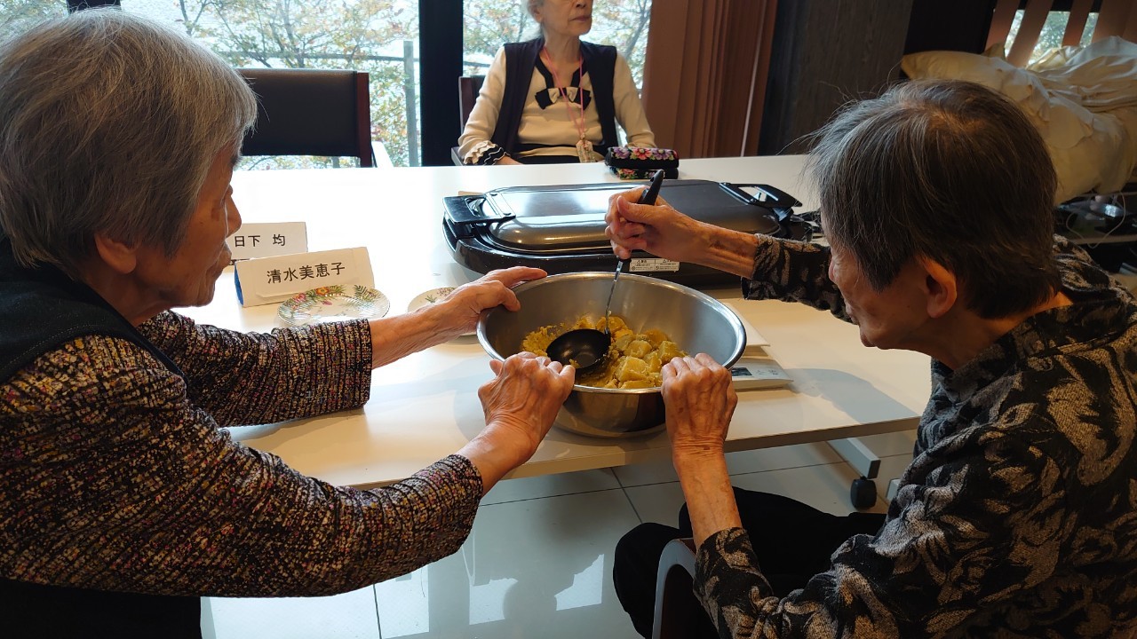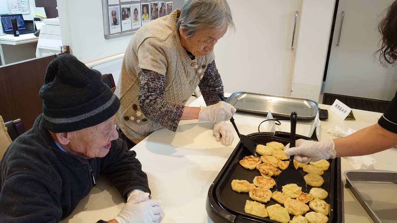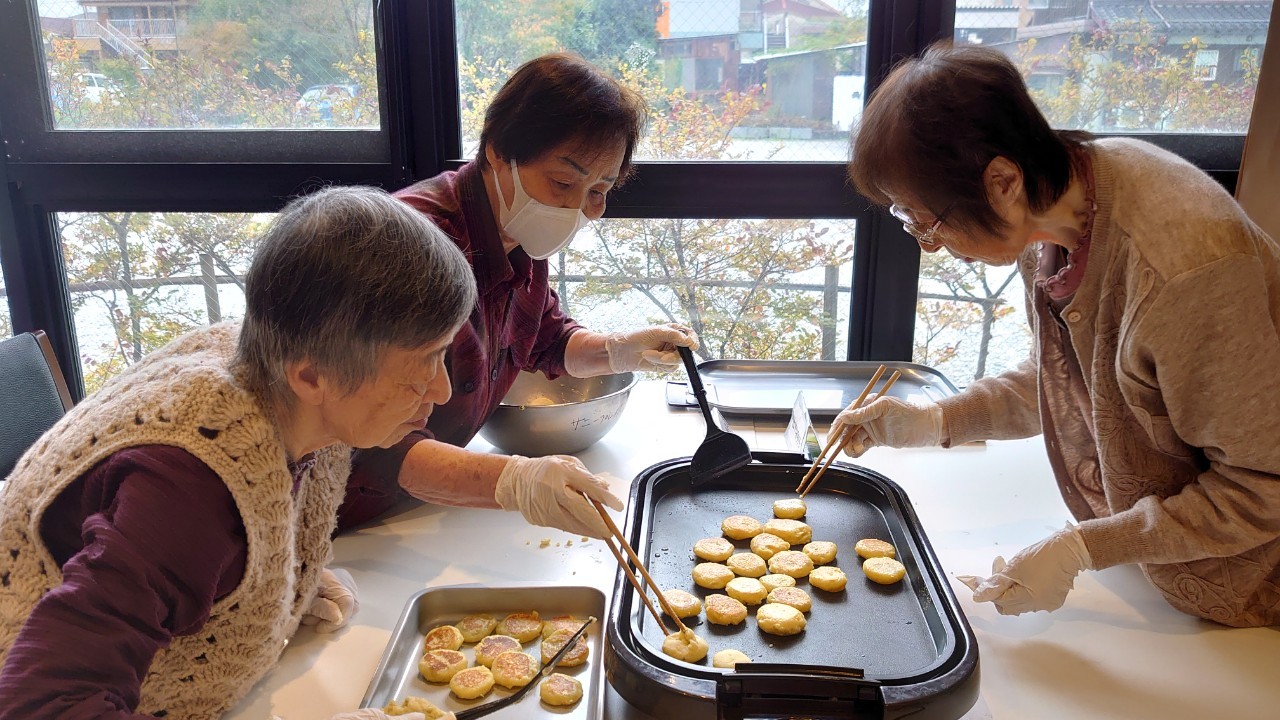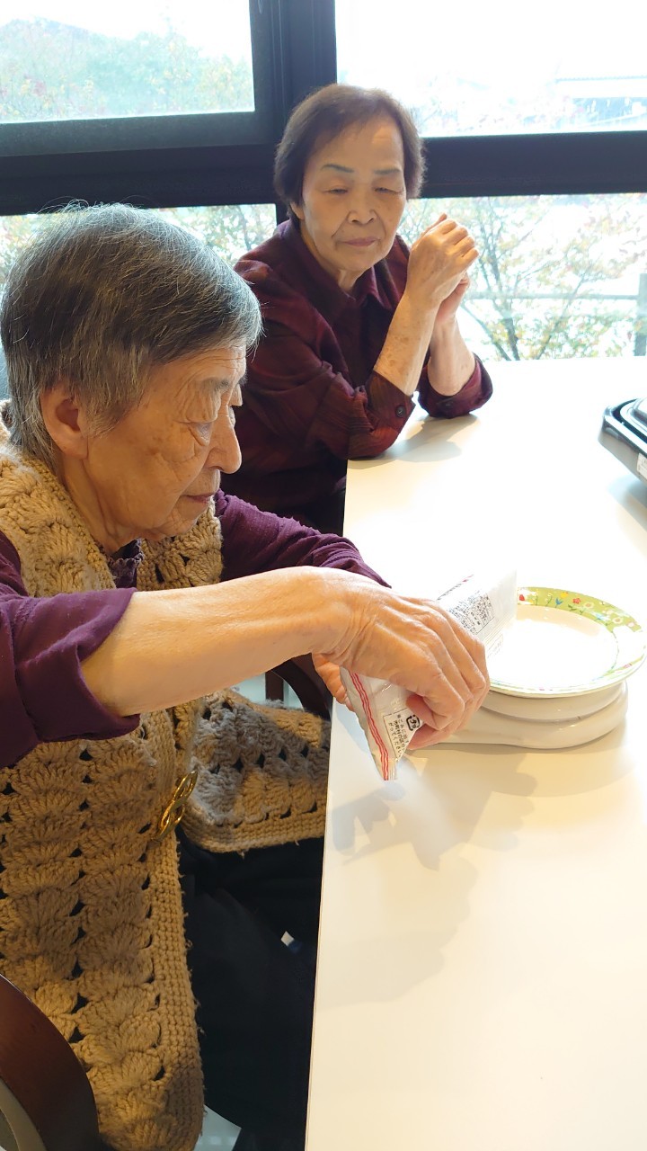 今日はお楽しみの手作りおやつの日(2日目)です。旬のさつまいもを使ったさつまいも餅とさつまいもスープで温まっていただきました。