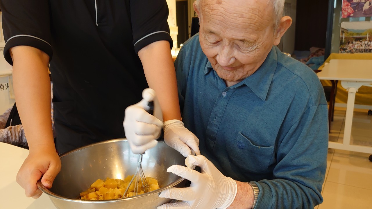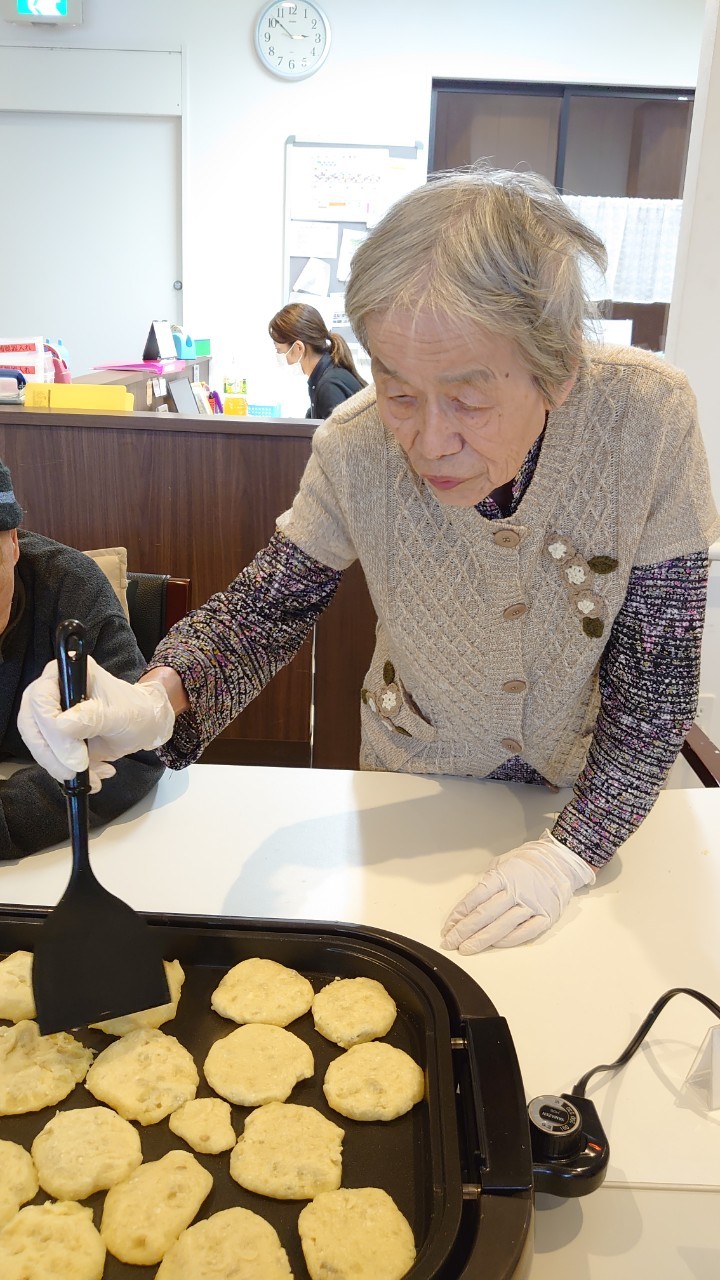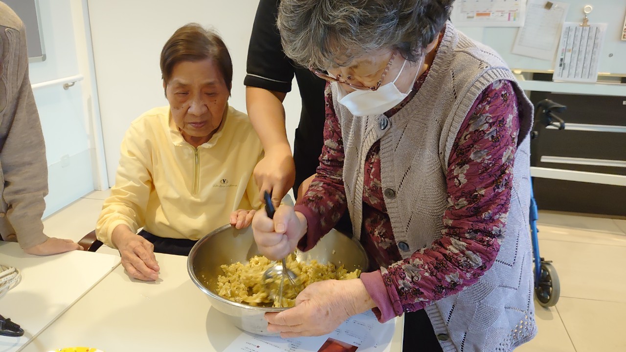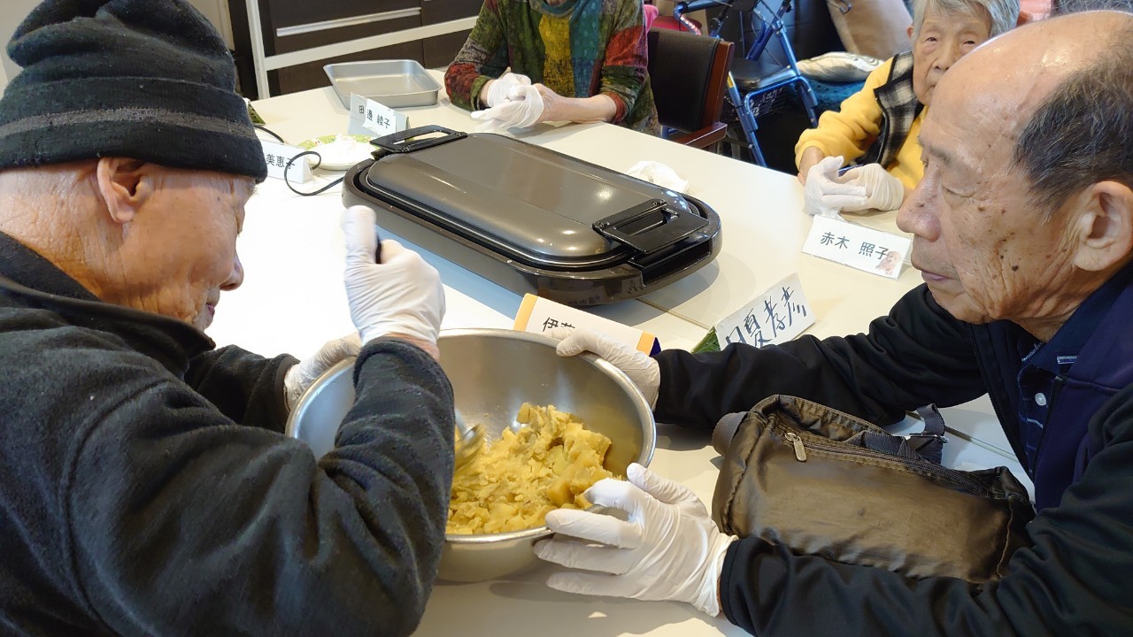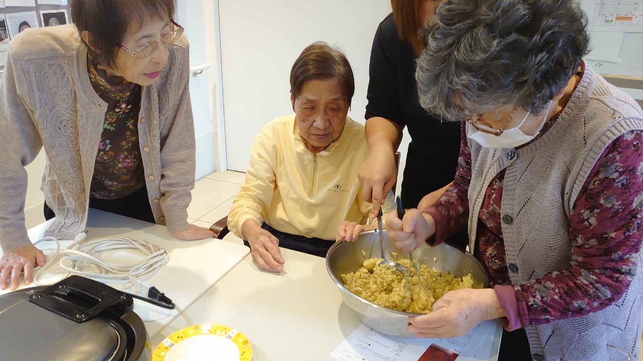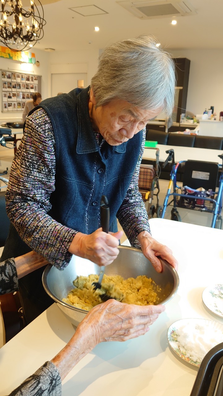 今日はお楽しみの手作りおやつの日(2日目)です。旬のさつまいもを使ったさつまいも餅とさつまいもスープで温まっていただきました。