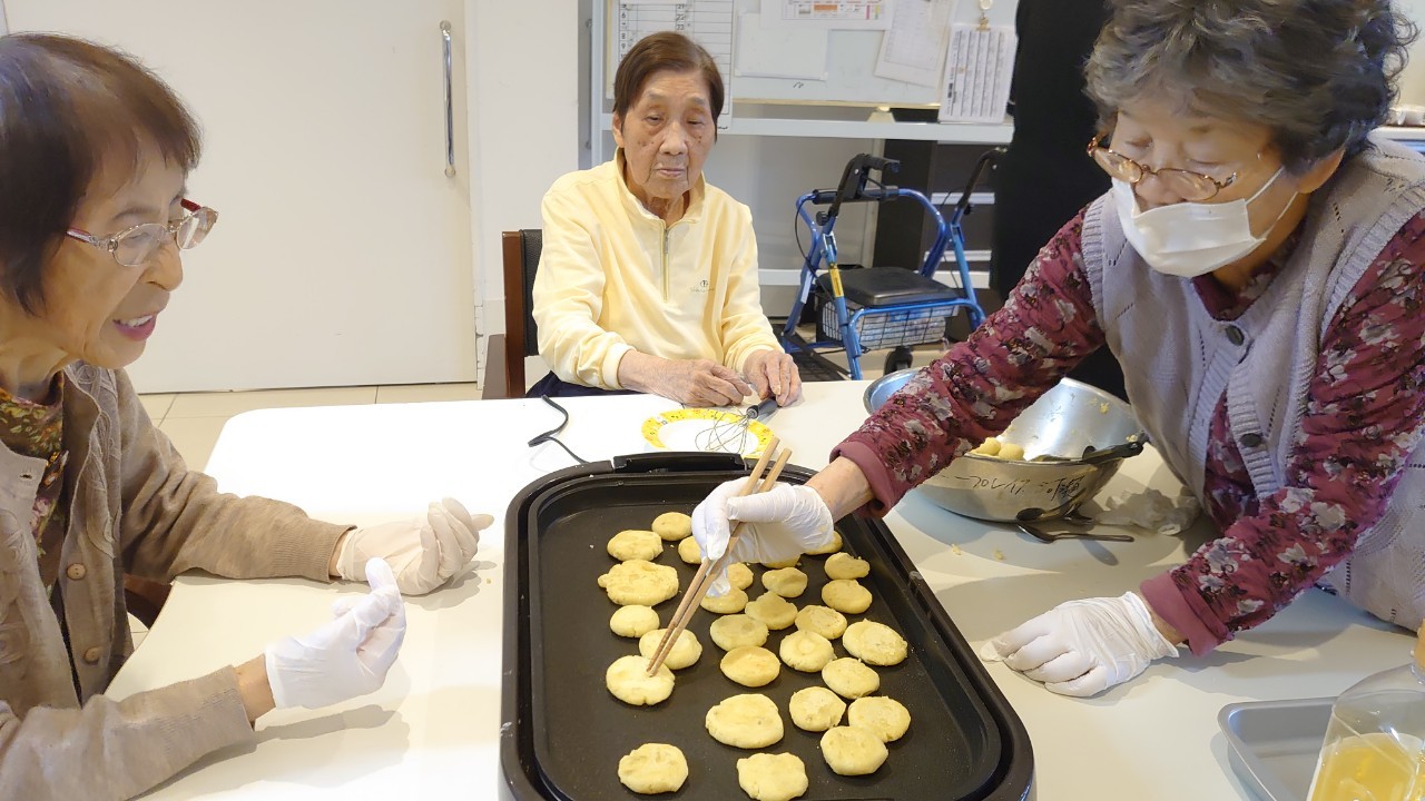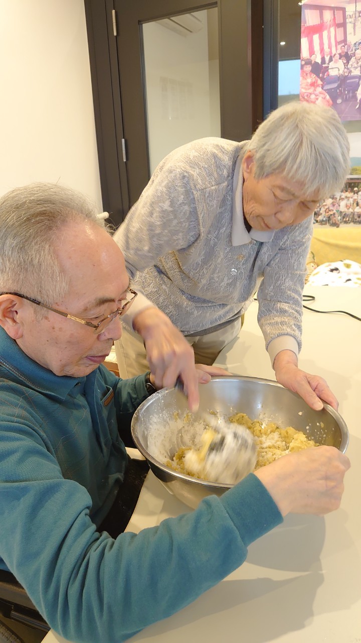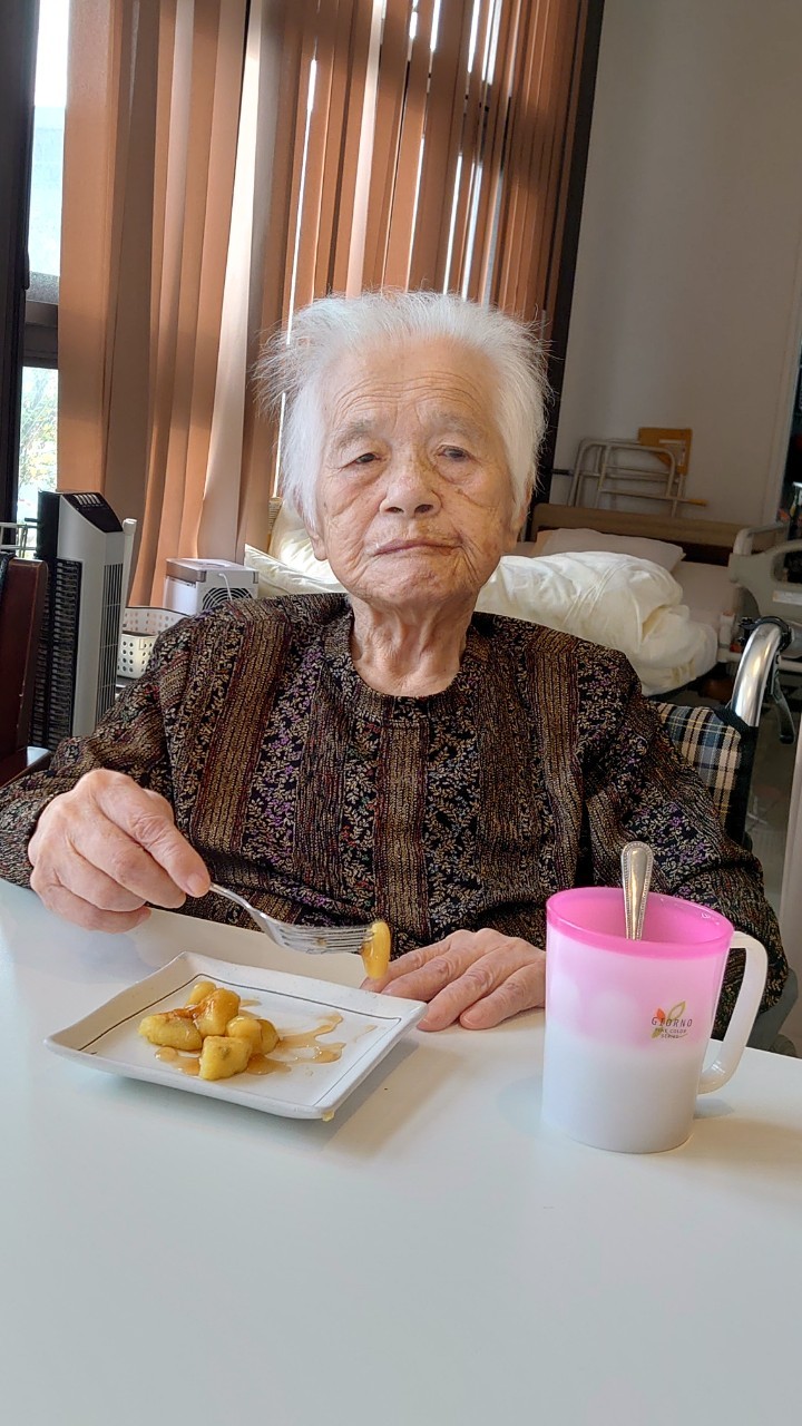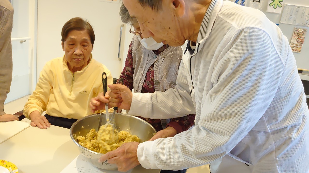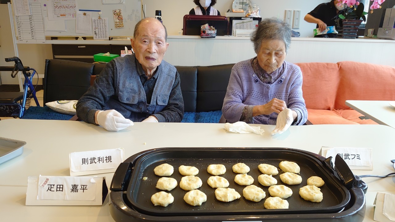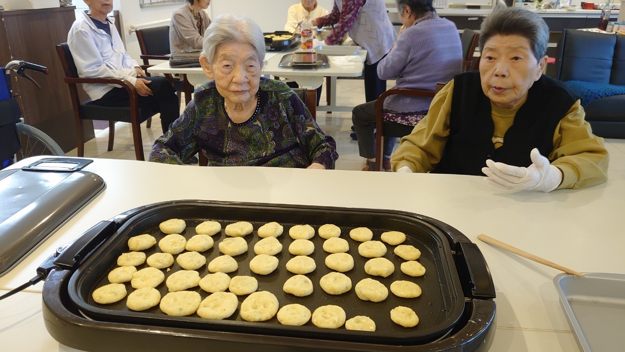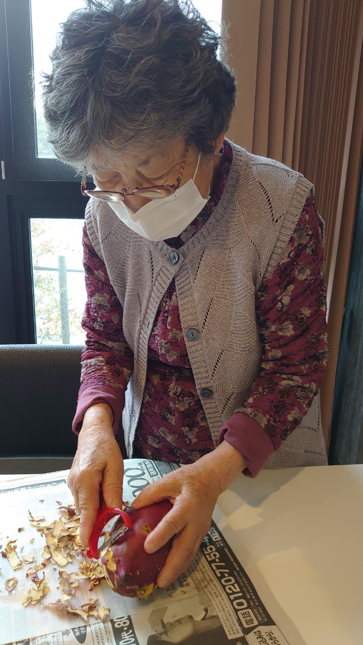 今日はお楽しみの手作りおやつの日(2日目)です。旬のさつまいもを使ったさつまいも餅とさつまいもスープで温まっていただきました。