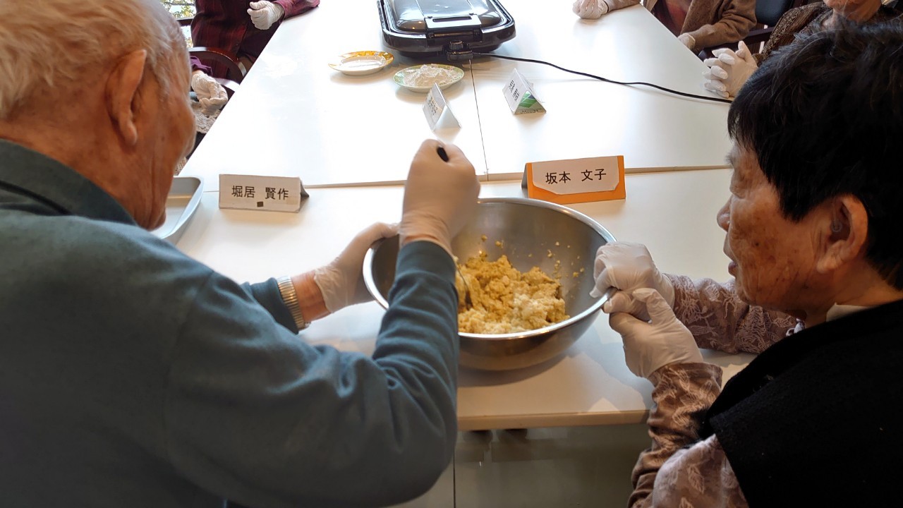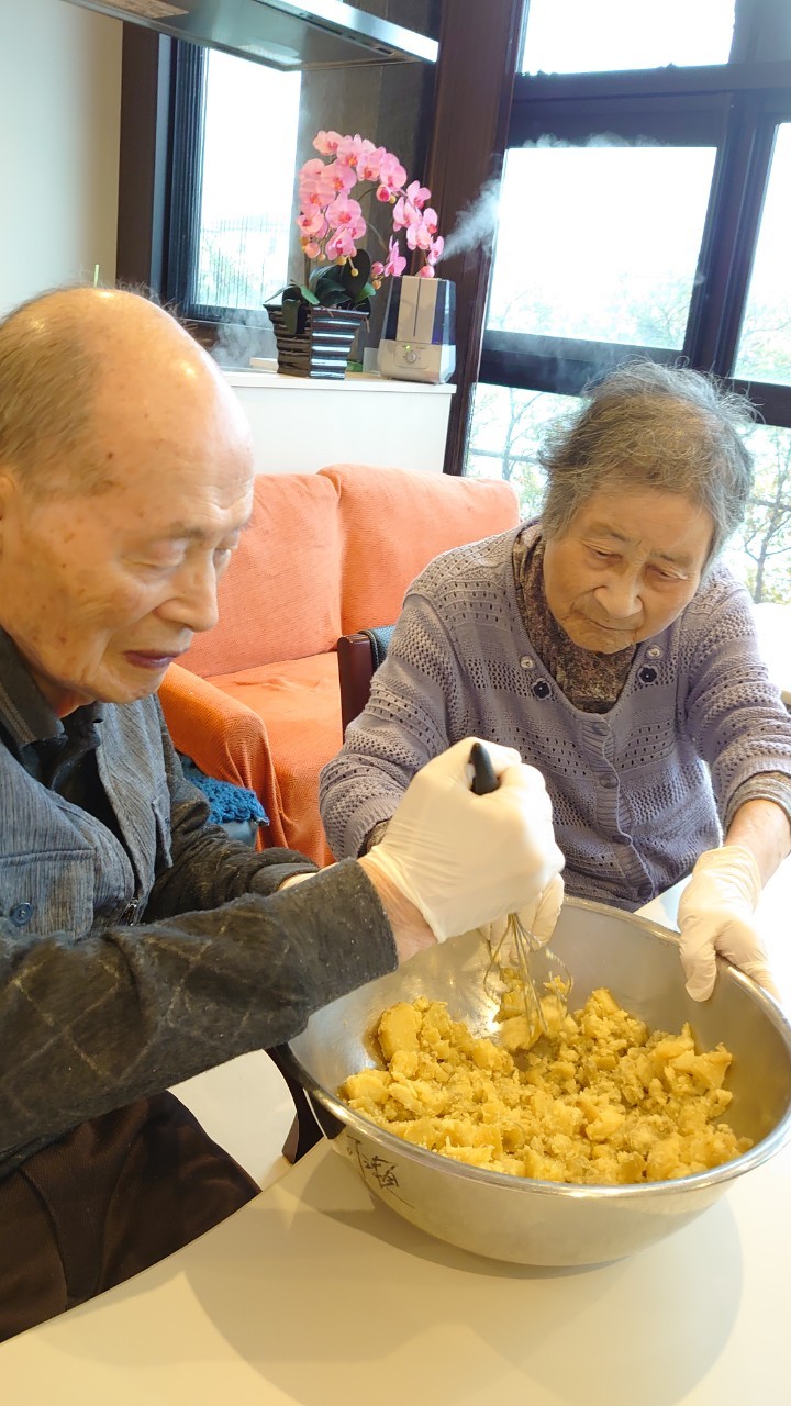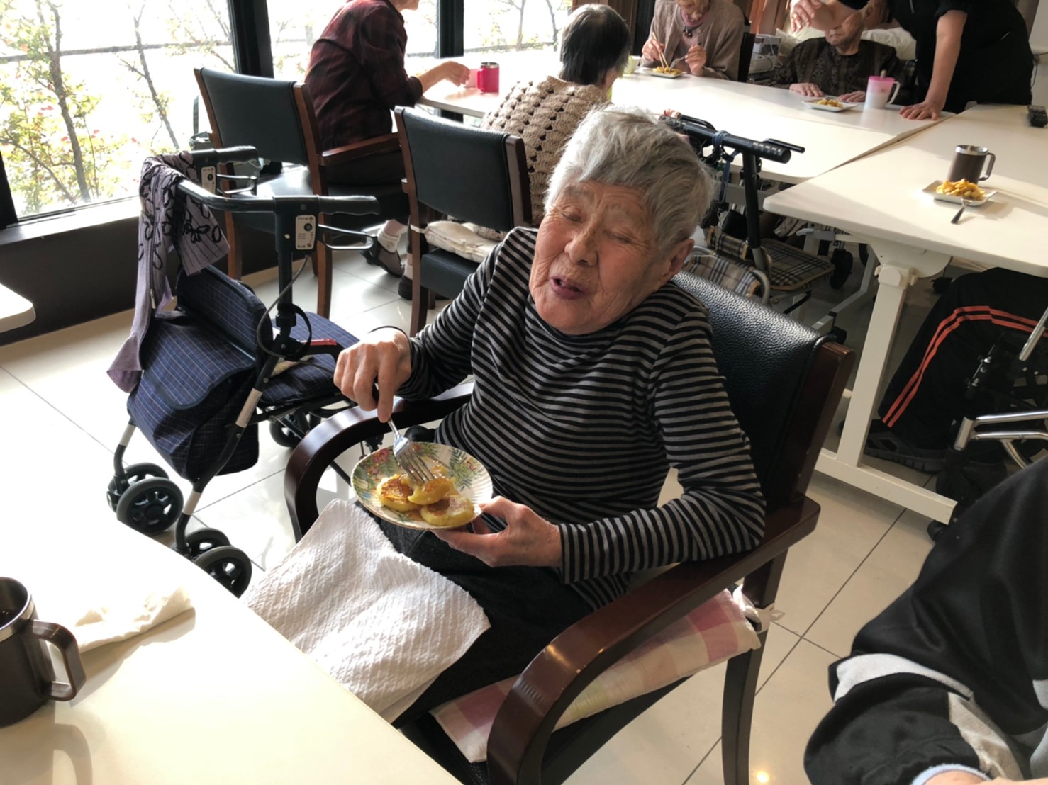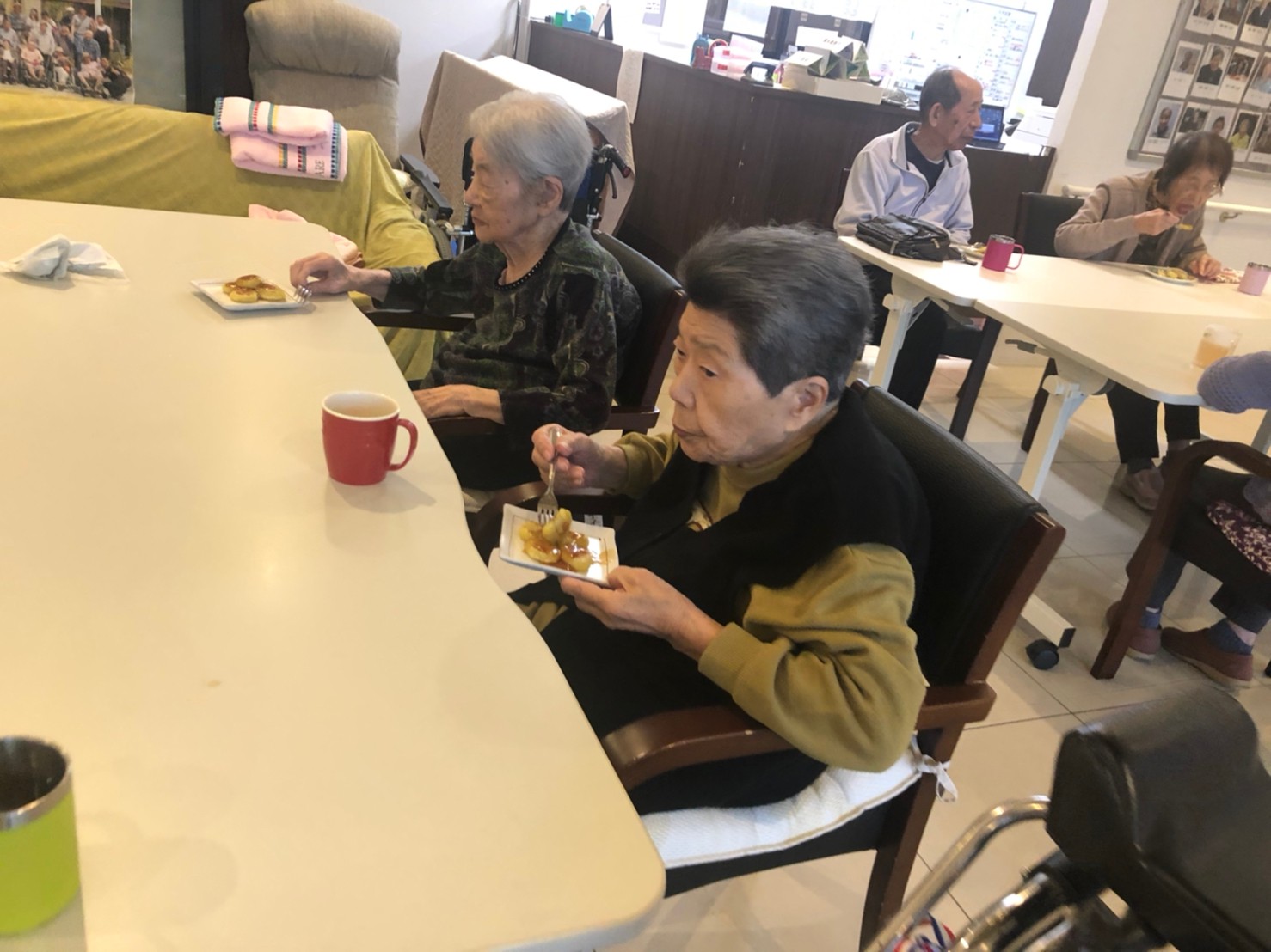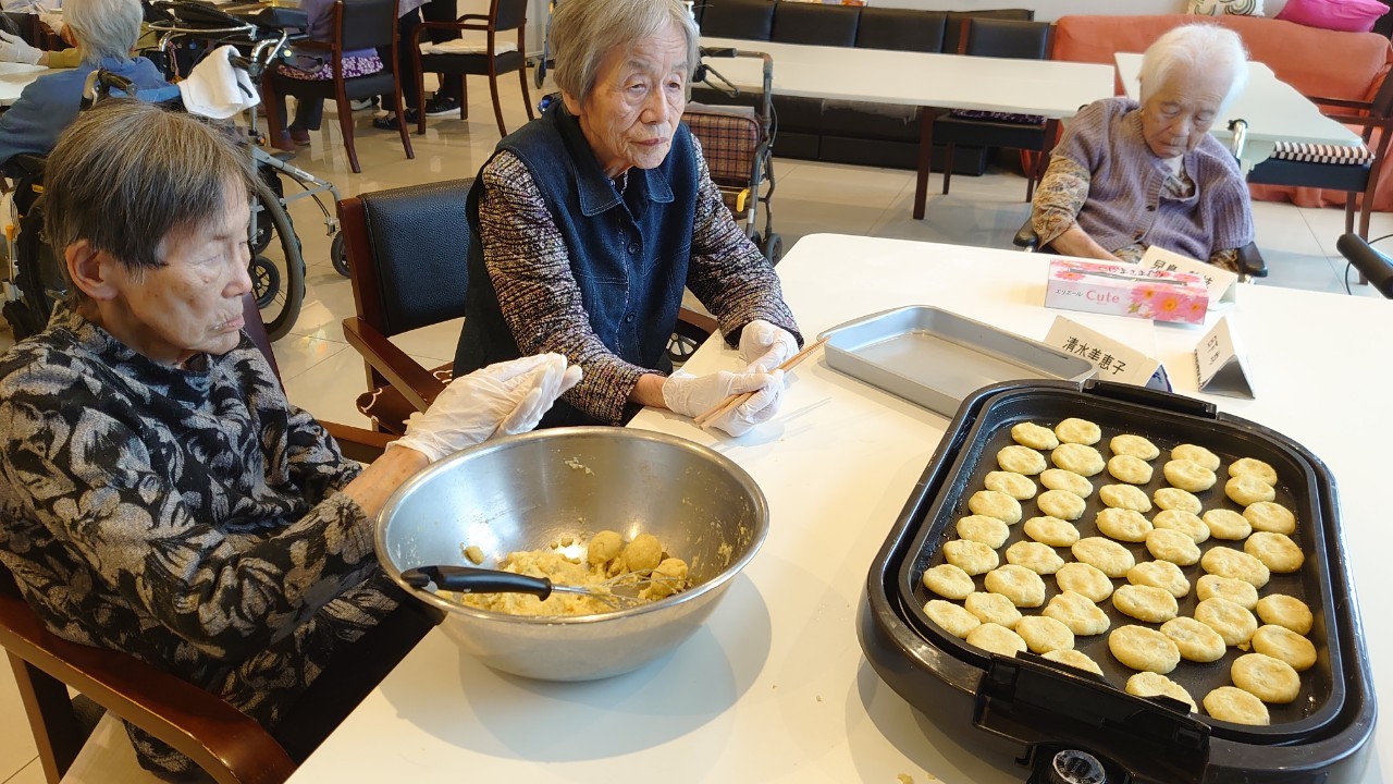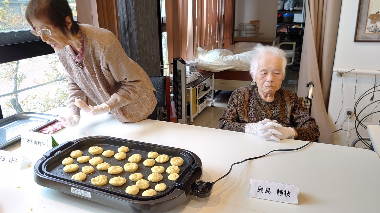 今日はお楽しみの手作りおやつの日(2日目)です。旬のさつまいもを使ったさつまいも餅とさつまいもスープで温まっていただきました。