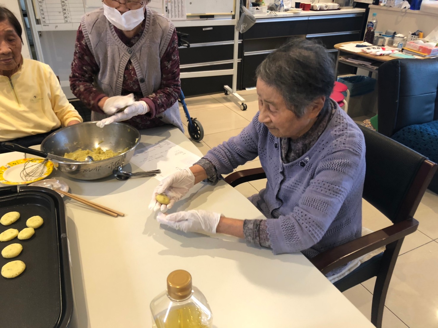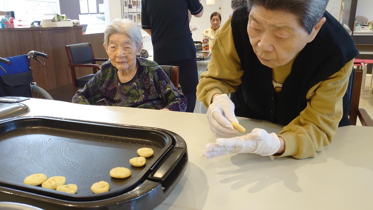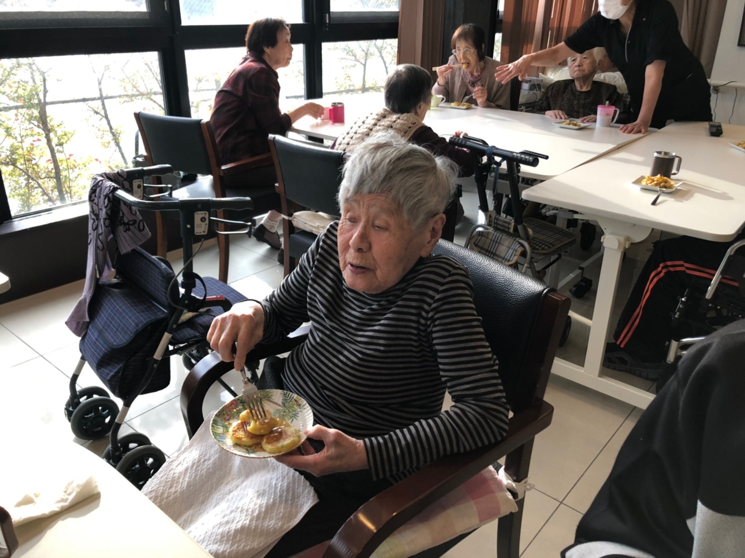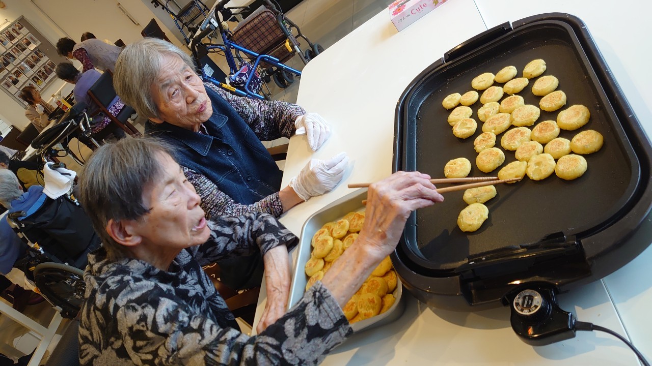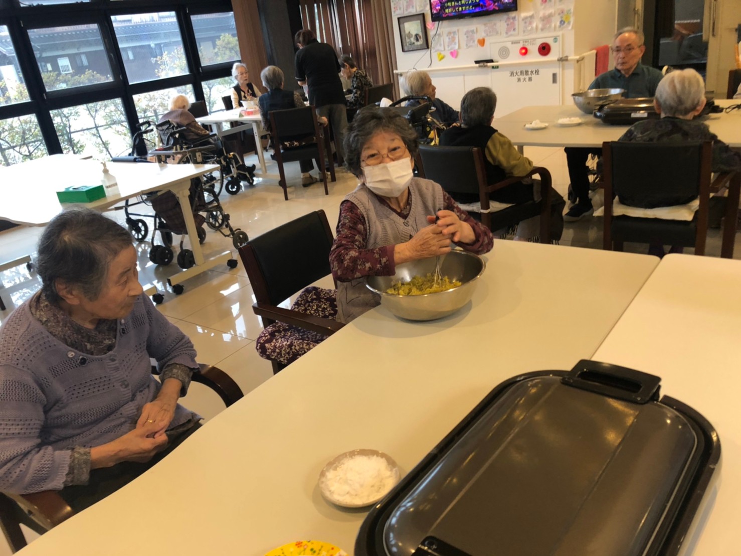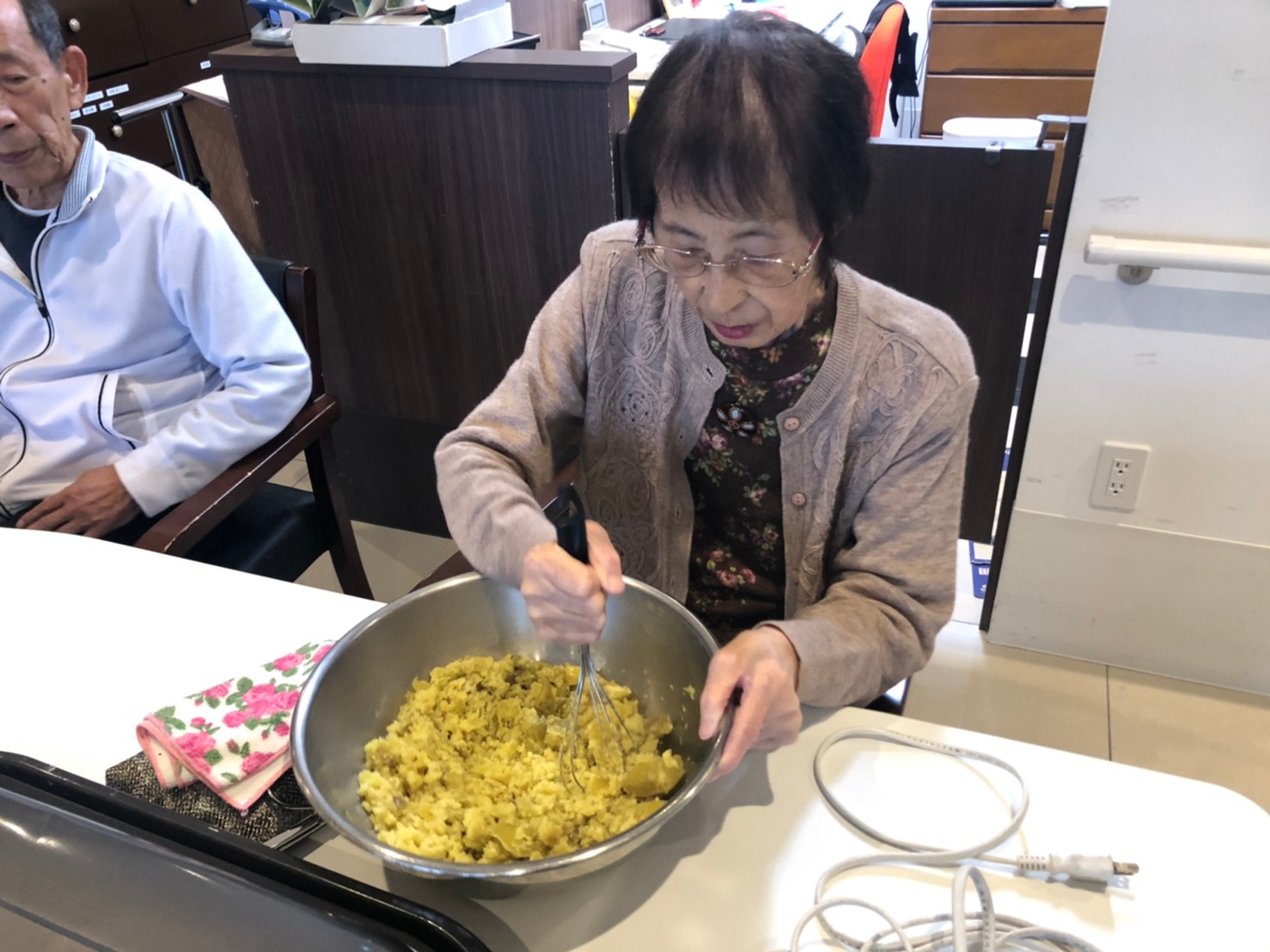 今日はお楽しみの手作りおやつの日(2日目)です。旬のさつまいもを使ったさつまいも餅とさつまいもスープで温まっていただきました。