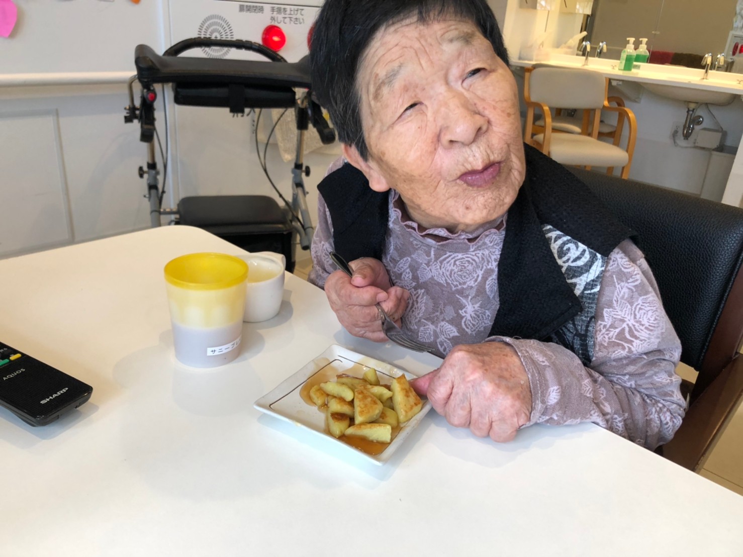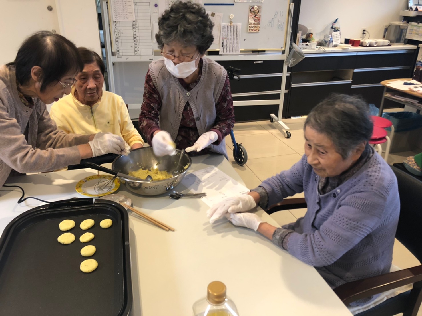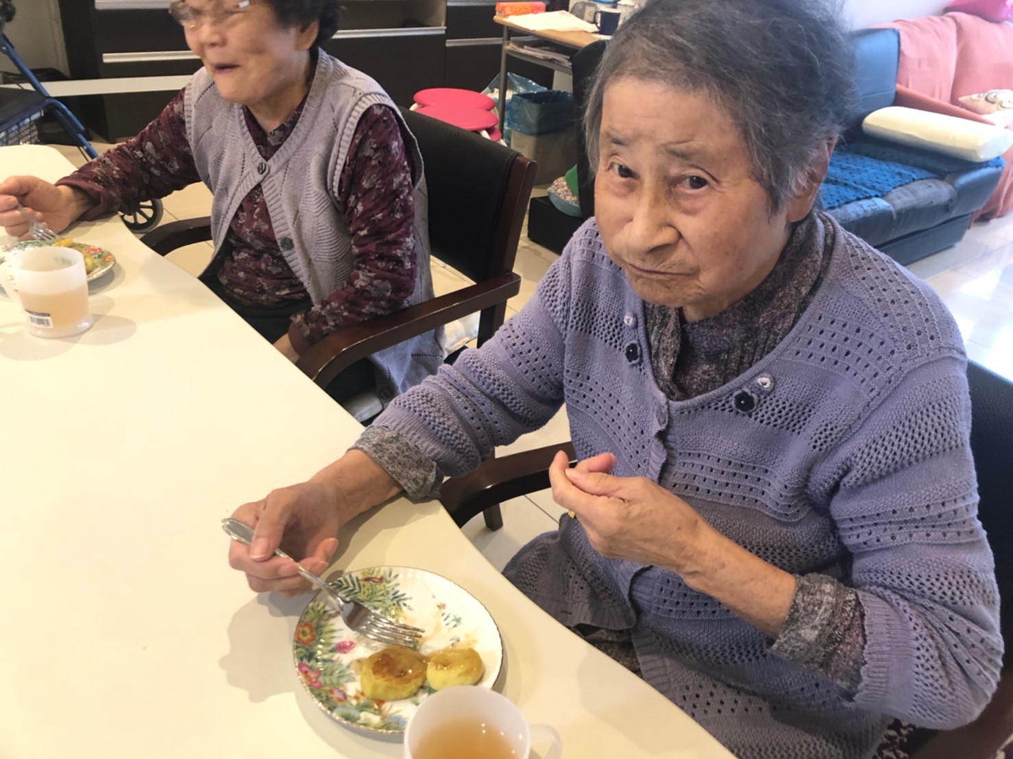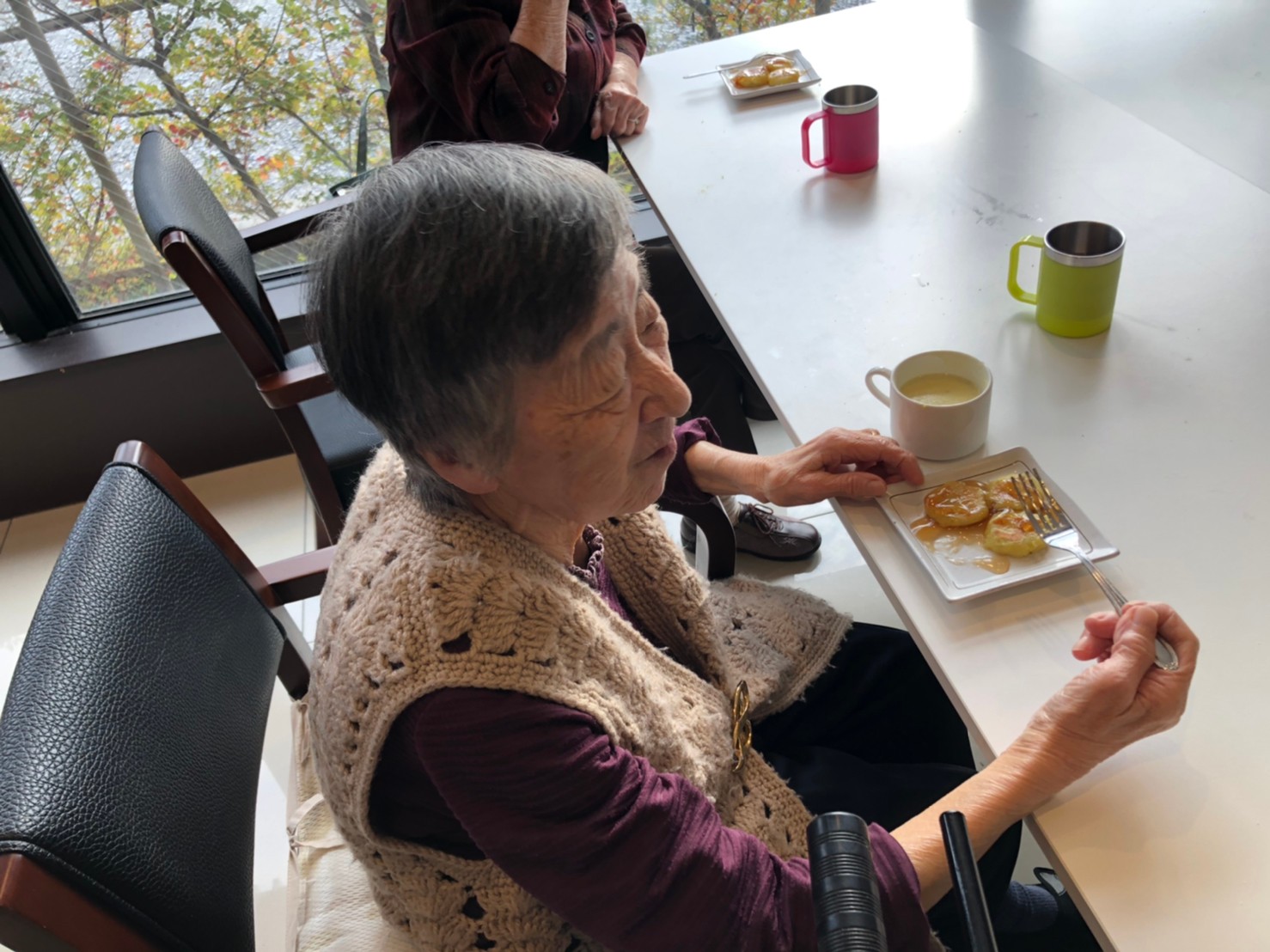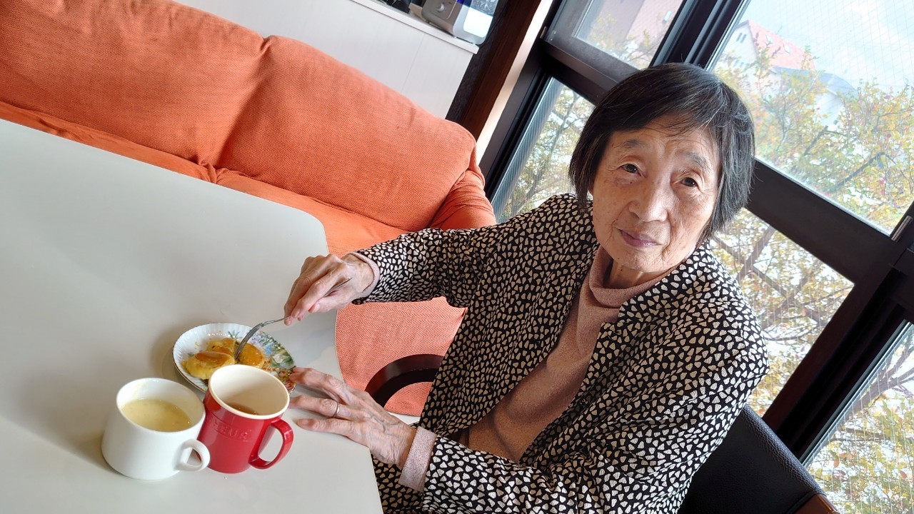 今日はお楽しみの手作りおやつの日(2日目)です。旬のさつまいもを使ったさつまいも餅とさつまいもスープで温まっていただきました。