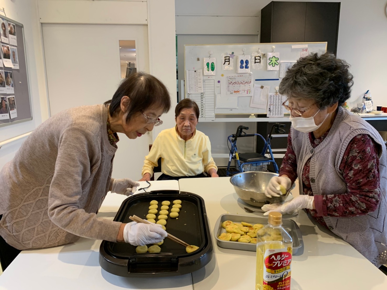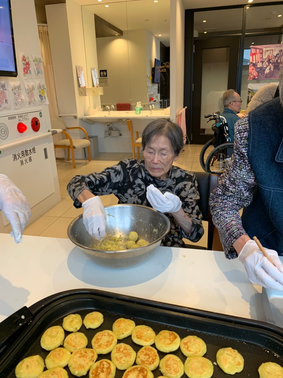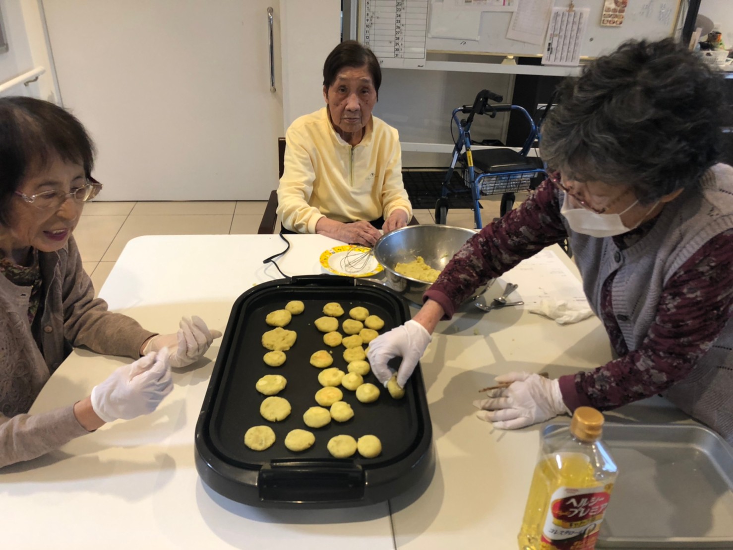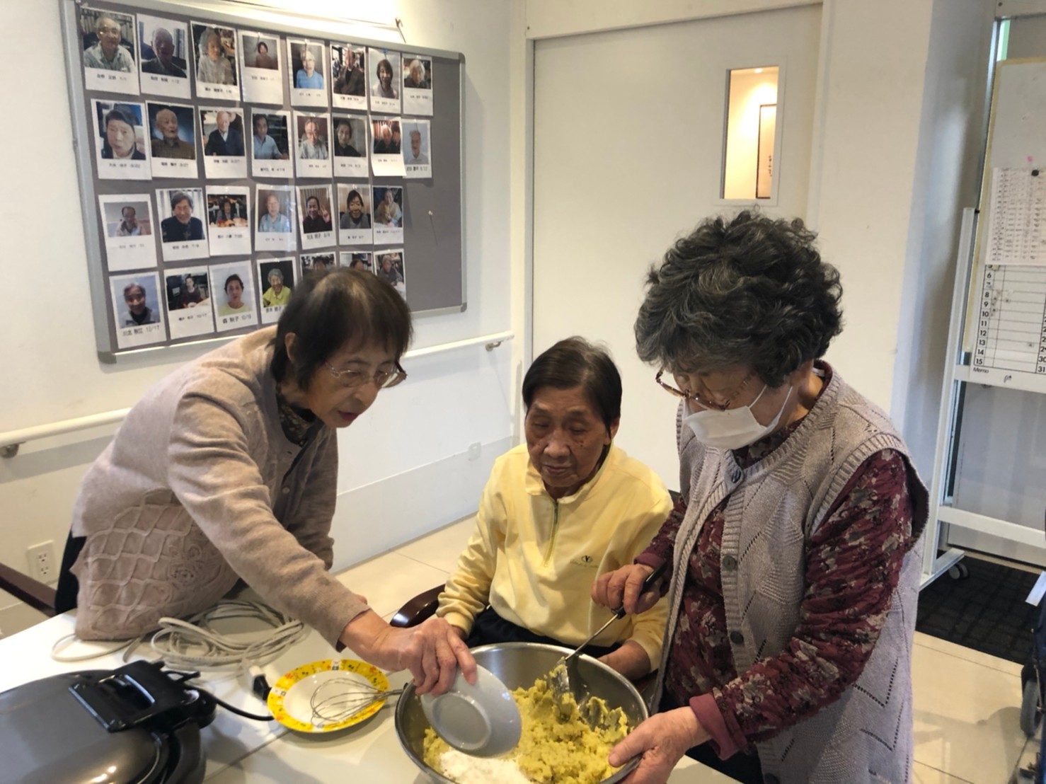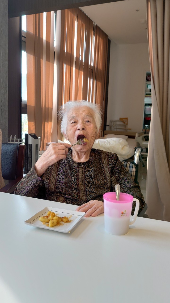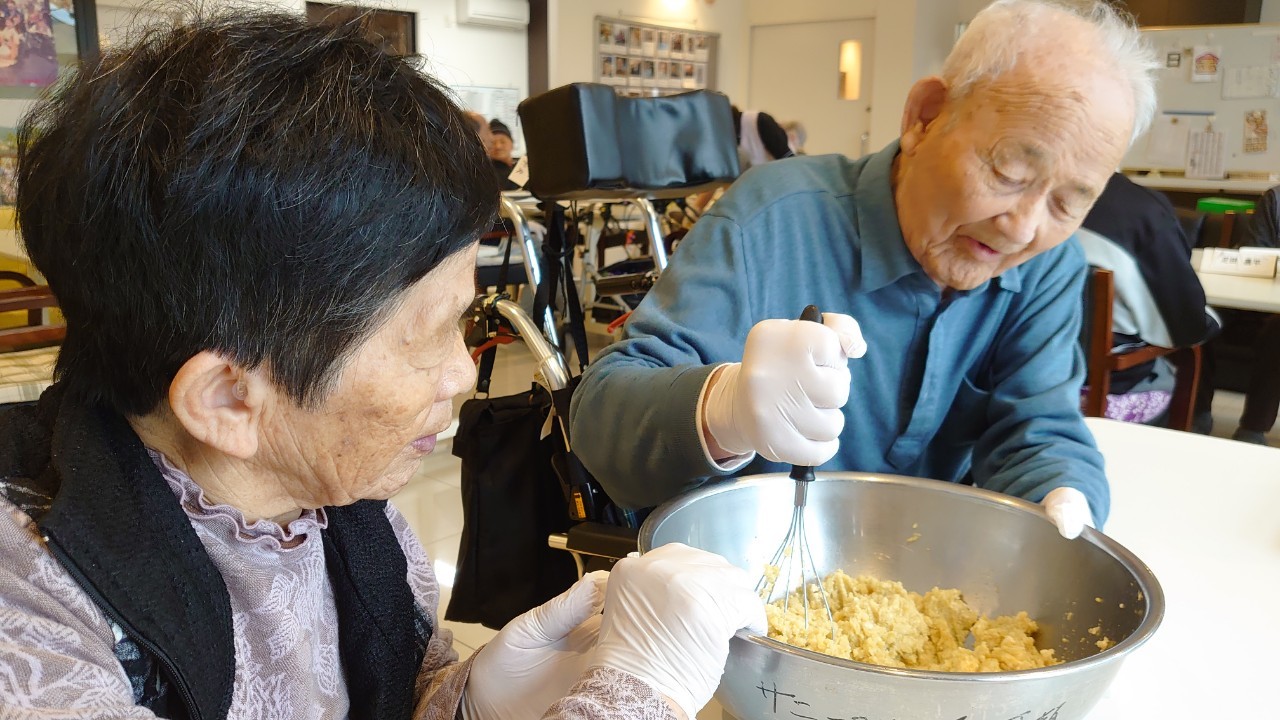 今日はお楽しみの手作りおやつの日(2日目)です。旬のさつまいもを使ったさつまいも餅とさつまいもスープで温まっていただきました。