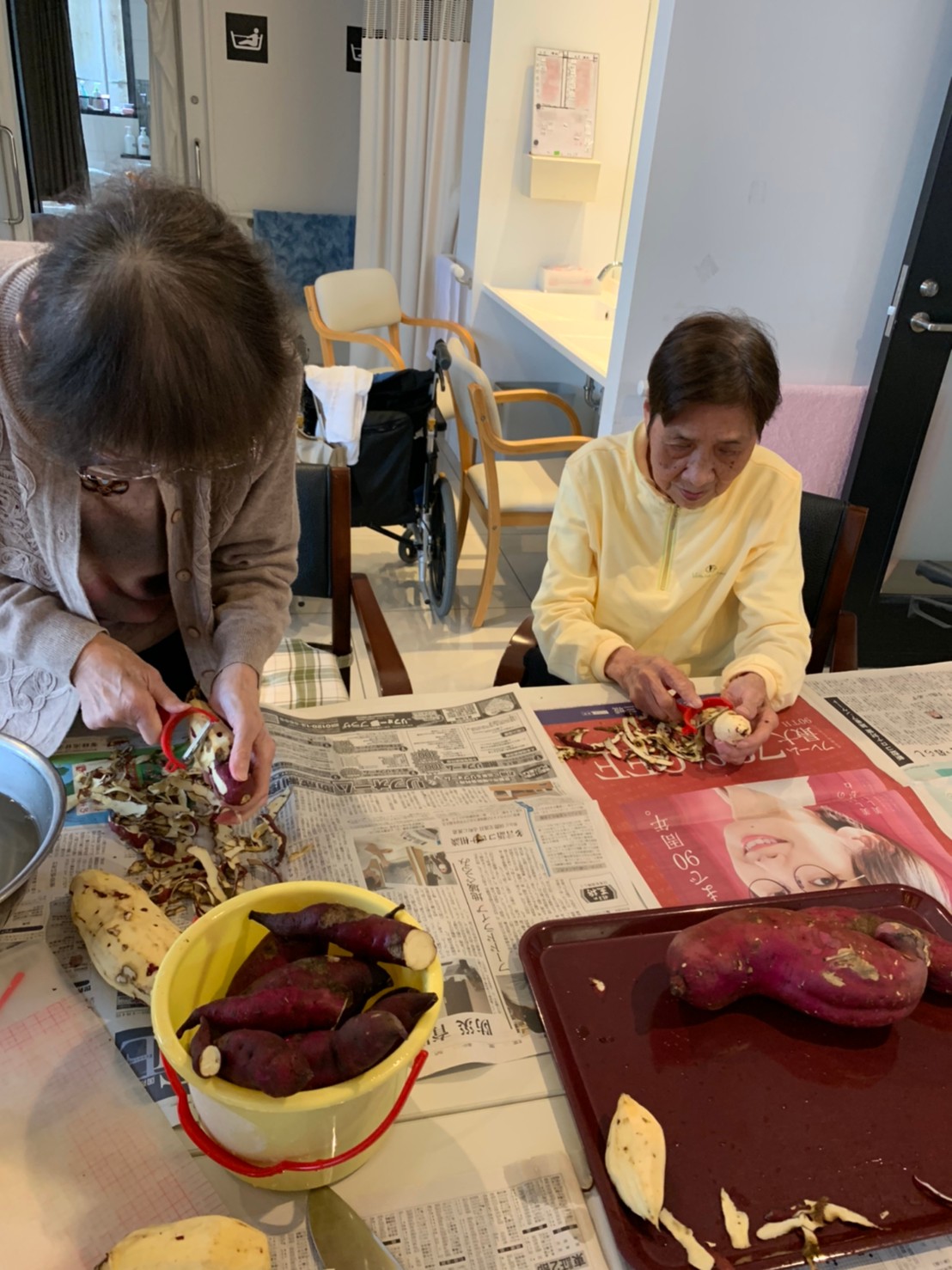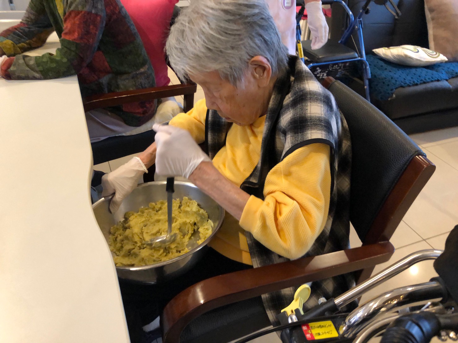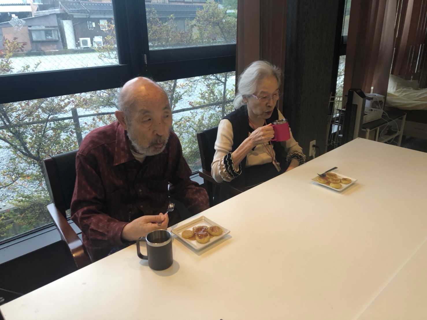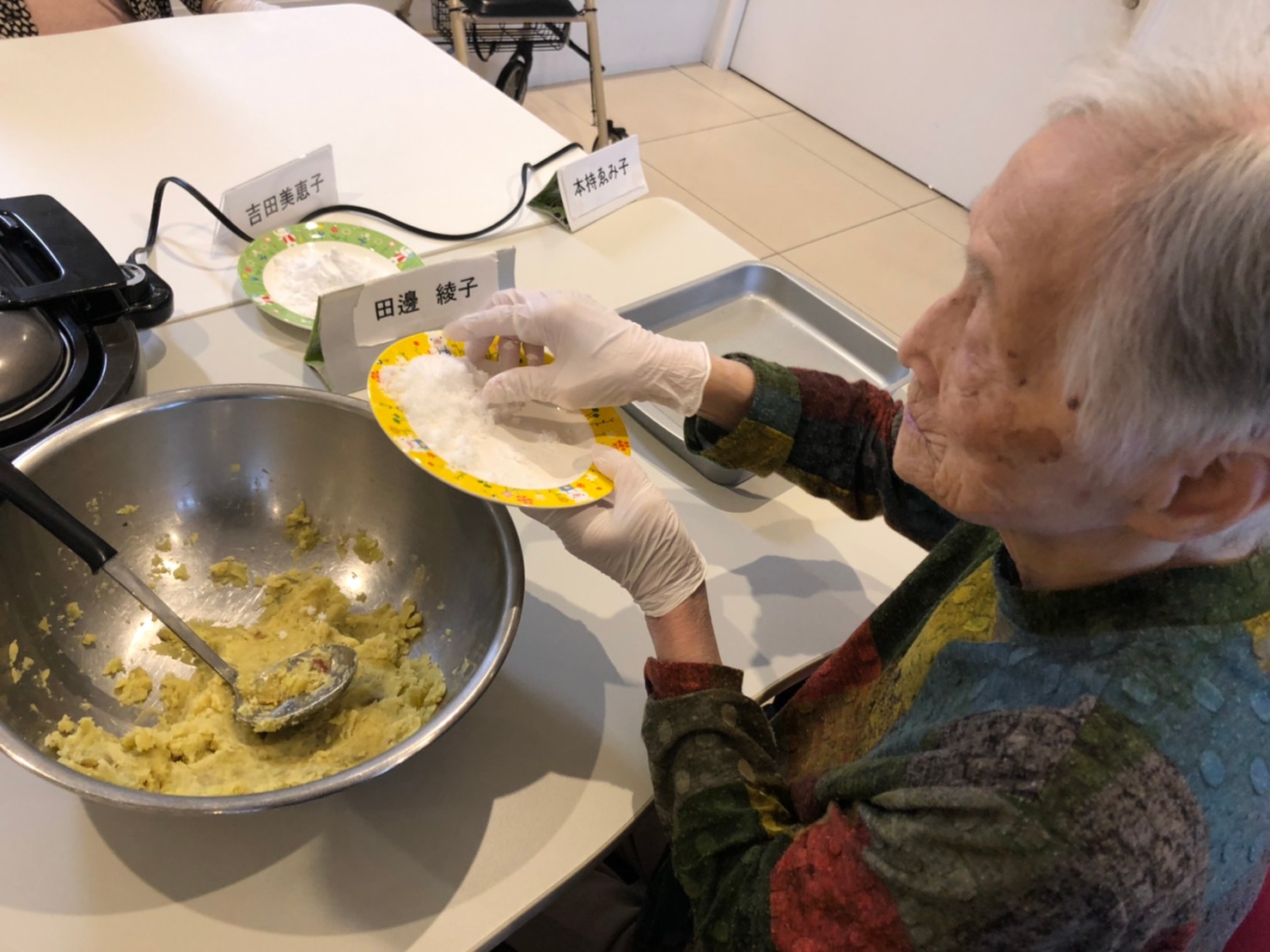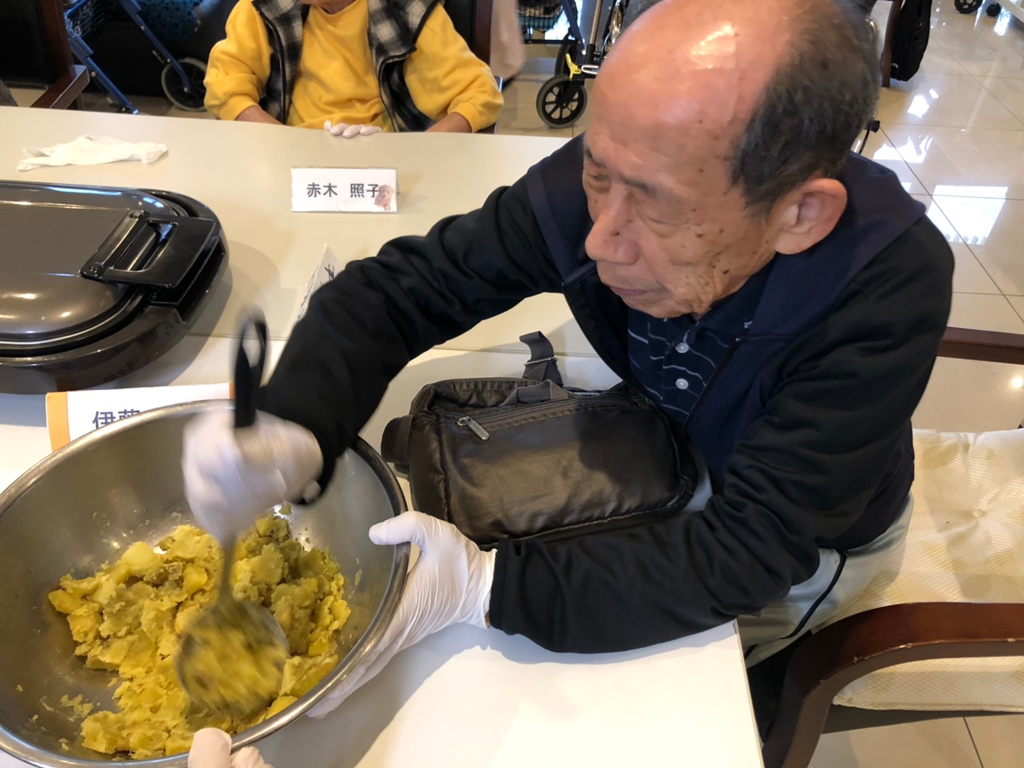 今日はお楽しみの手作りおやつの日(2日目)です。旬のさつまいもを使ったさつまいも餅とさつまいもスープで温まっていただきました。