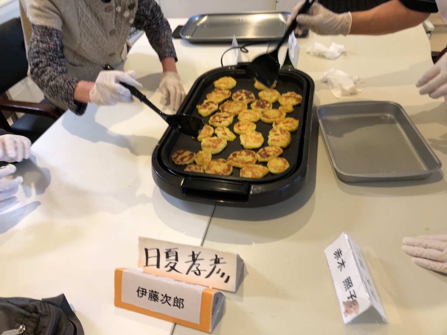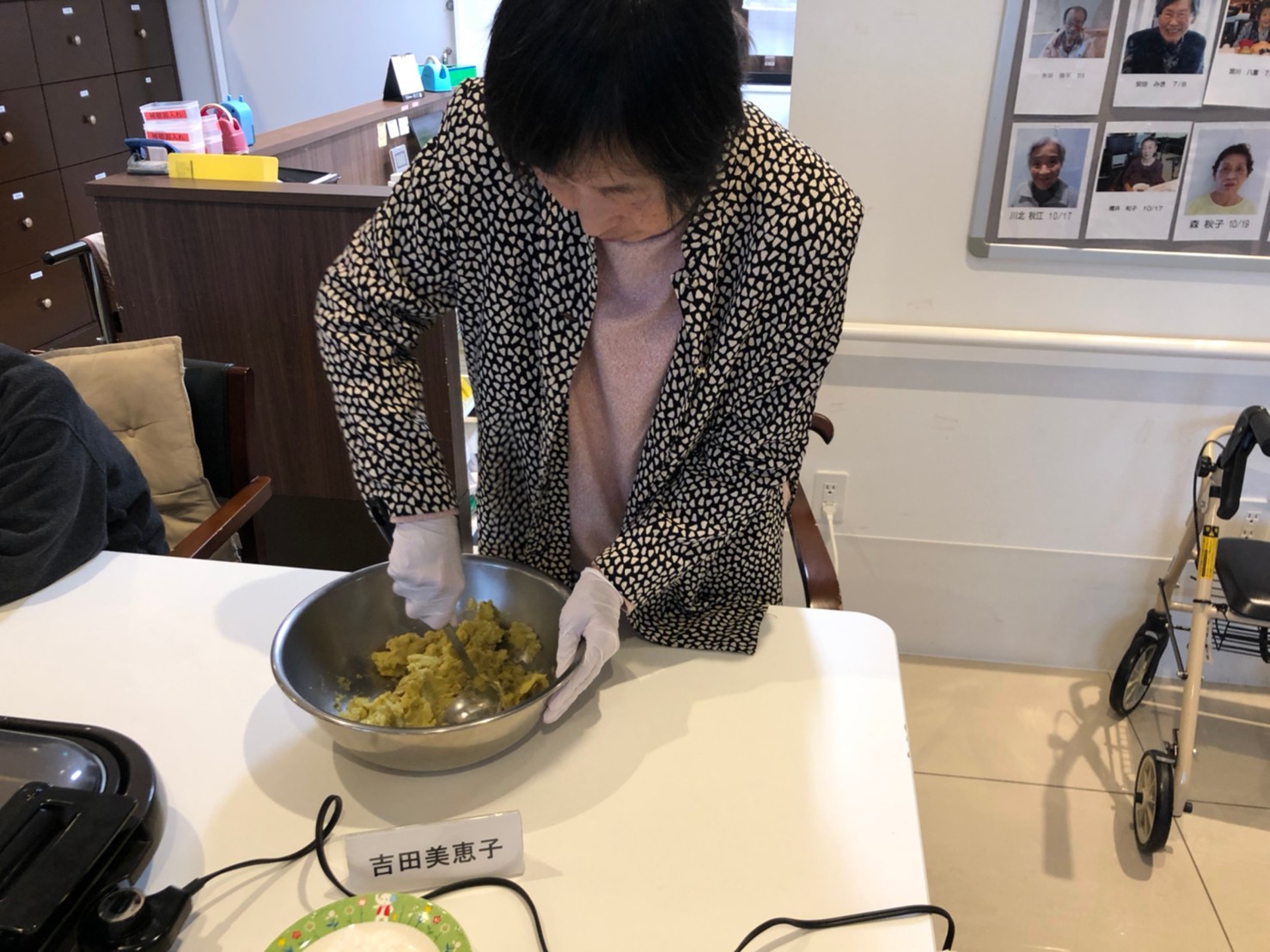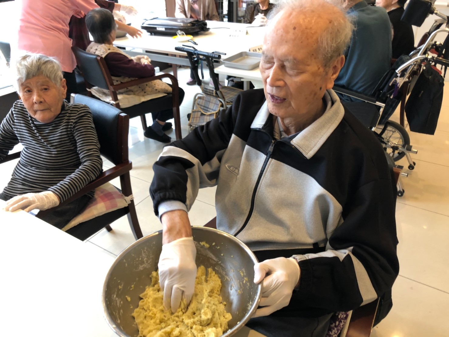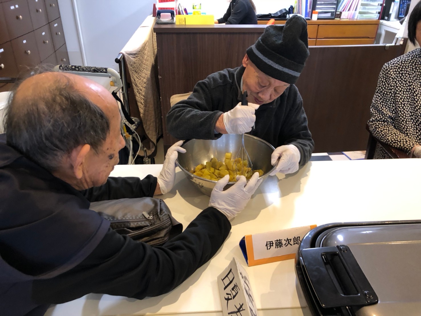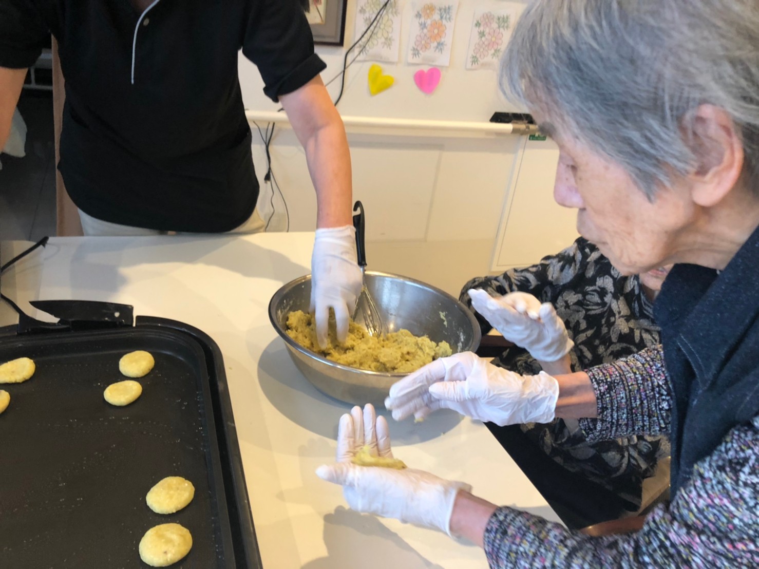 今日はお楽しみの手作りおやつの日(2日目)です。旬のさつまいもを使ったさつまいも餅とさつまいもスープで温まっていただきました。