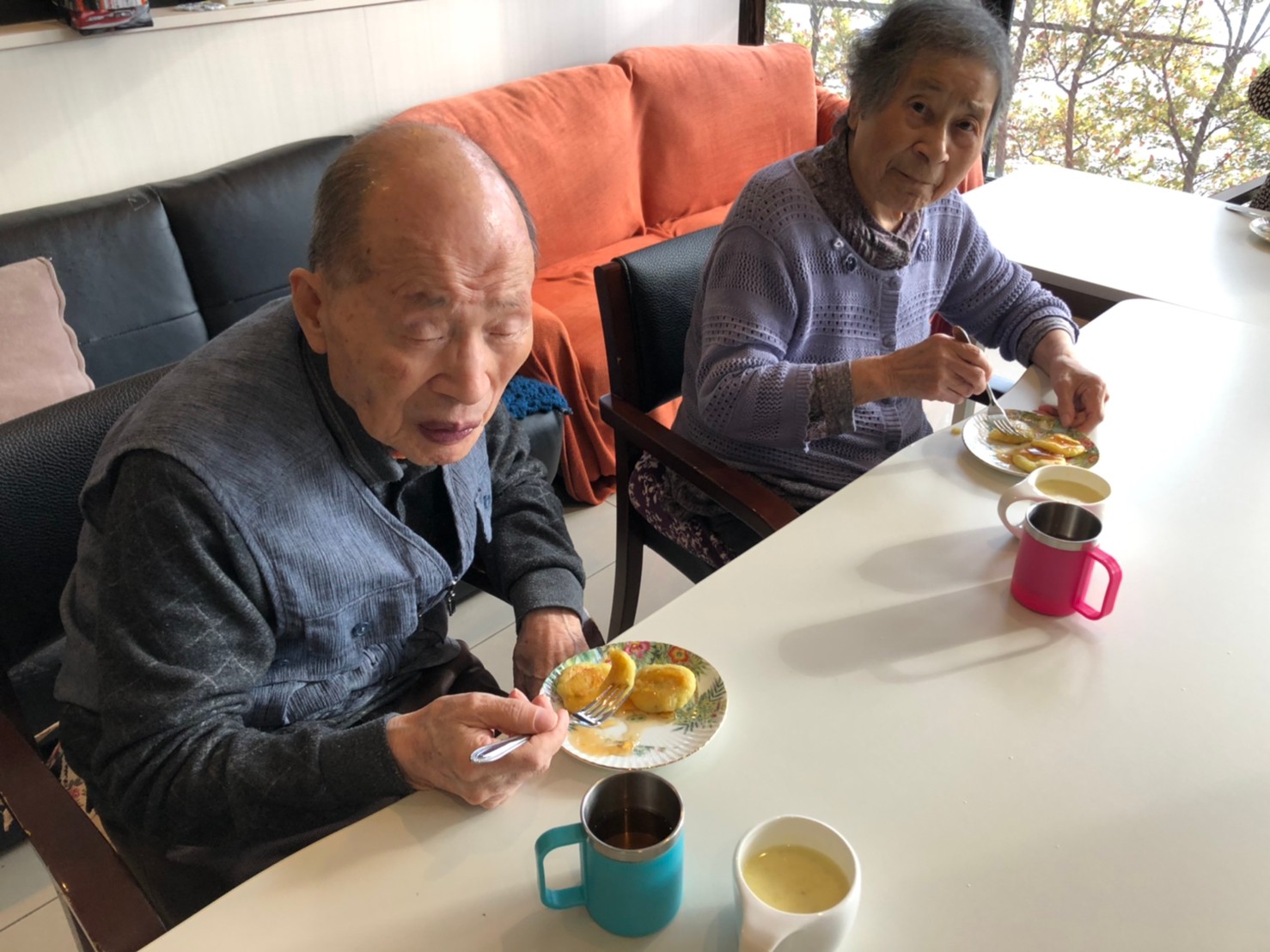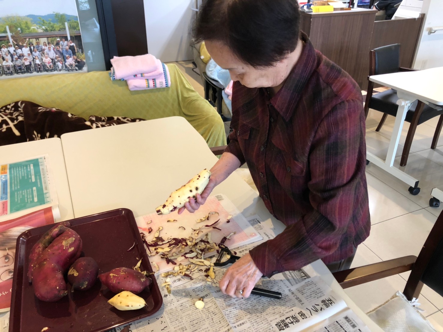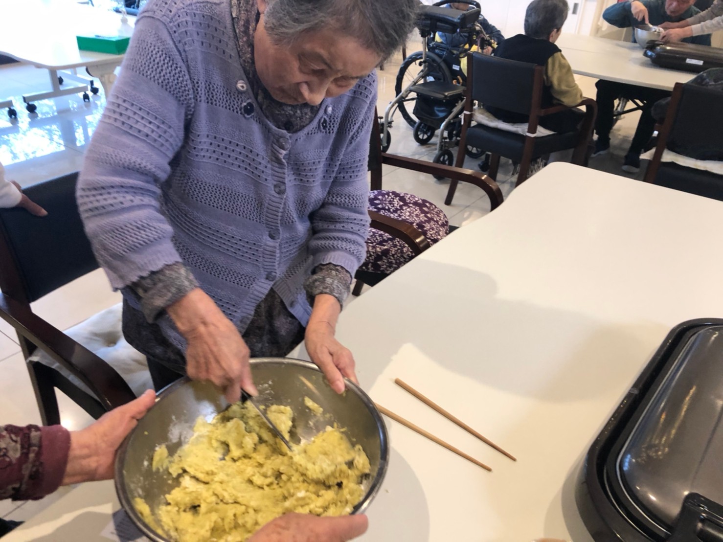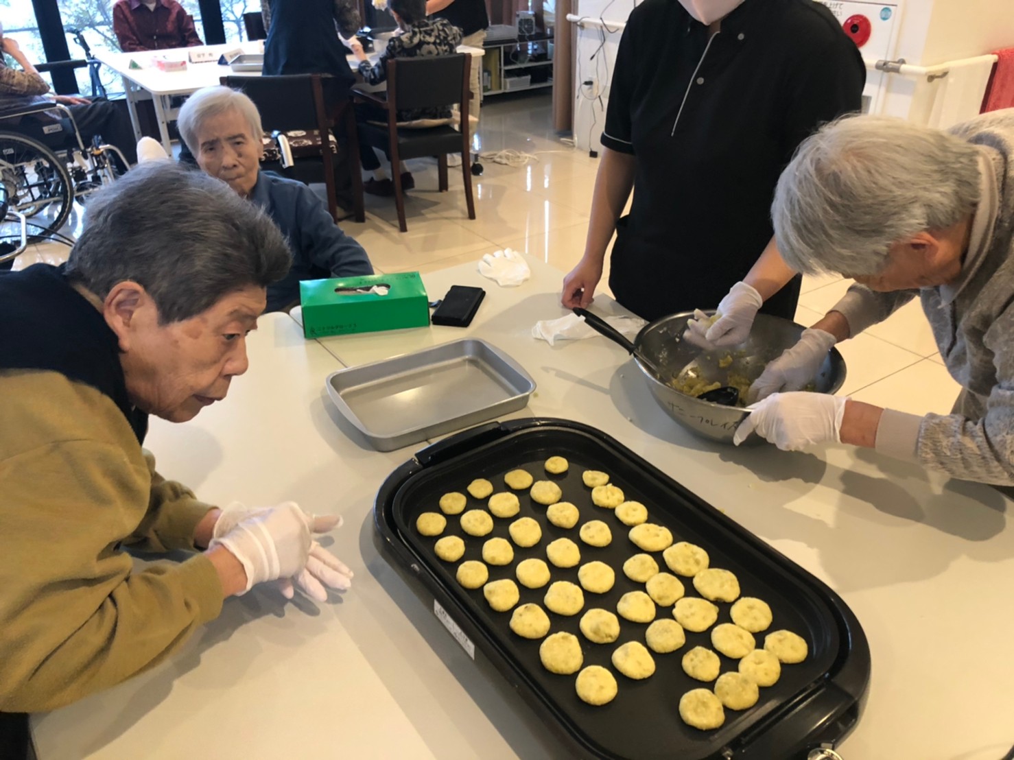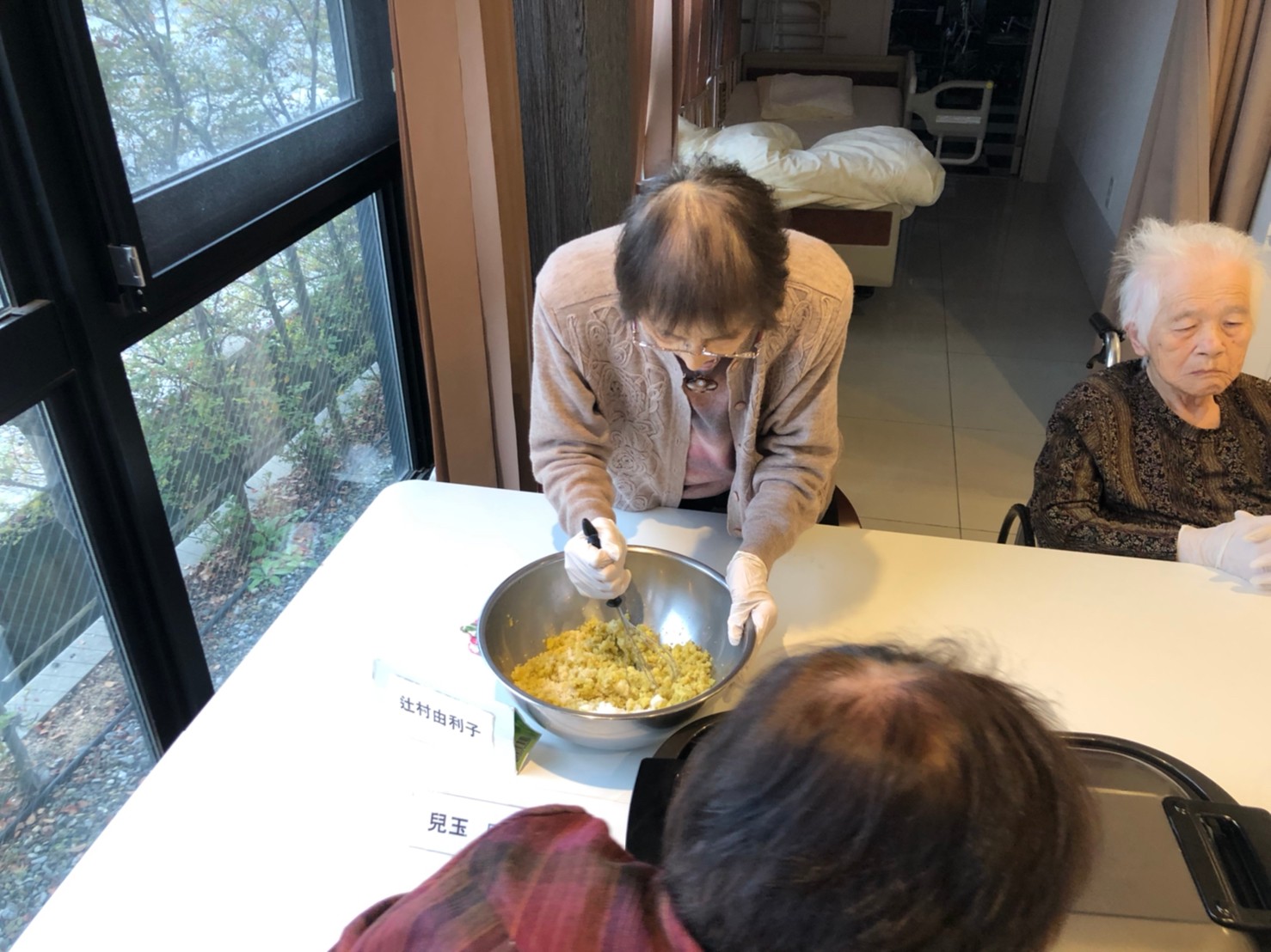 今日はお楽しみの手作りおやつの日(2日目)です。旬のさつまいもを使ったさつまいも餅とさつまいもスープで温まっていただきました。