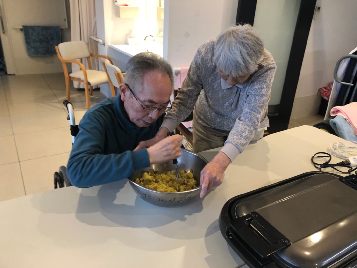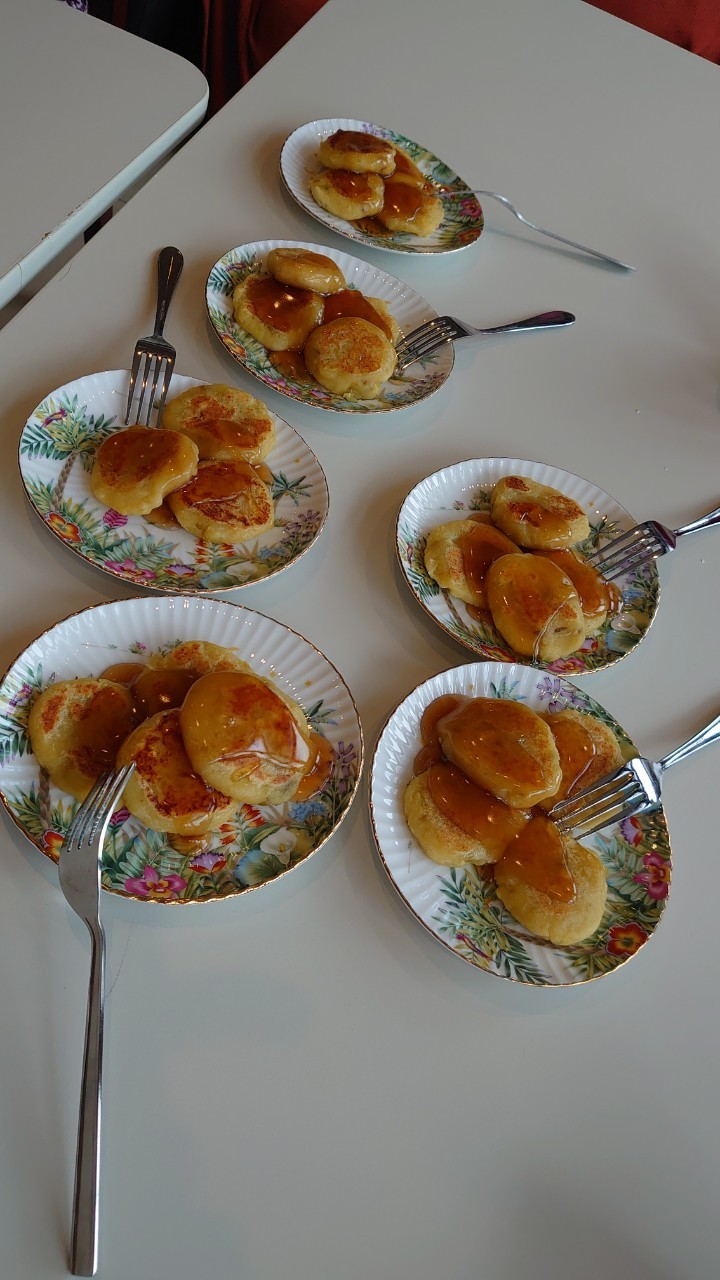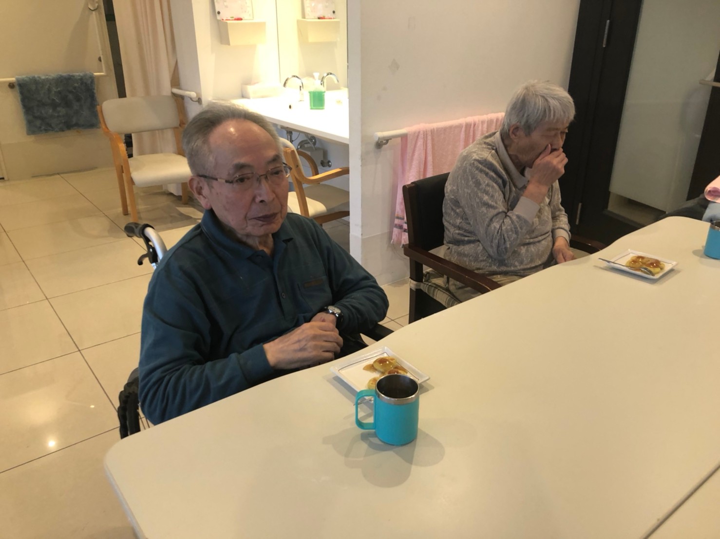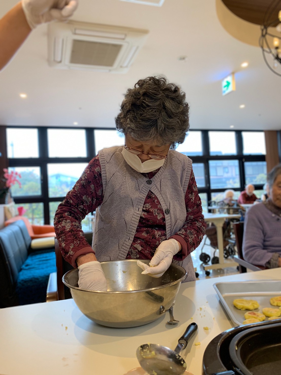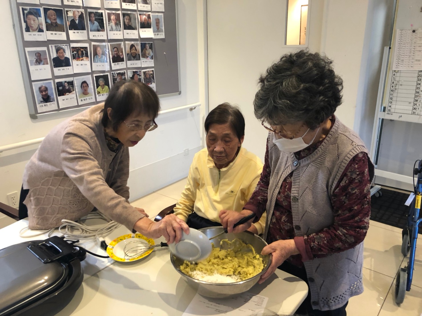 今日はお楽しみの手作りおやつの日(2日目)です。旬のさつまいもを使ったさつまいも餅とさつまいもスープで温まっていただきました。