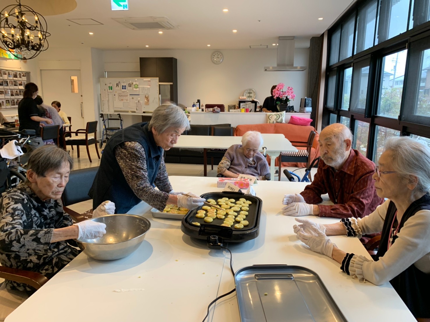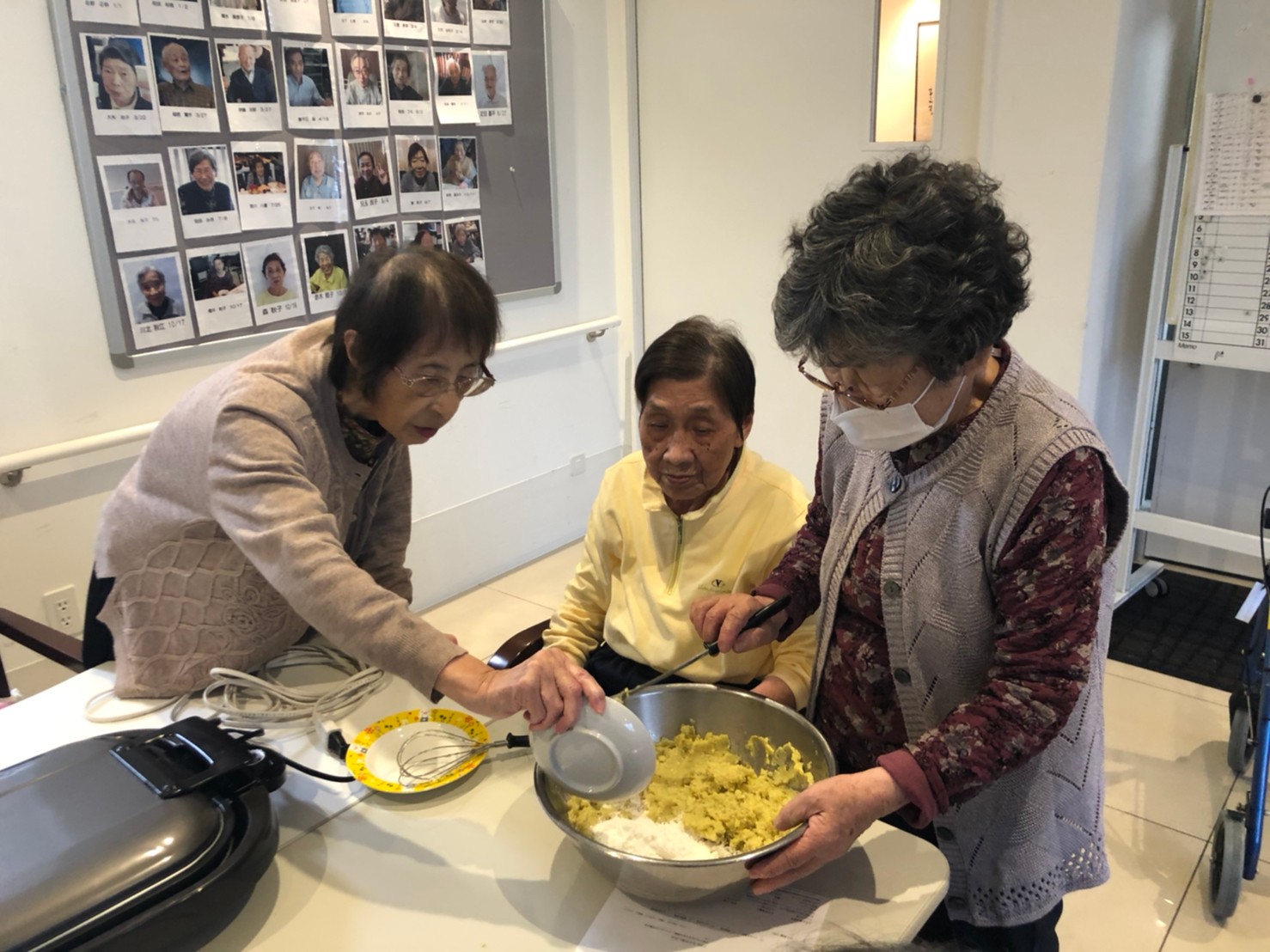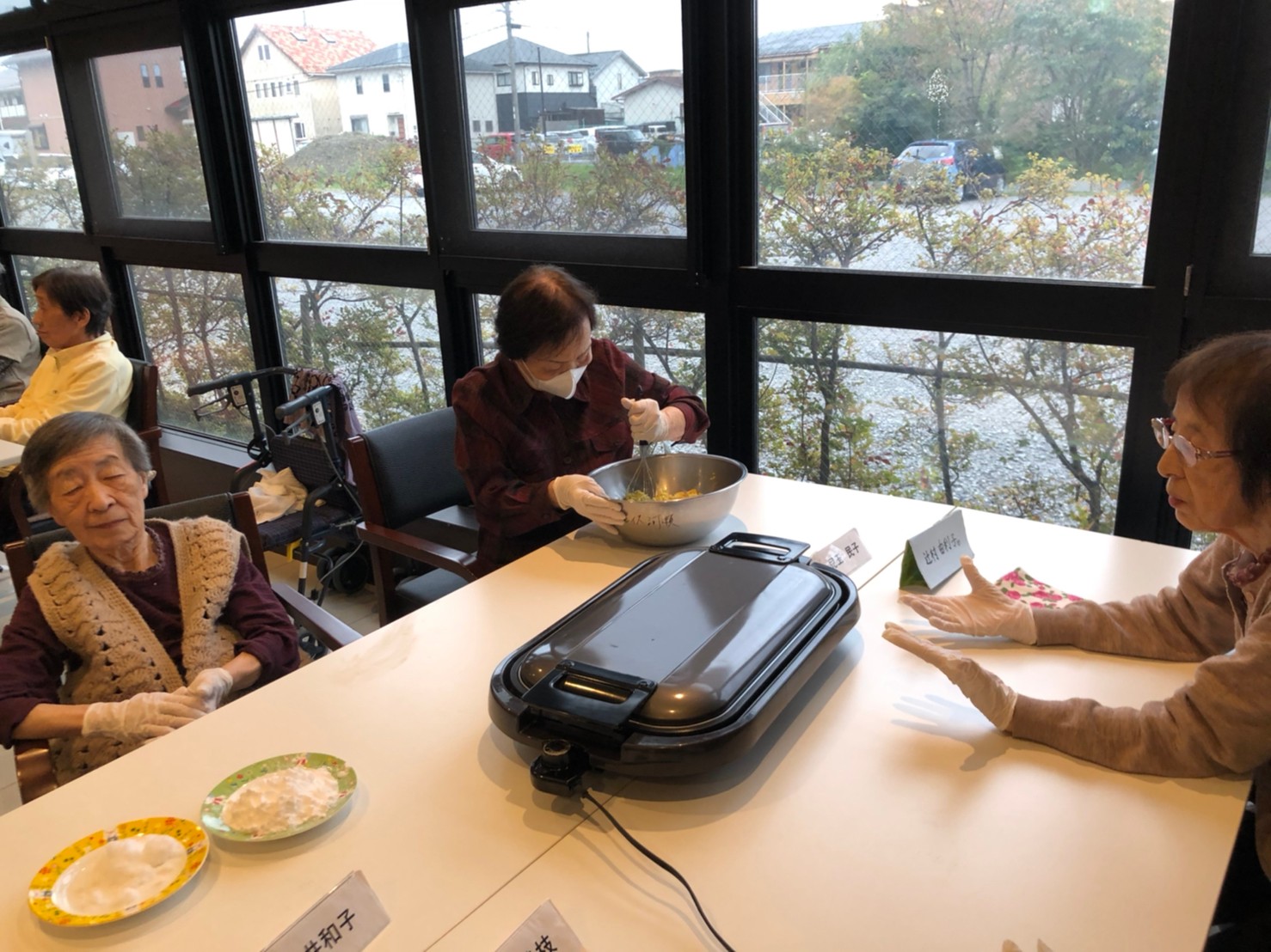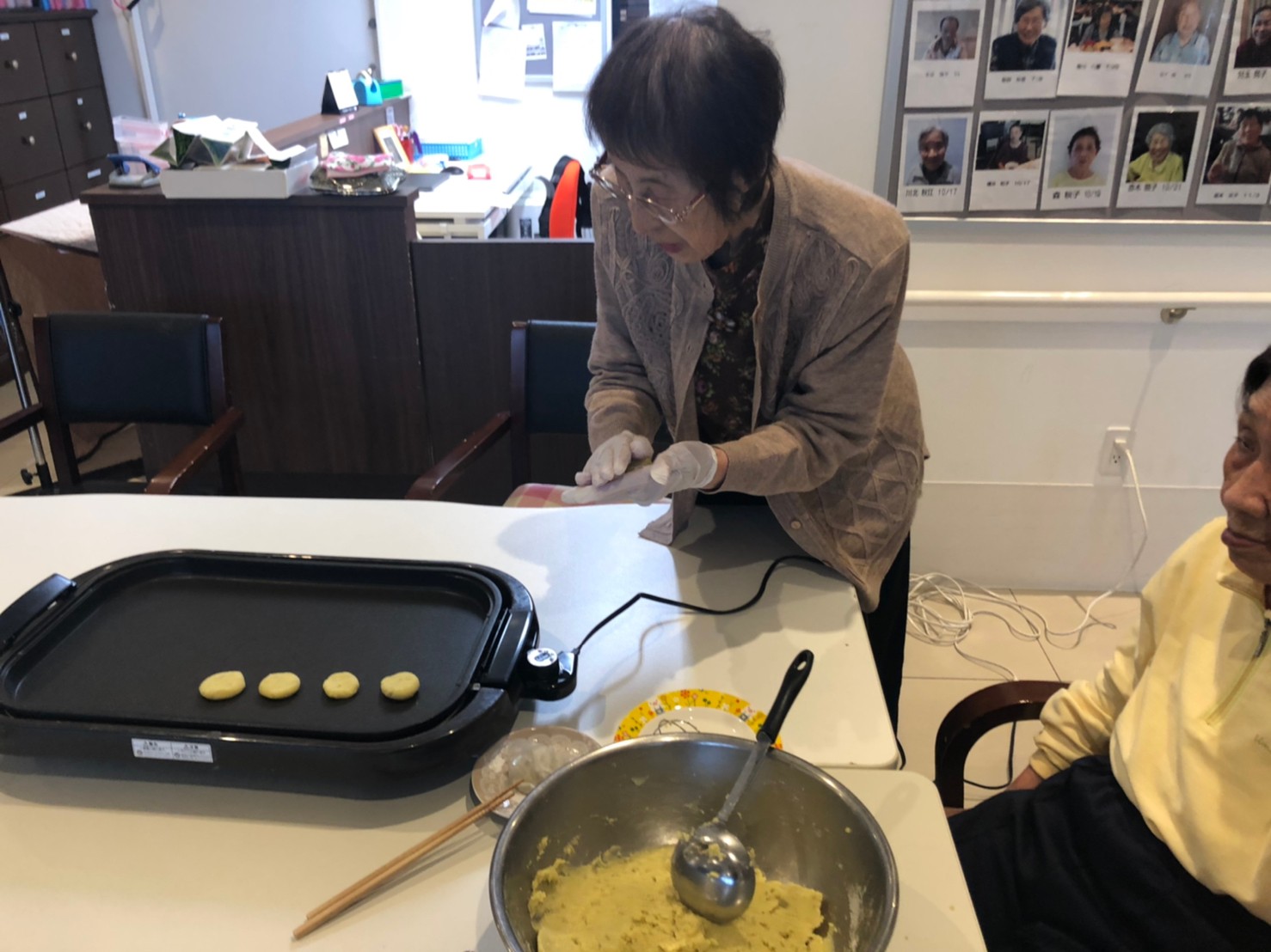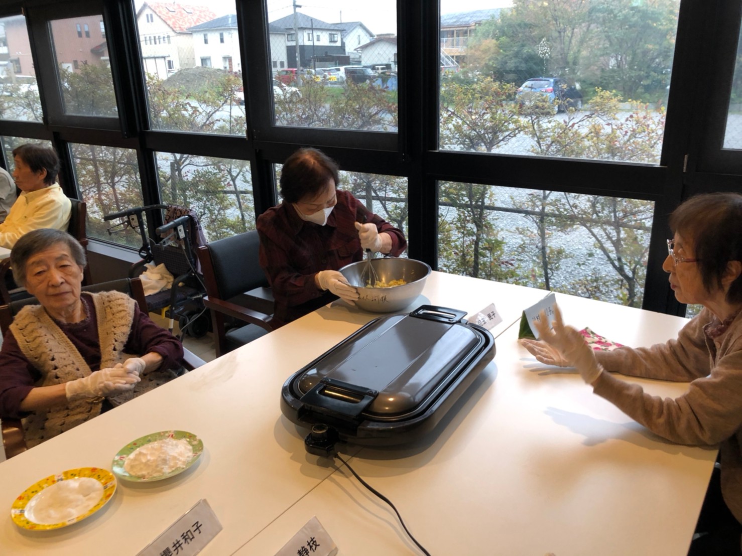 今日はお楽しみの手作りおやつの日(2日目)です。旬のさつまいもを使ったさつまいも餅とさつまいもスープで温まっていただきました。