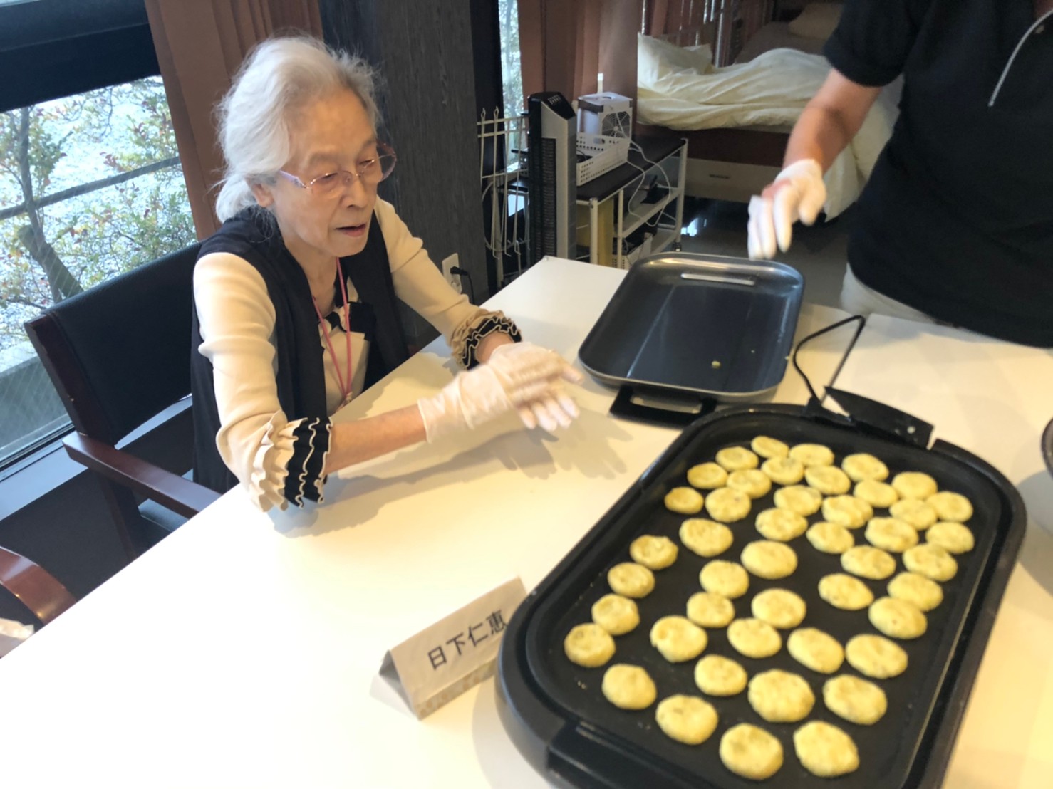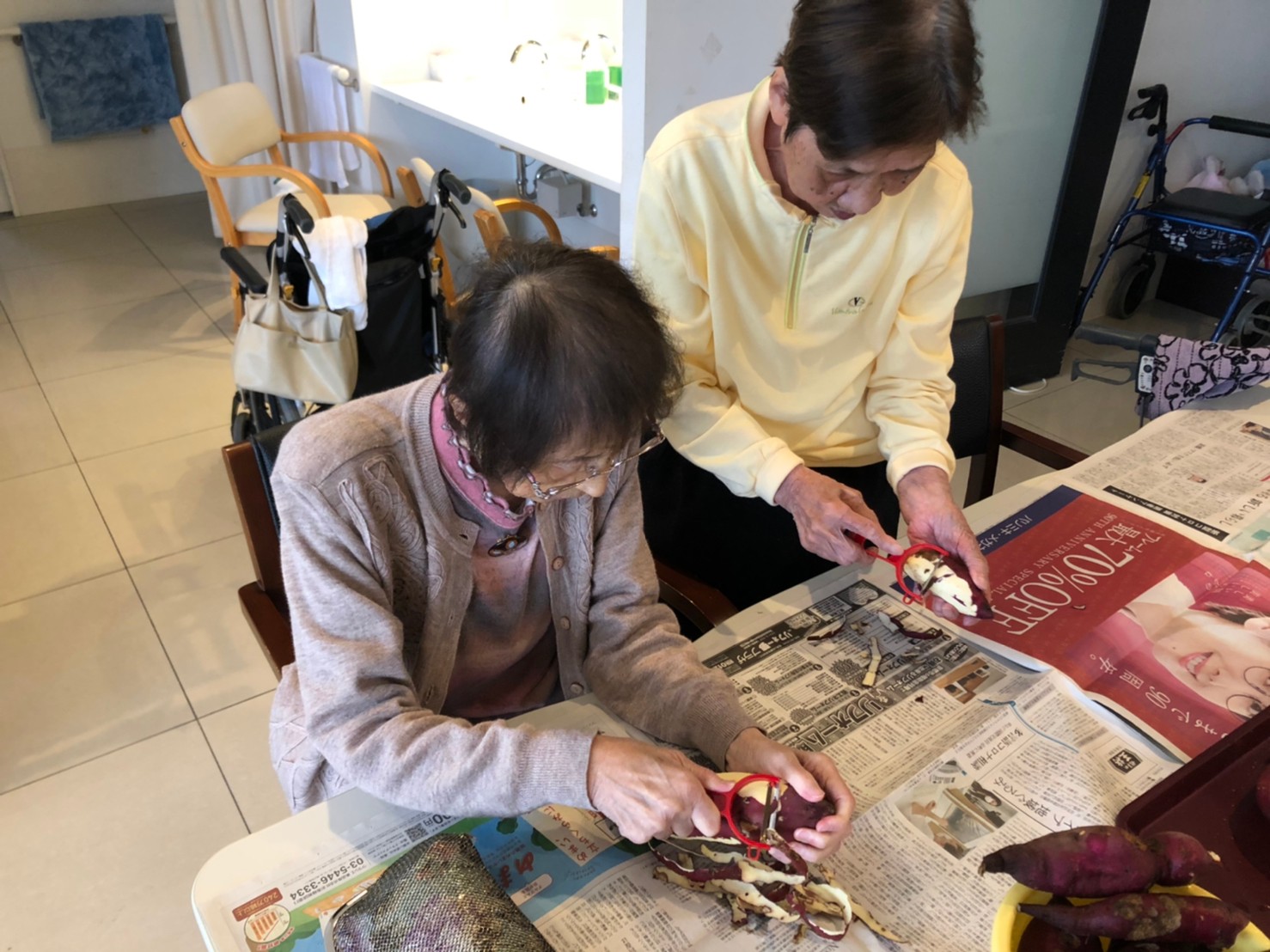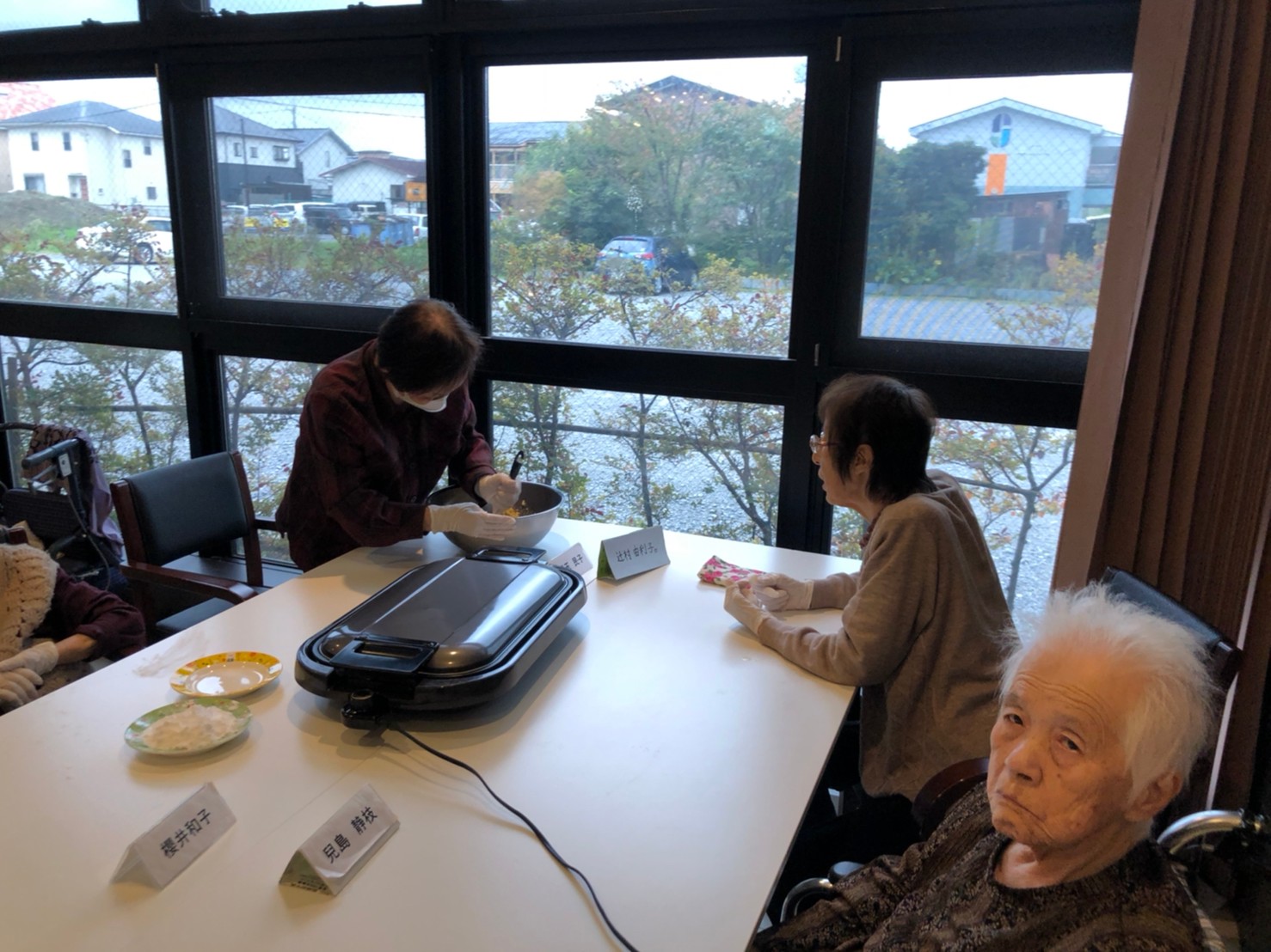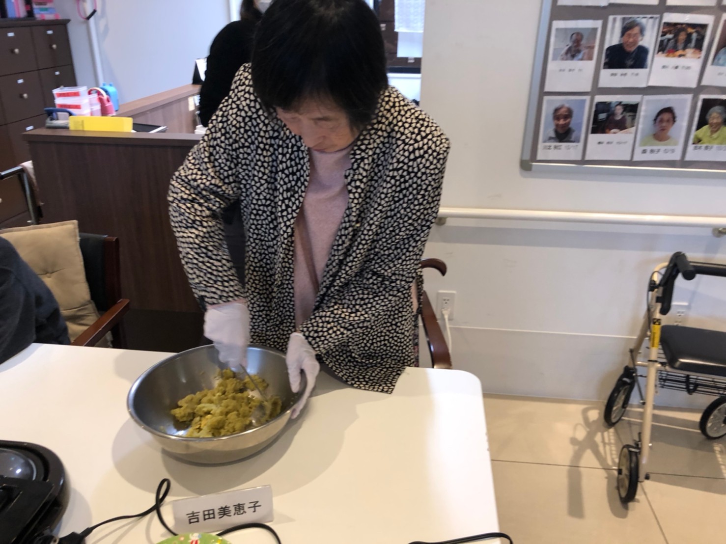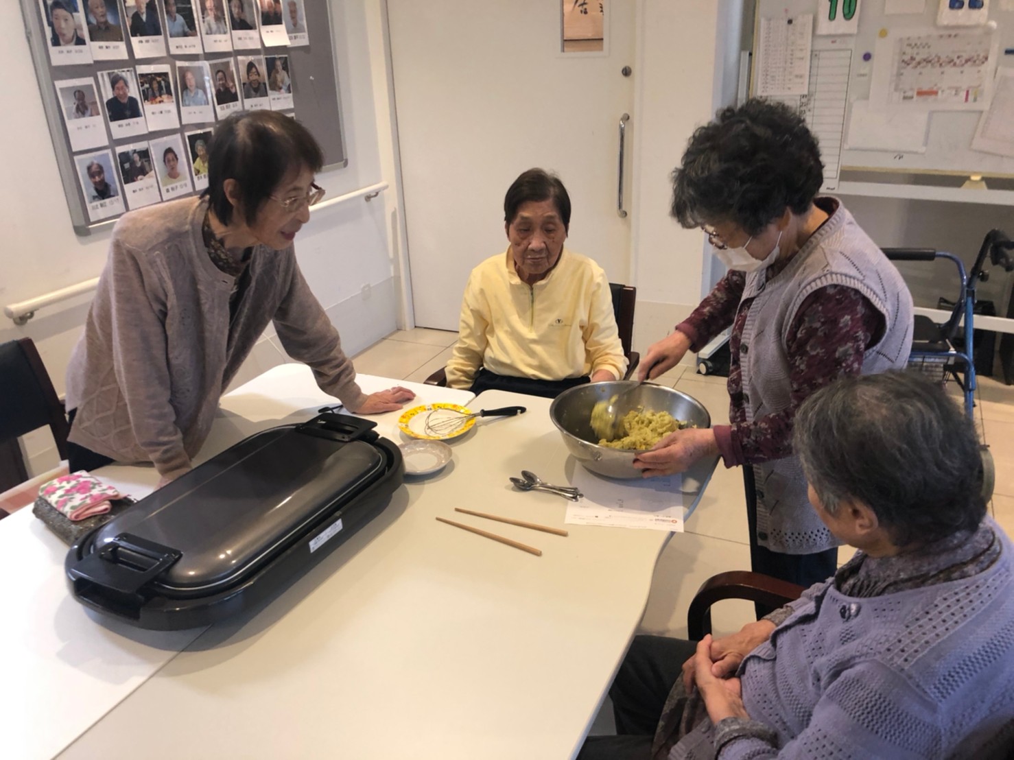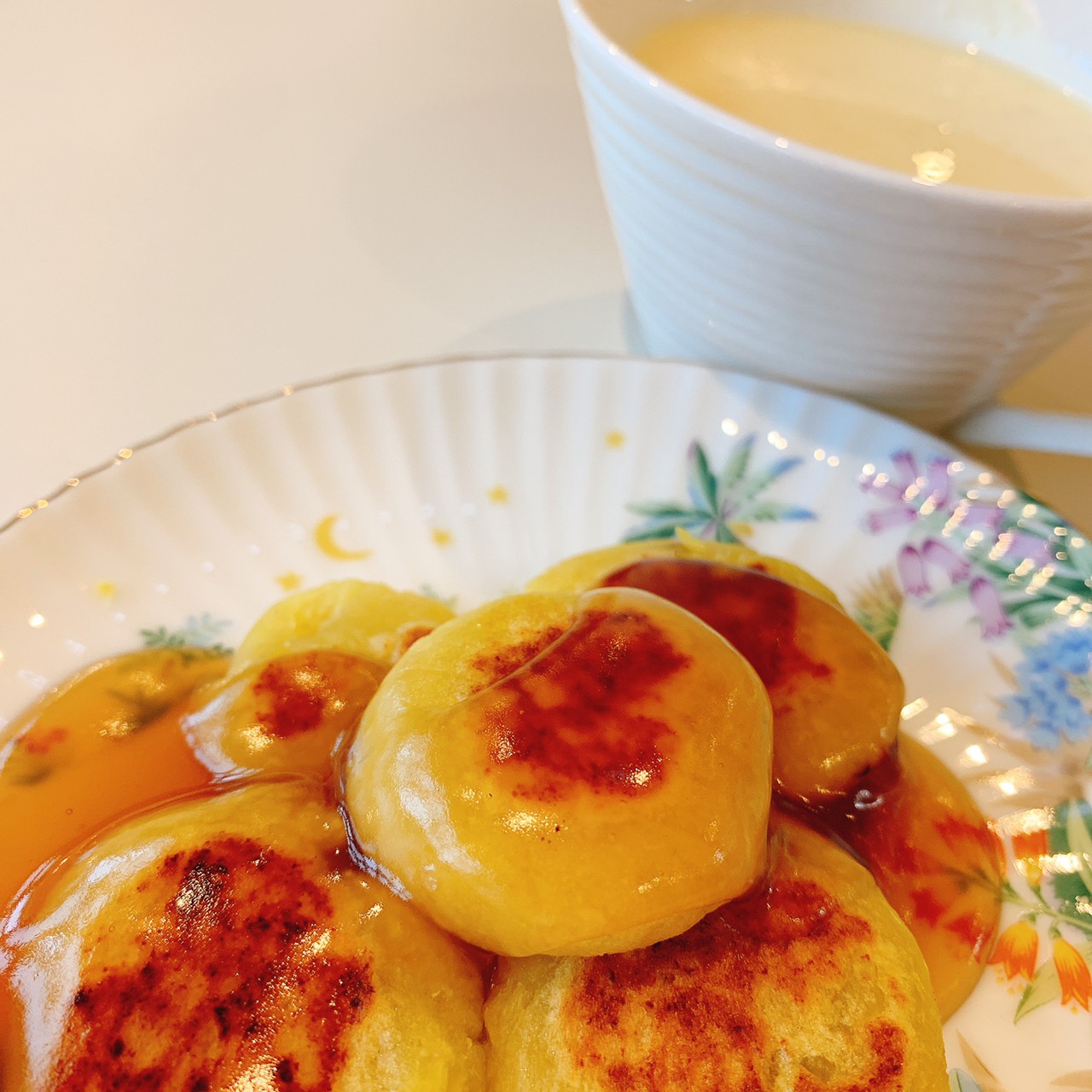 今日はお楽しみの手作りおやつの日(2日目)です。旬のさつまいもを使ったさつまいも餅とさつまいもスープで温まっていただきました。