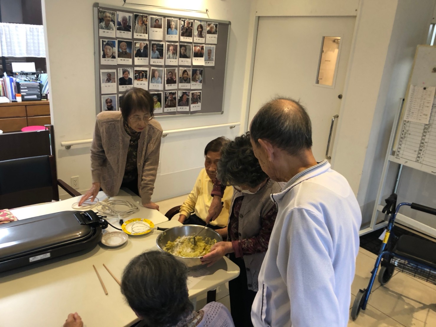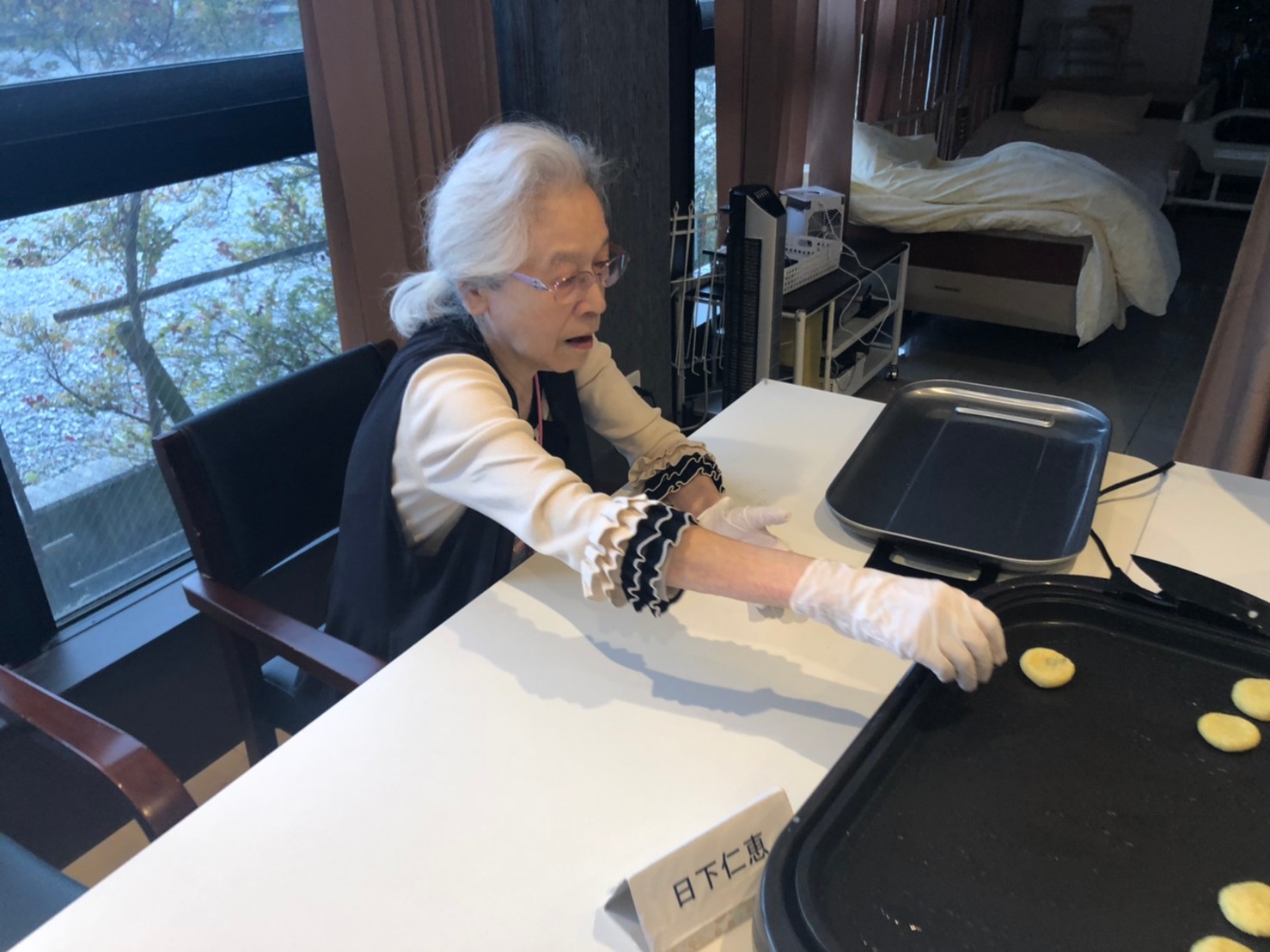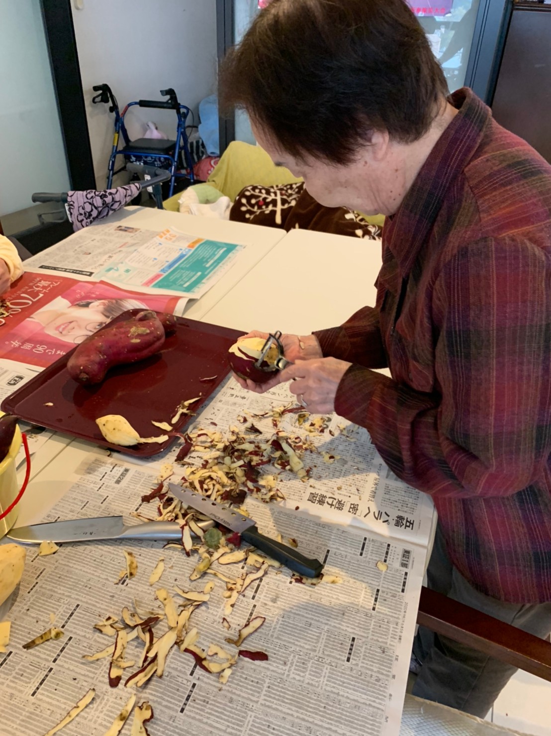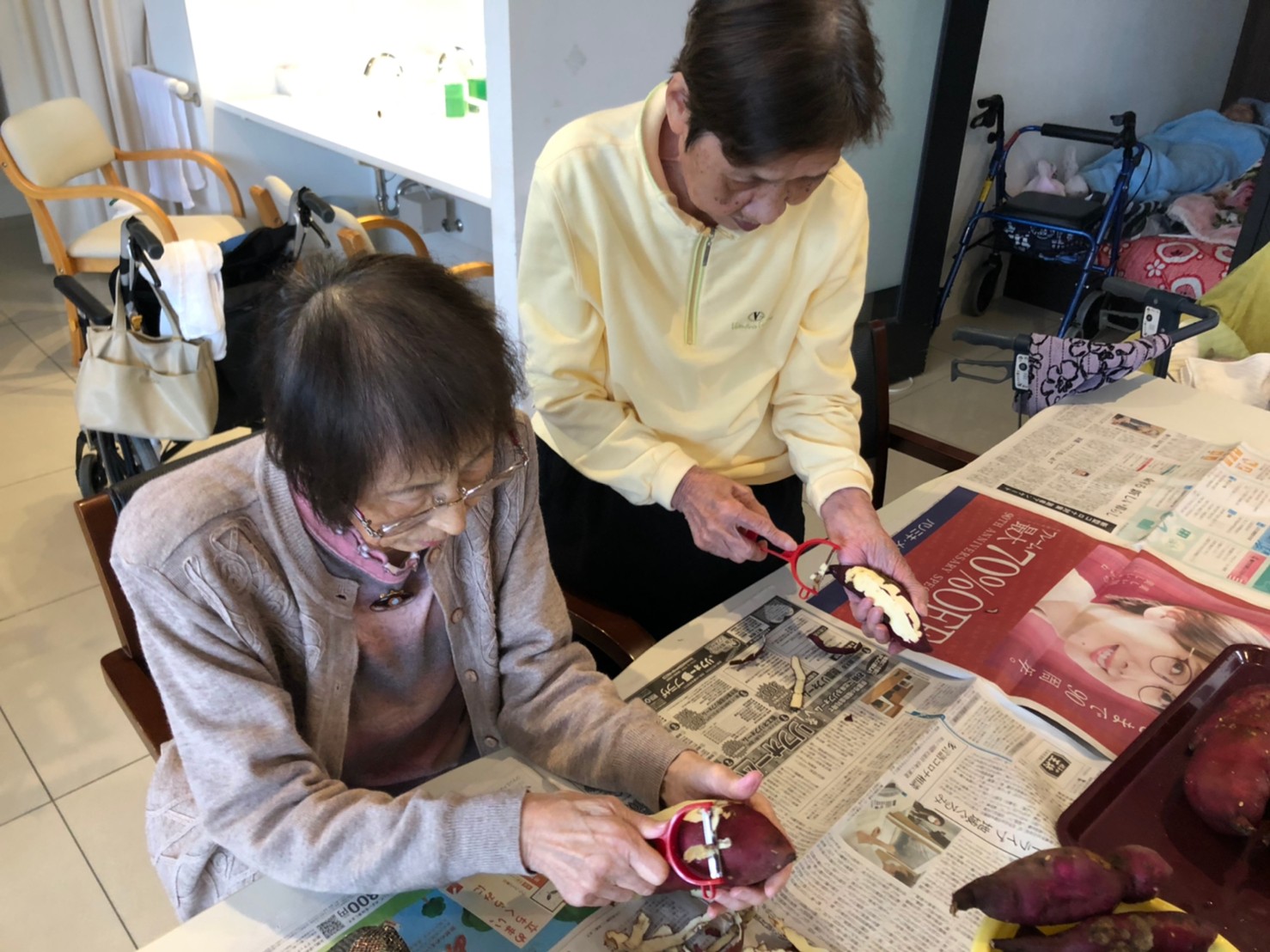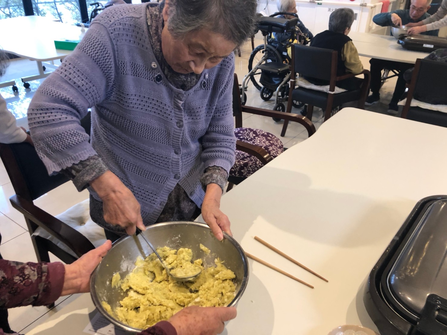 今日はお楽しみの手作りおやつの日(2日目)です。旬のさつまいもを使ったさつまいも餅とさつまいもスープで温まっていただきました。