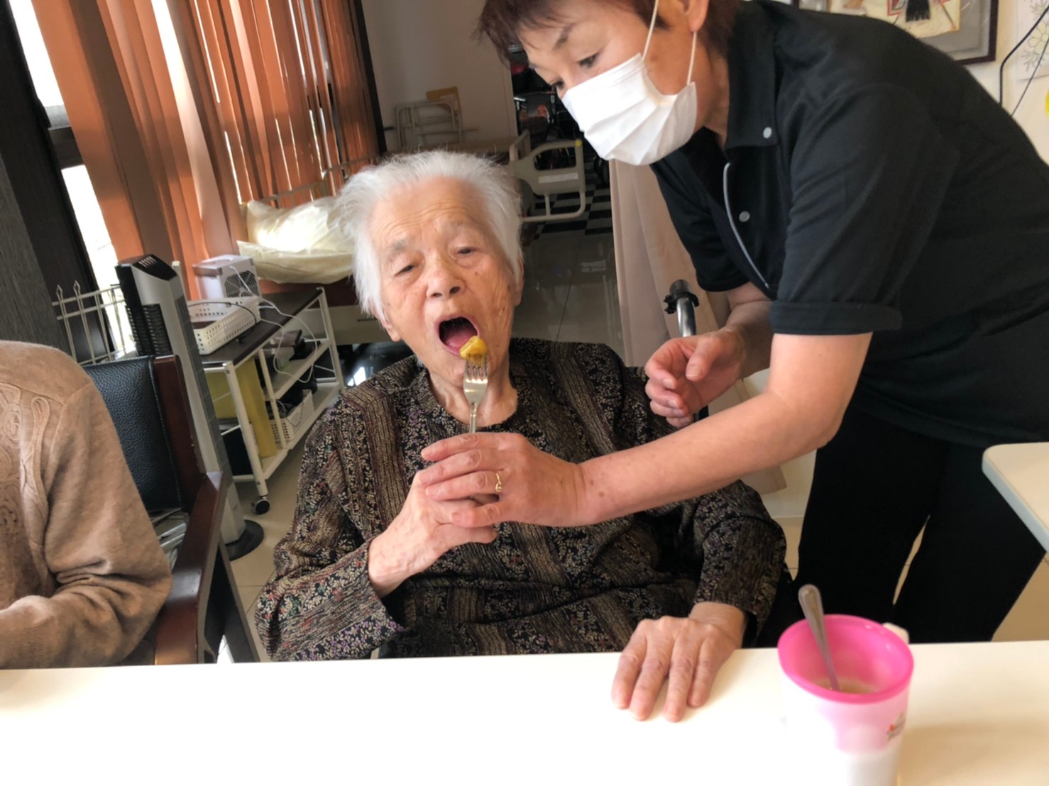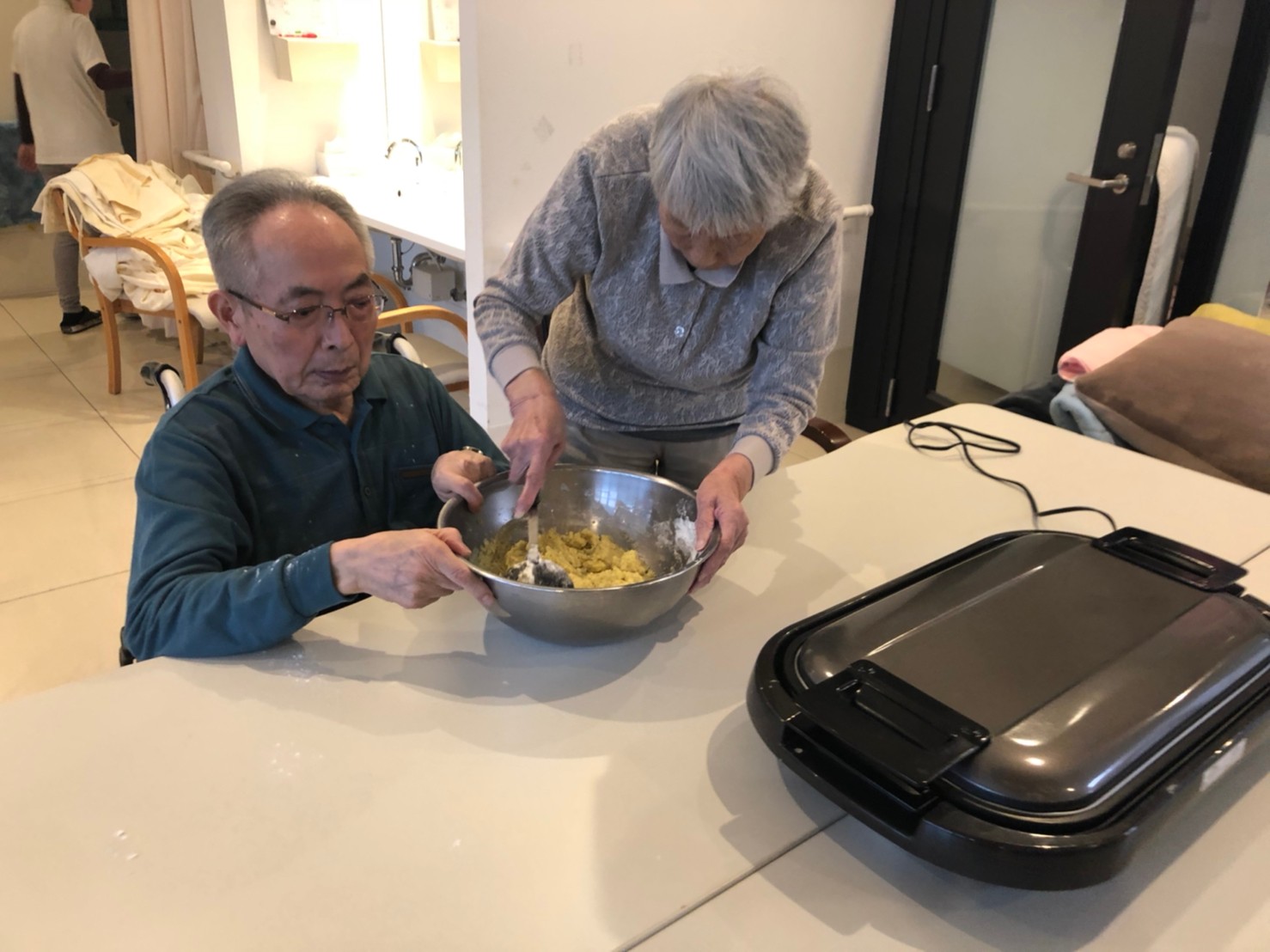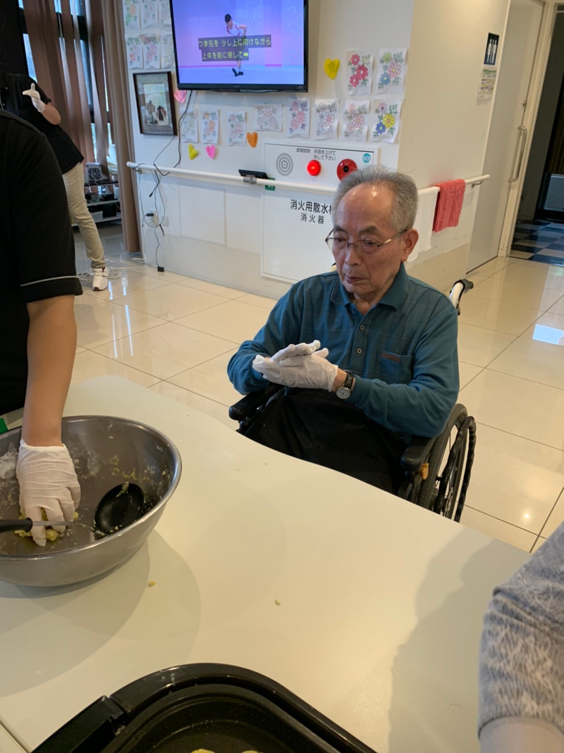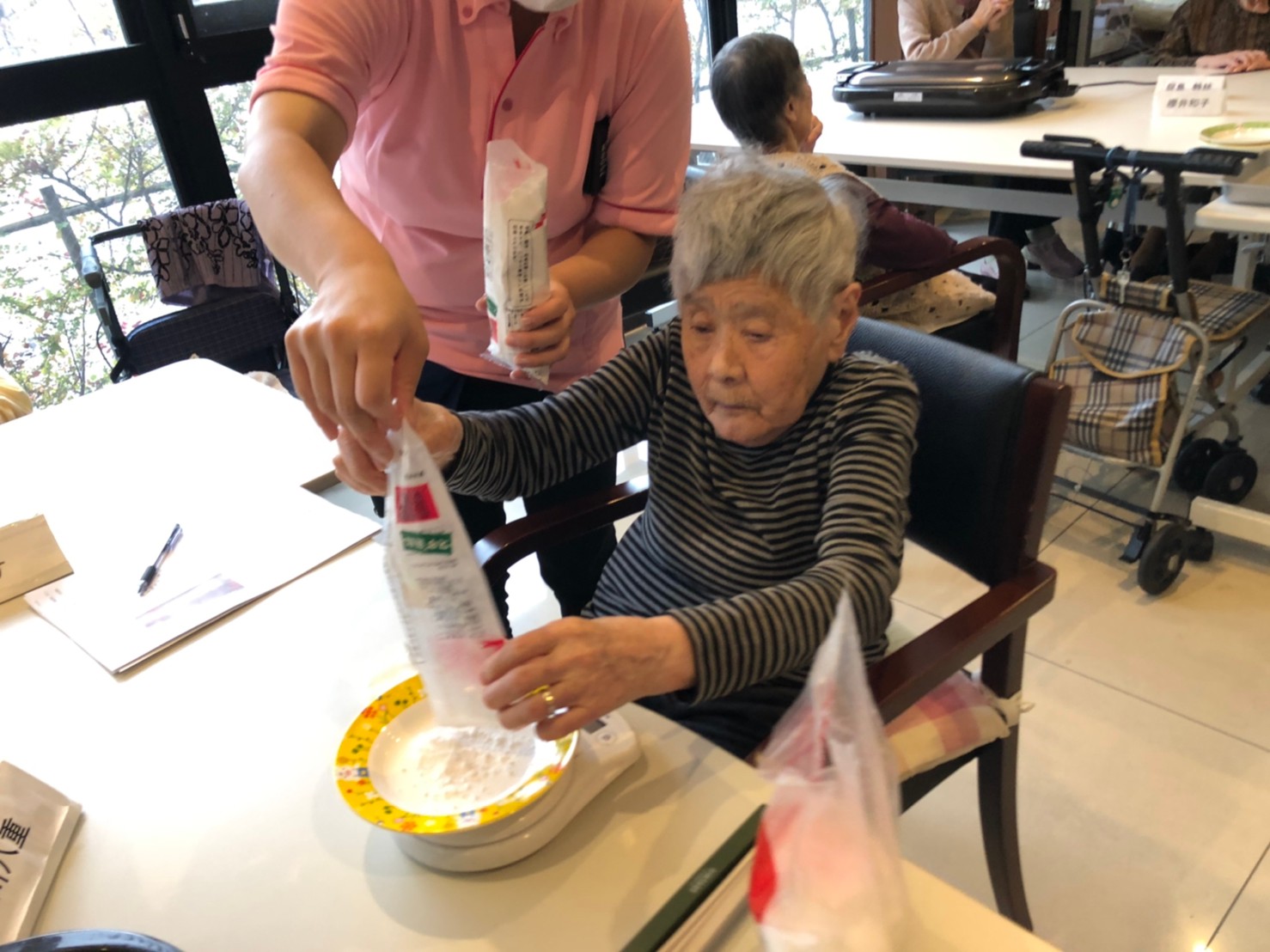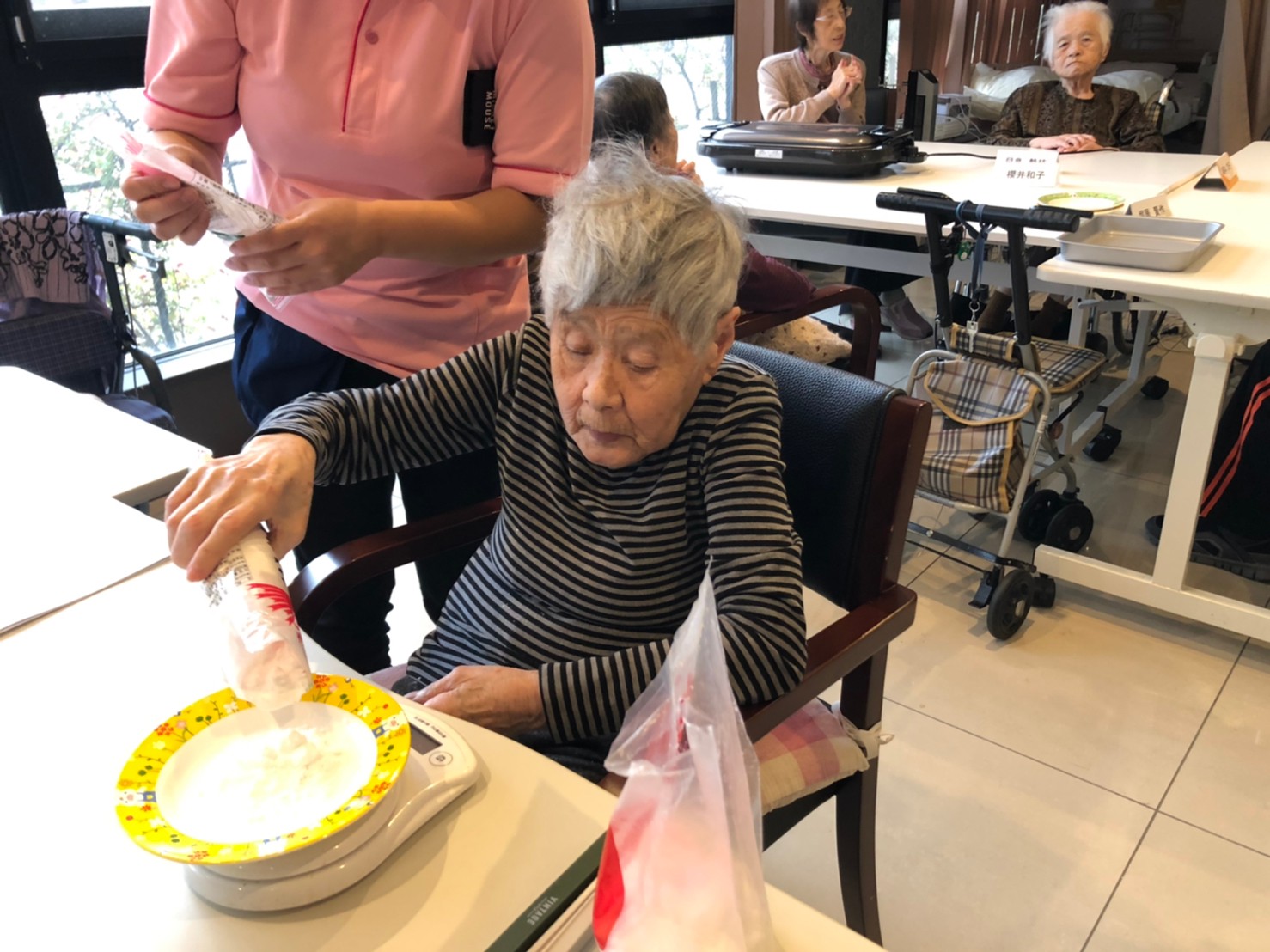 今日はお楽しみの手作りおやつの日(2日目)です。旬のさつまいもを使ったさつまいも餅とさつまいもスープで温まっていただきました。