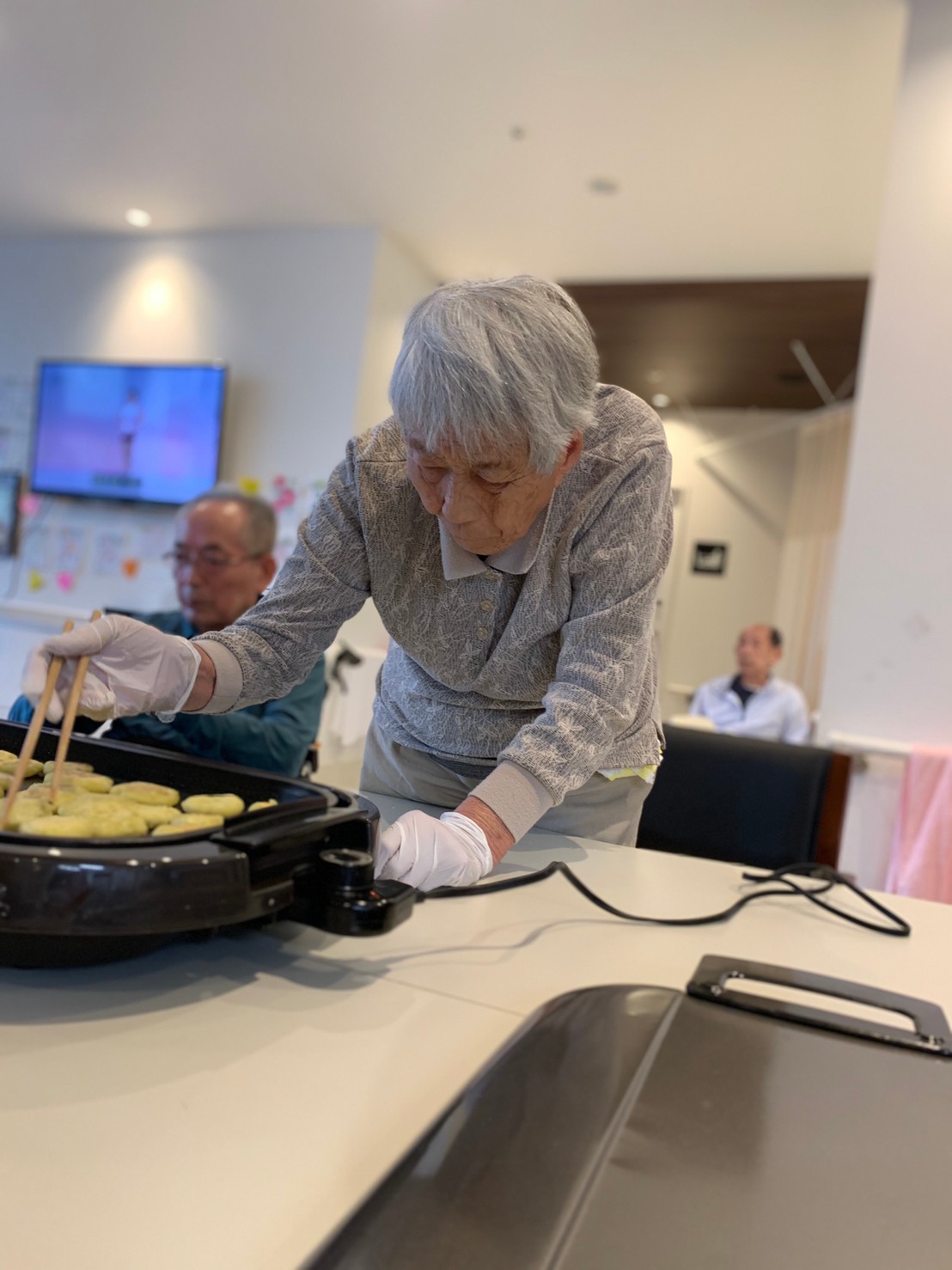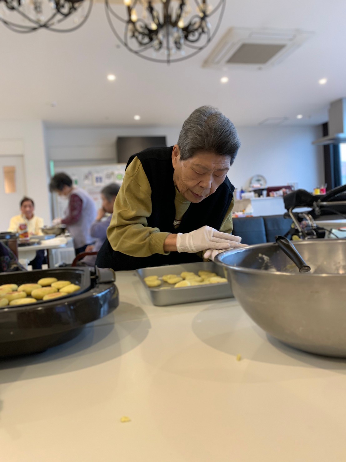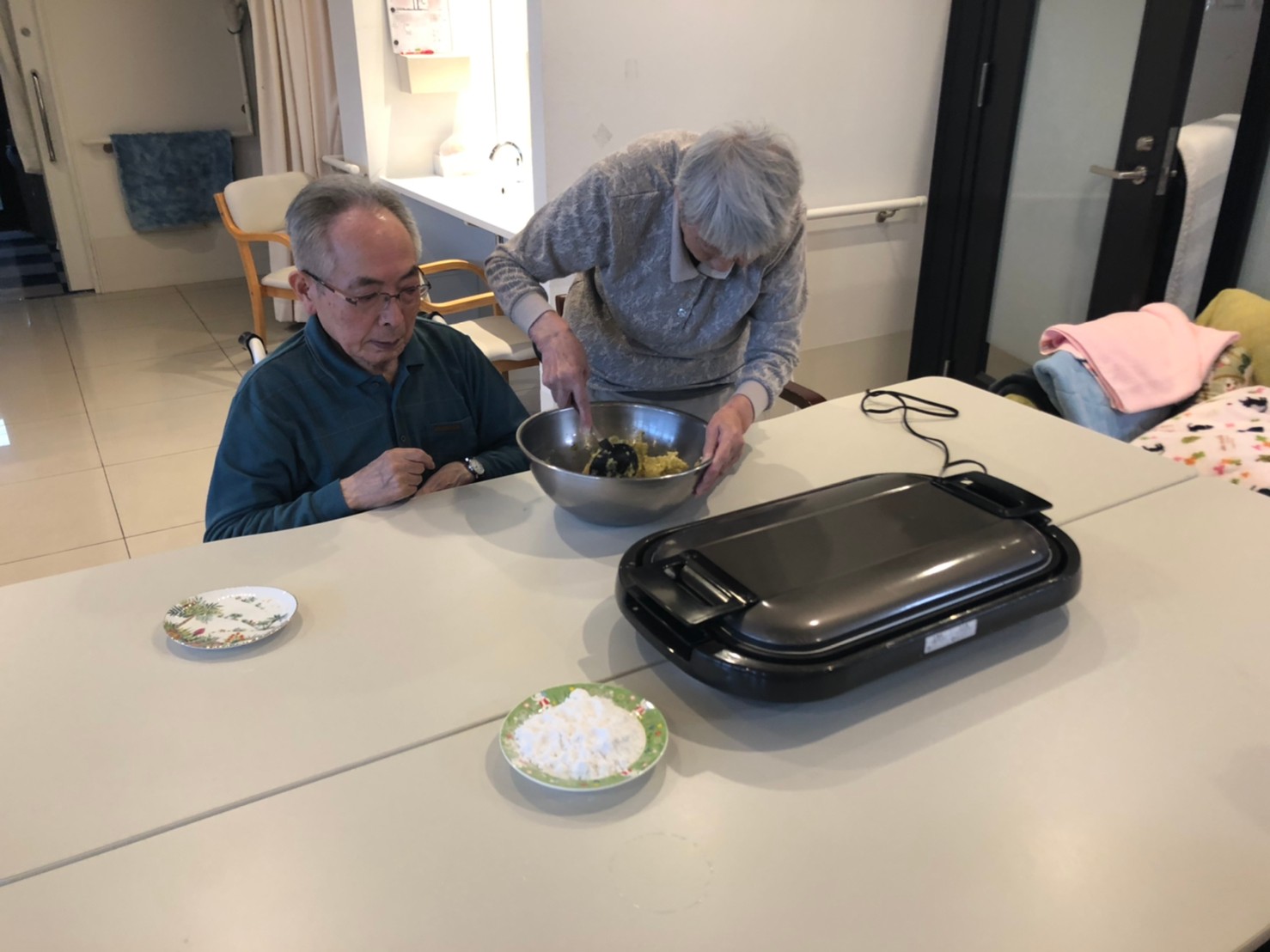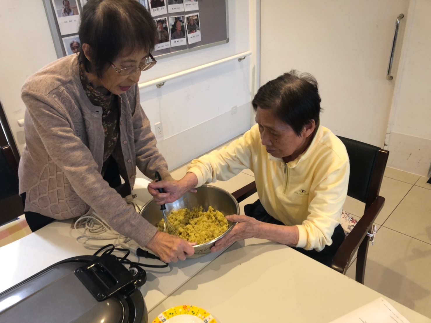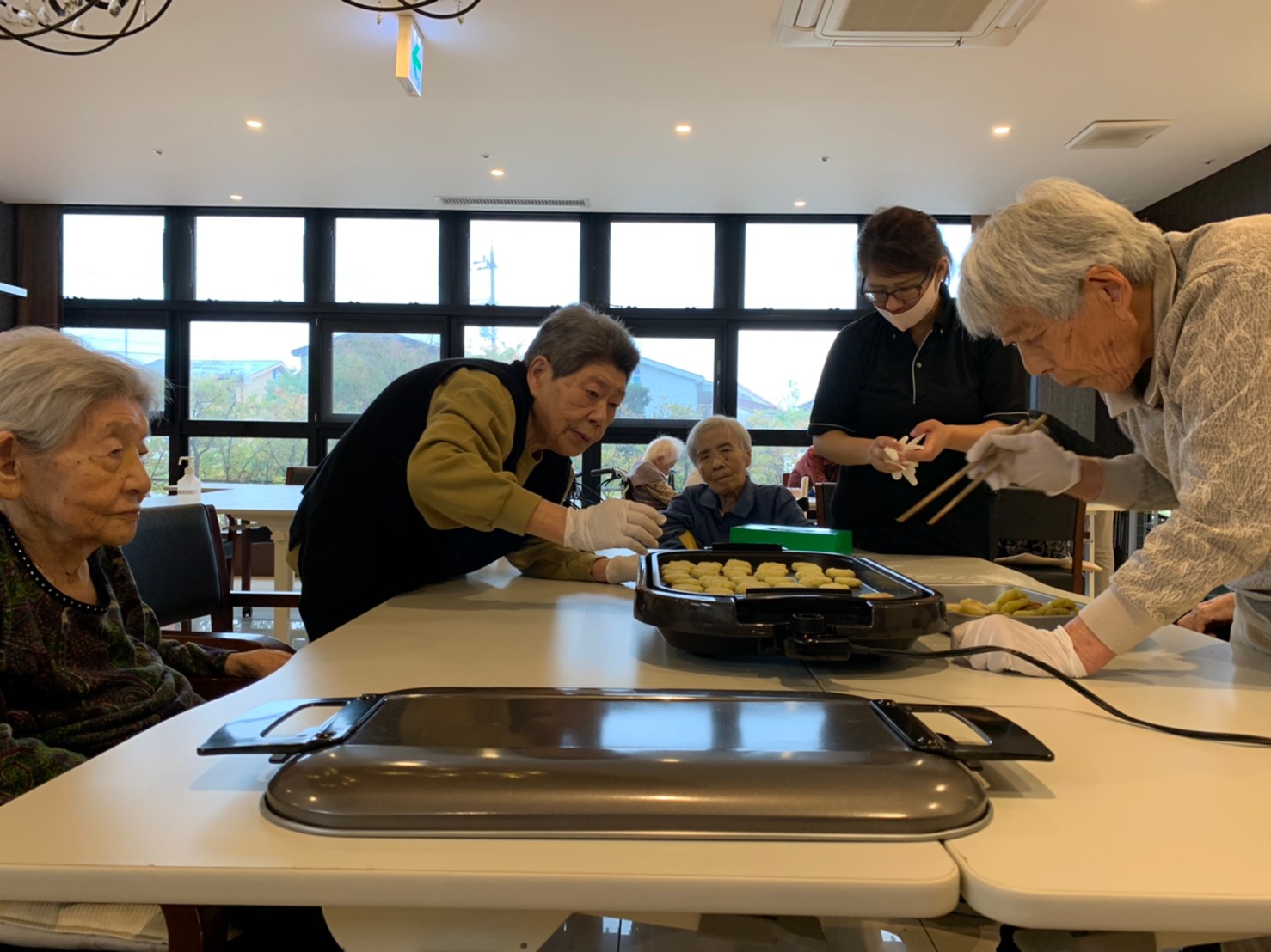 今日はお楽しみの手作りおやつの日(2日目)です。旬のさつまいもを使ったさつまいも餅とさつまいもスープで温まっていただきました。
