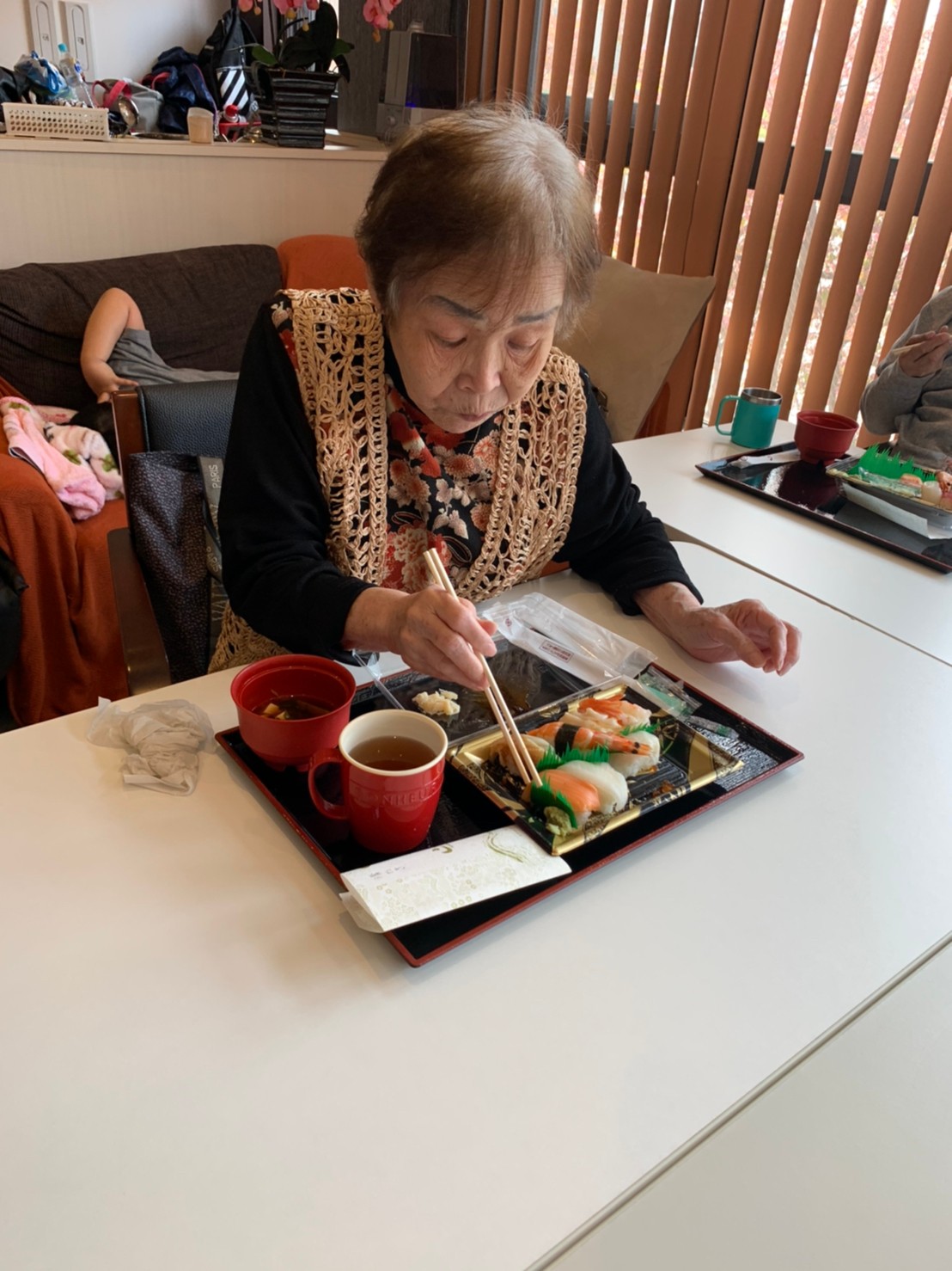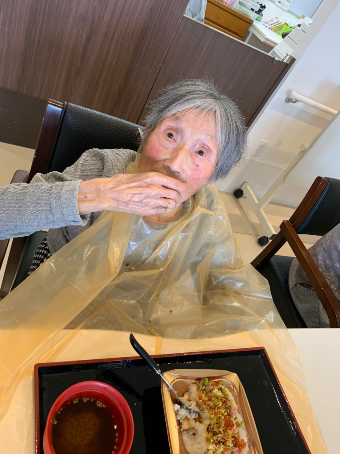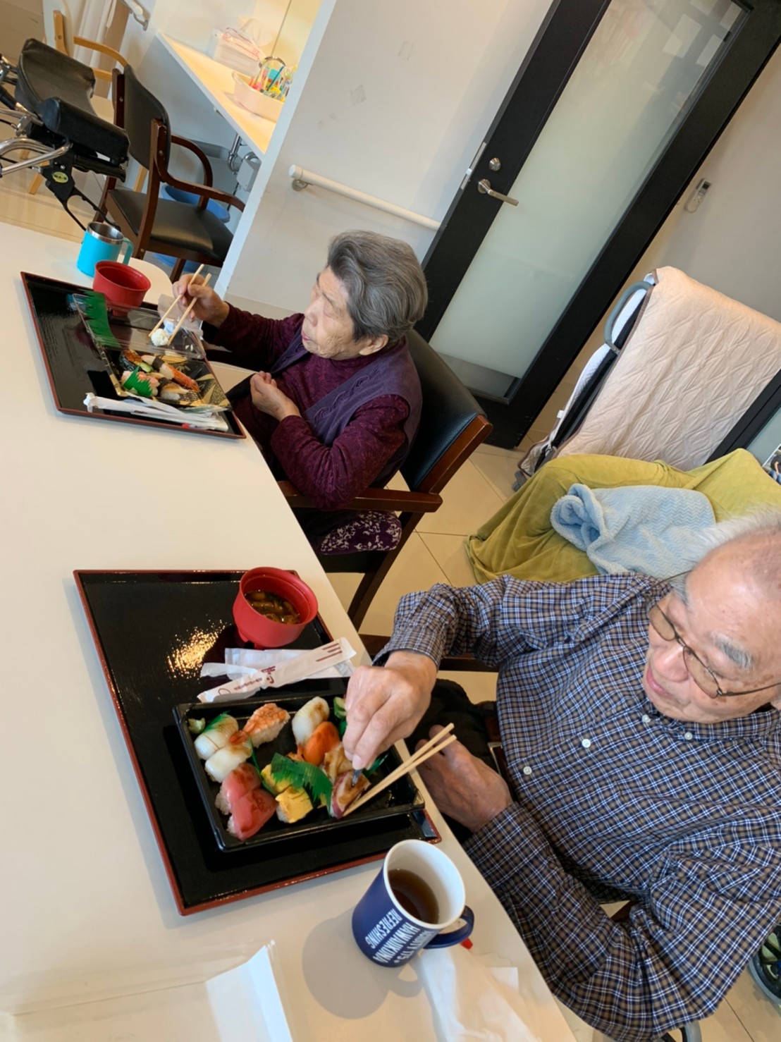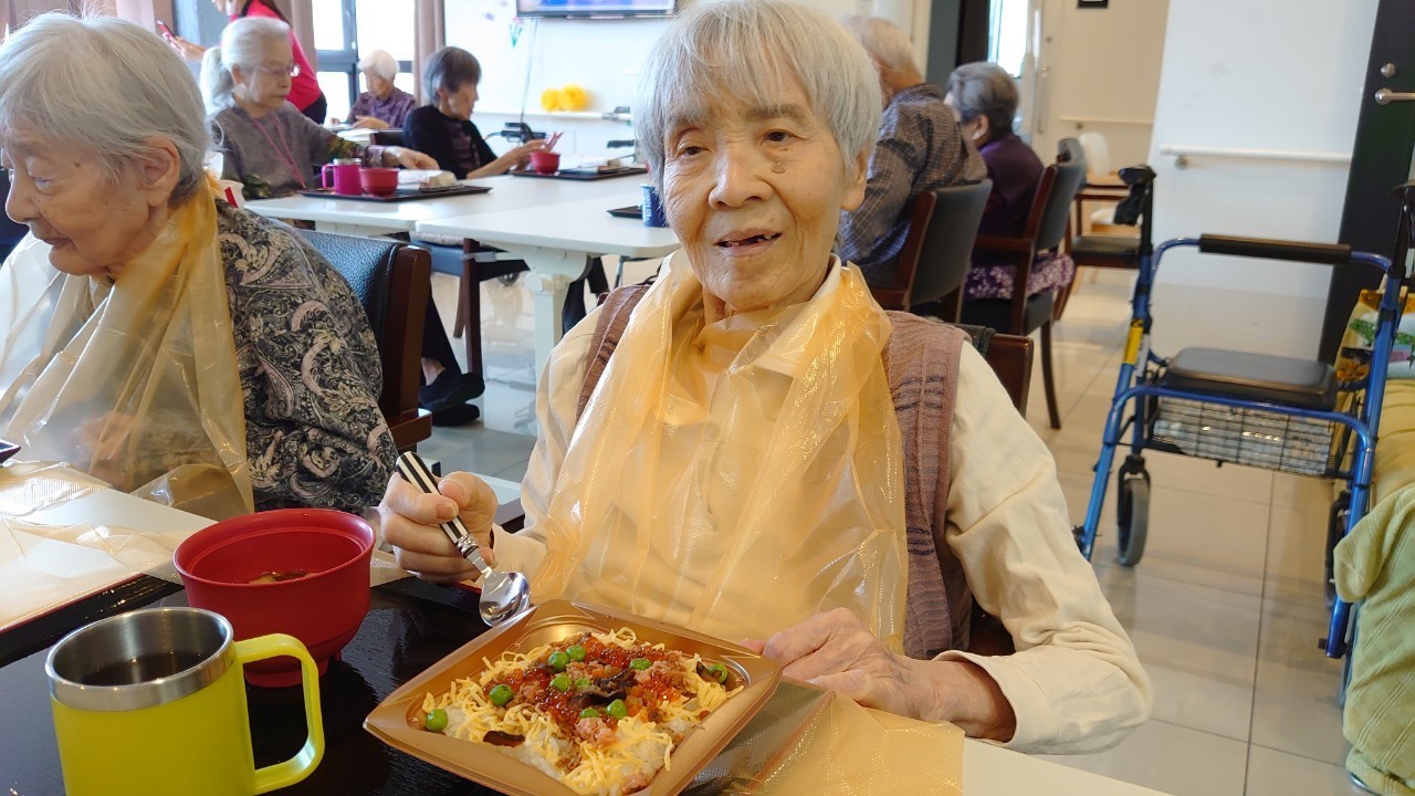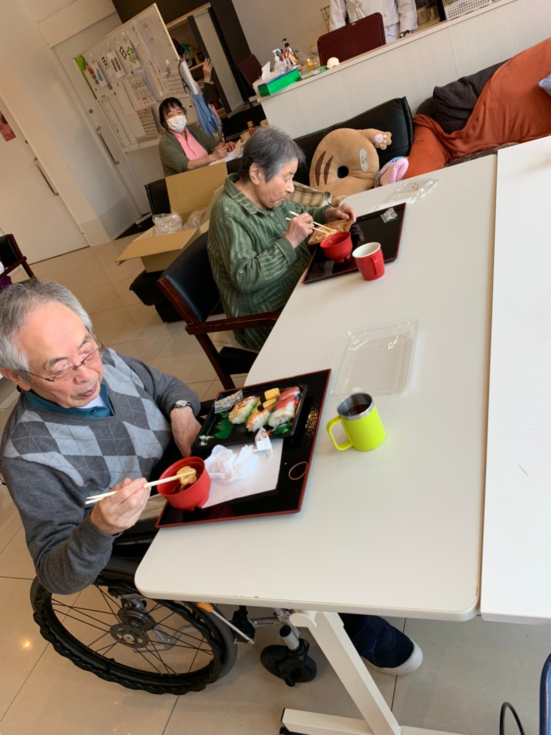 お寿司をほおばる利用者さまも普段の食事と違って