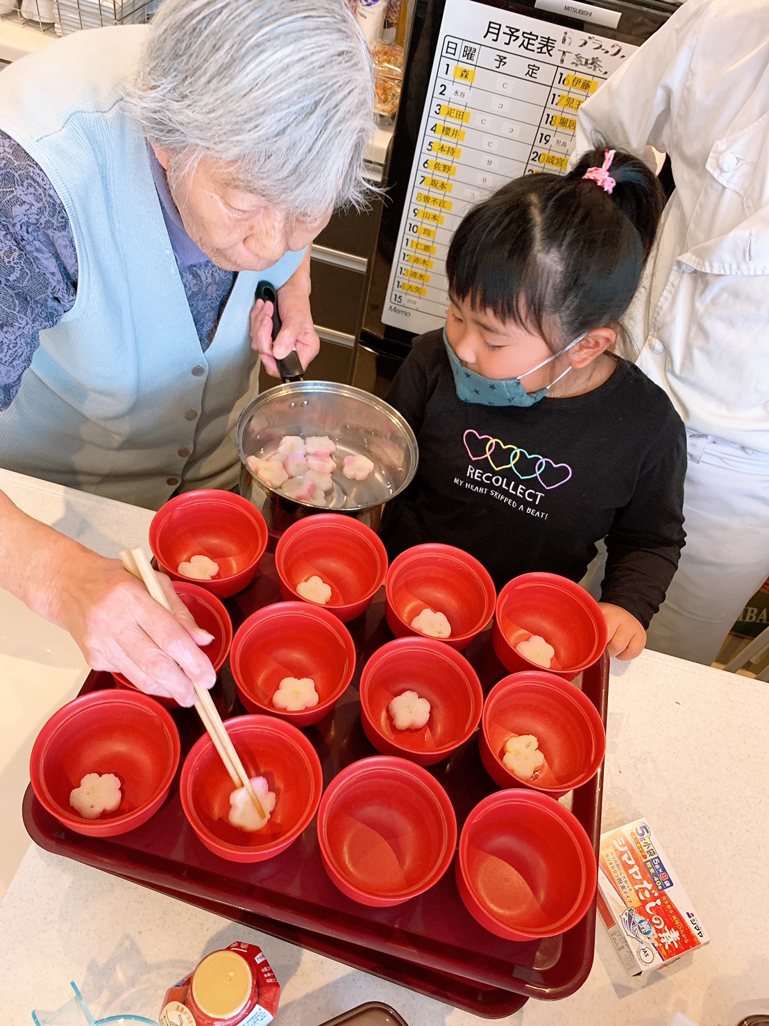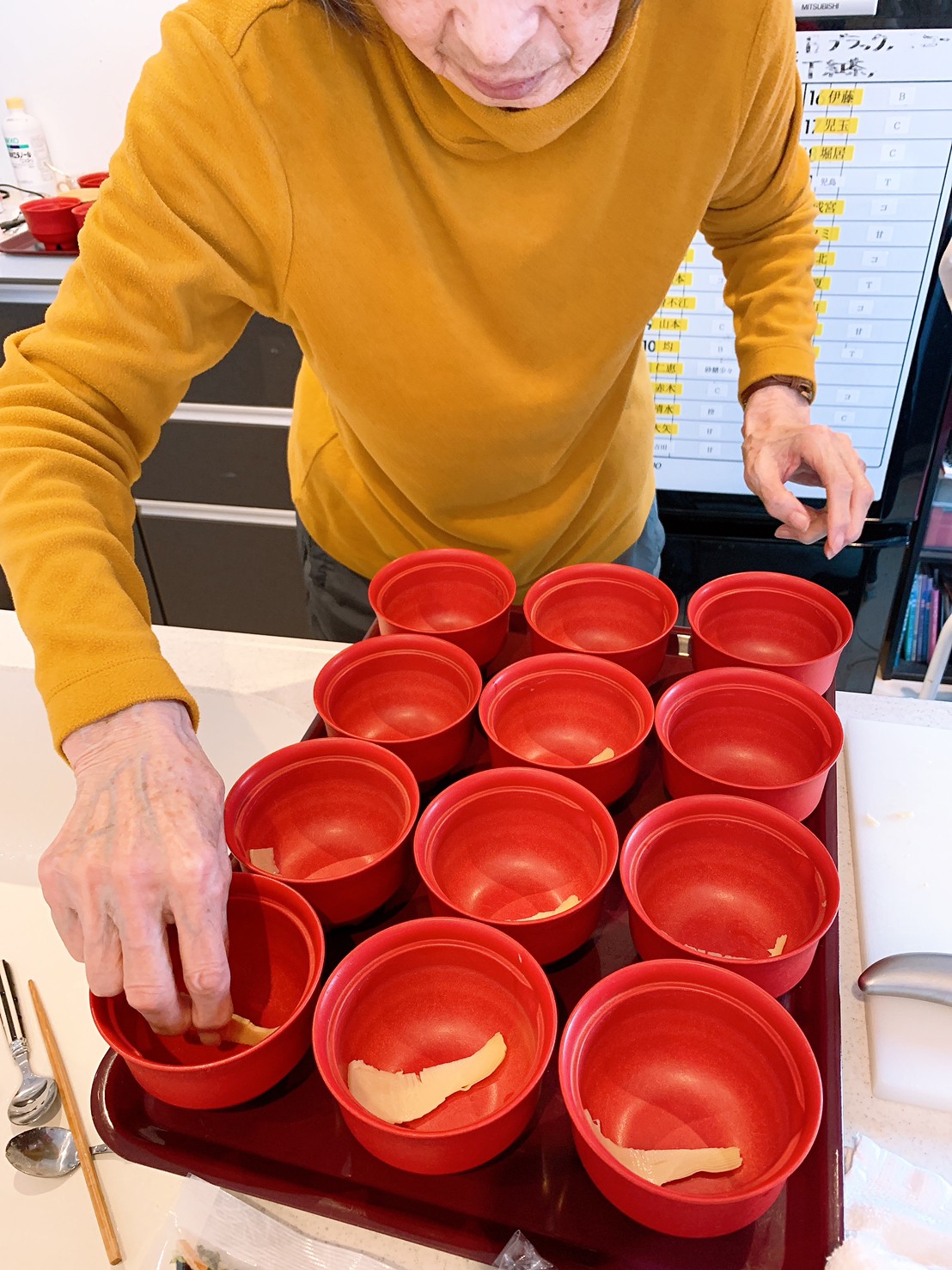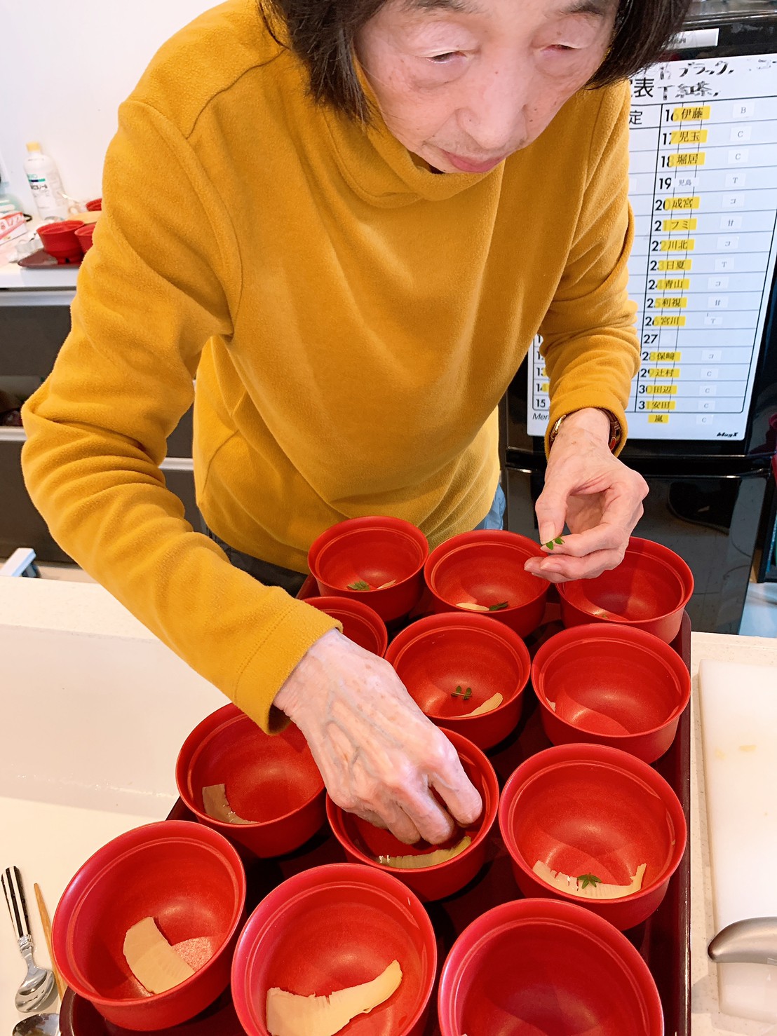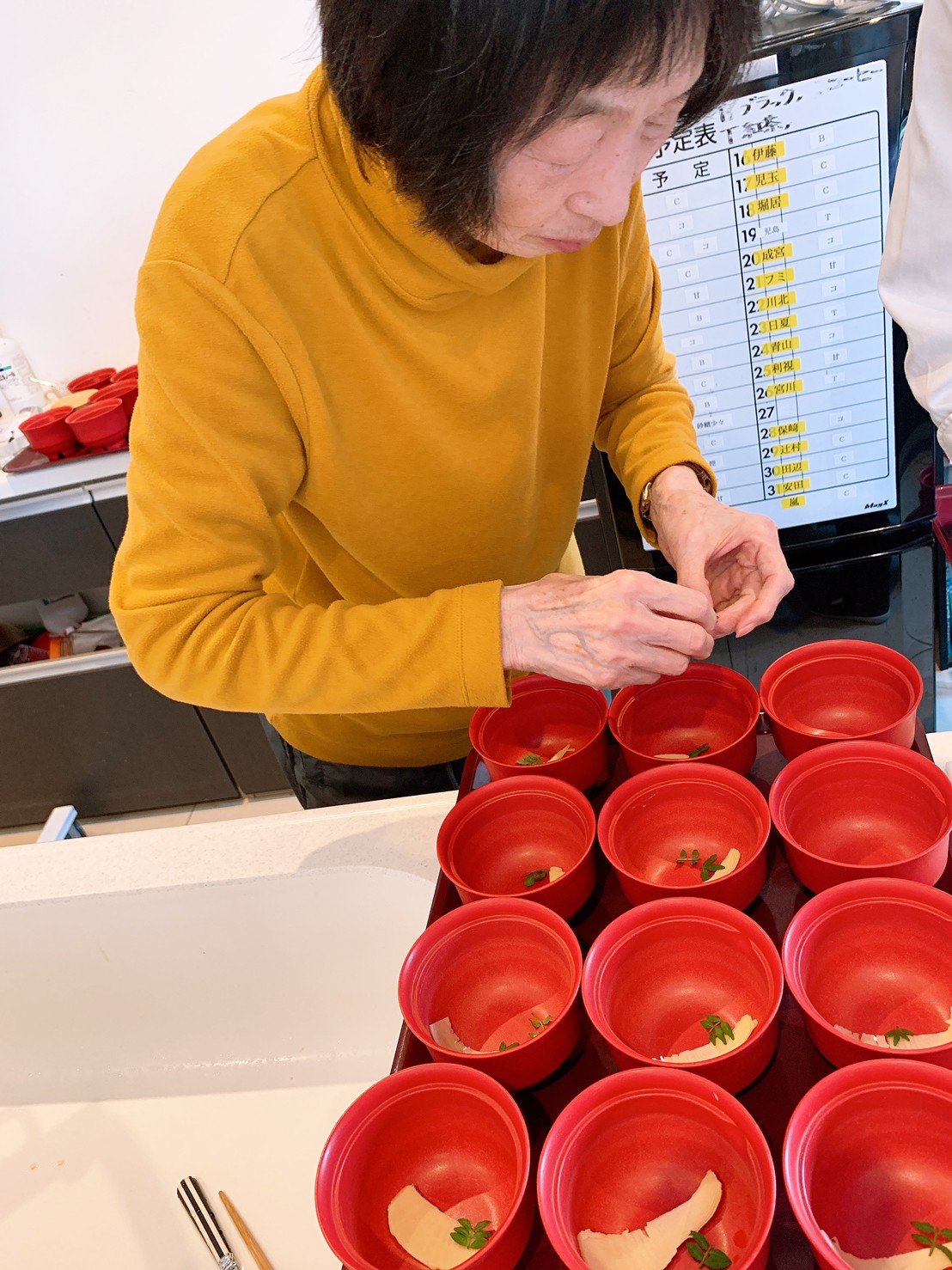 豆腐を切ったり、三つ葉刻んだり、花麩を盛り付けて