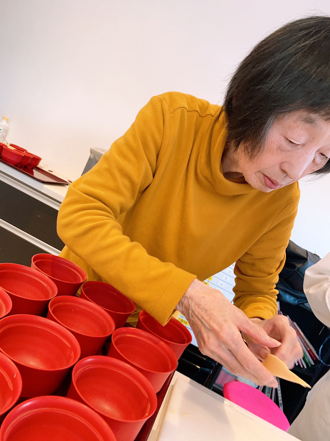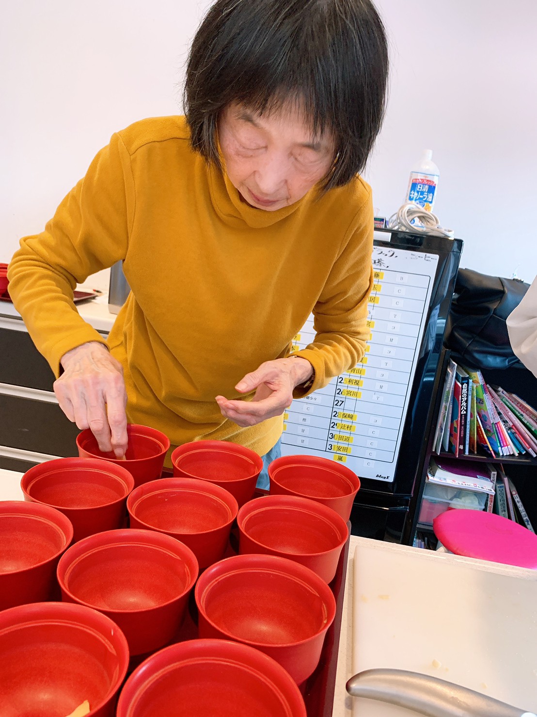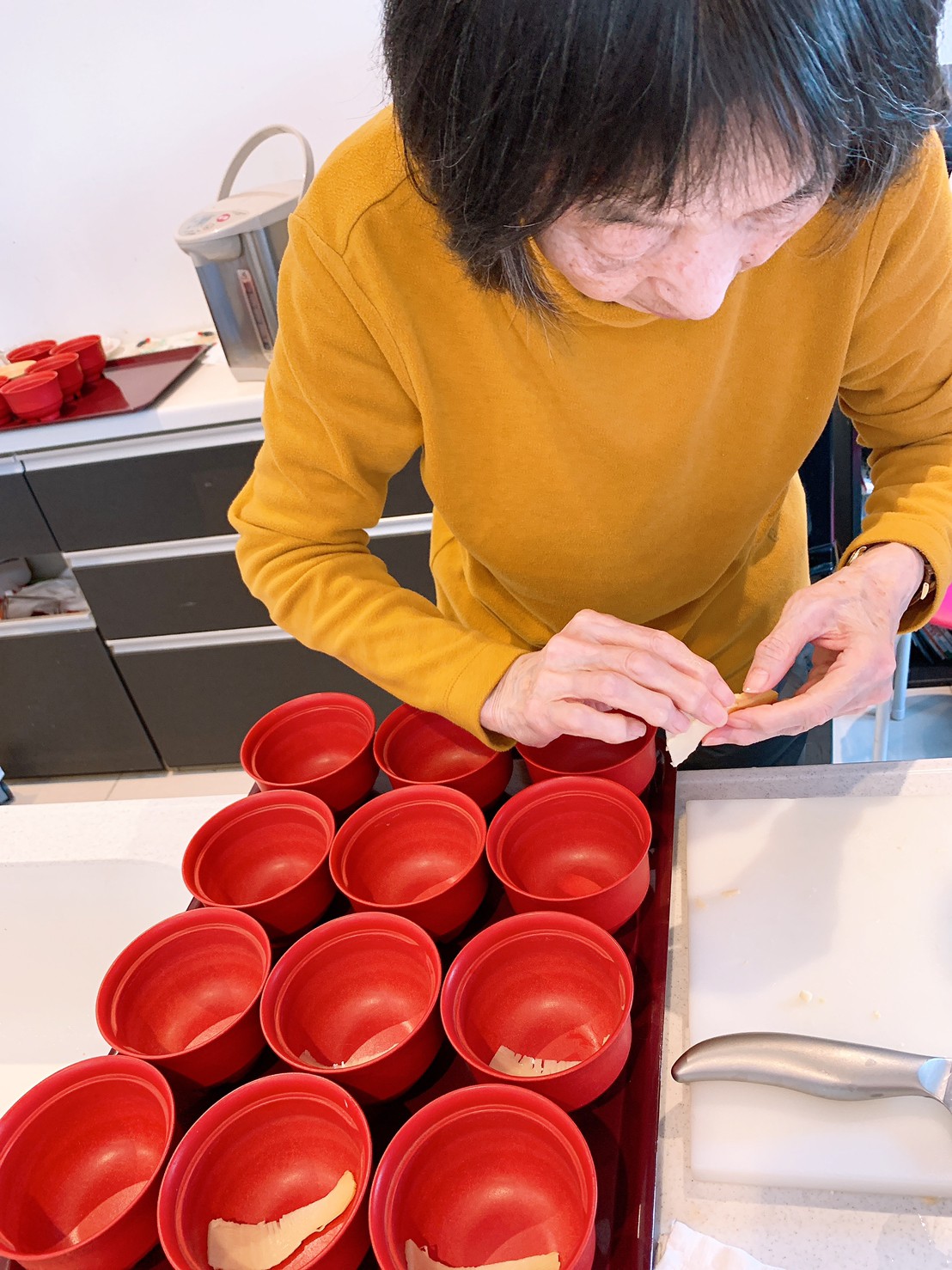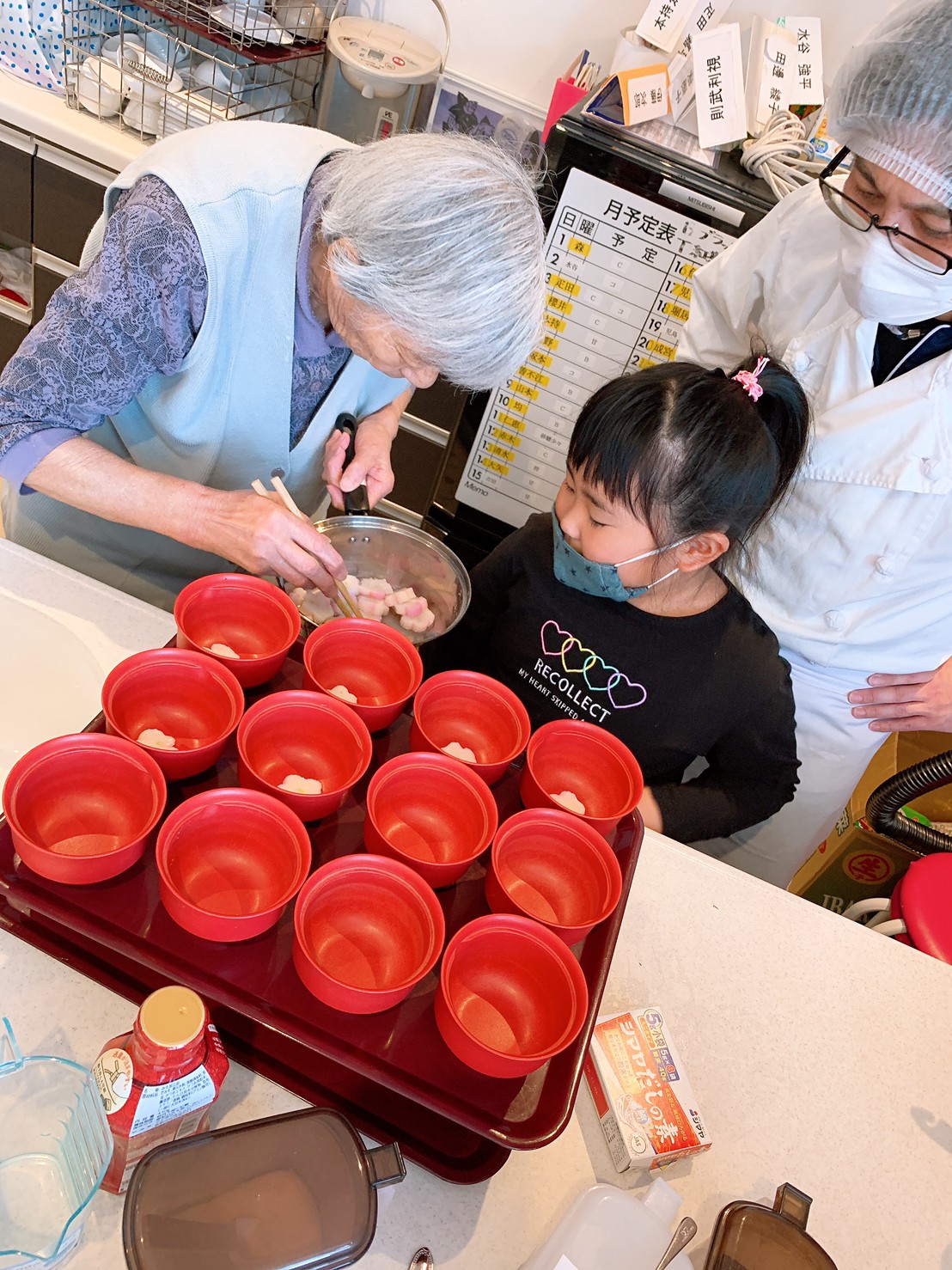 豆腐を切ったり、三つ葉刻んだり、花麩を盛り付けて