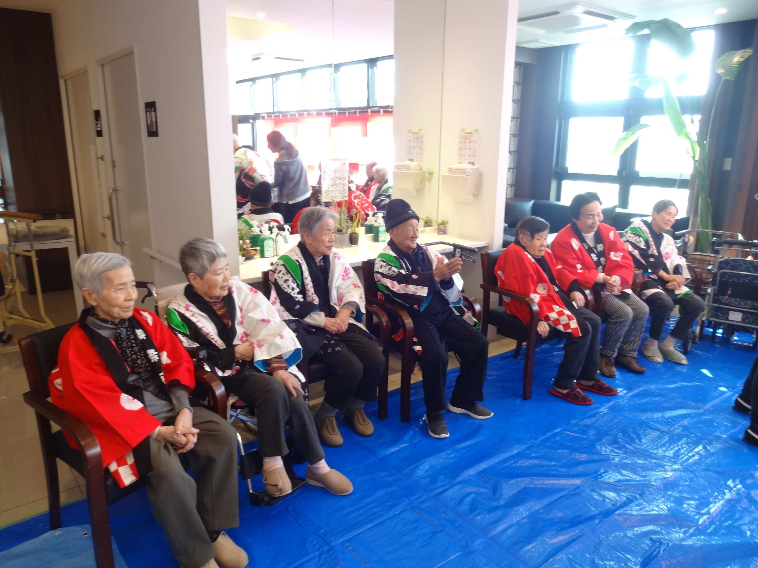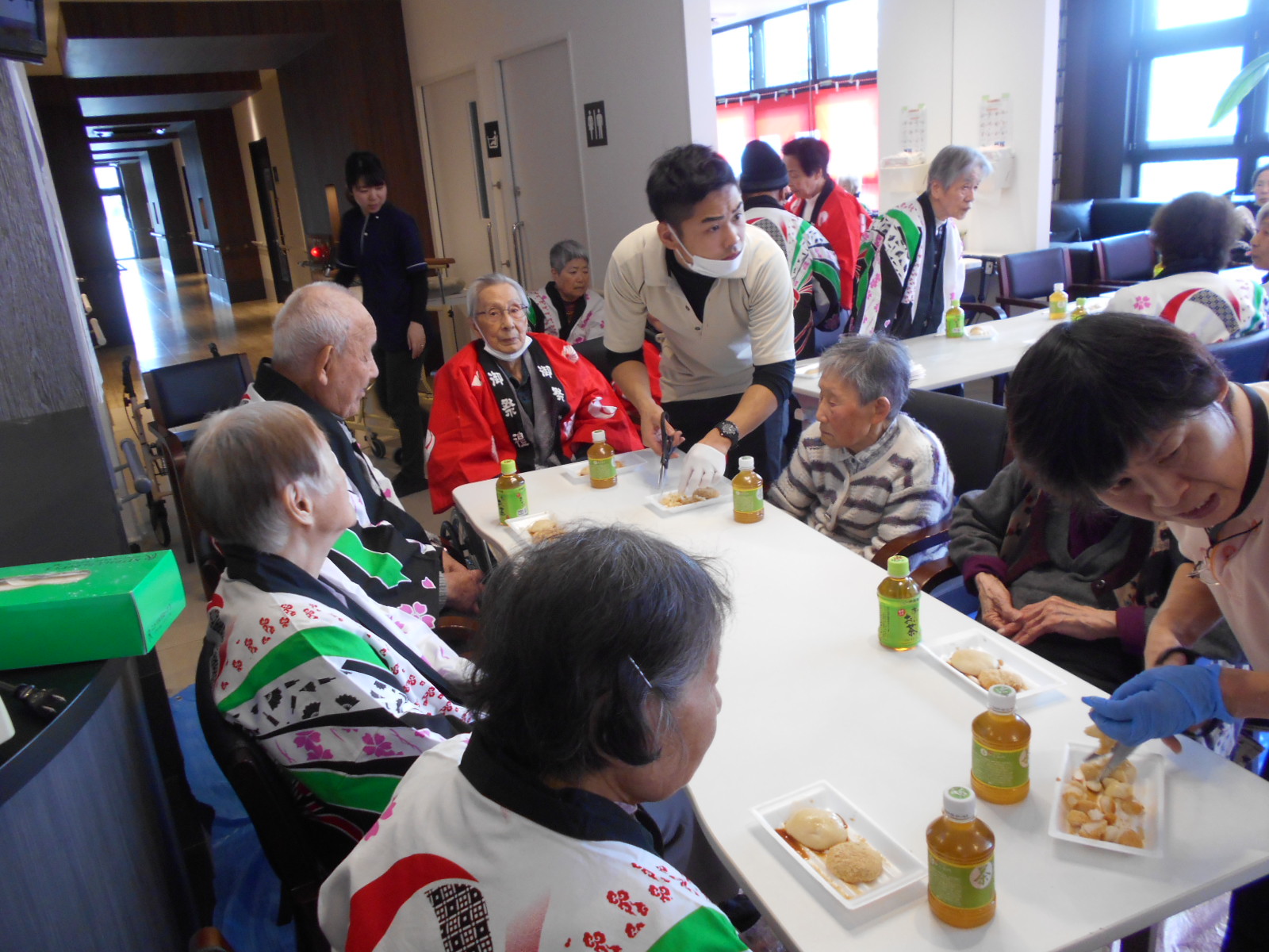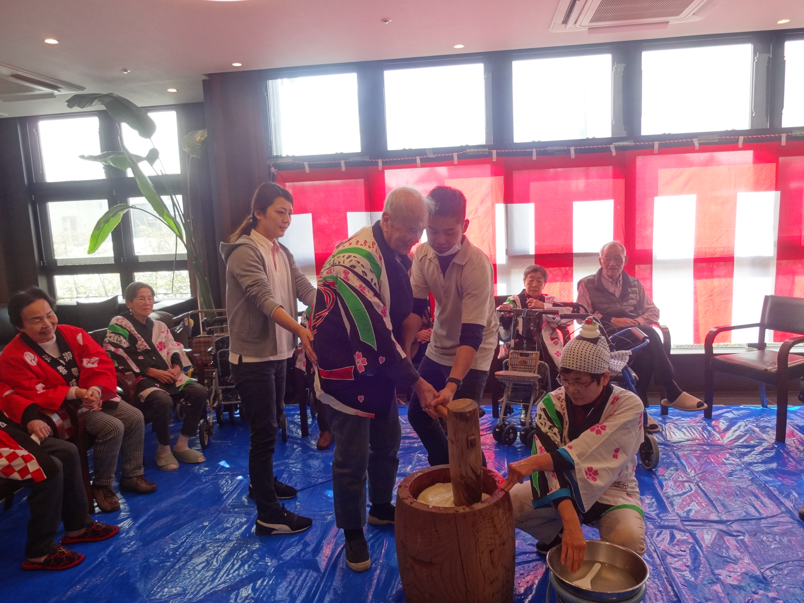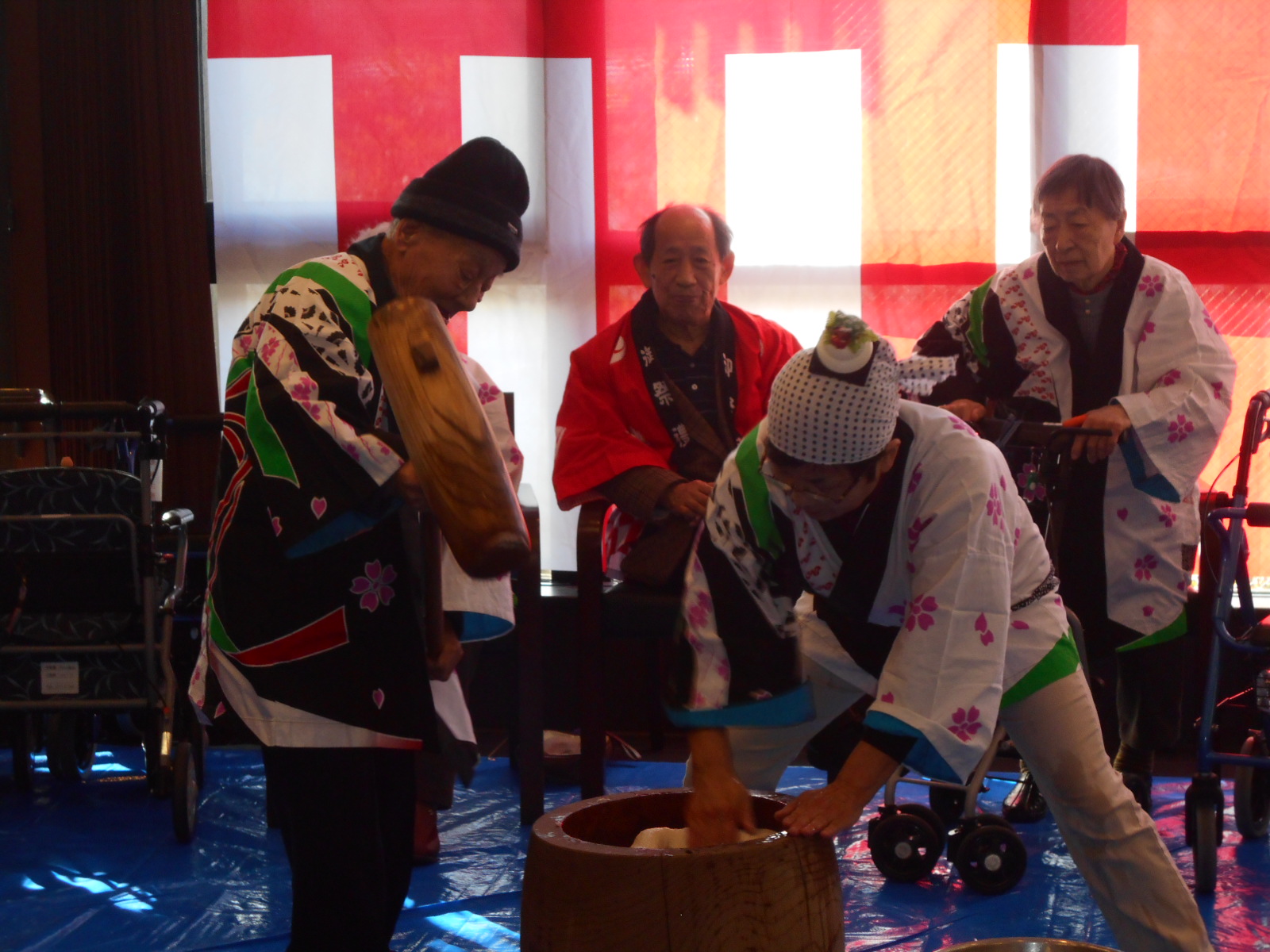 利用者の方にもお餅をついて頂き、皆様とても大きな声で「ヨイショー」の掛け声をかけて頂きました 🙂