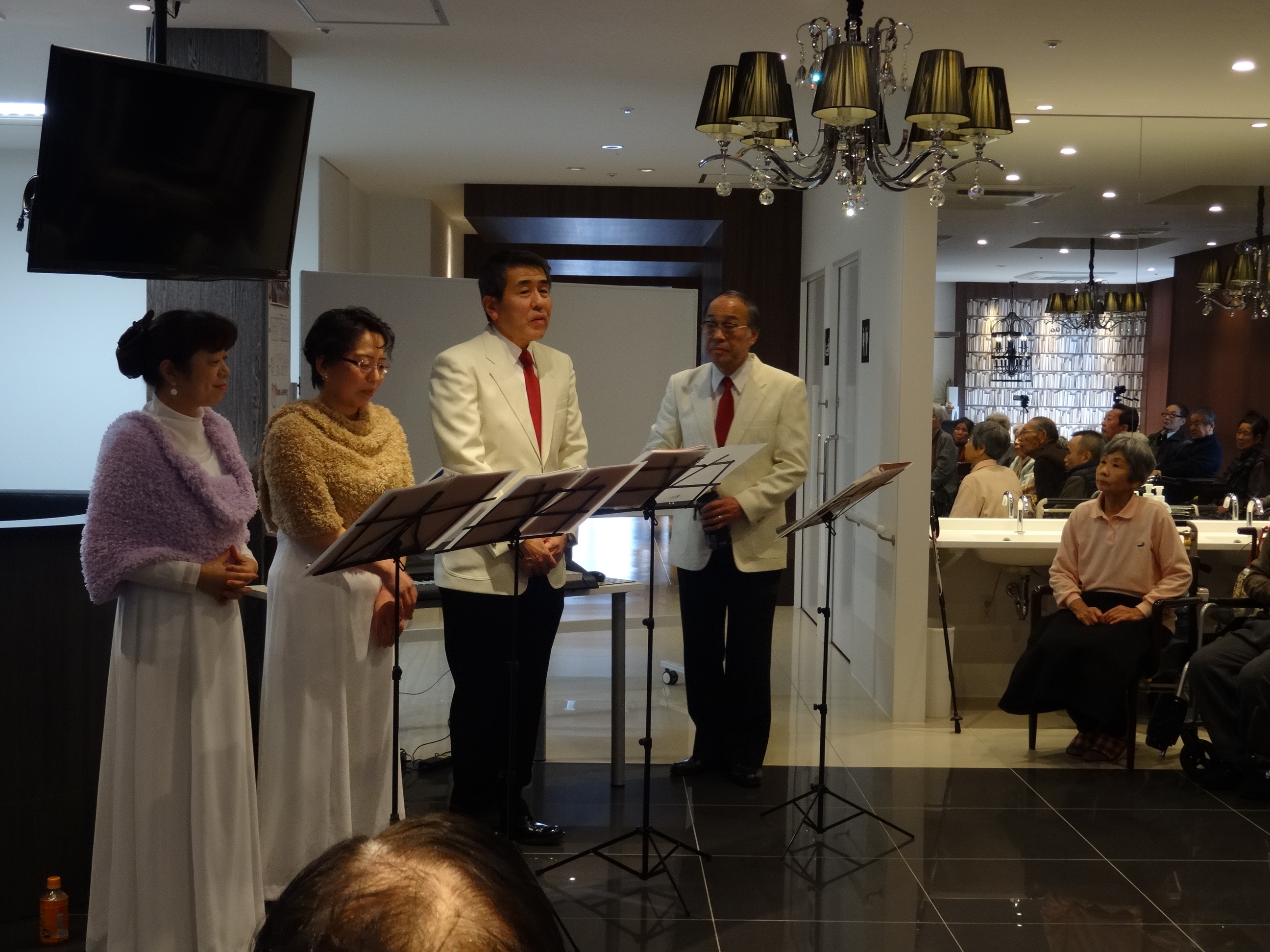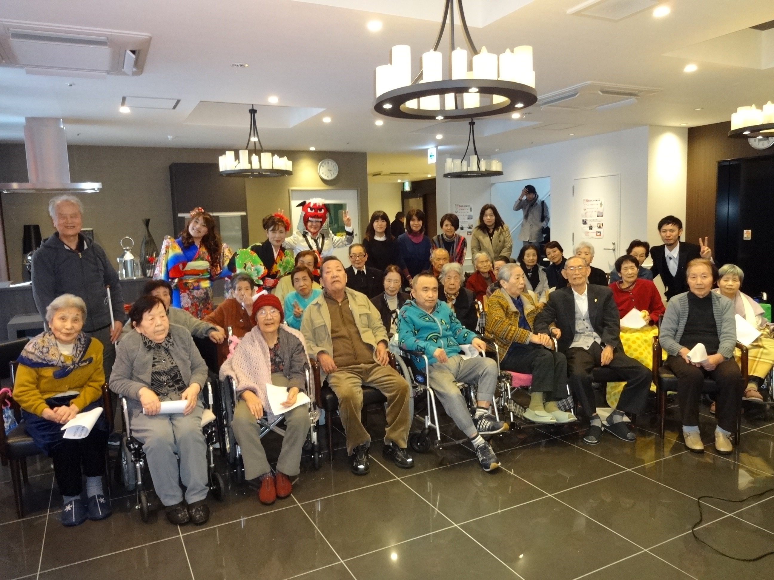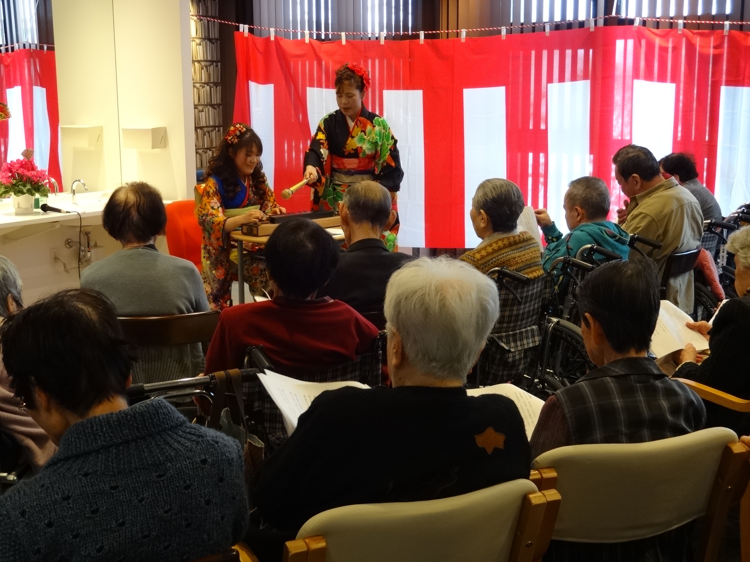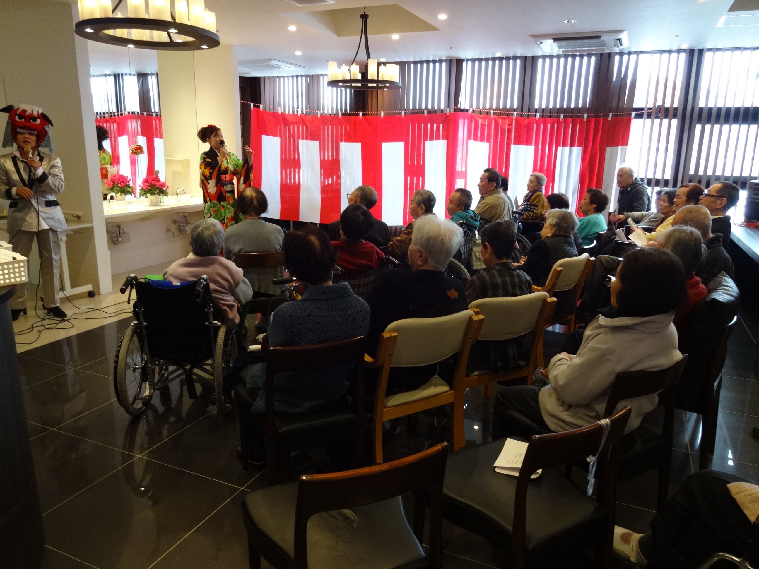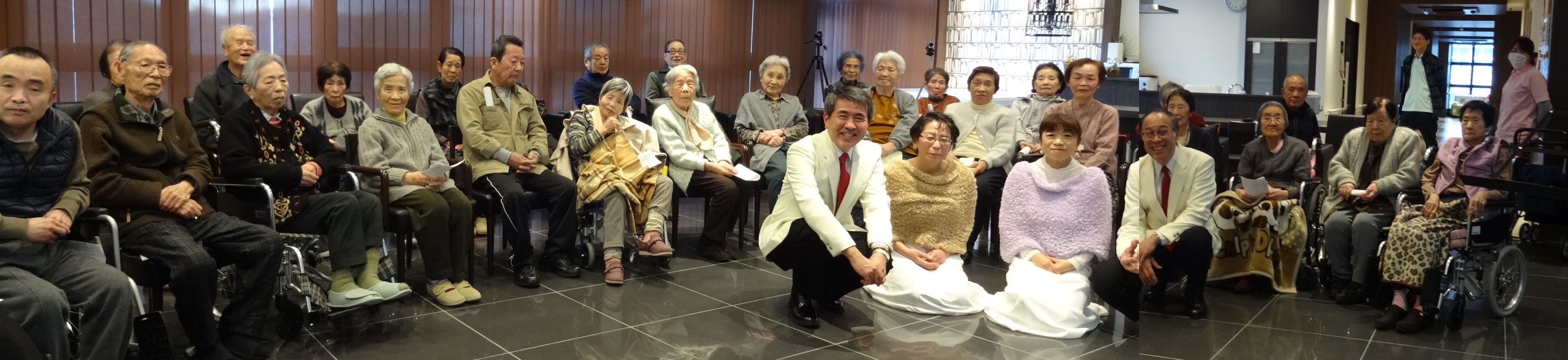 食事の後は、職員による「新春歌謡ショー」。入居者のみなさまの素敵な笑顔に包まれました。