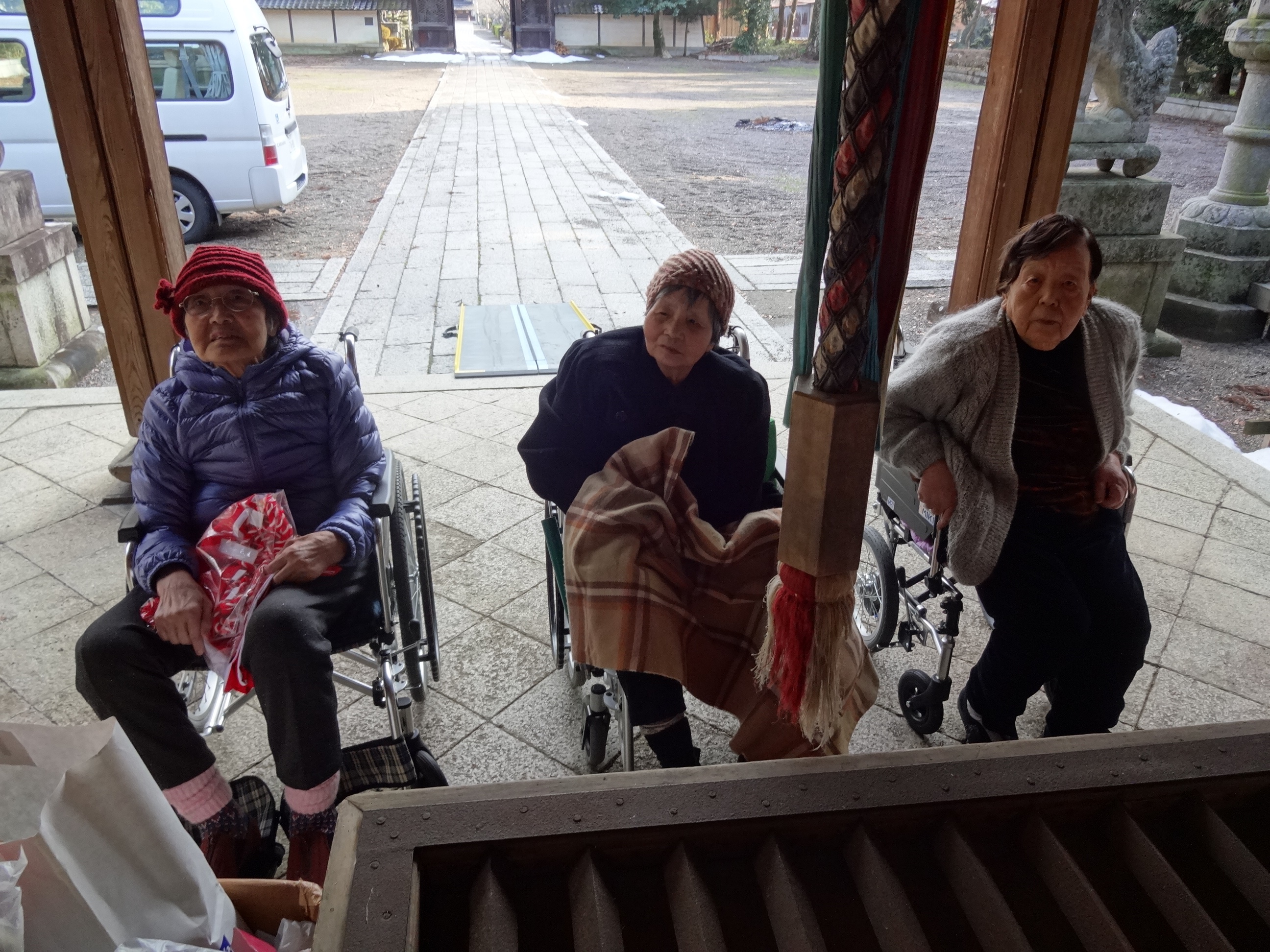 神主さんのご配慮もあって、境内の中まで車を進めさせていただき、車いすの方も楽ちん♪